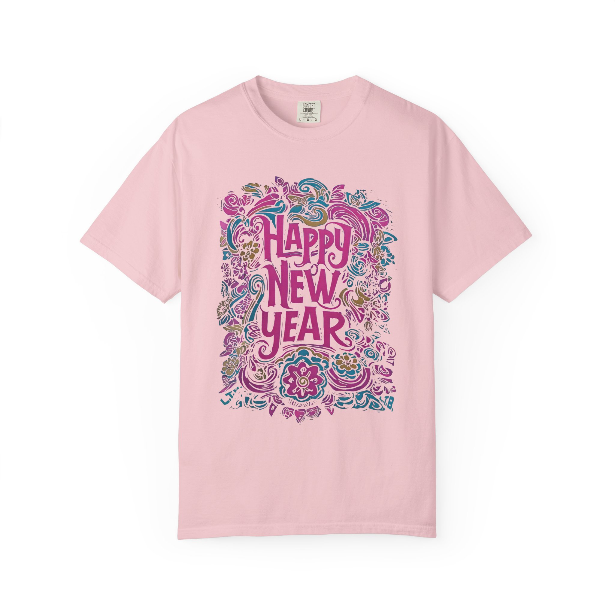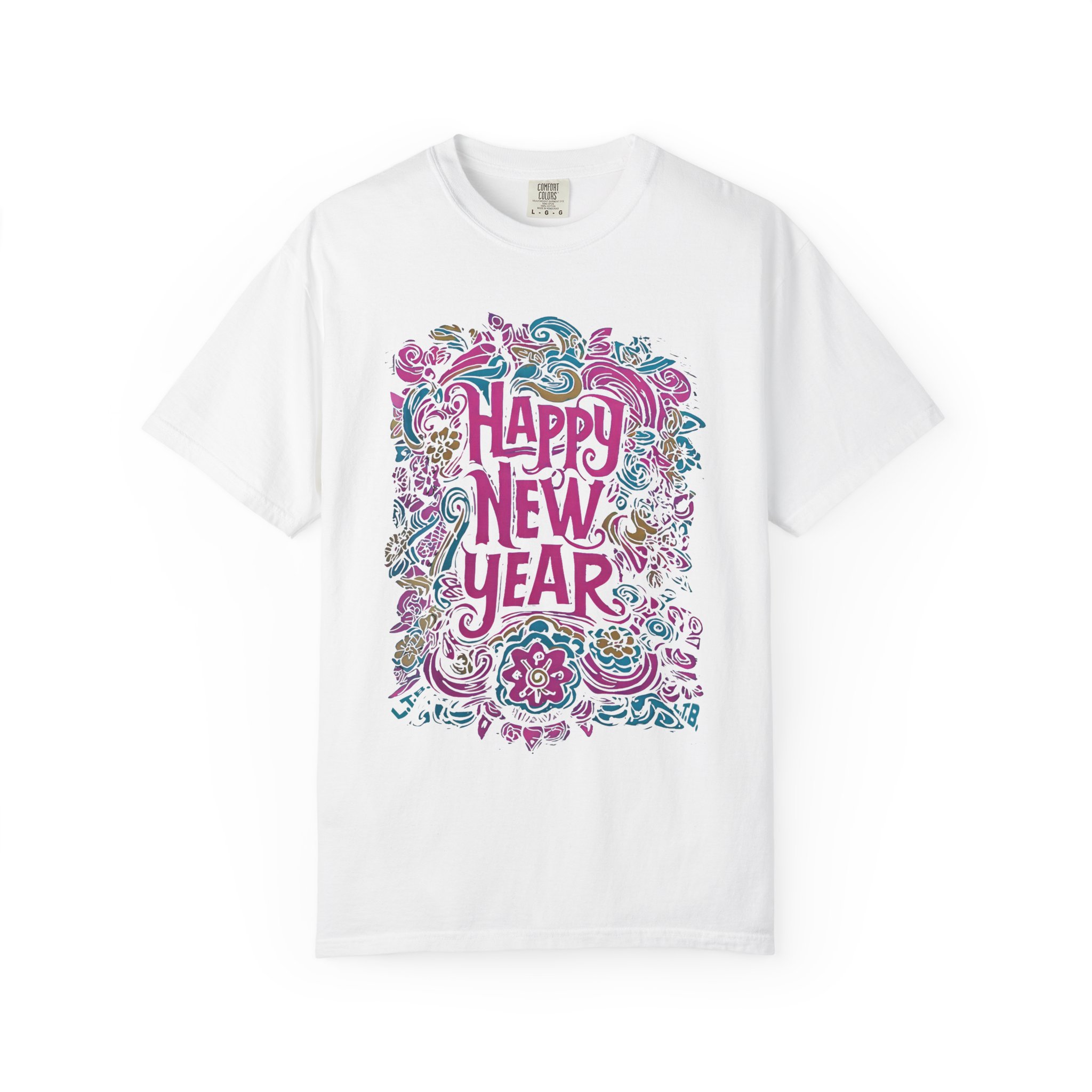 This Happy New Year T-shirt features a hand-drawn typographic message surrounded by intricate ornamental and paisley-inspired folk art details. Rather than an all-over pattern, the design focuses on expressive lettering framed by flowing floral motifs, creating a festive yet artistic composition. The vibrant color palette adds warmth and celebration while keeping the layout balanced and wearable. Designed for New Year gatherings, seasonal events, or as a meaningful holiday gift, this tee offers an art-forward alternative to generic celebration shirts. Created by an independent artist and printed on a soft, comfortable T-shirt, this piece reflects a handcrafted aesthetic rooted in creativity and renewal. Available exclusively at liltokyobeat.com.