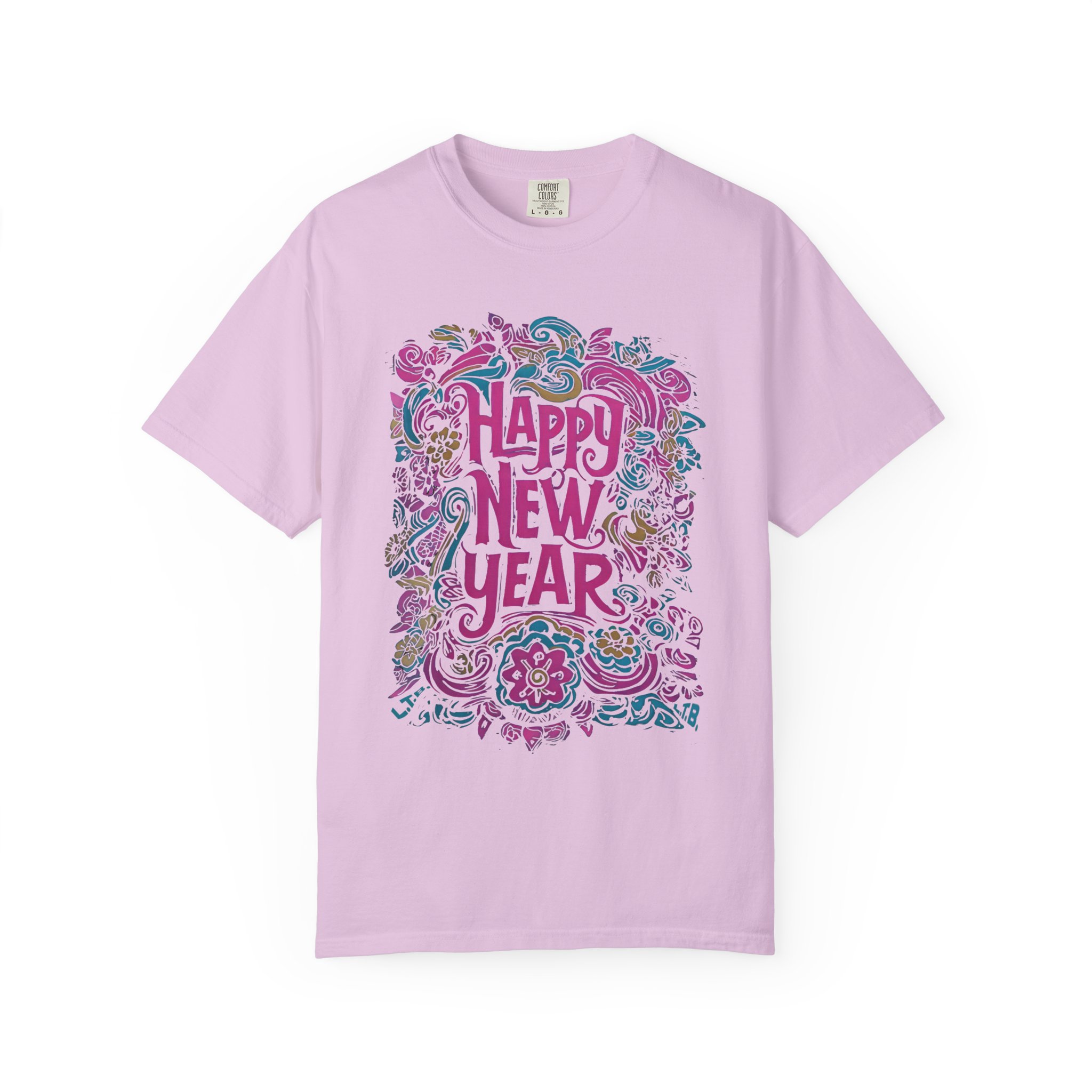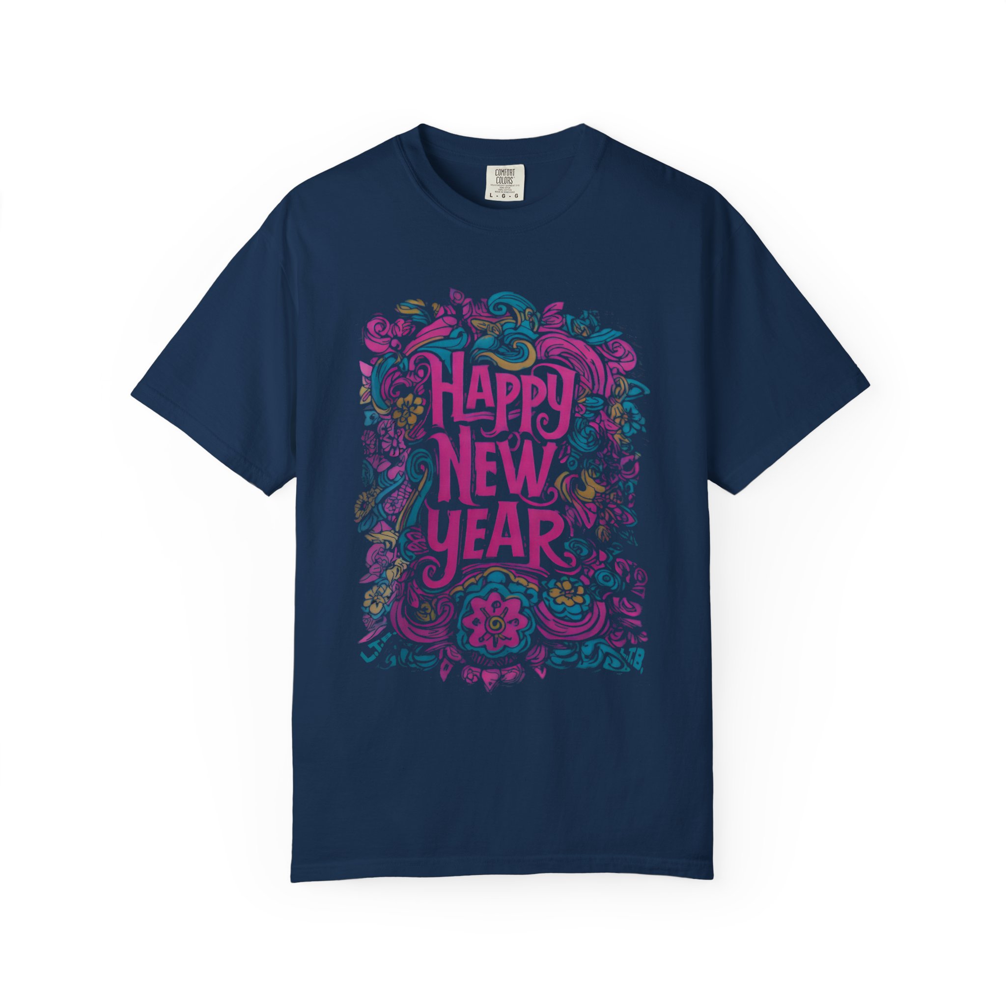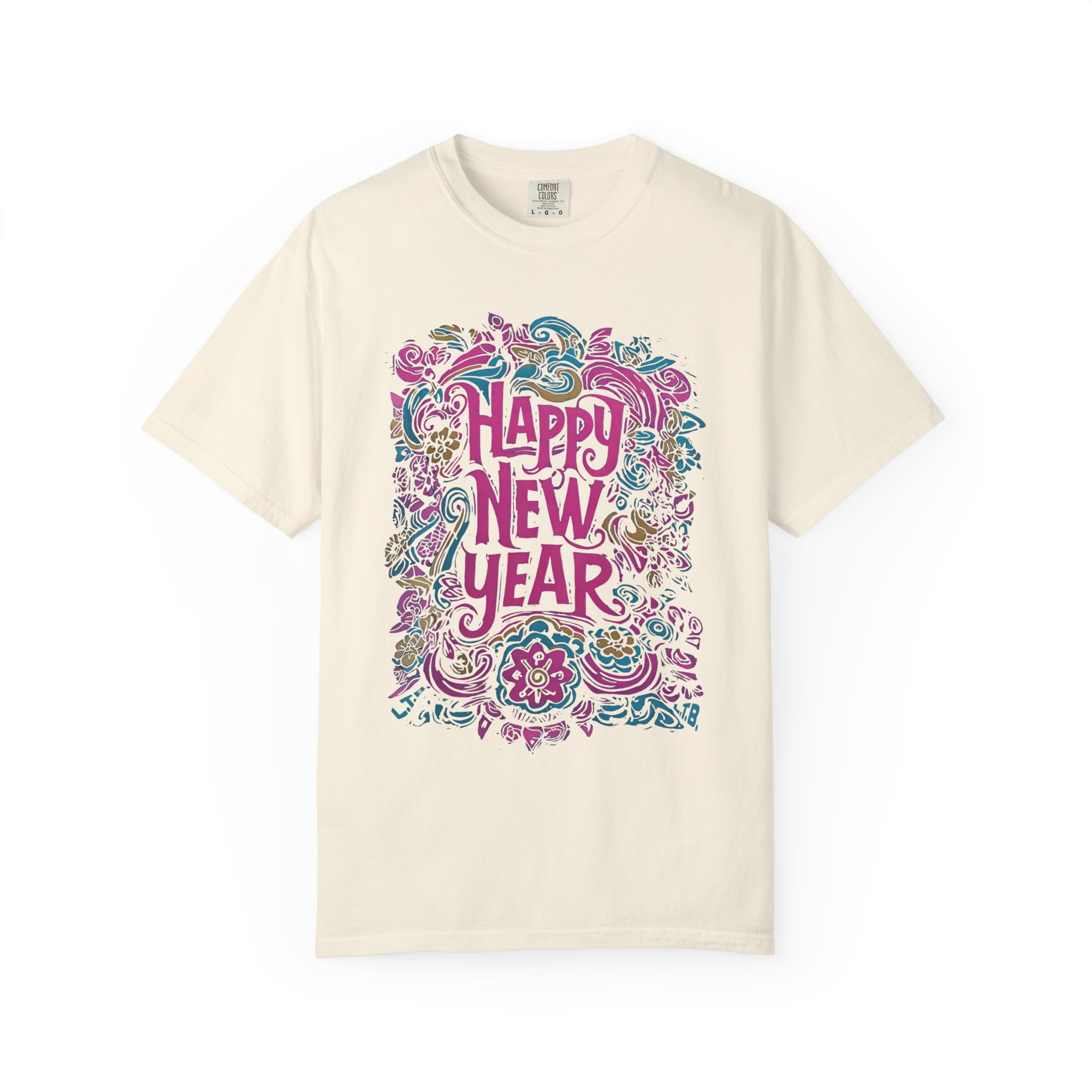 This soft, garment-dyed tee carries a playful, hand-illustrated “Happy New Year” design in swirling florals and festive flourishes. The heavyweight 100% ring-spun cotton feels substantial yet broken-in thanks to post-construction dyeing — it drapes with a lived-in comfort that invites late-night celebrations or quiet mornings after. Tailored with a relaxed fit and durable double-needle stitching, it’s built for repeat wear and easy care. Available in a wide palette of colors and sizes S–4XL, the shirt pairs well with layered winter outfits, casual party looks, or cozy at-home recovery days. The sewn-in label and tubular knit give it a clean, timeless silhouette that keeps the artwork front-and-center.