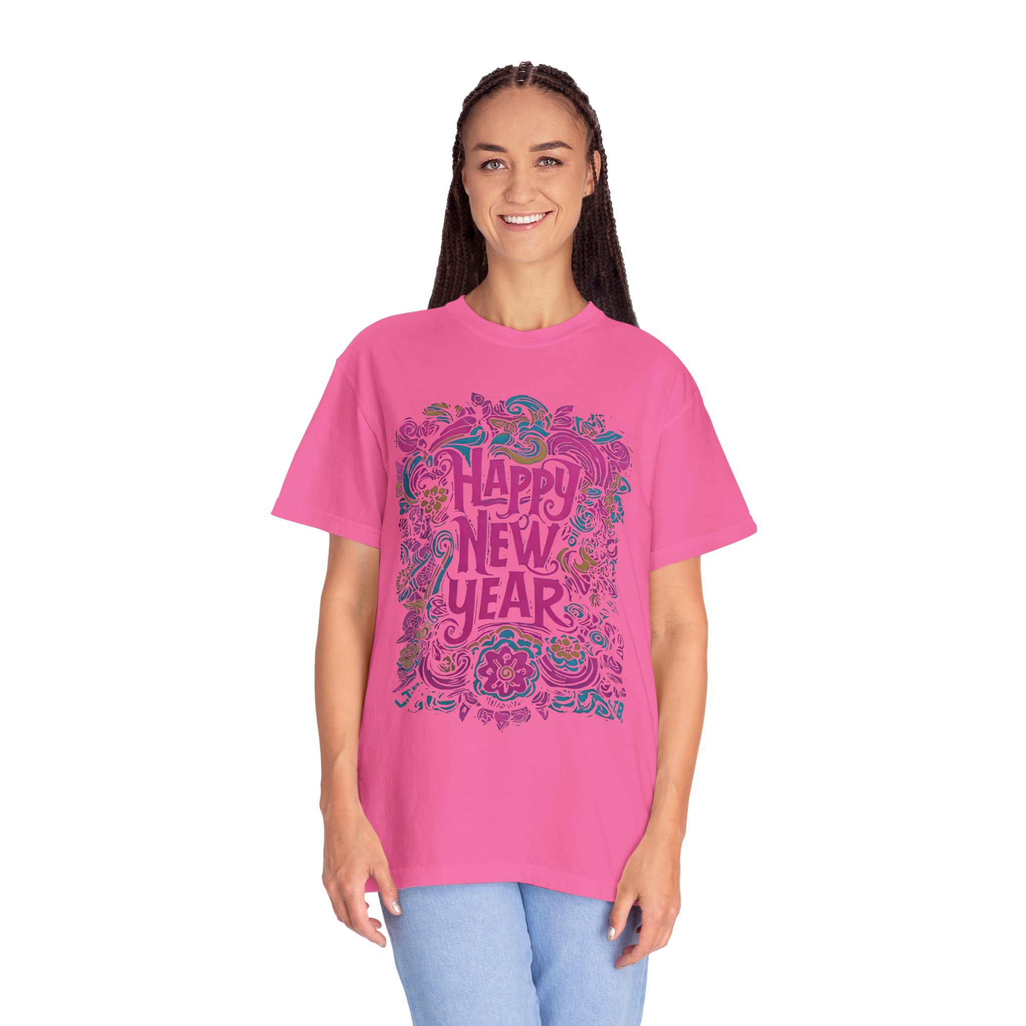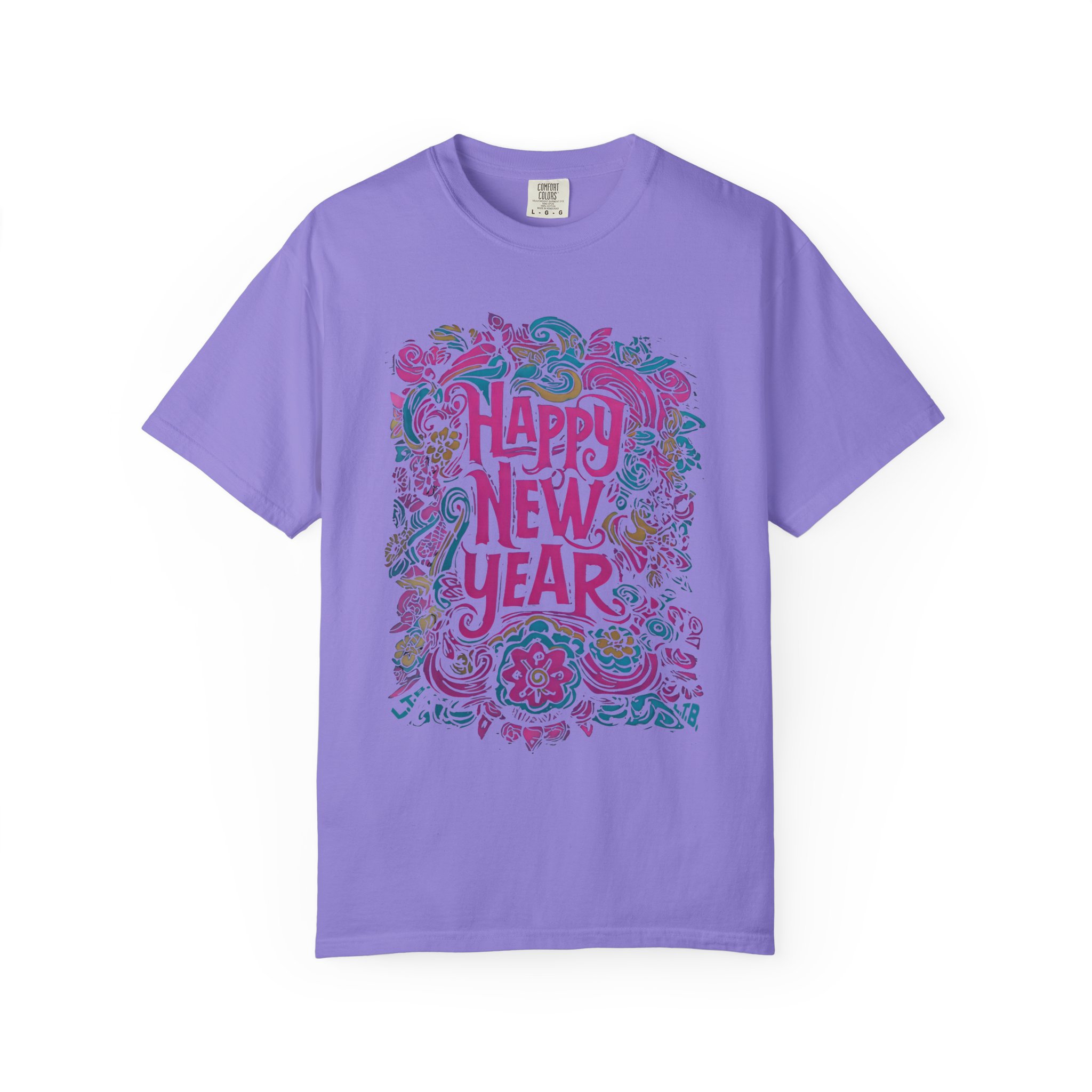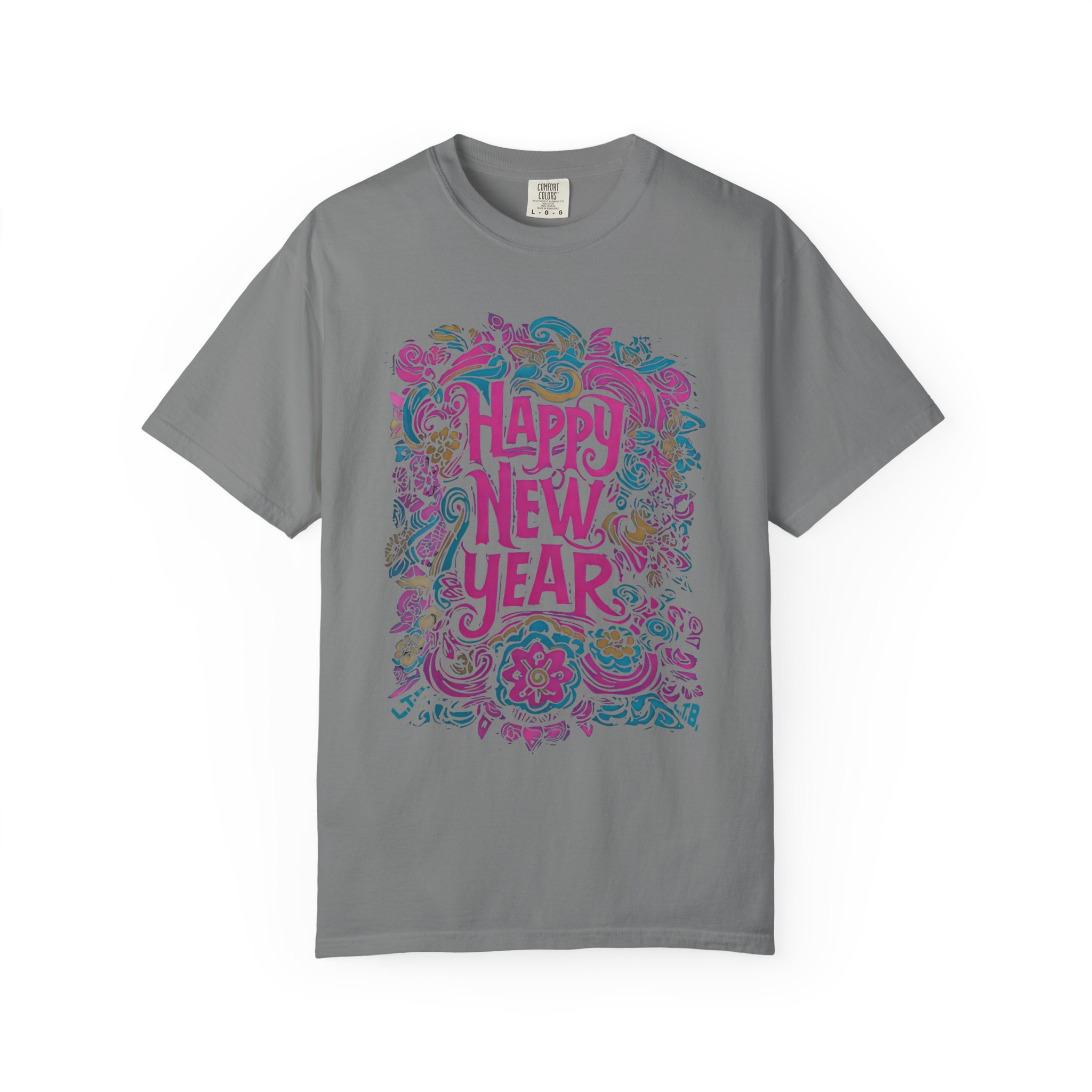 This soft, garment-dyed tee carries a playful, hand-illustrated “Happy New Year” design in swirling florals and festive flourishes. The heavyweight 100% ring-spun cotton feels substantial yet broken-in thanks to post-construction dyeing — it drapes with a lived-in comfort that invites late-night celebrations or quiet mornings after. Tailored with a relaxed fit and durable double-needle stitching, it’s built for repeat wear and easy care. Available in a wide palette of colors and sizes S–4XL, the shirt pairs well with layered winter outfits, casual party looks, or cozy at-home recovery days. The sewn-in label and tubular knit give it a clean, timeless silhouette that keeps the artwork front-and-center.