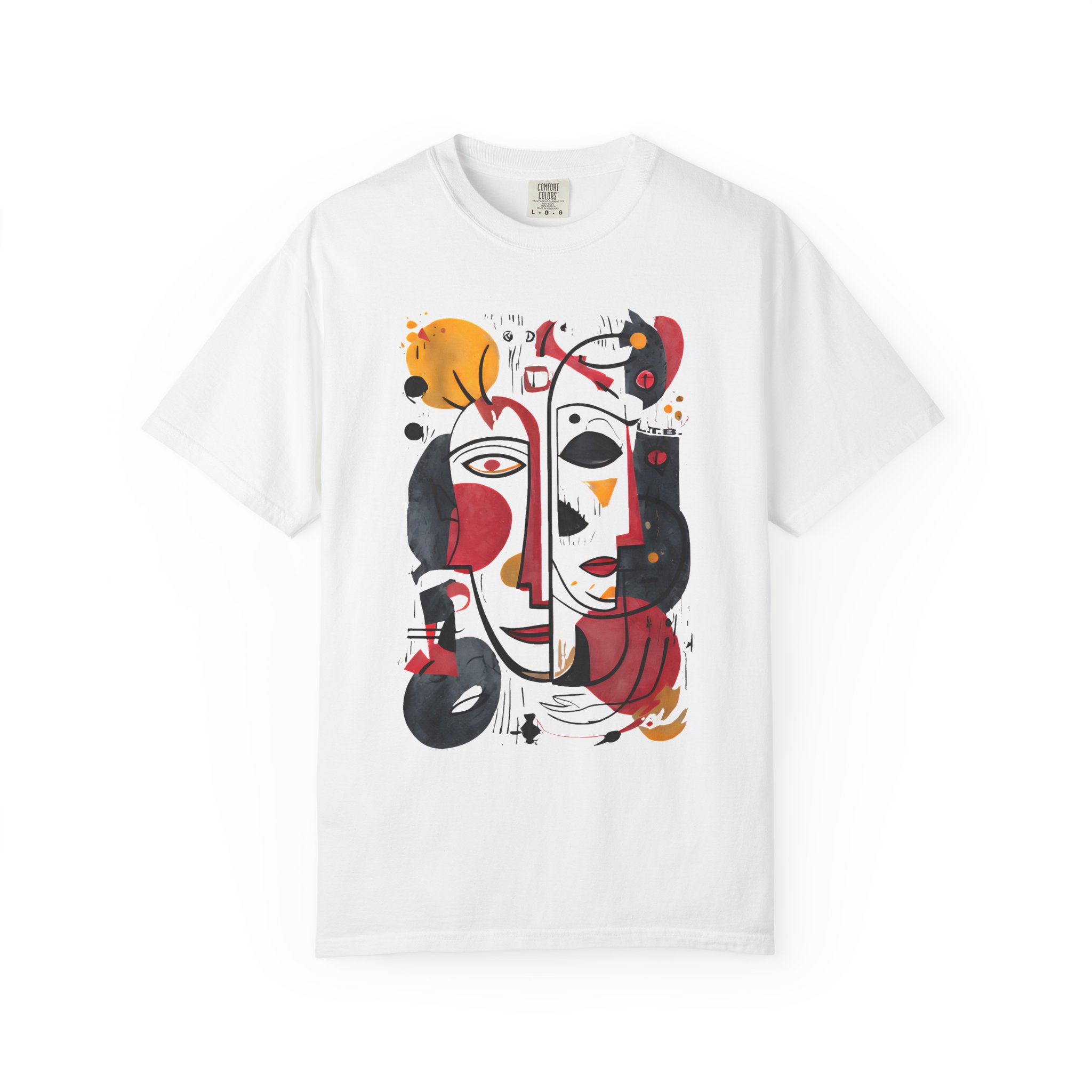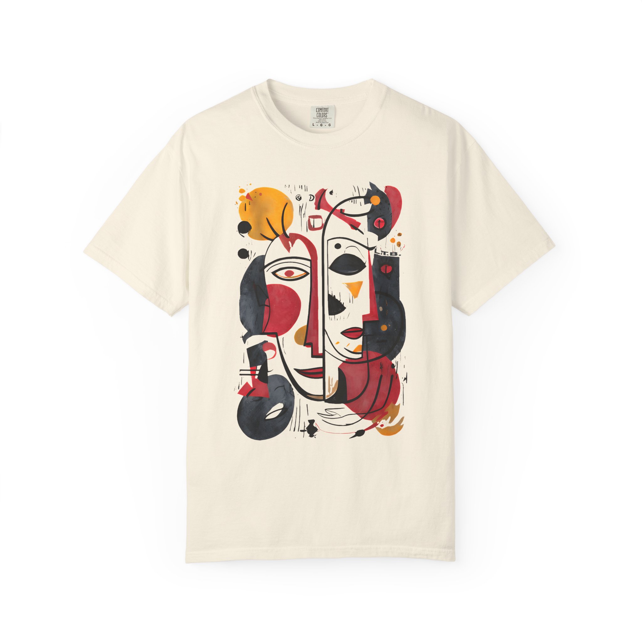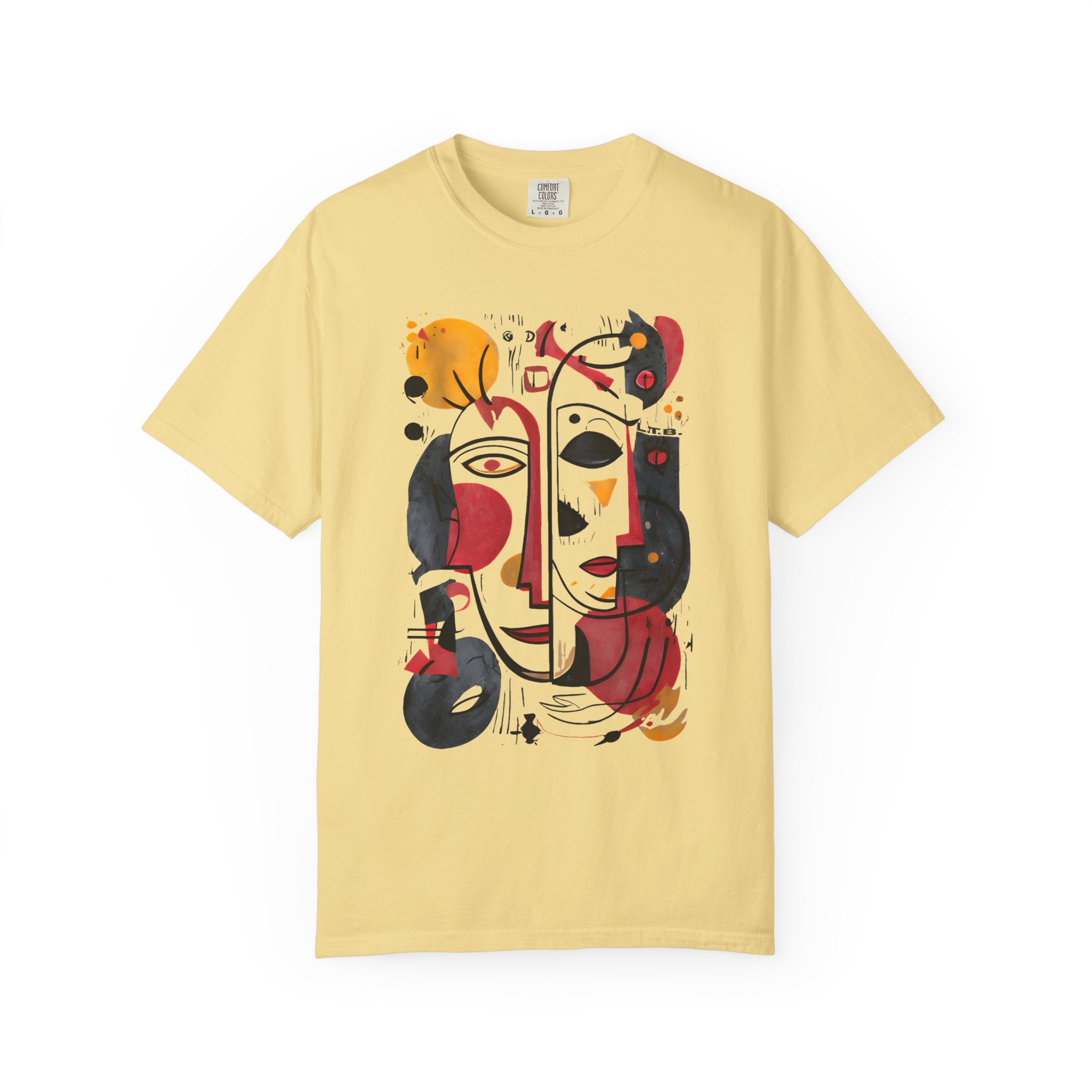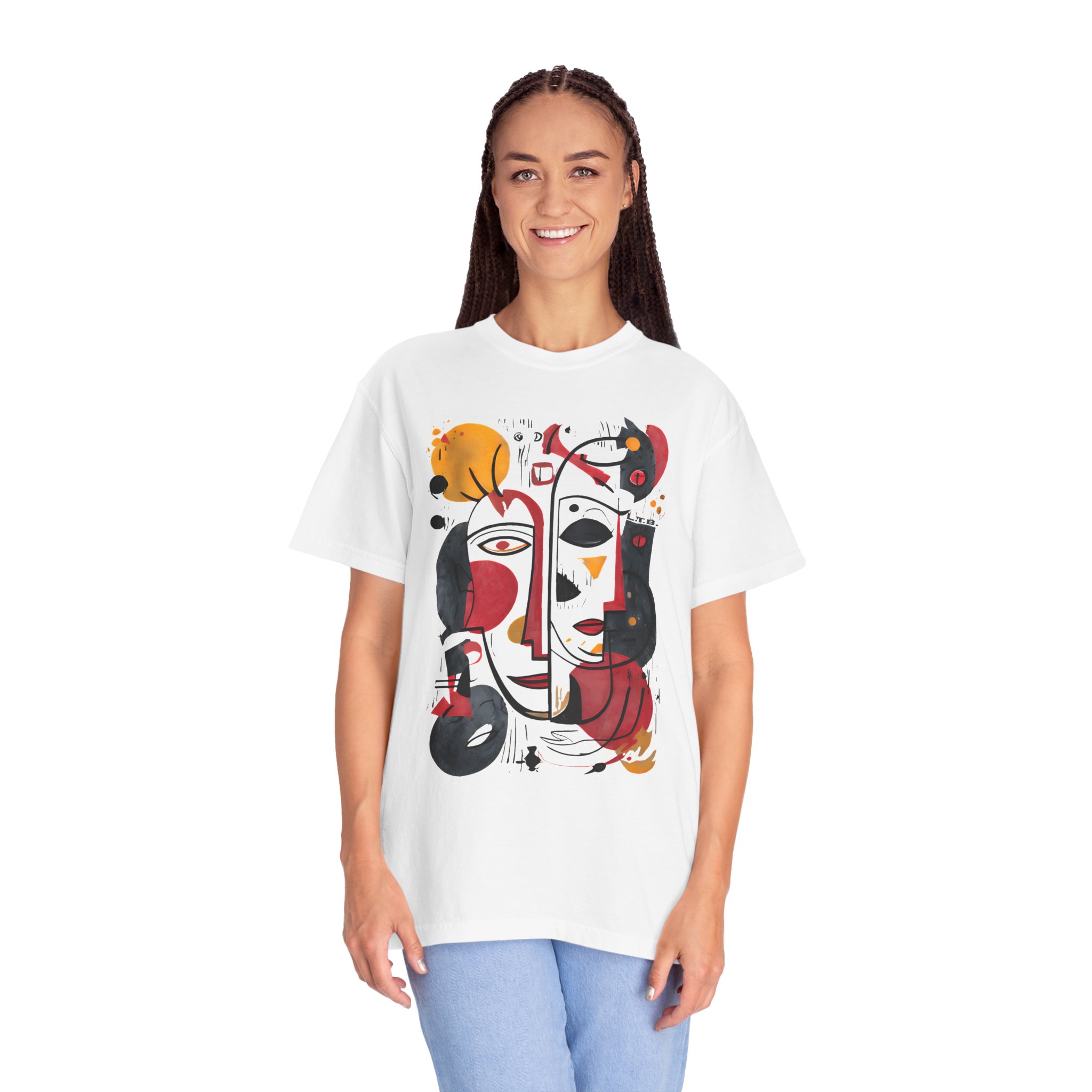 This heavyweight garment-dyed tee brings art-forward style to everyday wear. The oversized abstract face print—rendered in warm reds, deep blacks, and golden ochres—feels like a small, wearable painting. The soft, garment-dyed cotton drapes with a relaxed fit and a lived-in hand, so the shirt looks and feels comfortable from the first wear. It layers easily under a denim jacket or stands alone as the focal point of a minimalist outfit. Wear it to gallery openings, coffee dates, or weekend city wanderings when you want clothing that speaks with personality and subtle texture. The thoughtful construction—double-needle seams, tubular knit with no side seams, and a sewn-in label—keeps the silhouette clean and durable, while the pre-shrunk ring-spun cotton and broad size range make finding the right fit straightforward.