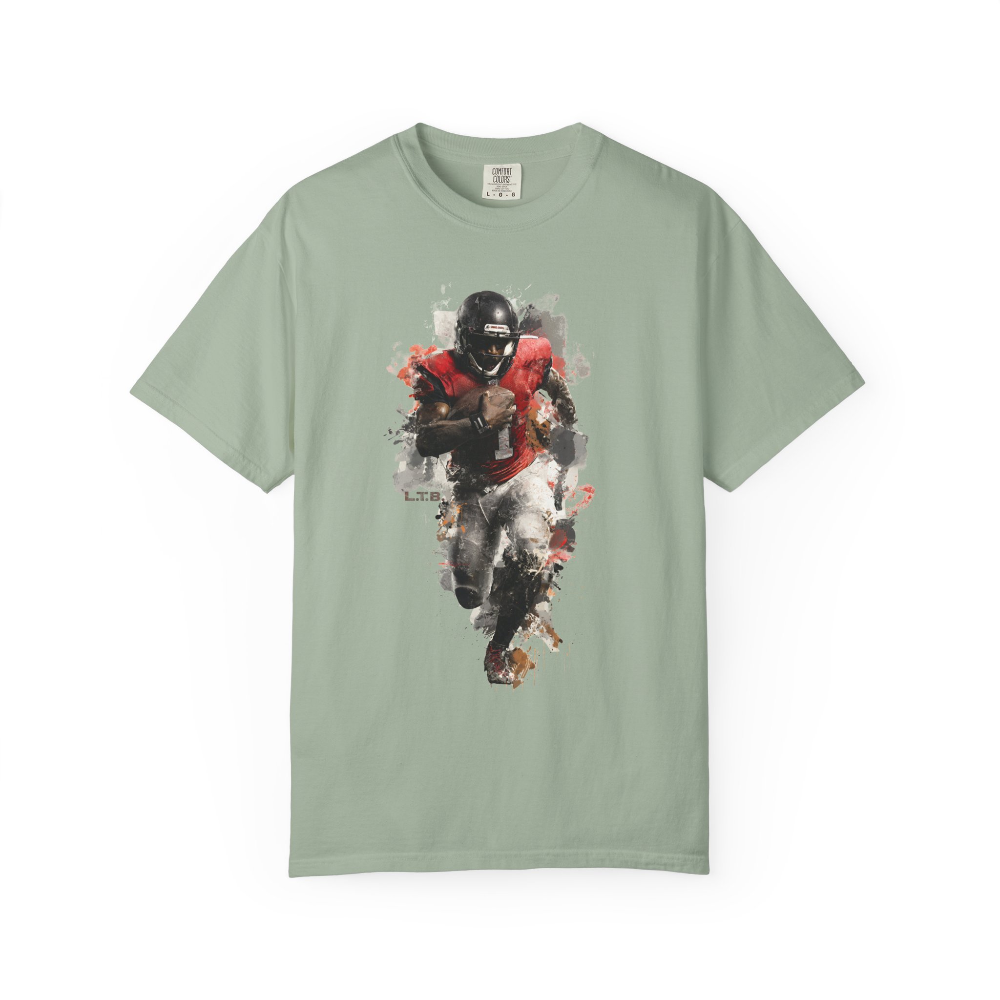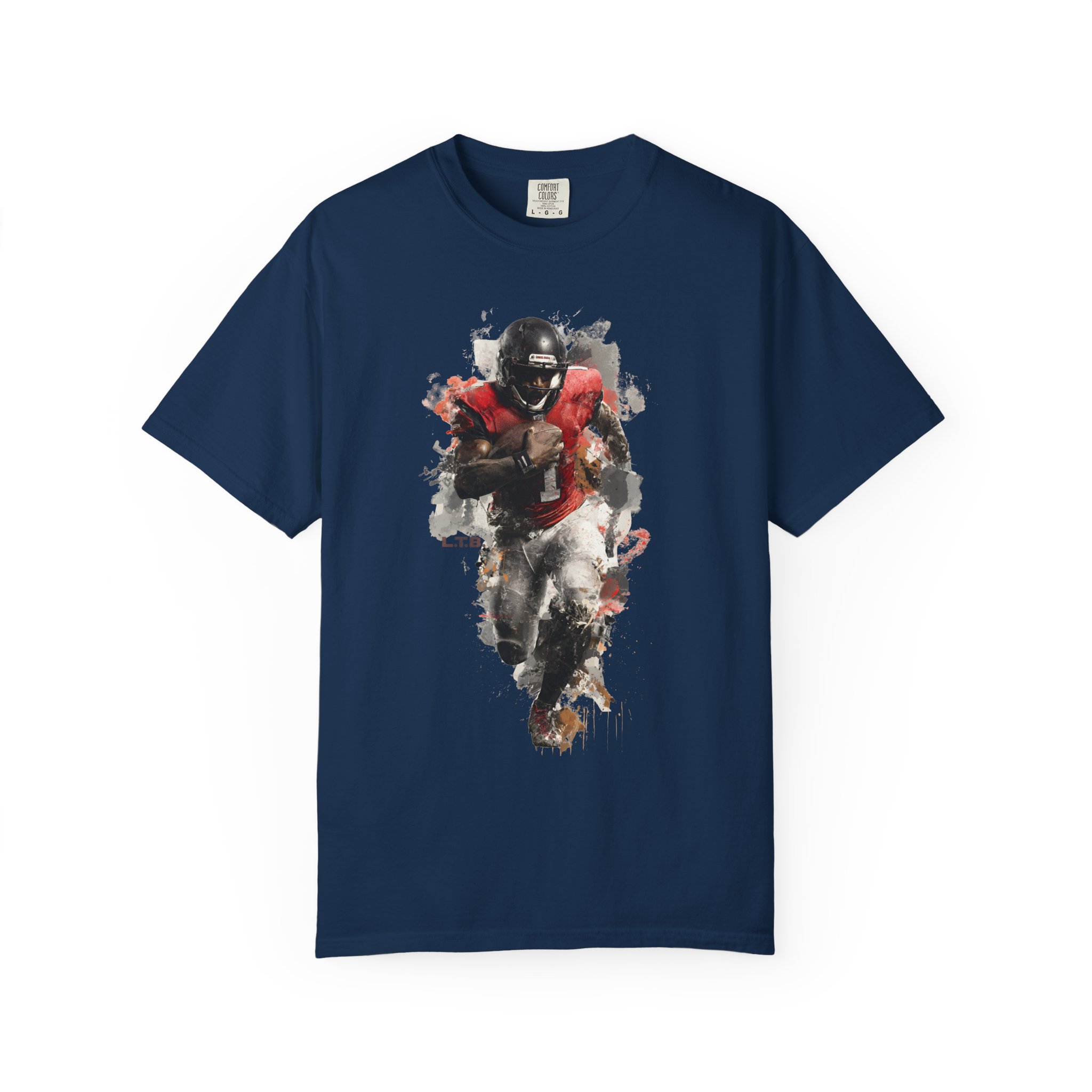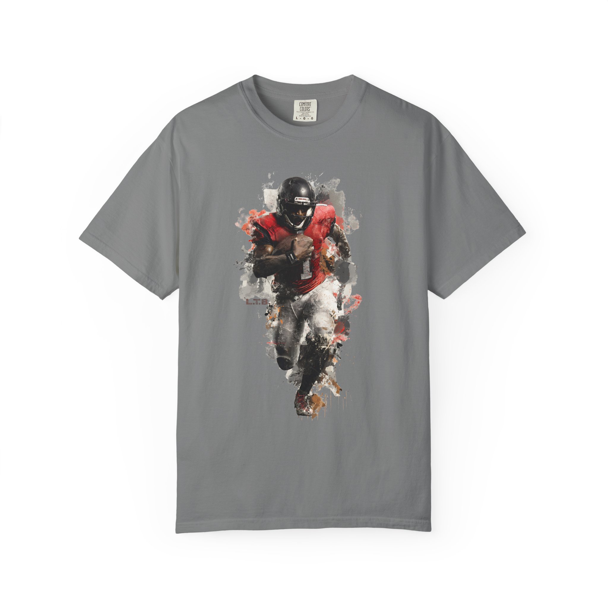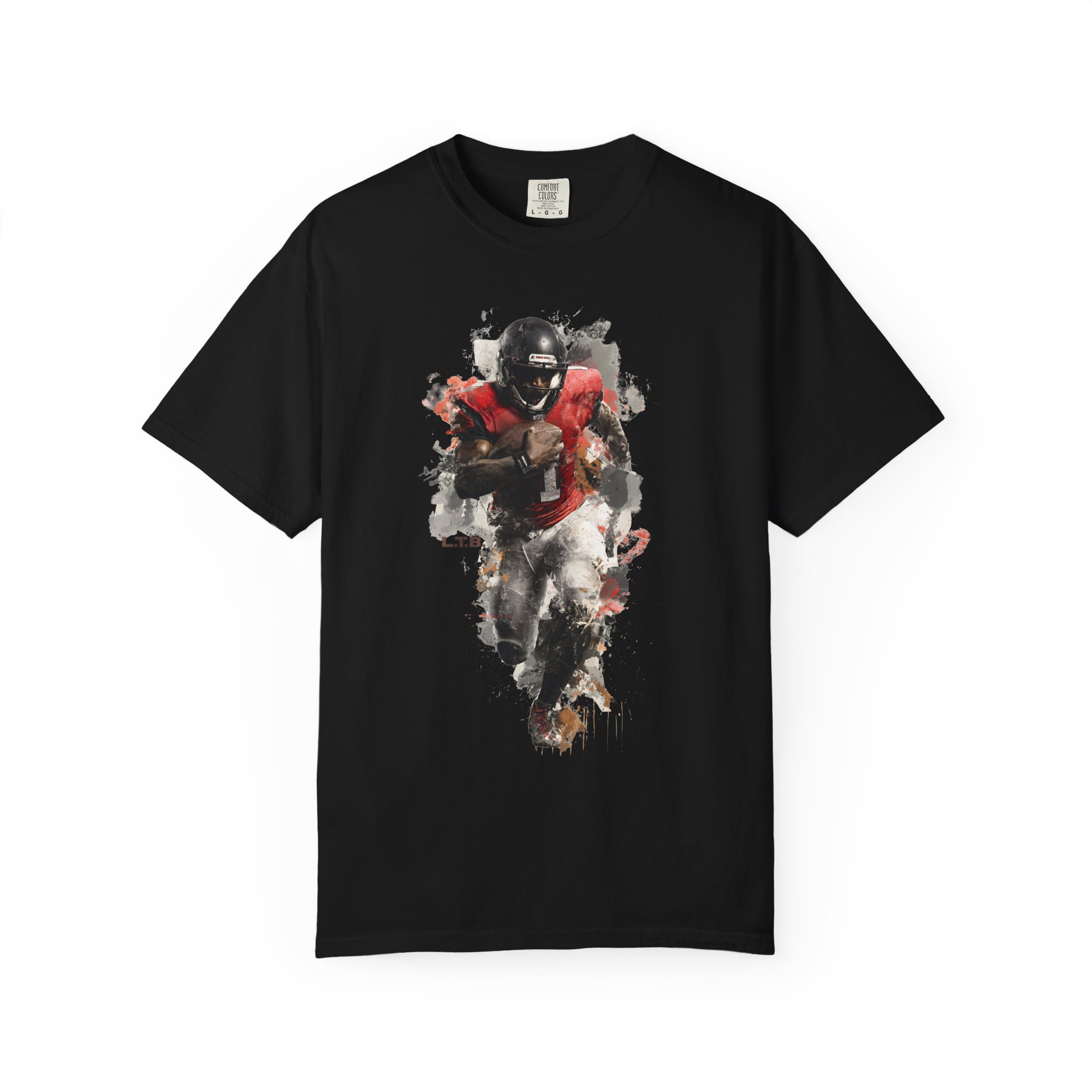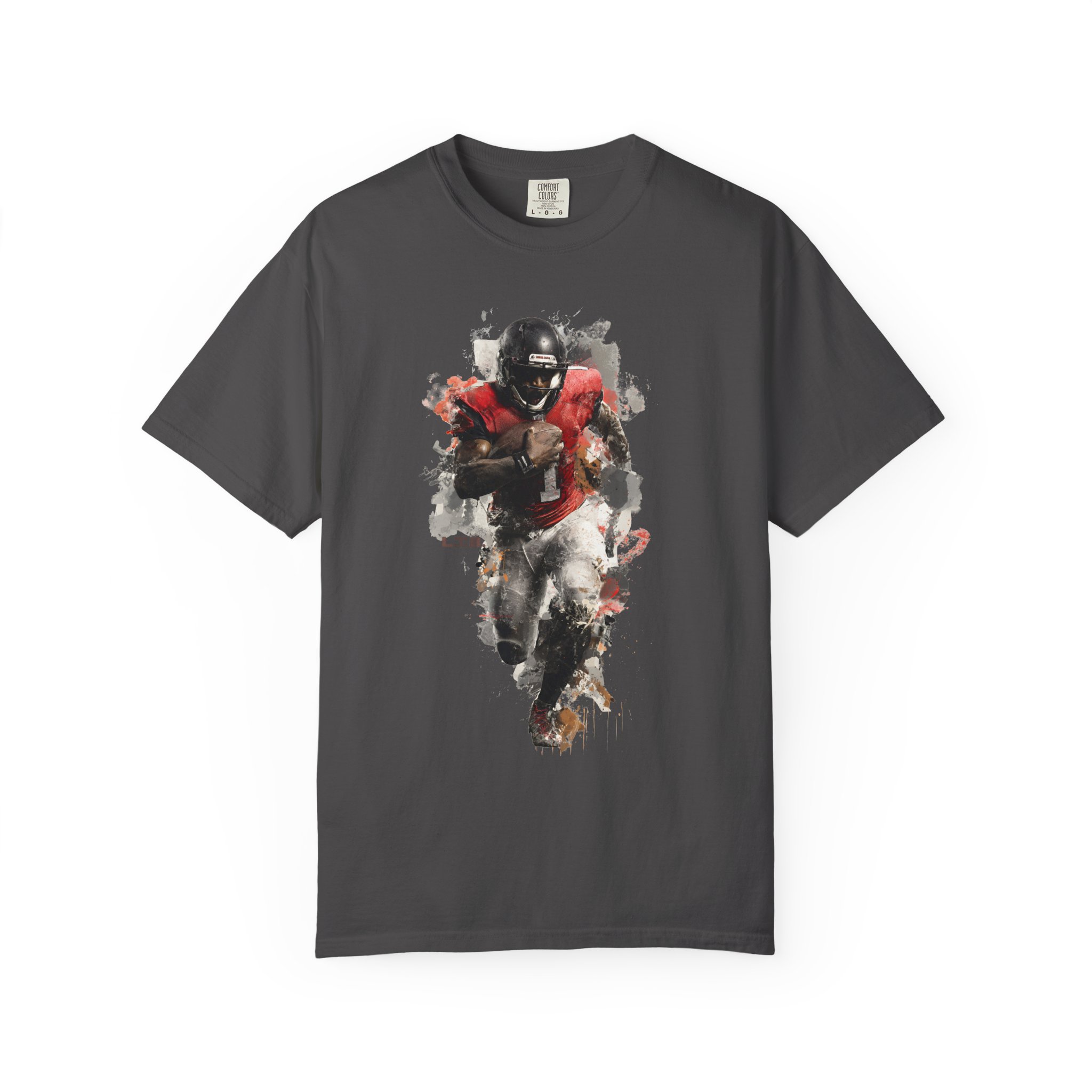 This heavyweight, garment-dyed tee transforms athletic motion into expressive watercolor art. The relaxed-fit cotton showcases a dynamic illustrated runner captured in mid-stride, layered with paint-splatter textures that emphasize speed, strength, and movement. Designed as wearable art rather than team merchandise, the piece focuses on energy and form instead of logos or identities. The soft, post-dyed finish feels lived-in from the first wear, while durable double-needle stitching ensures long-lasting comfort. Easy to layer or wear on its own, this tee is made for those who appreciate bold, athletic-inspired design presented through an artful, timeless lens. Sized S–4XL with multiple color options.