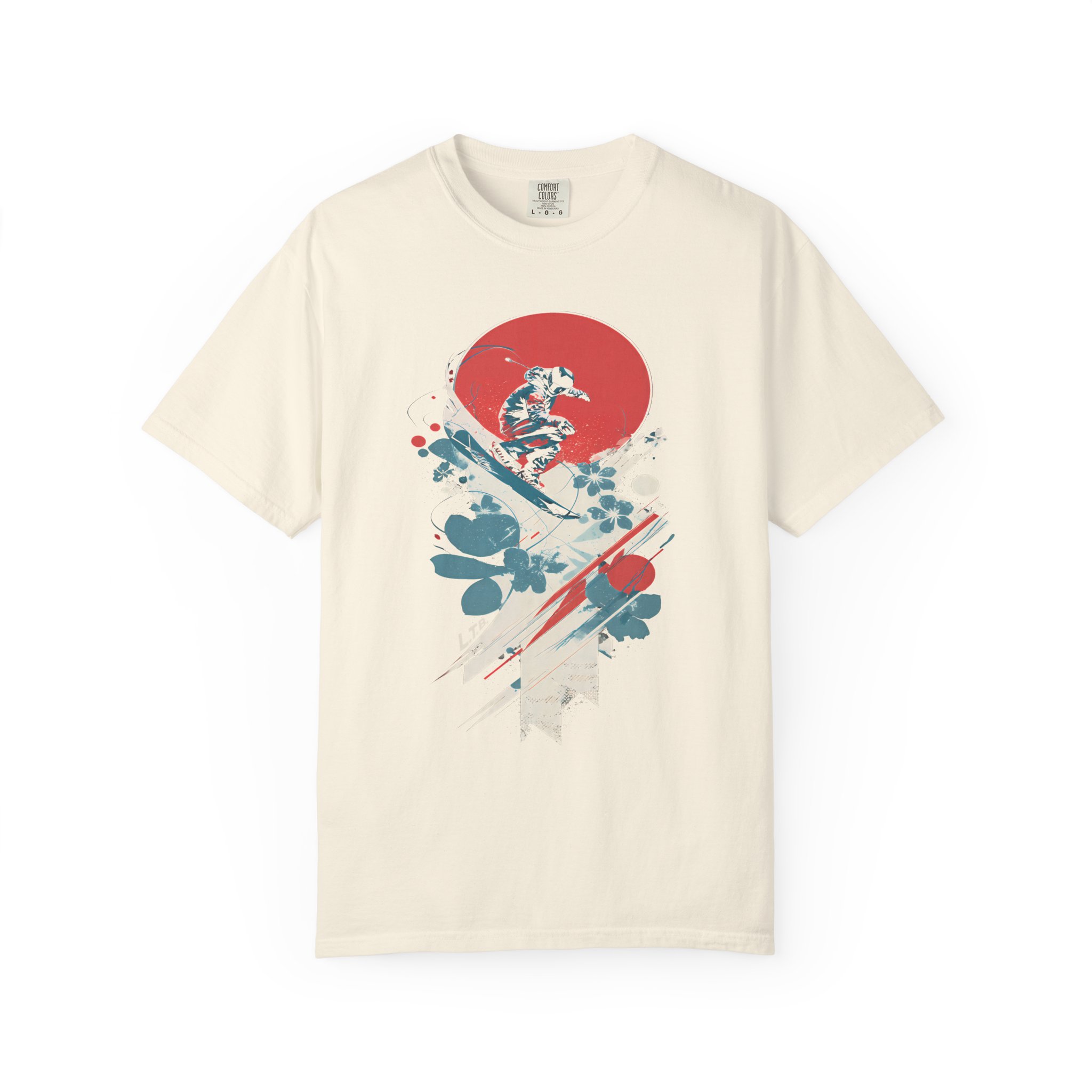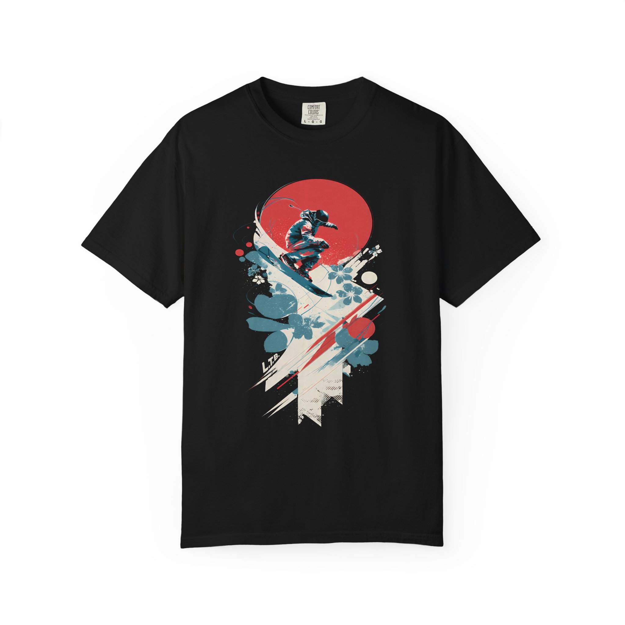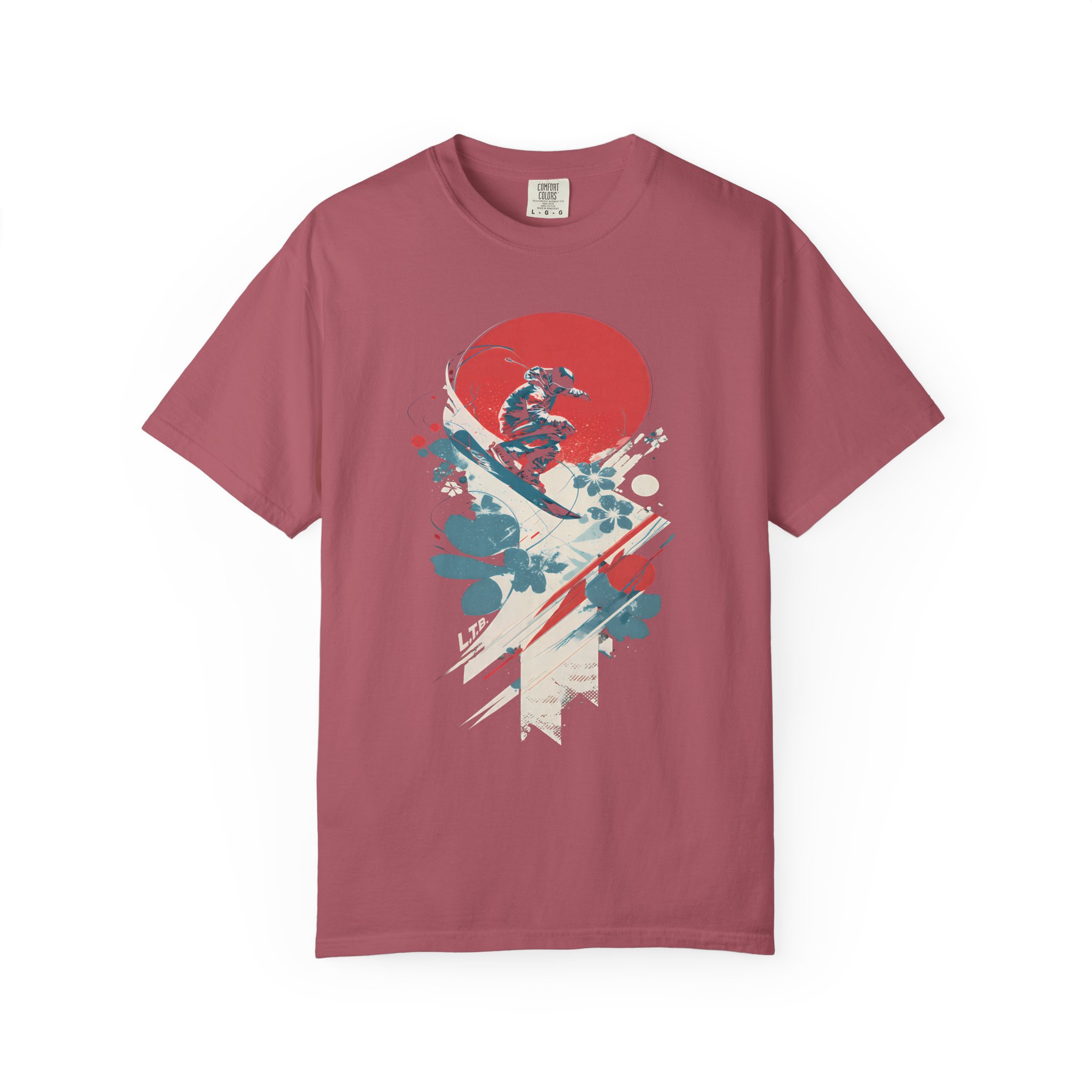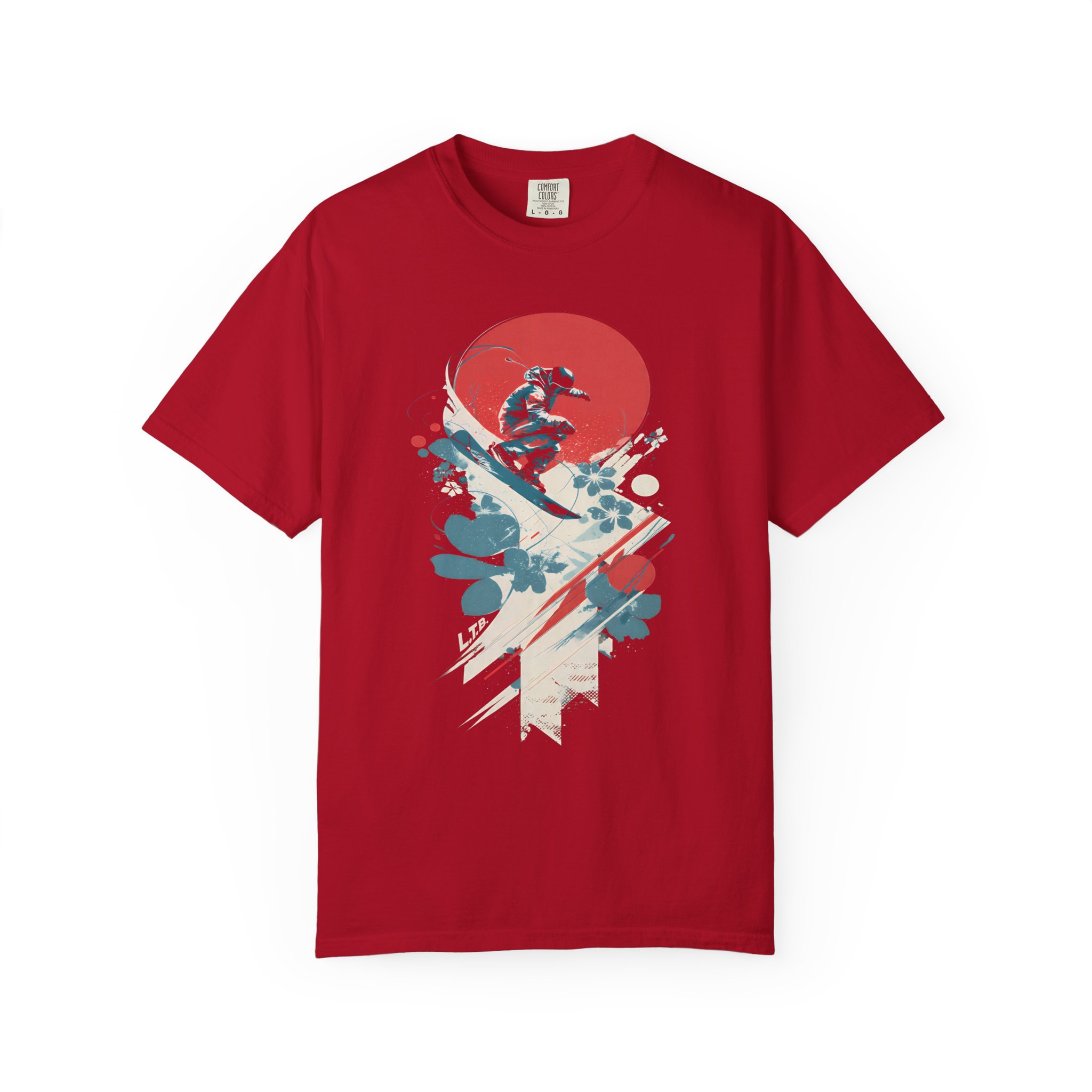 This abstract ski graphic tee from Lil Tokyo Beat captures alpine energy against a bold red sun backdrop. A dynamic skier launches forward through layered brush strokes, soft floral silhouettes, and geometric accents. The composition blends Japanese minimal influence with contemporary streetwear design — cool blues, muted neutrals, and striking crimson balance power and calm.