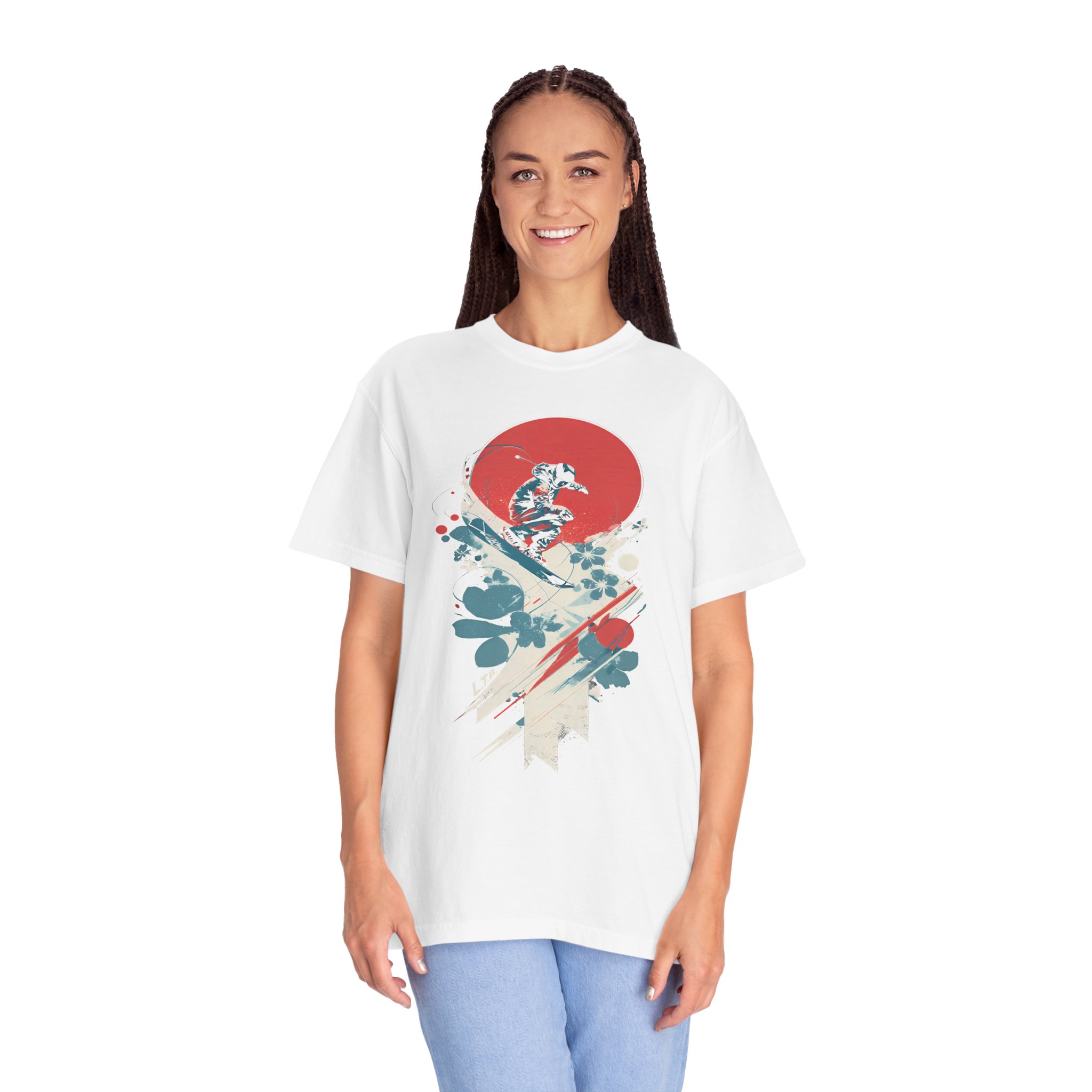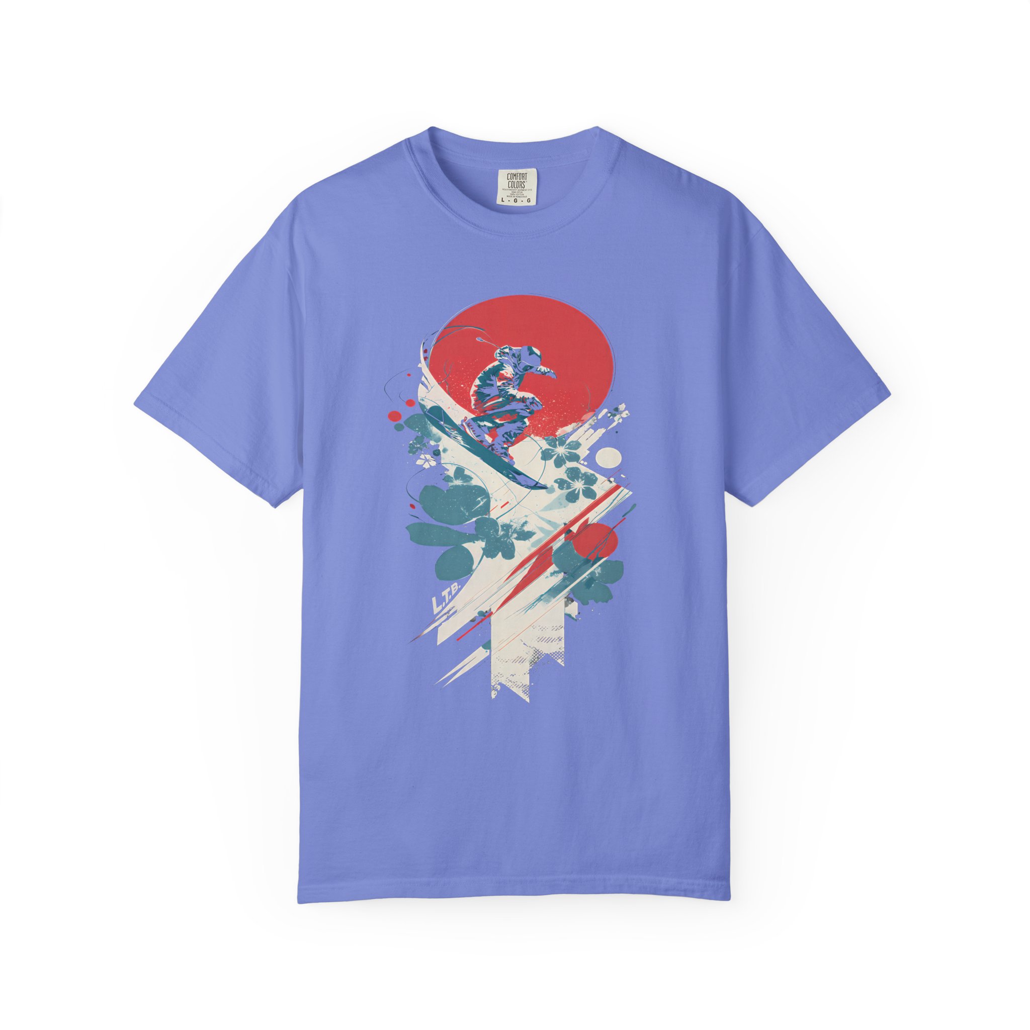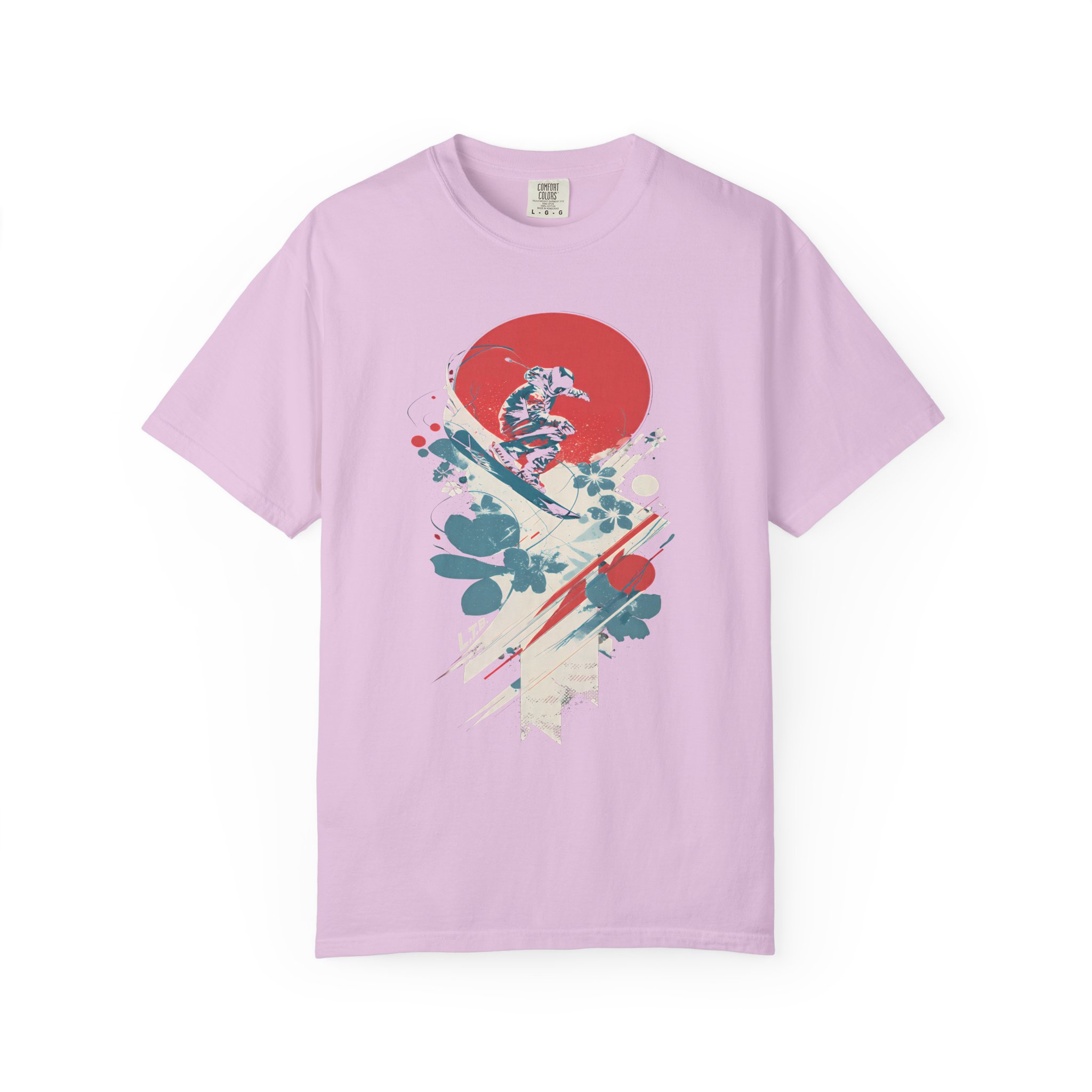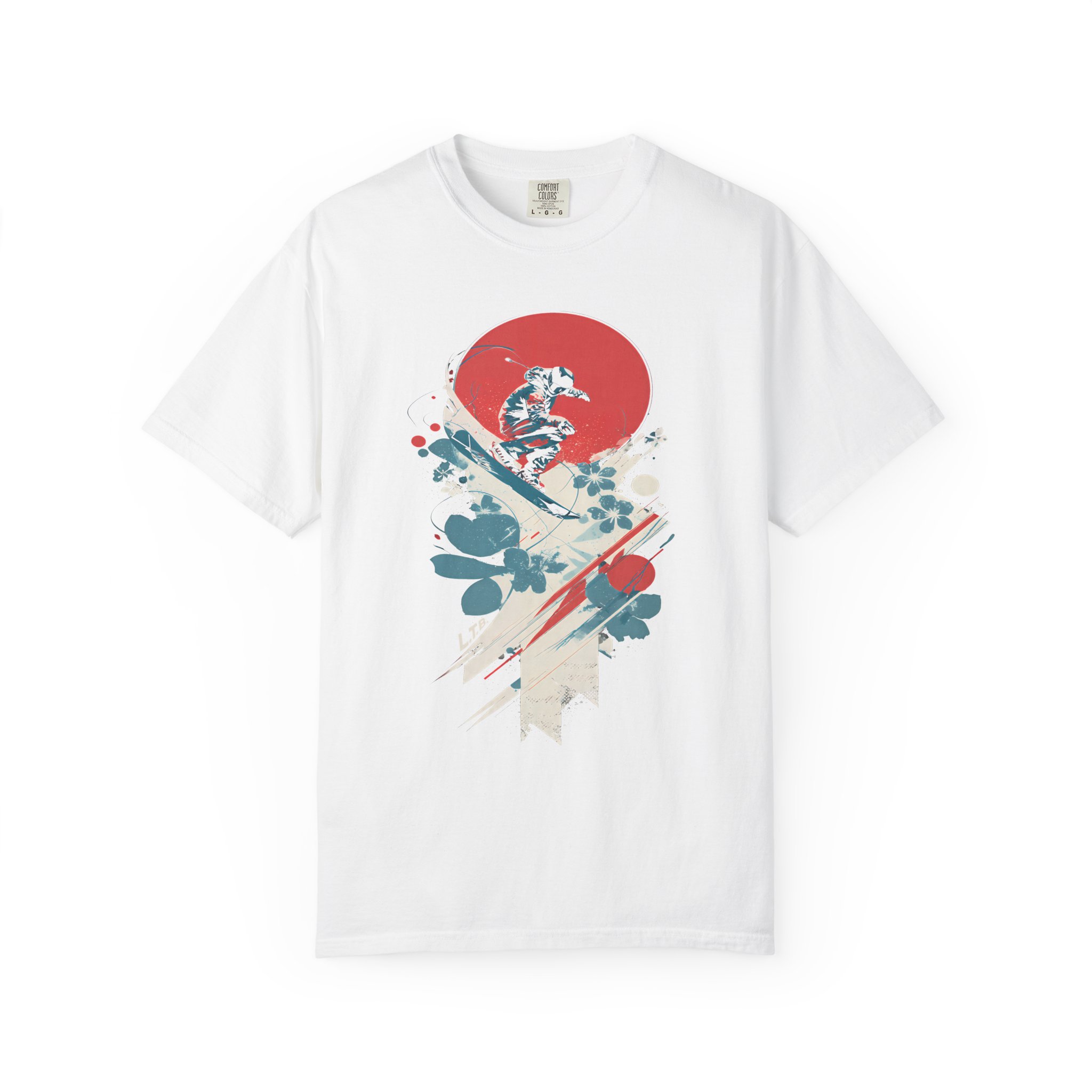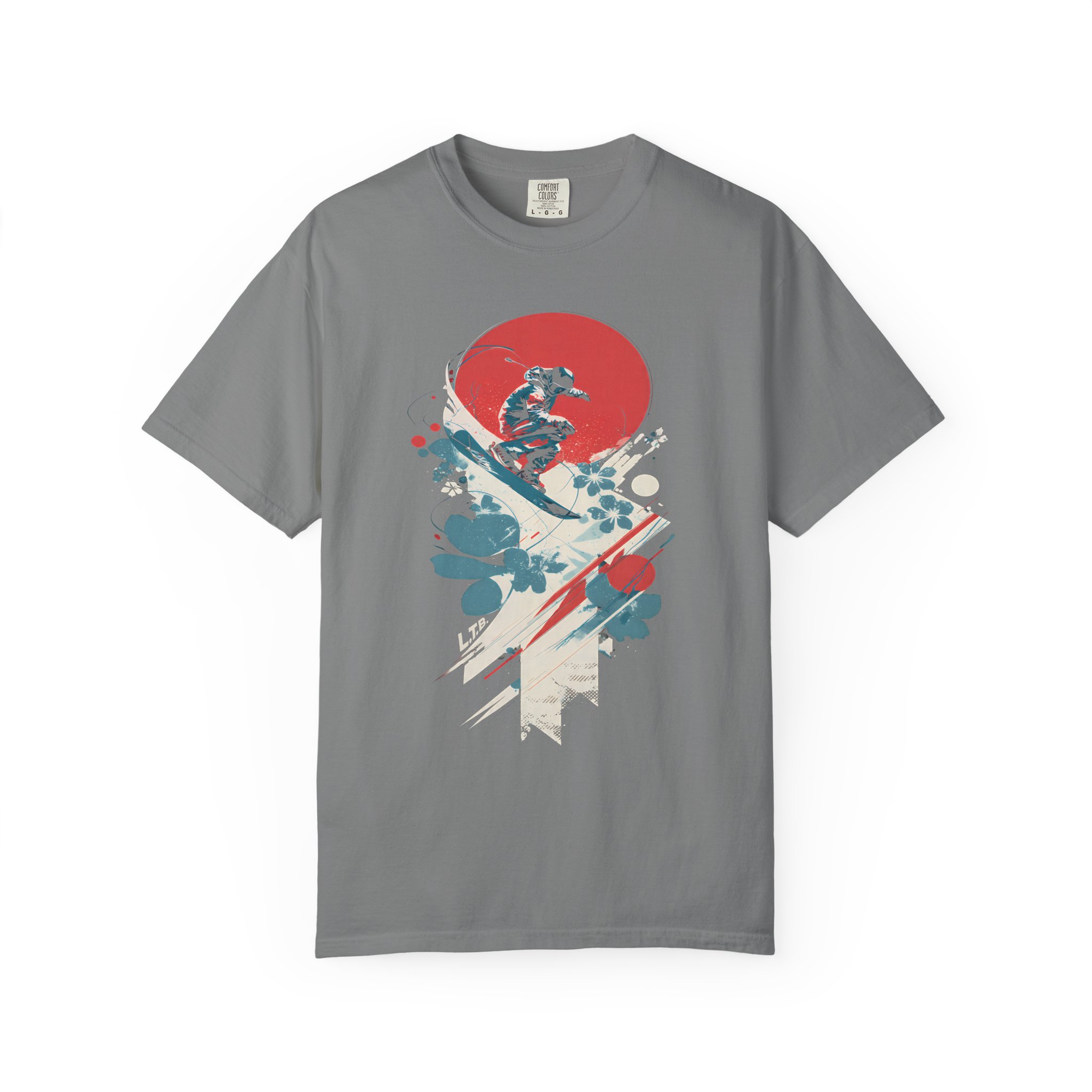 This abstract ski graphic tee from Lil Tokyo Beat captures alpine energy against a bold red sun backdrop. A dynamic skier launches forward through layered brush strokes, soft floral silhouettes, and geometric accents. The composition blends Japanese minimal influence with contemporary streetwear design — cool blues, muted neutrals, and striking crimson balance power and calm.