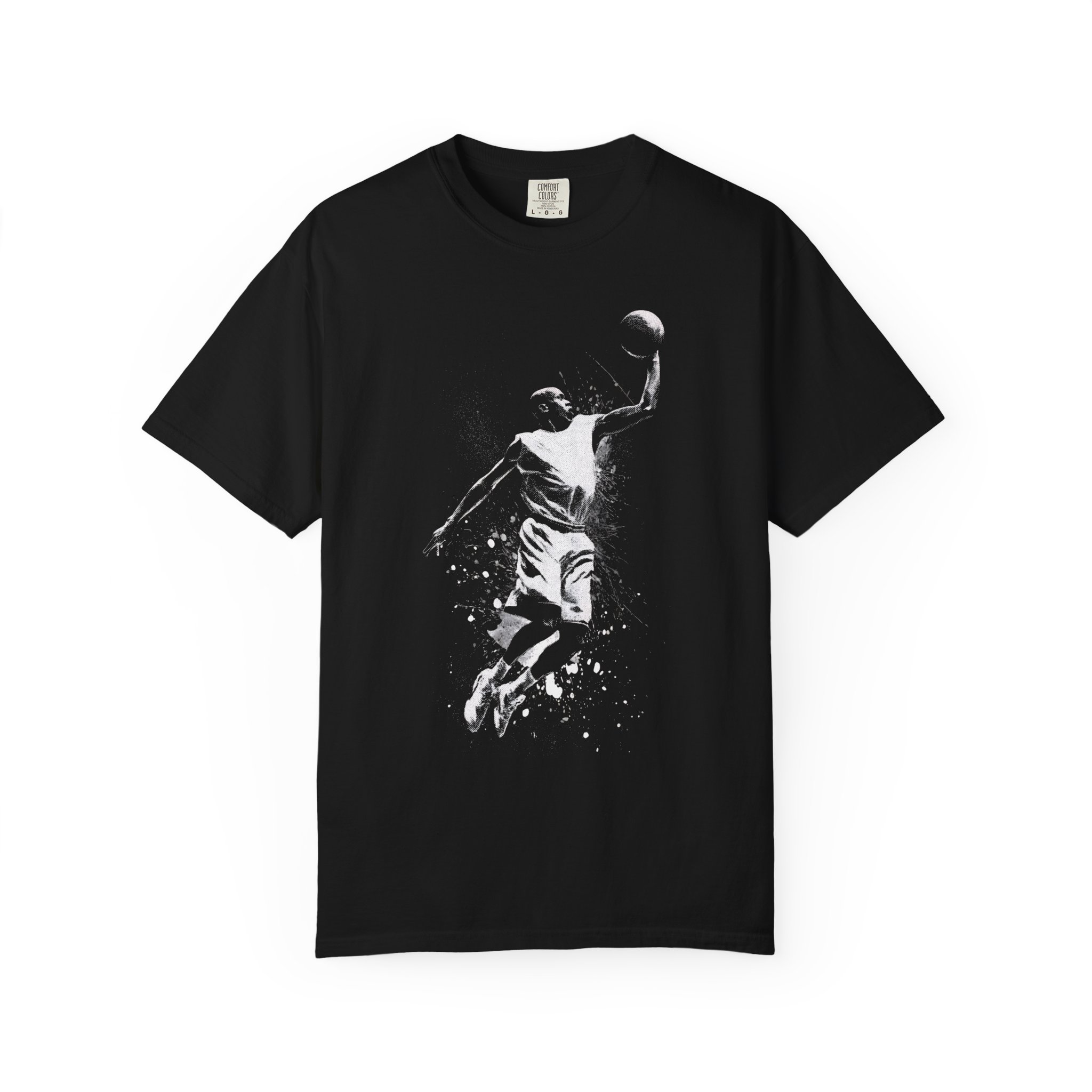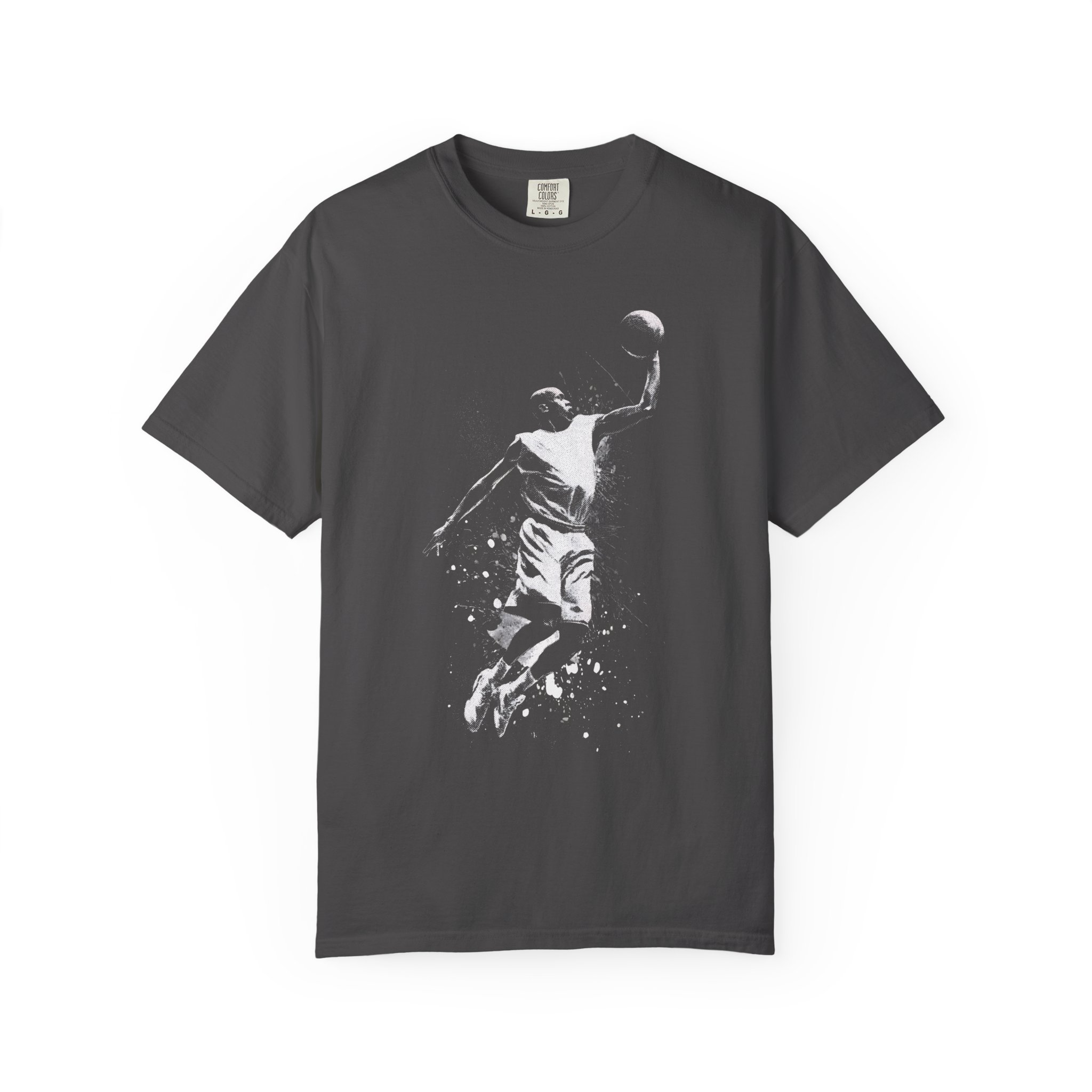 This heavyweight garment-dyed tee carries the raw energy of the court in a soft, lived-in hand. The monochrome splash design captures a mid-air dunk frozen in gritty detail — paint-like speckles trail from the figure as if motion itself is breaking free from the fabric. It drapes with a relaxed fit and a slightly broken-in color that deepens with wear, so it feels like an old favorite from the first wear. Wear it to pickup games, late-night gym sessions, or layered under a jacket while you root for your team. It’s made to move with you and age with personality, not fade into the background.