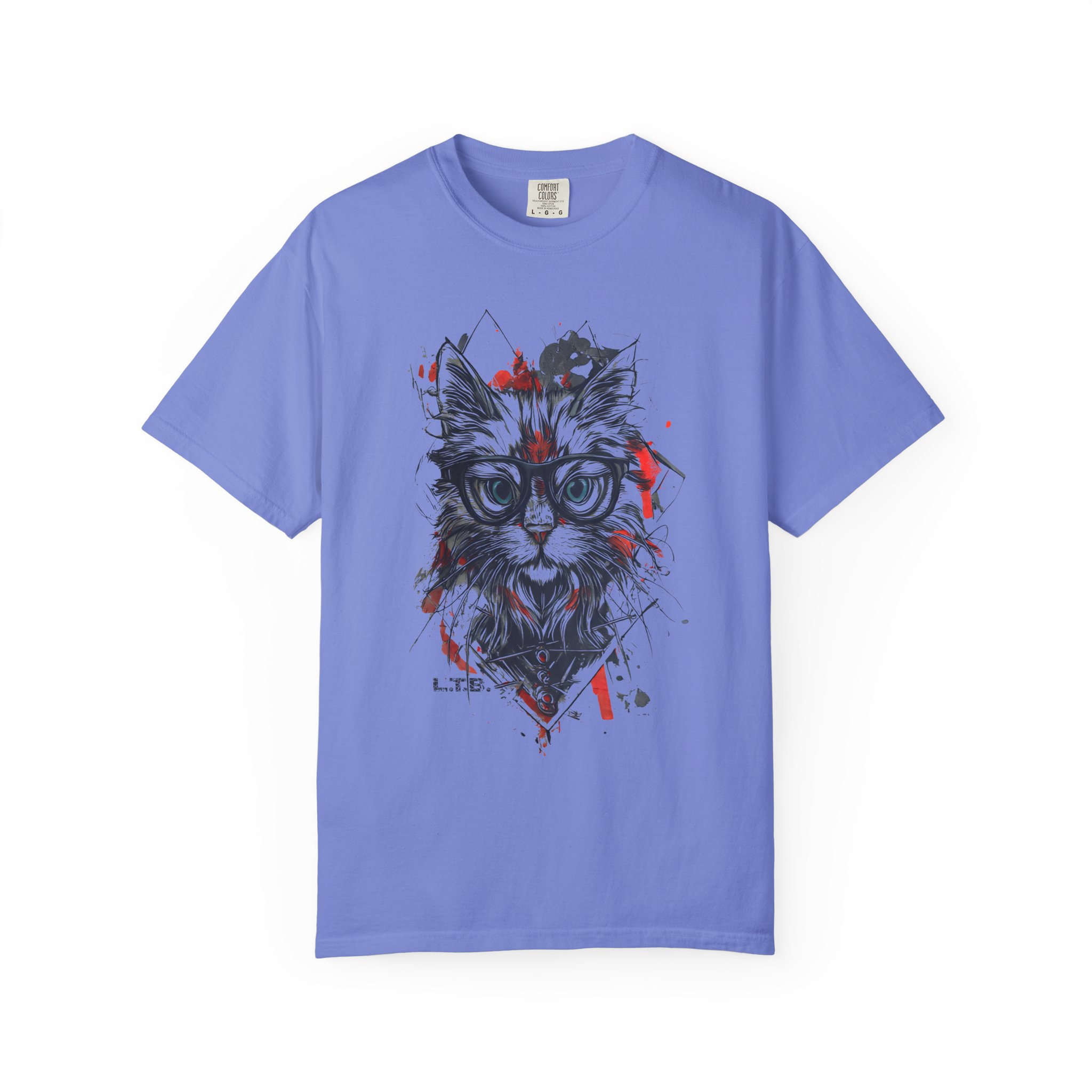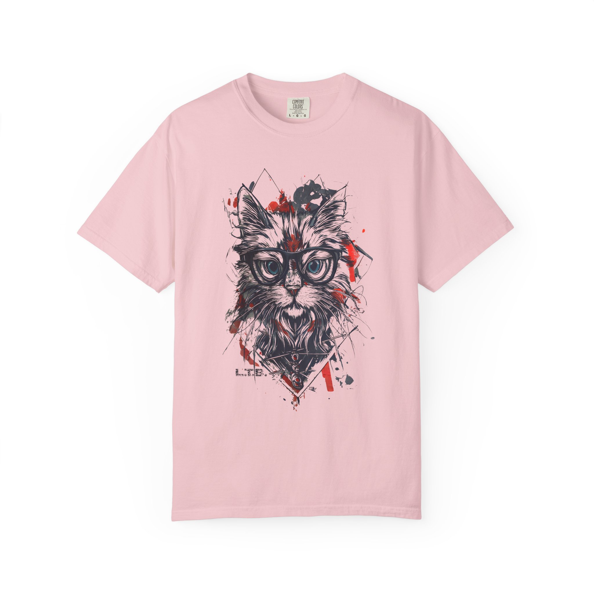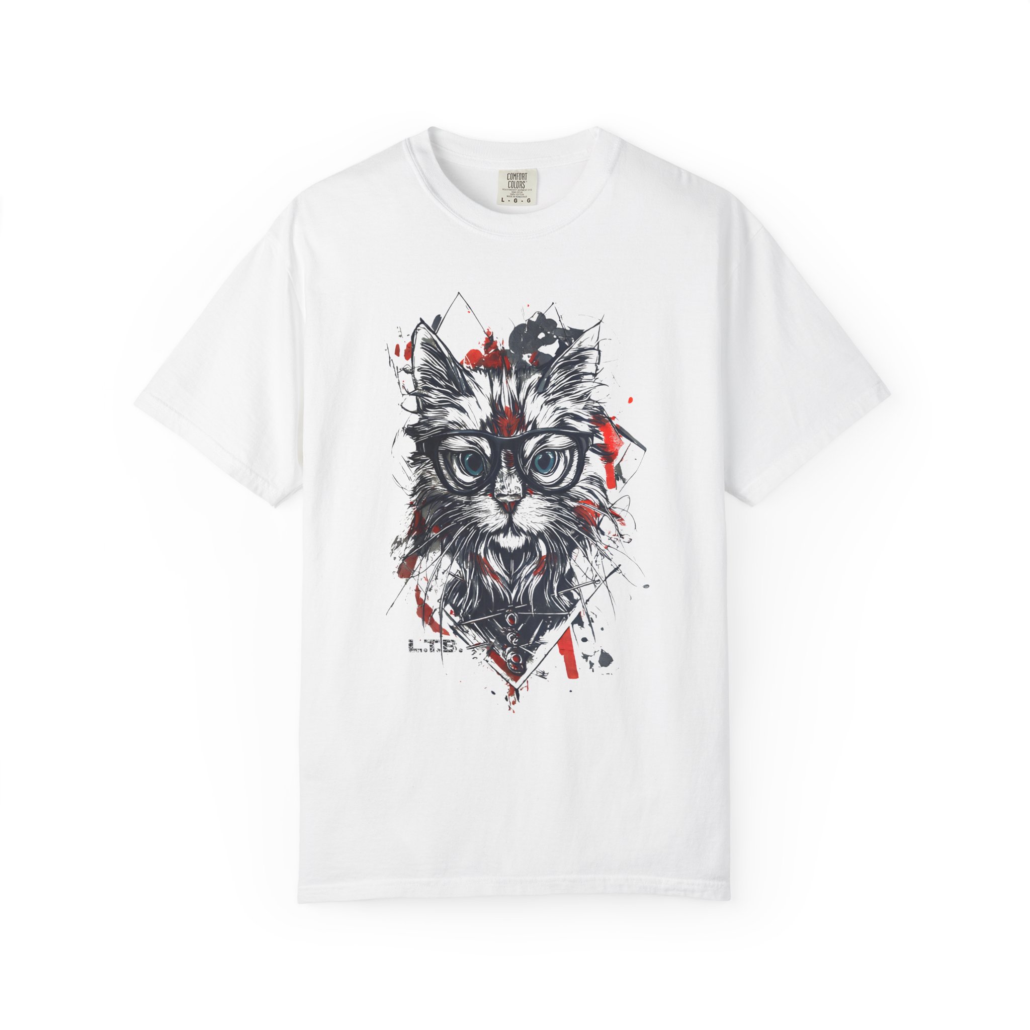 A geometric hipster cat tee featuring a stylish cat with glasses and modern ink-splatter design.