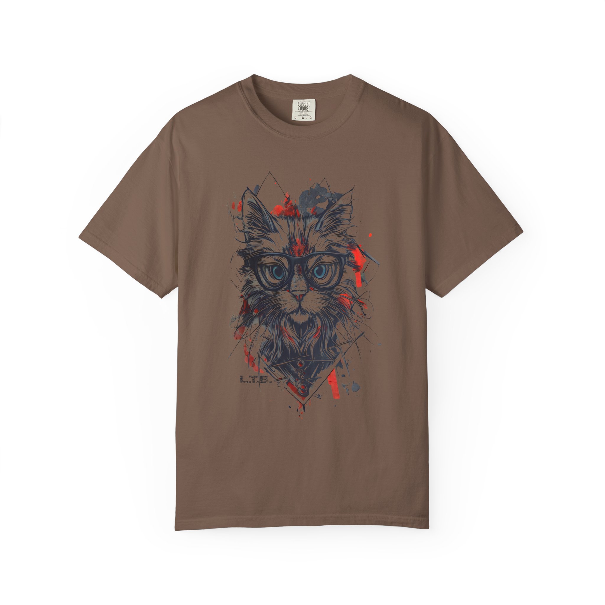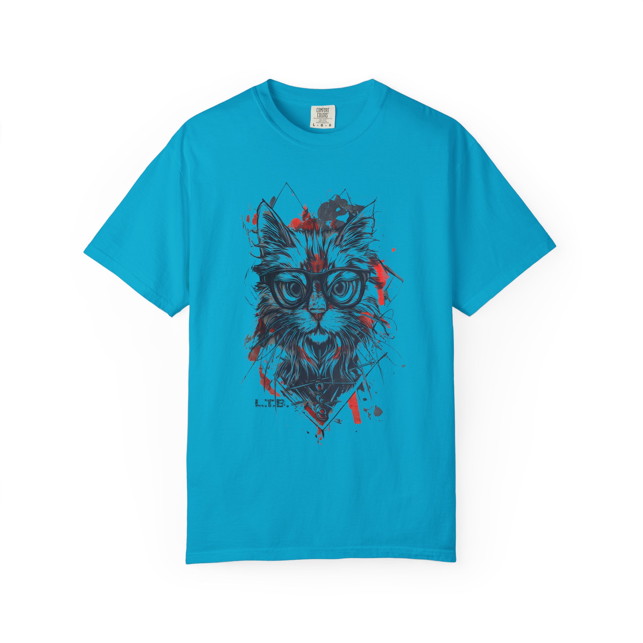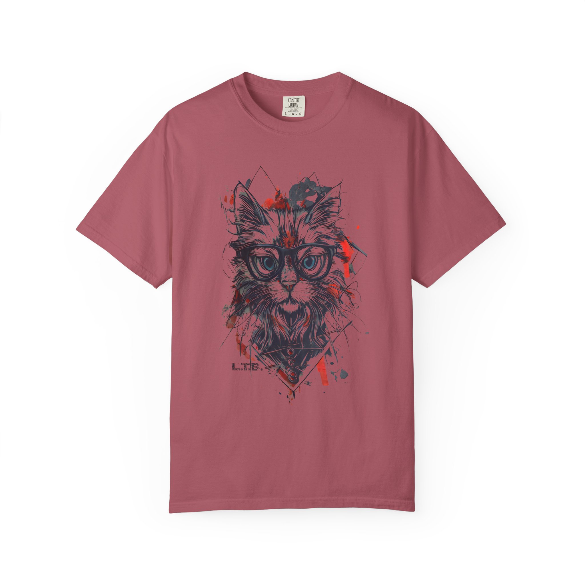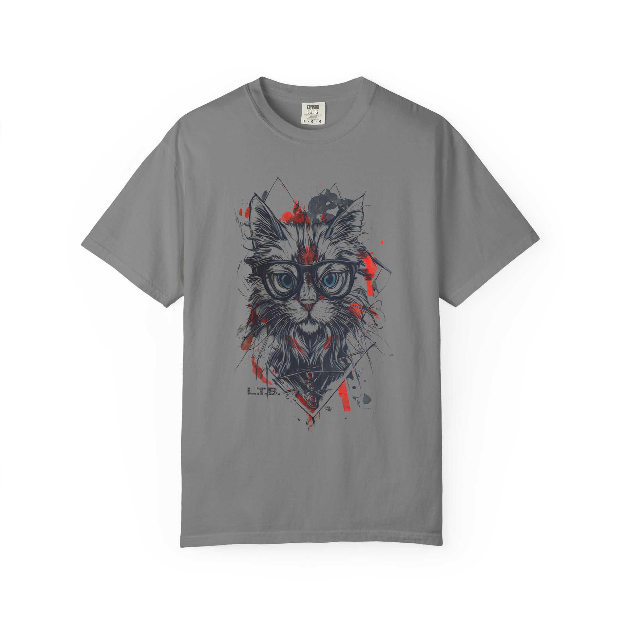 A geometric hipster cat tee featuring a stylish cat with glasses and modern ink-splatter design.