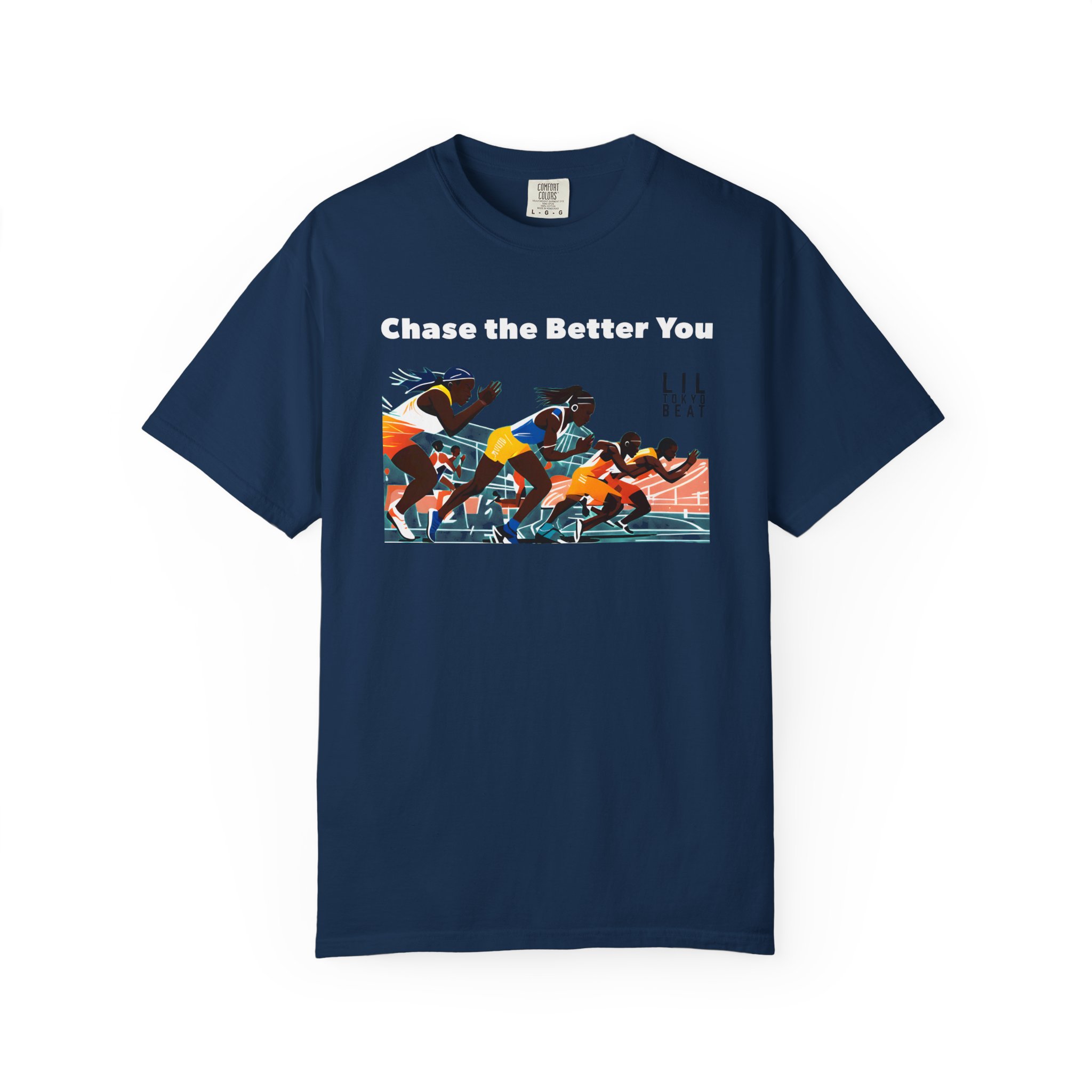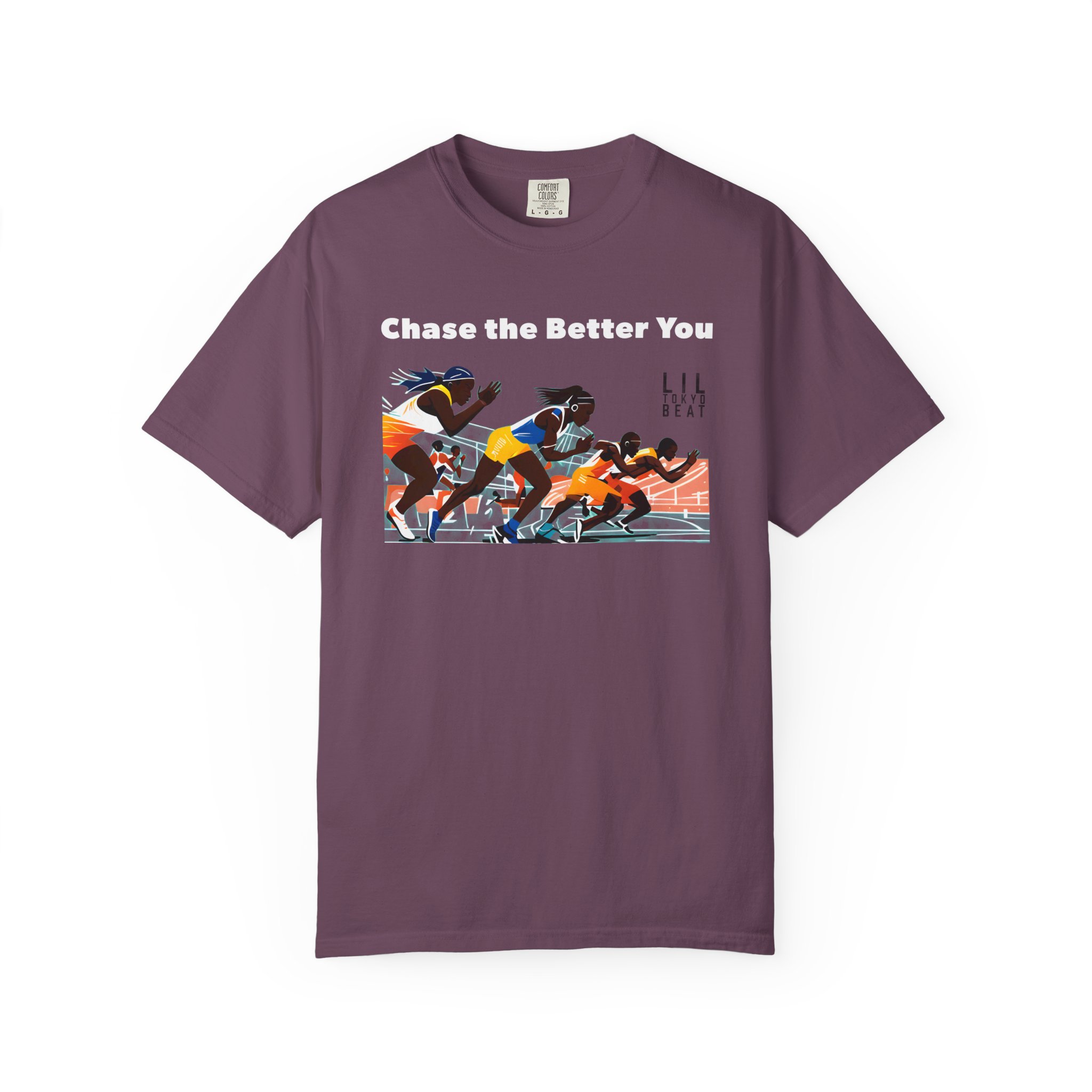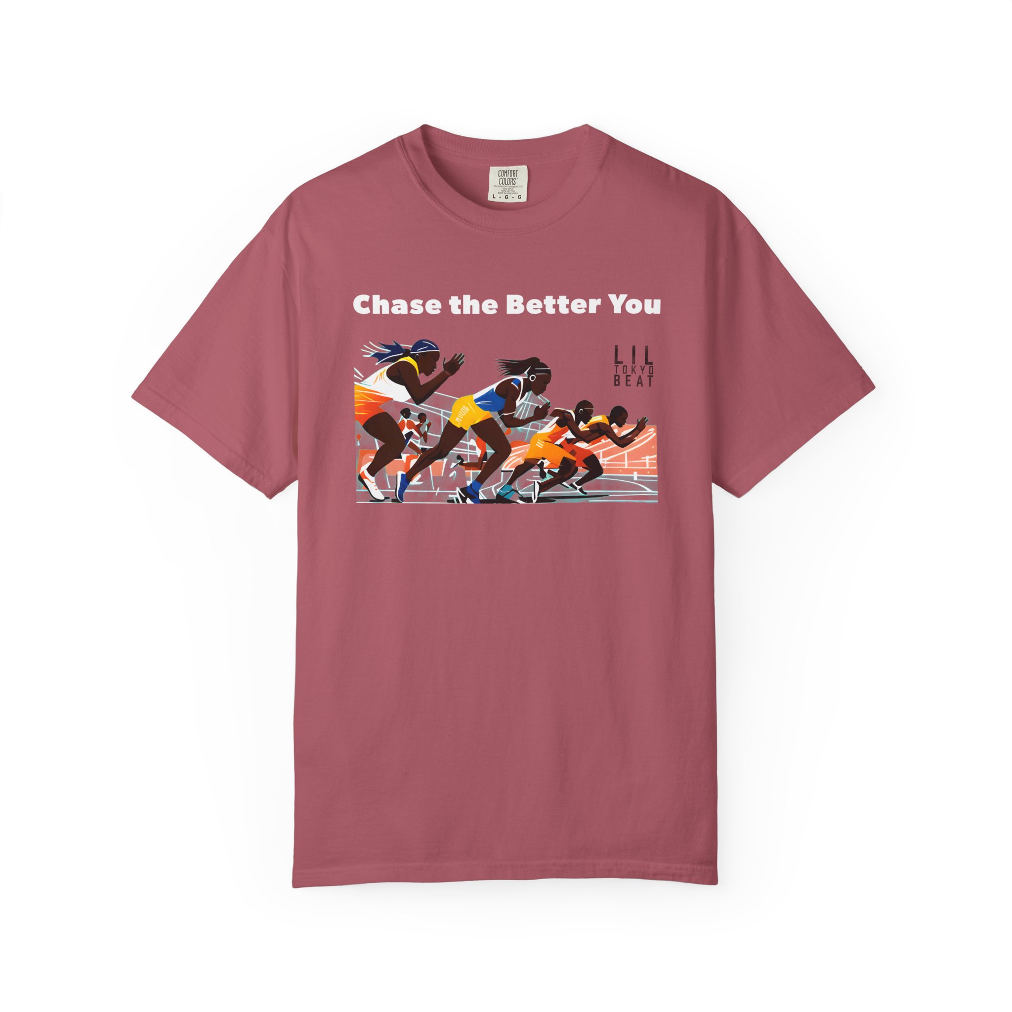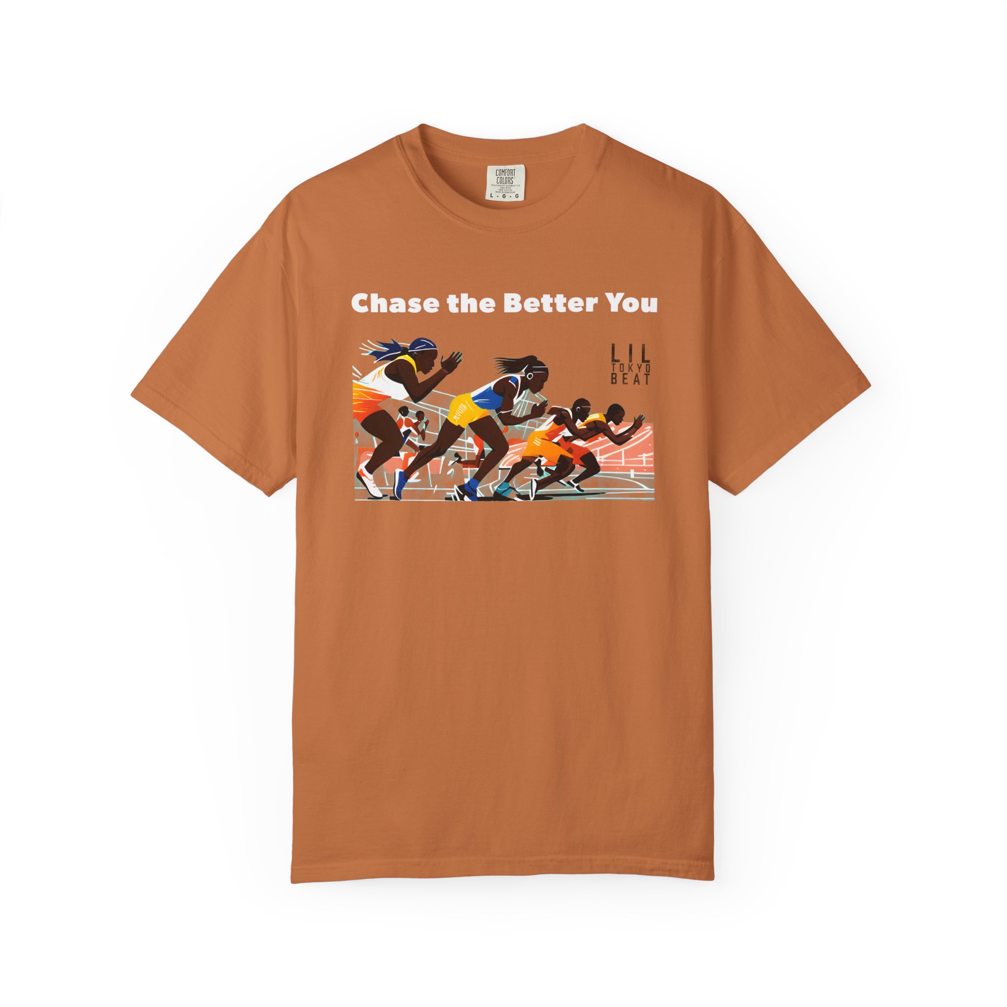 This garment-dyed tee brings the track to the street with warm, lived-in color and a bold finish-line scene. The front artwork captures sprinters mid-launch beneath the uplifting line “CHASE THE BETTER YOU,” turning a casual shirt into a quiet pep talk you can wear. The relaxed, medium-weight cotton breaks in softly over time, so the color and handfeel deepen with every wash. Slip it on before a morning run, layer it for a weekend meet-up, or wear it after practice to carry that focused energy into your day.