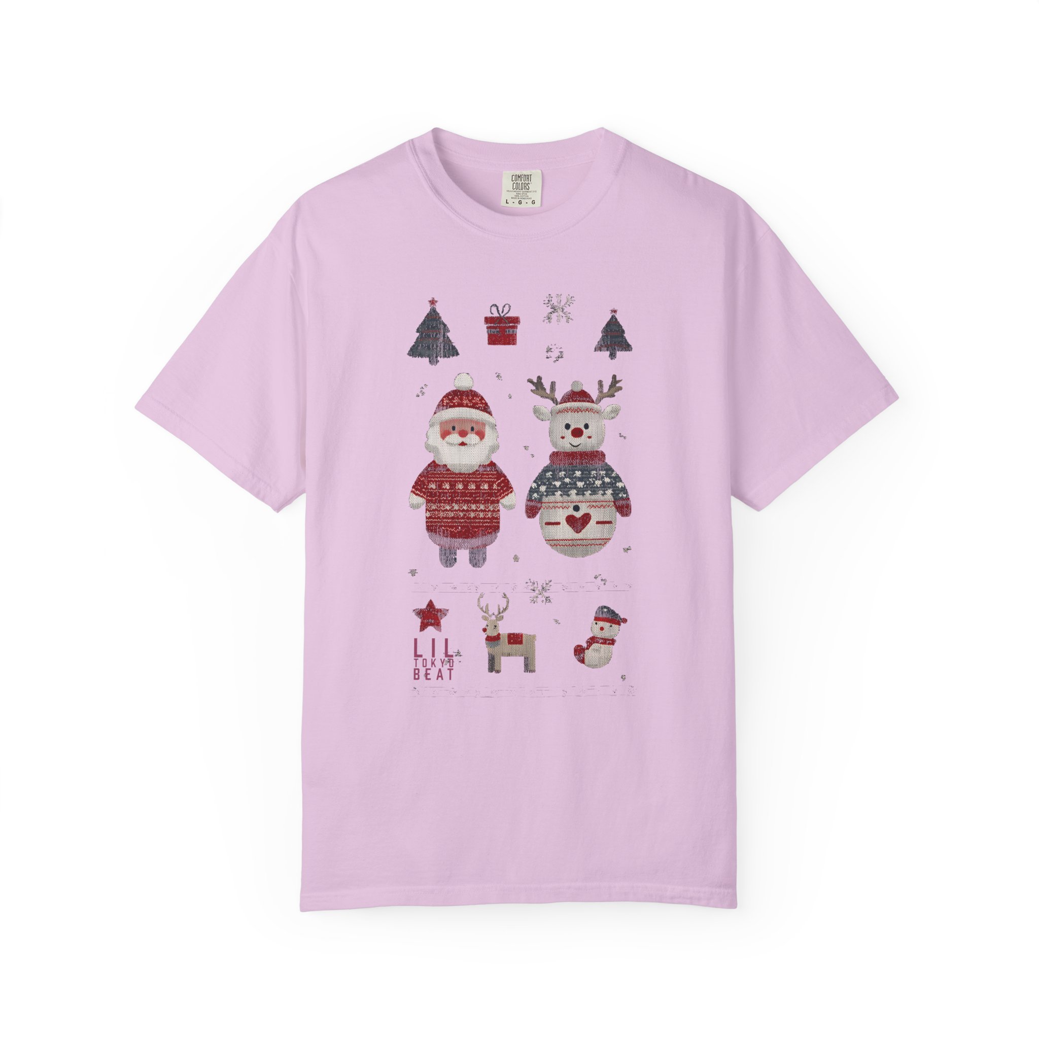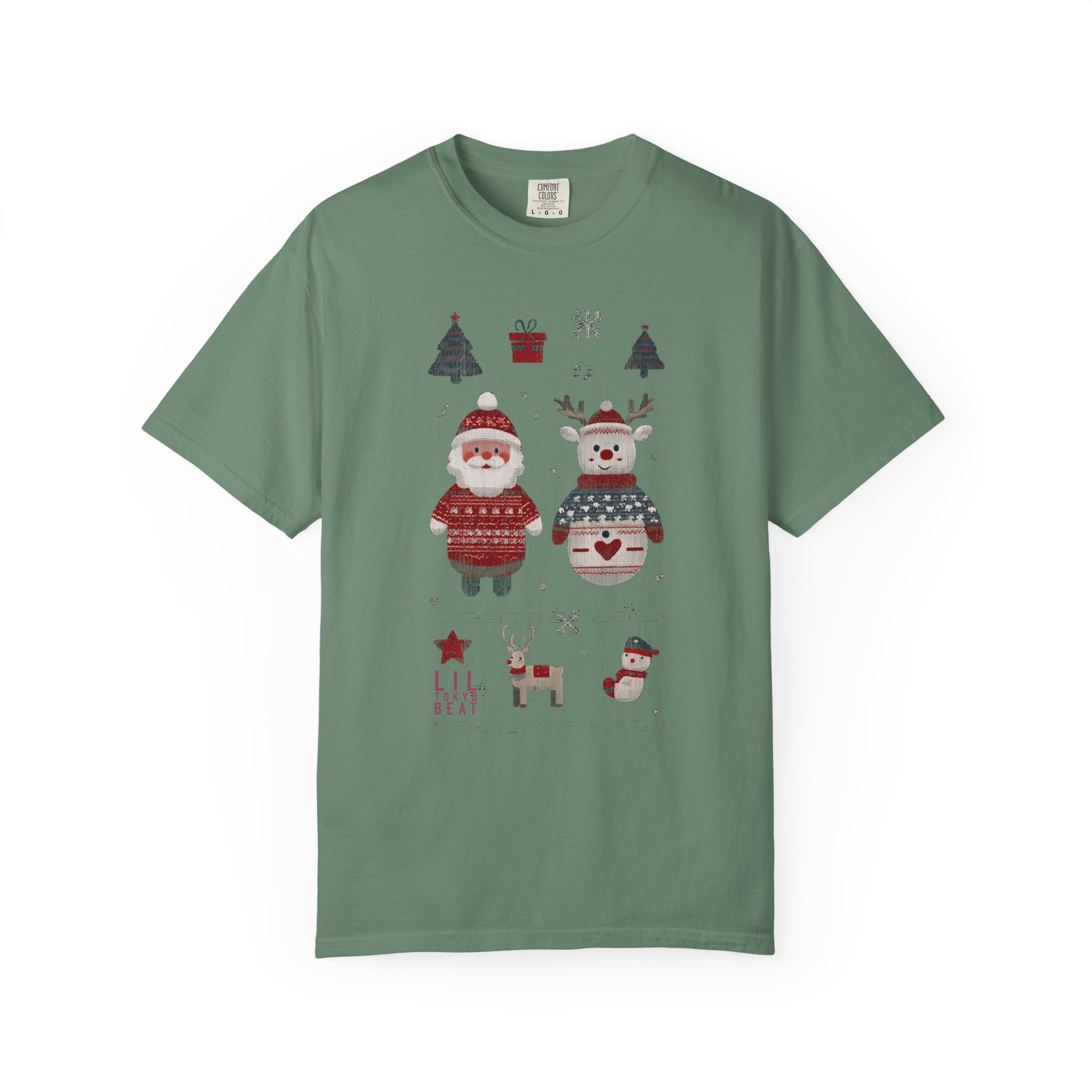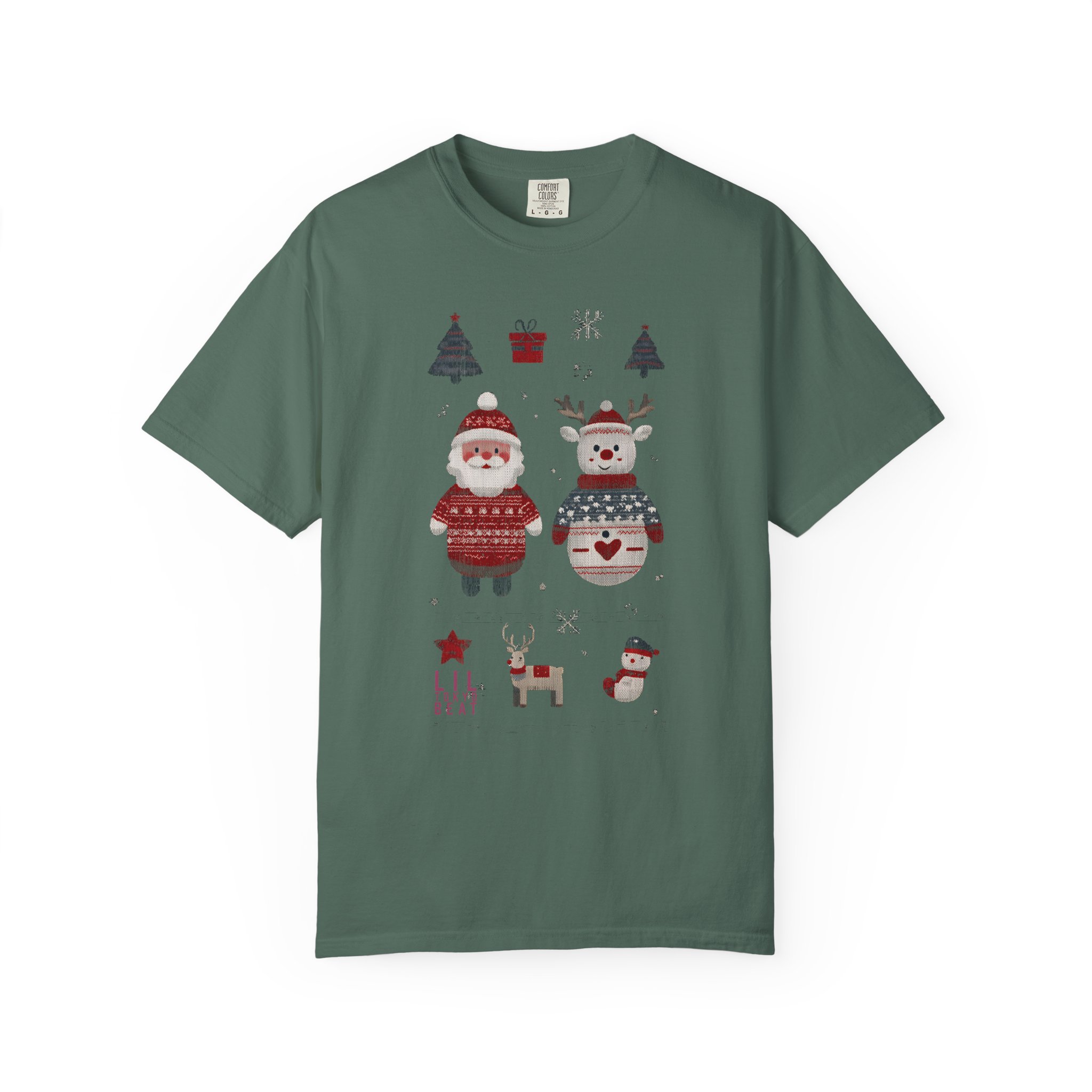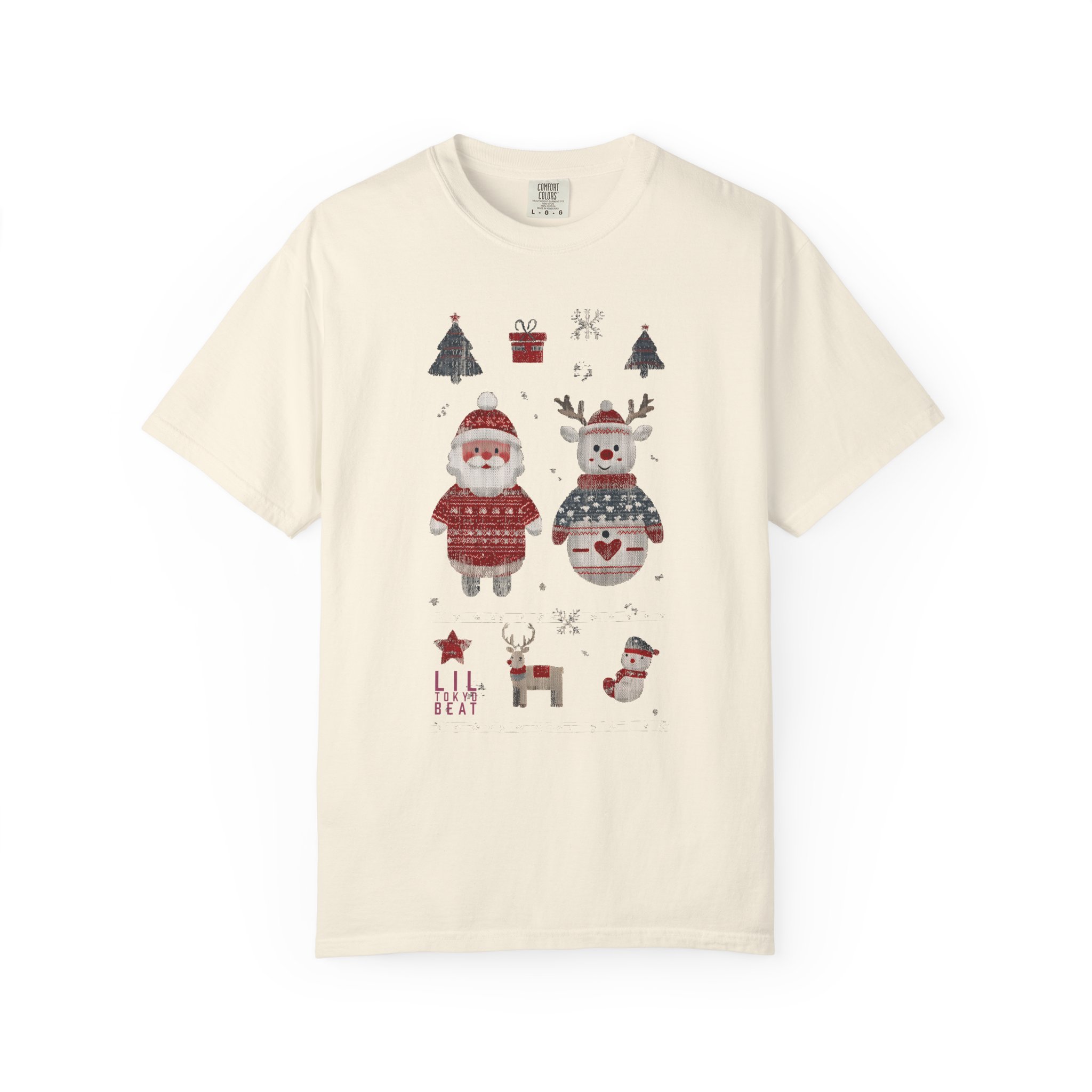 Soft, heavyweight cotton with a homespun holiday print — this relaxed-fit tee feels like a cozy morning by the tree. Garment-dyed for a gently worn color and extra softness, it wears in, not out. The front shows warm, hand-drawn motifs: a sweater-clad Santa, a festive snowman, tiny trees, a little reindeer and stocking accents that read like a page from a winter sketchbook. Tubular knit and double-needle seams give it a clean silhouette and durable finish. Wear it layered under a cardigan for caroling, or alone for slow, firelit evenings and family movie nights.