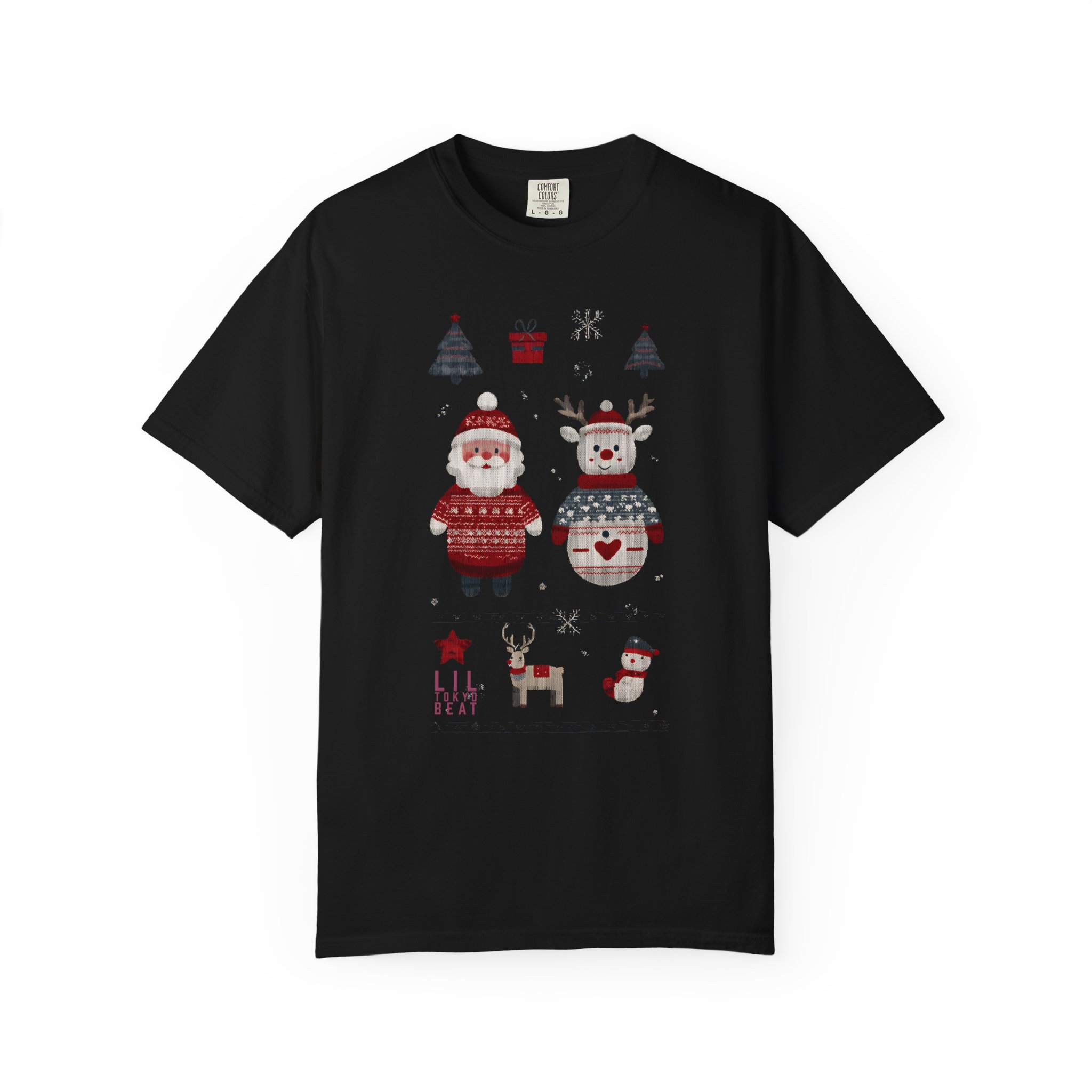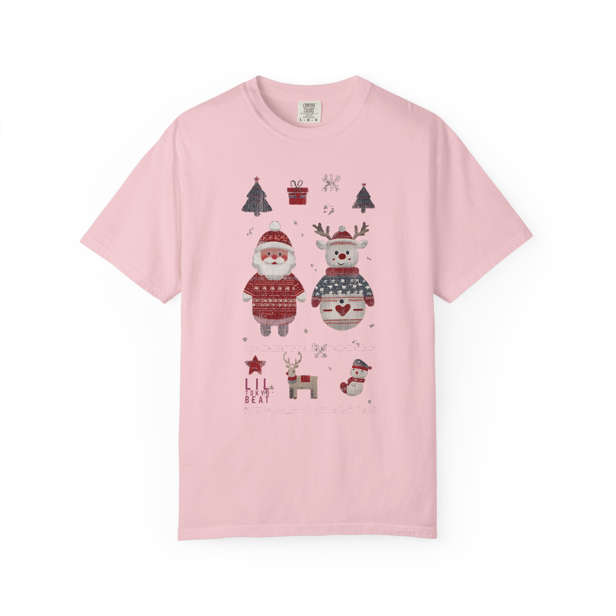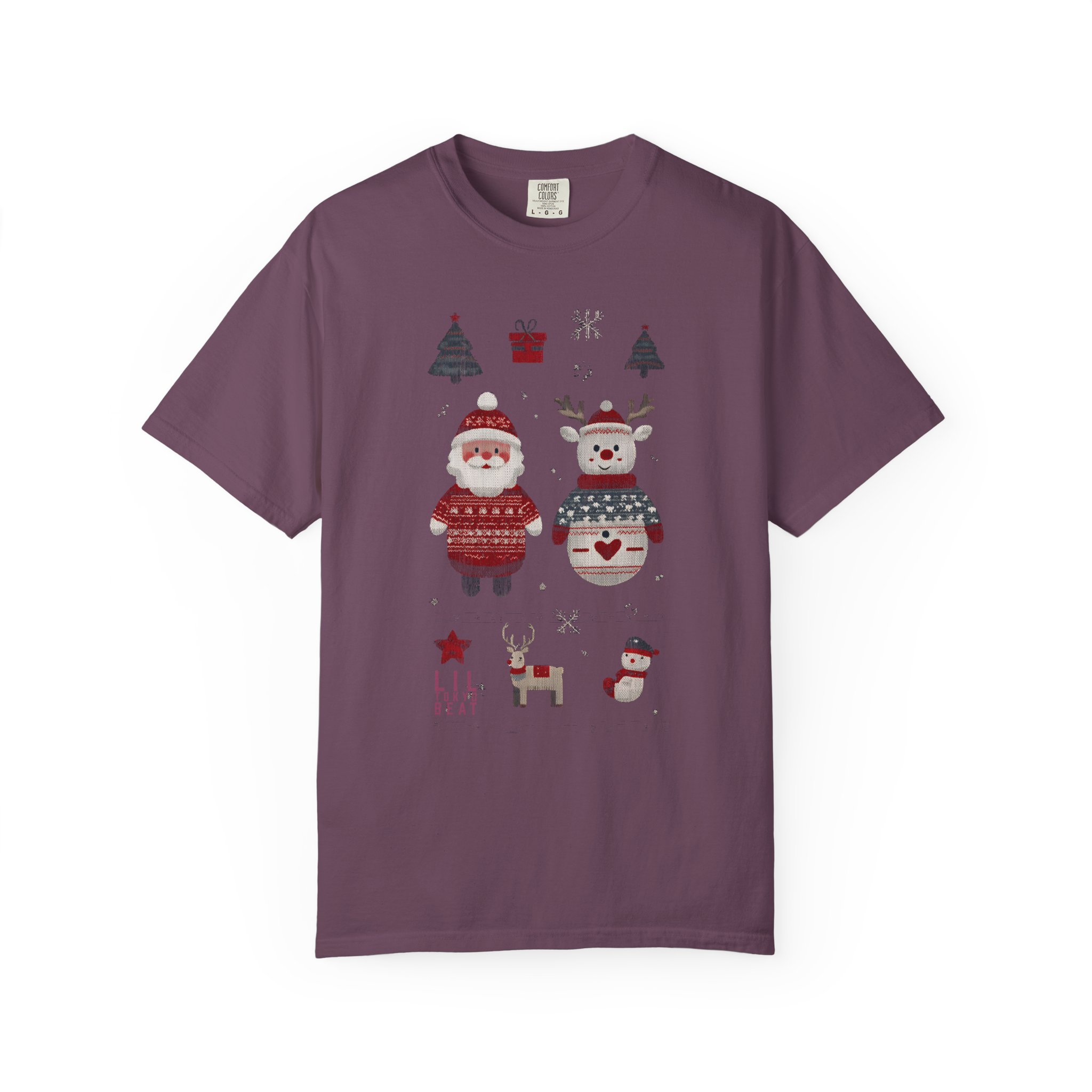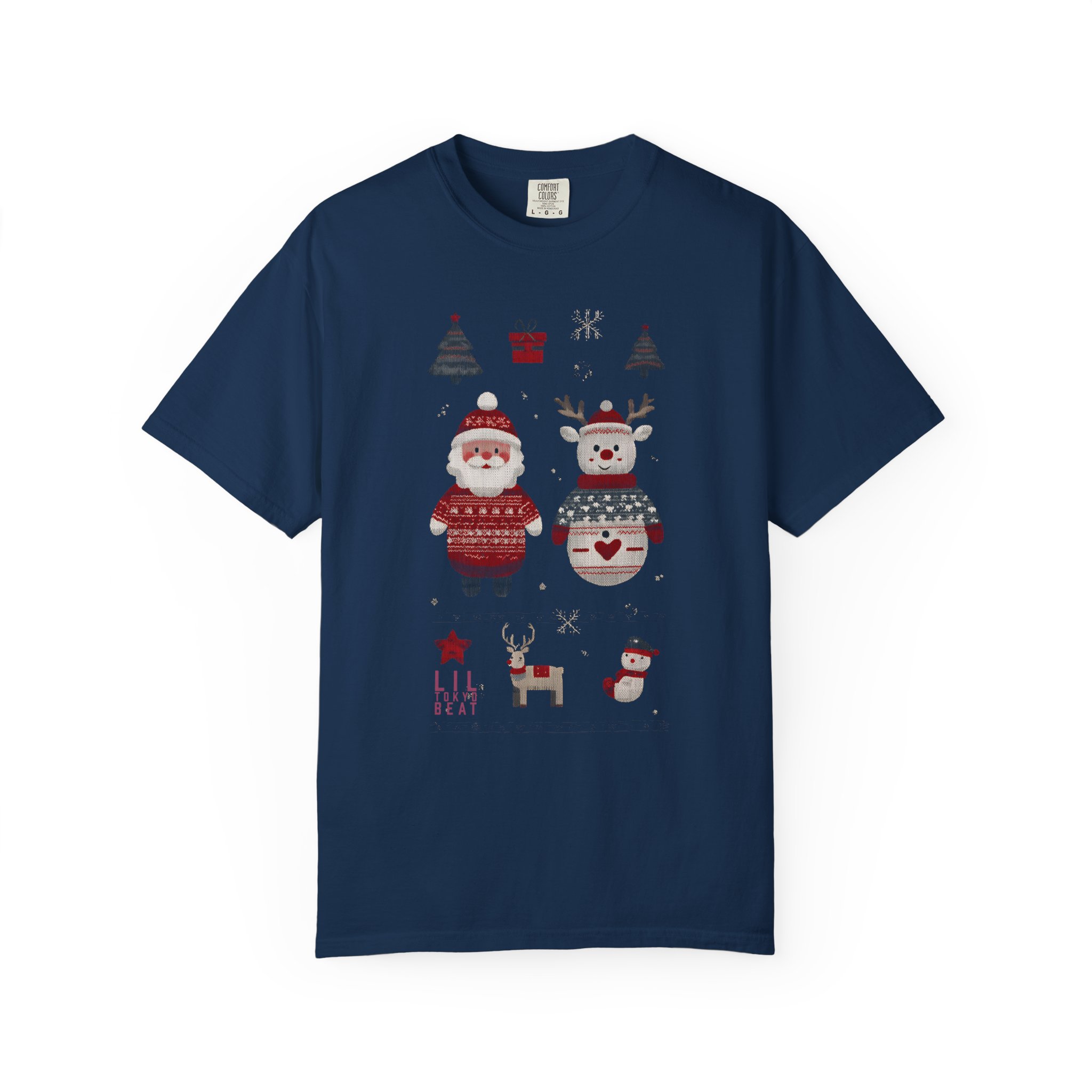 Soft, heavyweight cotton with a homespun holiday print — this relaxed-fit tee feels like a cozy morning by the tree. Garment-dyed for a gently worn color and extra softness, it wears in, not out. The front shows warm, hand-drawn motifs: a sweater-clad Santa, a festive snowman, tiny trees, a little reindeer and stocking accents that read like a page from a winter sketchbook. Tubular knit and double-needle seams give it a clean silhouette and durable finish. Wear it layered under a cardigan for caroling, or alone for slow, firelit evenings and family movie nights.