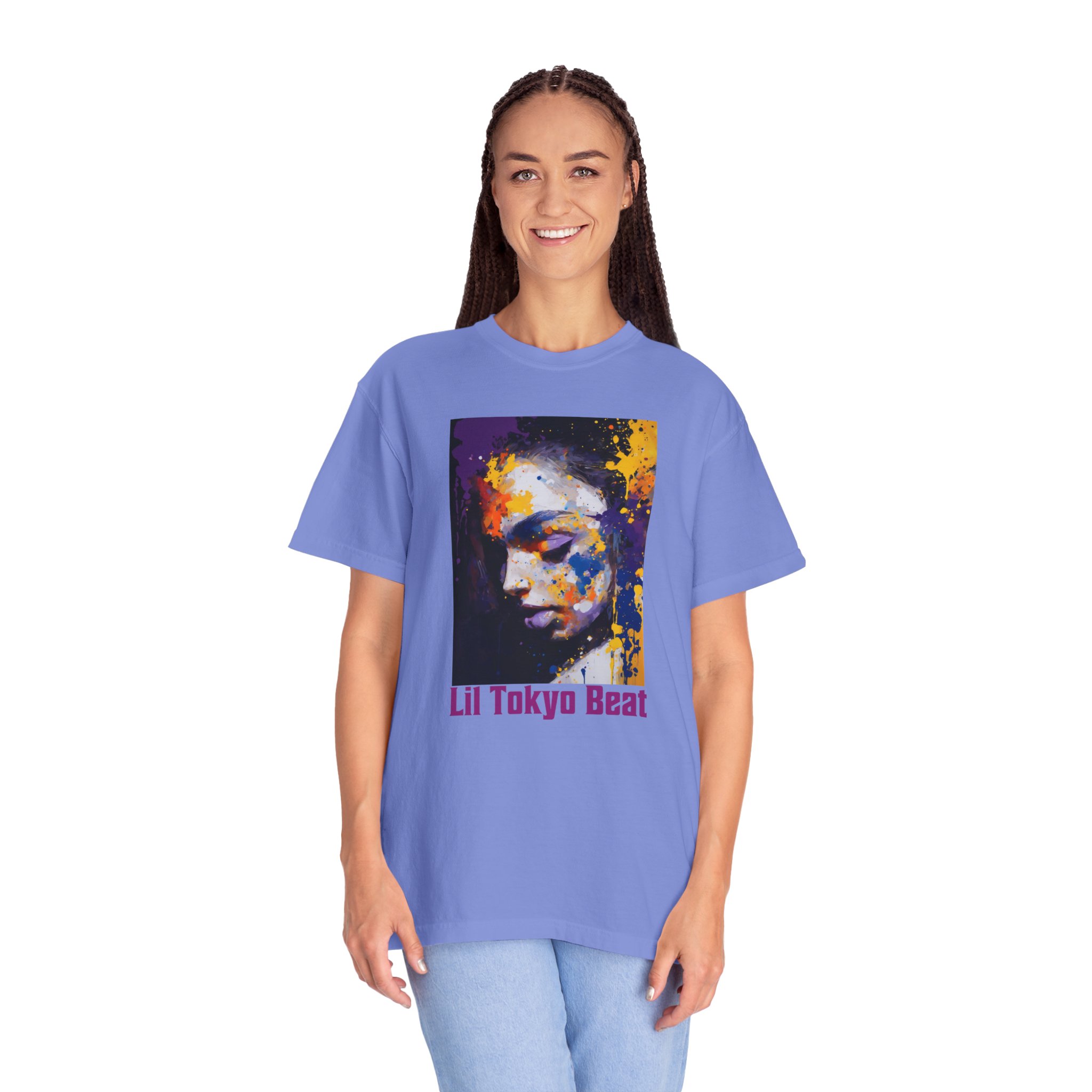 This colorful portrait design on a unisex Garment-Dyed T-shirt captures the essence of a young female contemplating and resting her soul. Perfect for those looking for a unique and artsy addition to their wardrobe. Ideal for art enthusiasts, young adults, and those who appreciate creative fashion. Relevant for birthdays, art events, casual outings, and everyday wear.