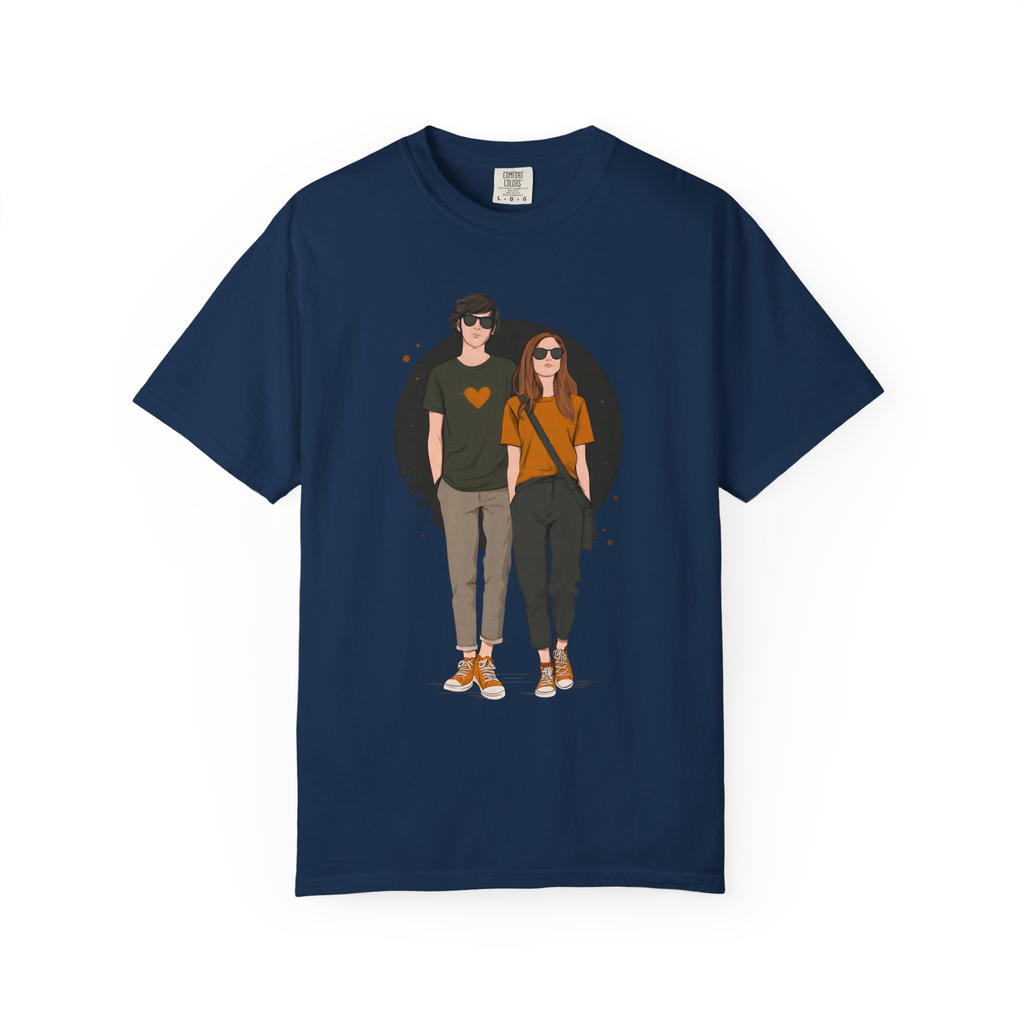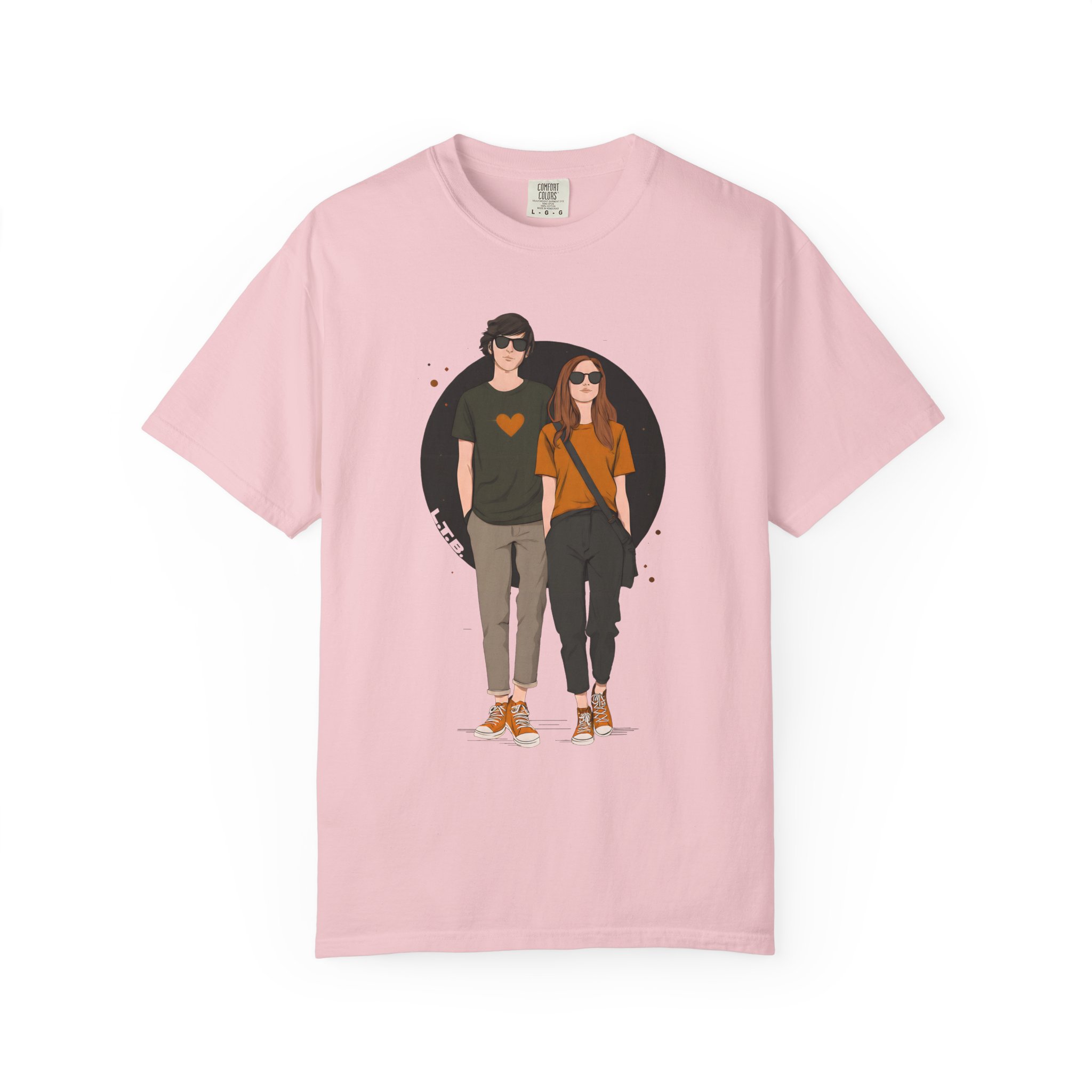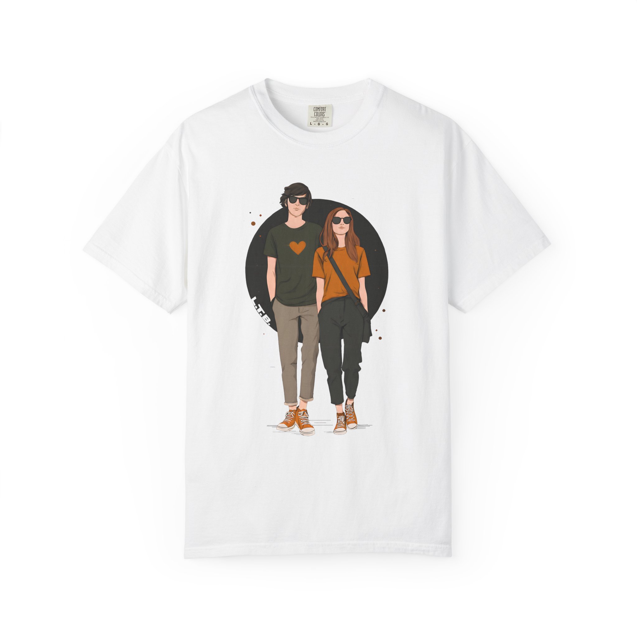 A modern love story told through style, posture, and attitude. This cool couple Valentine T-shirt features a confident pair walking side by side, both wearing sunglasses—calm, composed, and perfectly in sync. The subtle heart detail adds warmth without overpowering the minimalist illustration, creating a balance between romance and everyday street style.