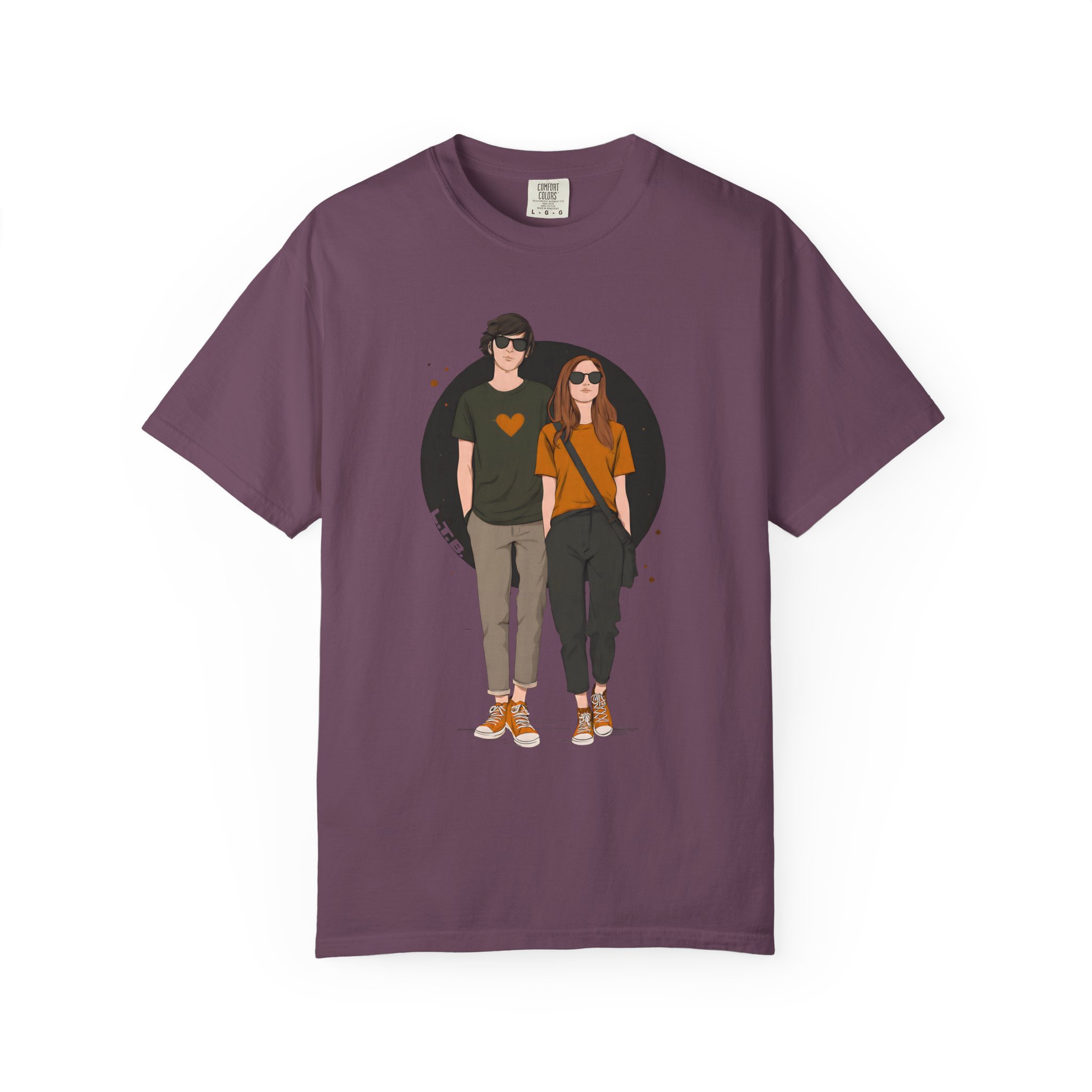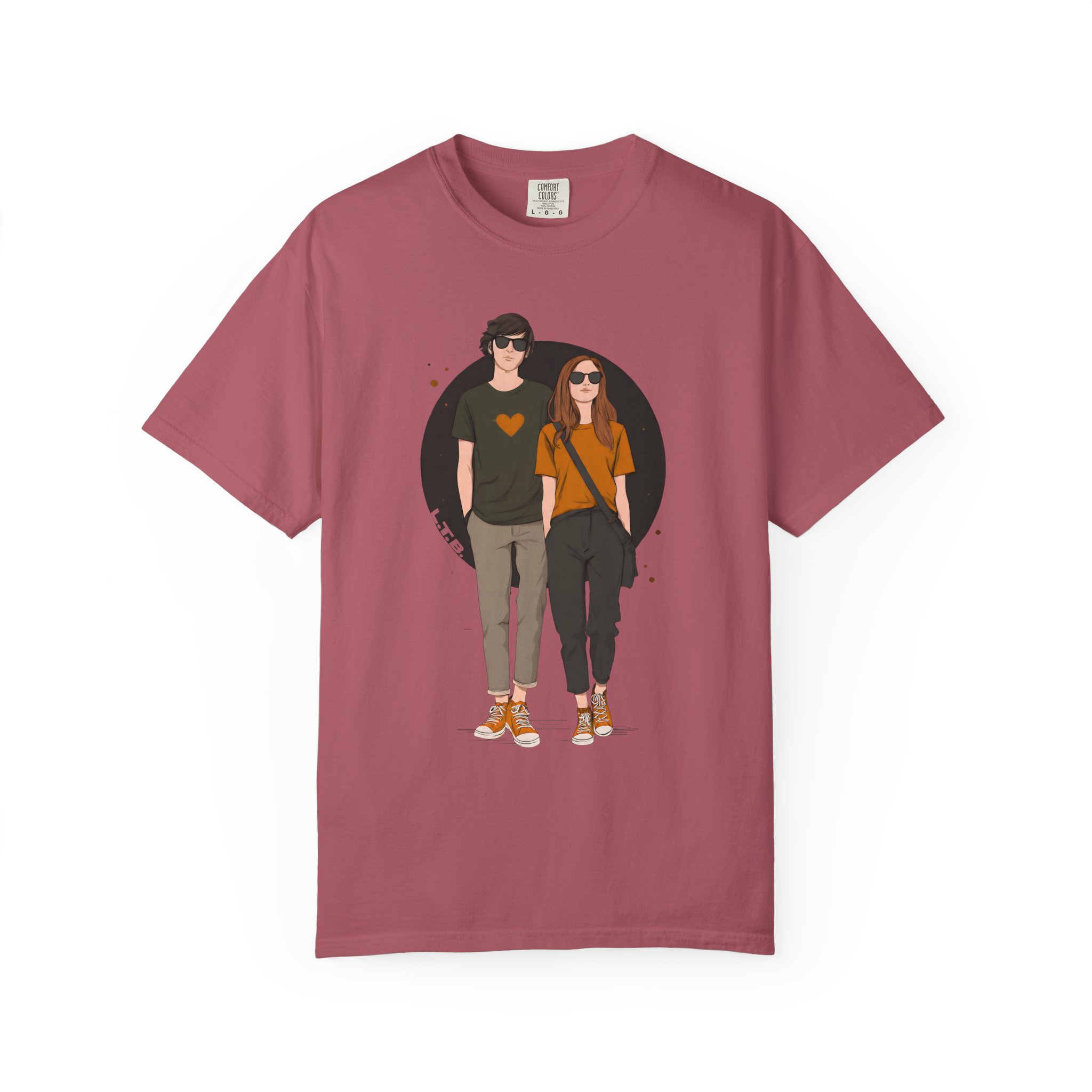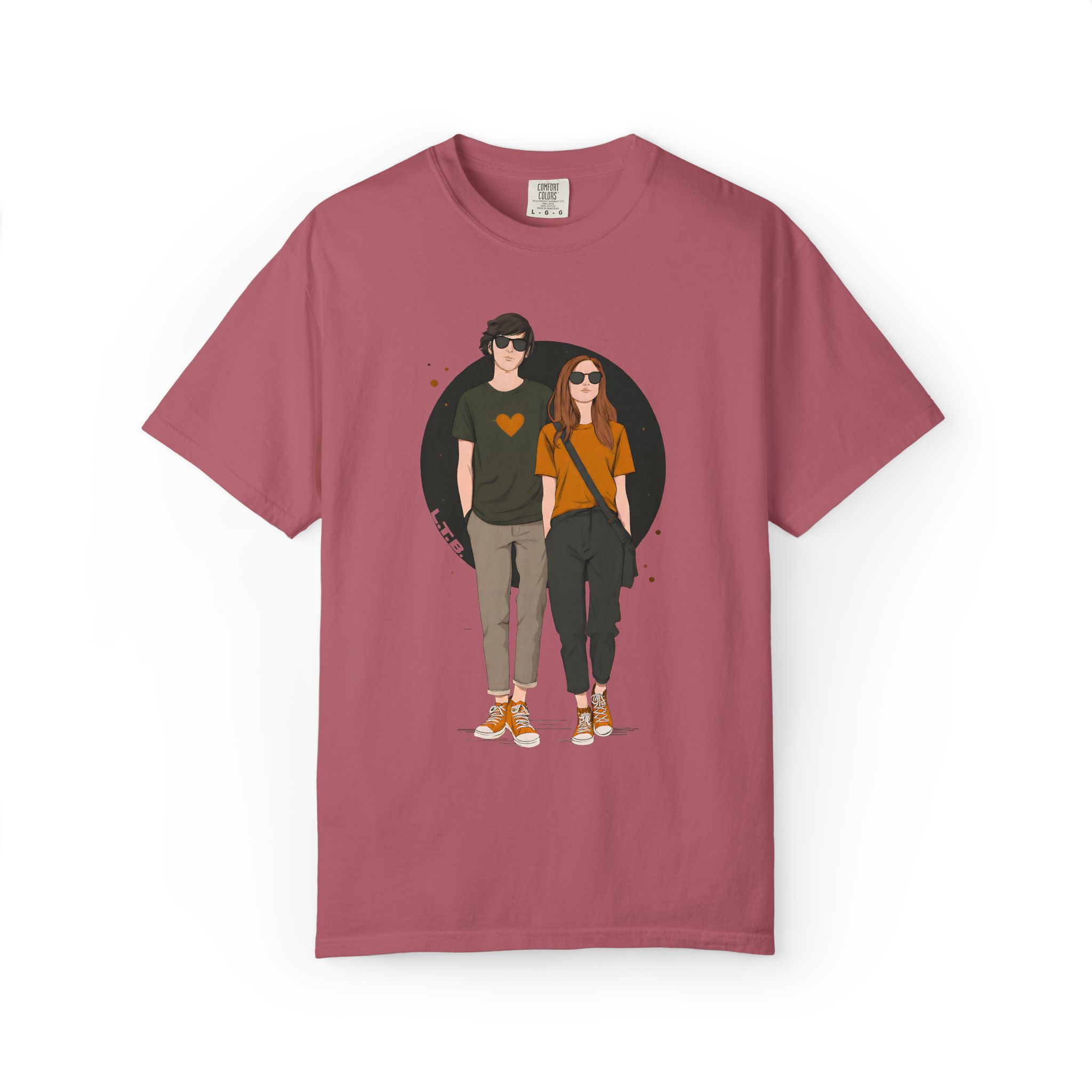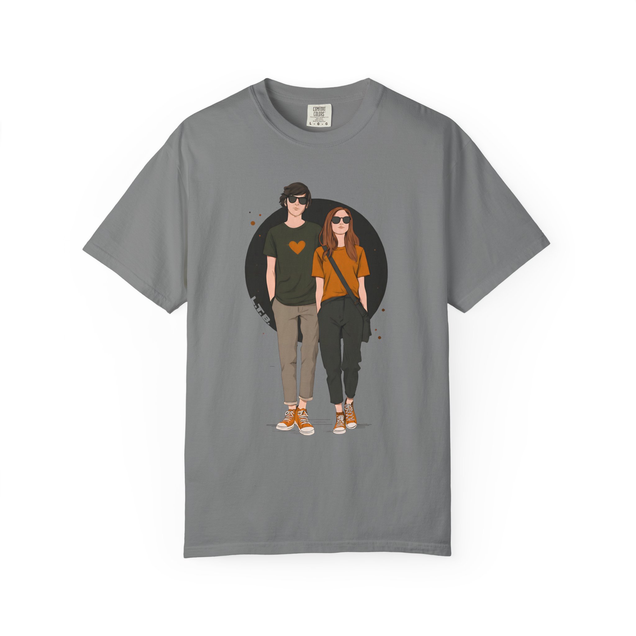 A modern love story told through style, posture, and attitude. This cool couple Valentine T-shirt features a confident pair walking side by side, both wearing sunglasses—calm, composed, and perfectly in sync. The subtle heart detail adds warmth without overpowering the minimalist illustration, creating a balance between romance and everyday street style.