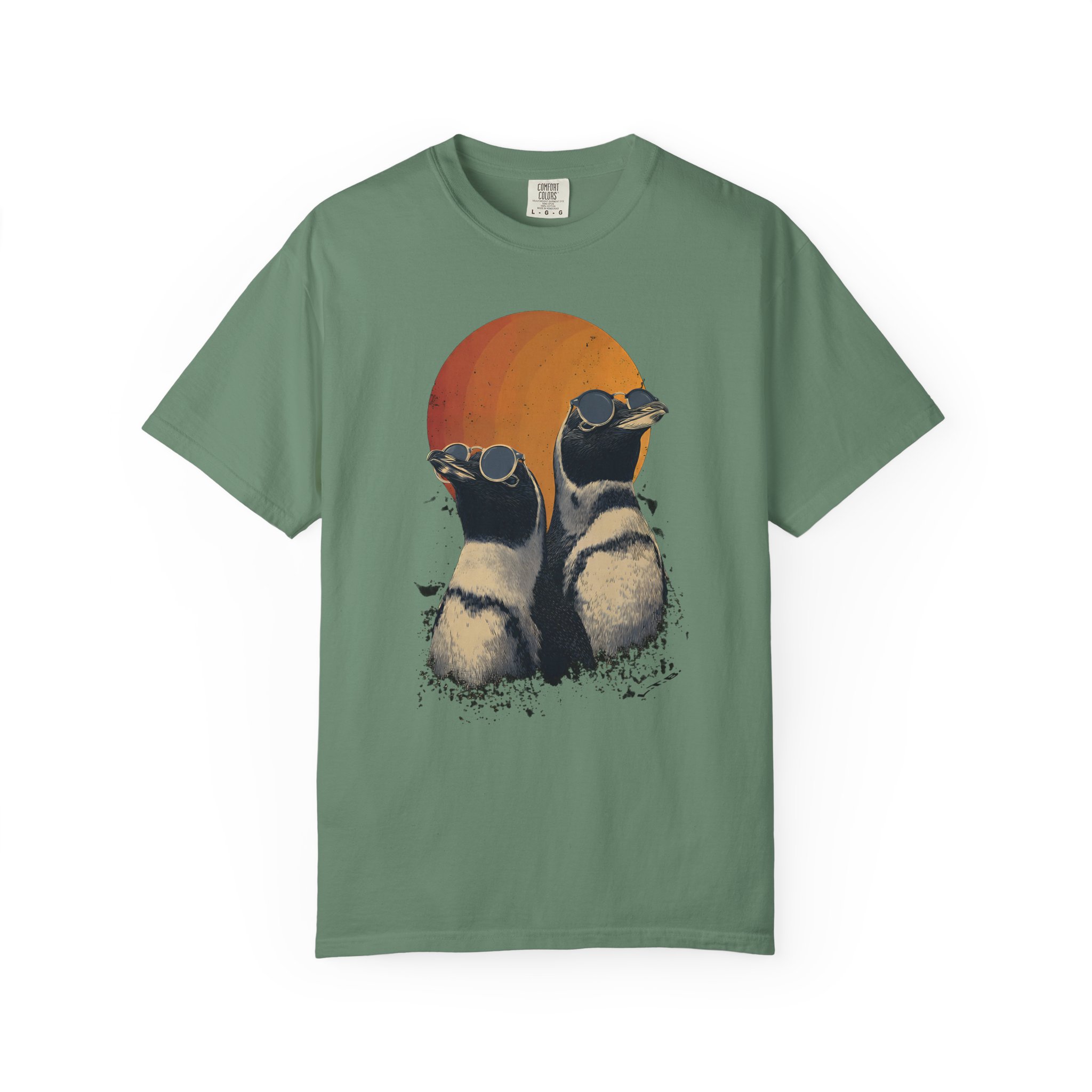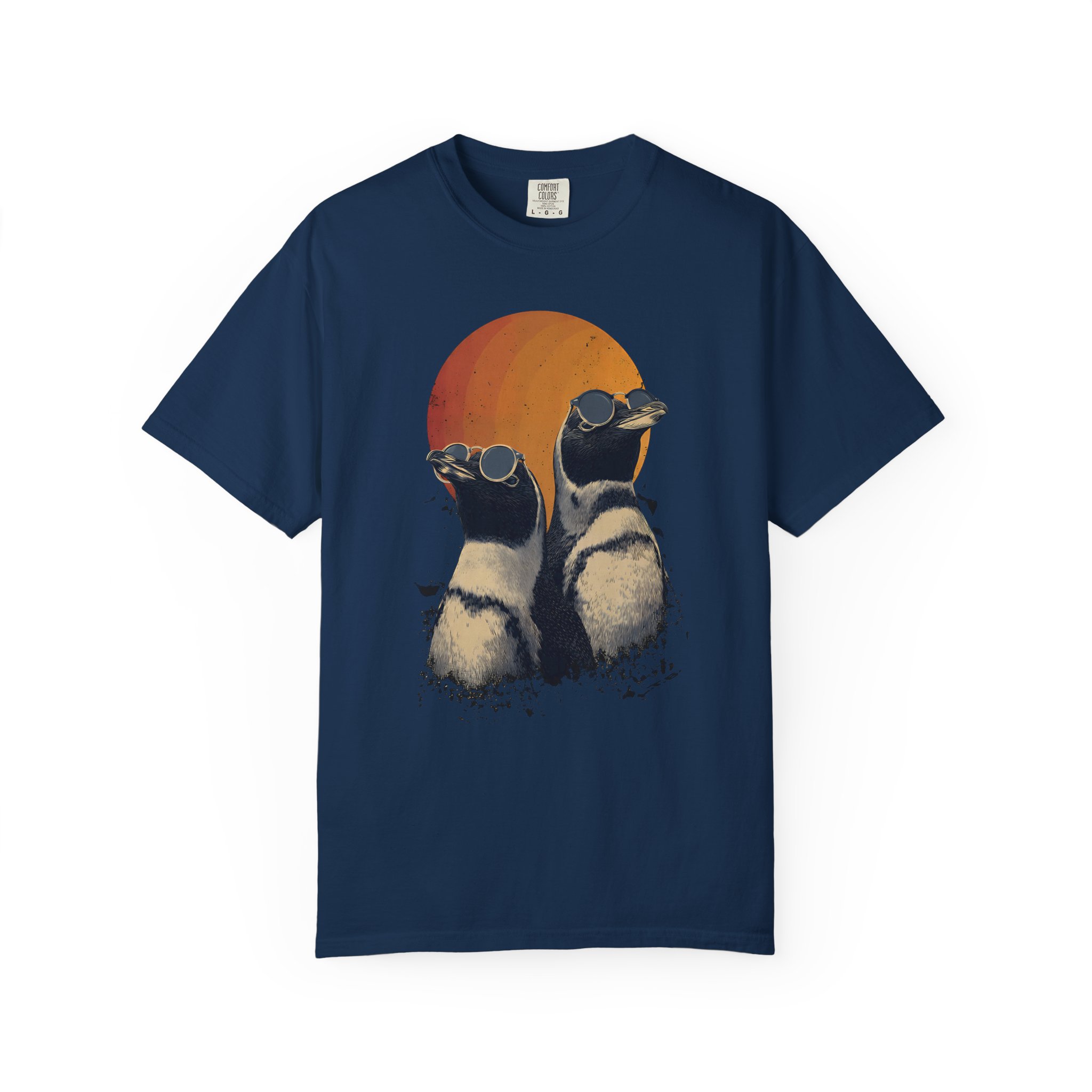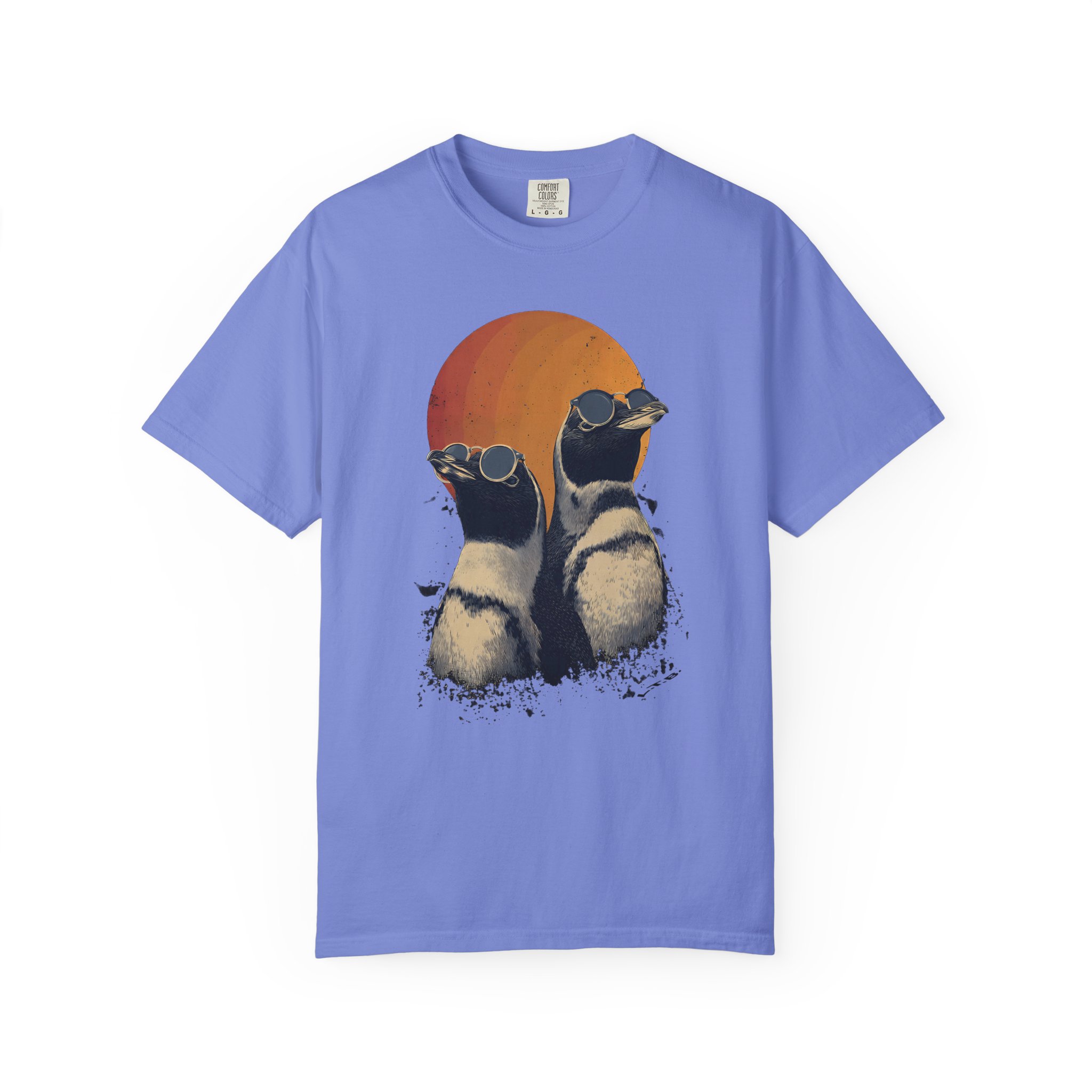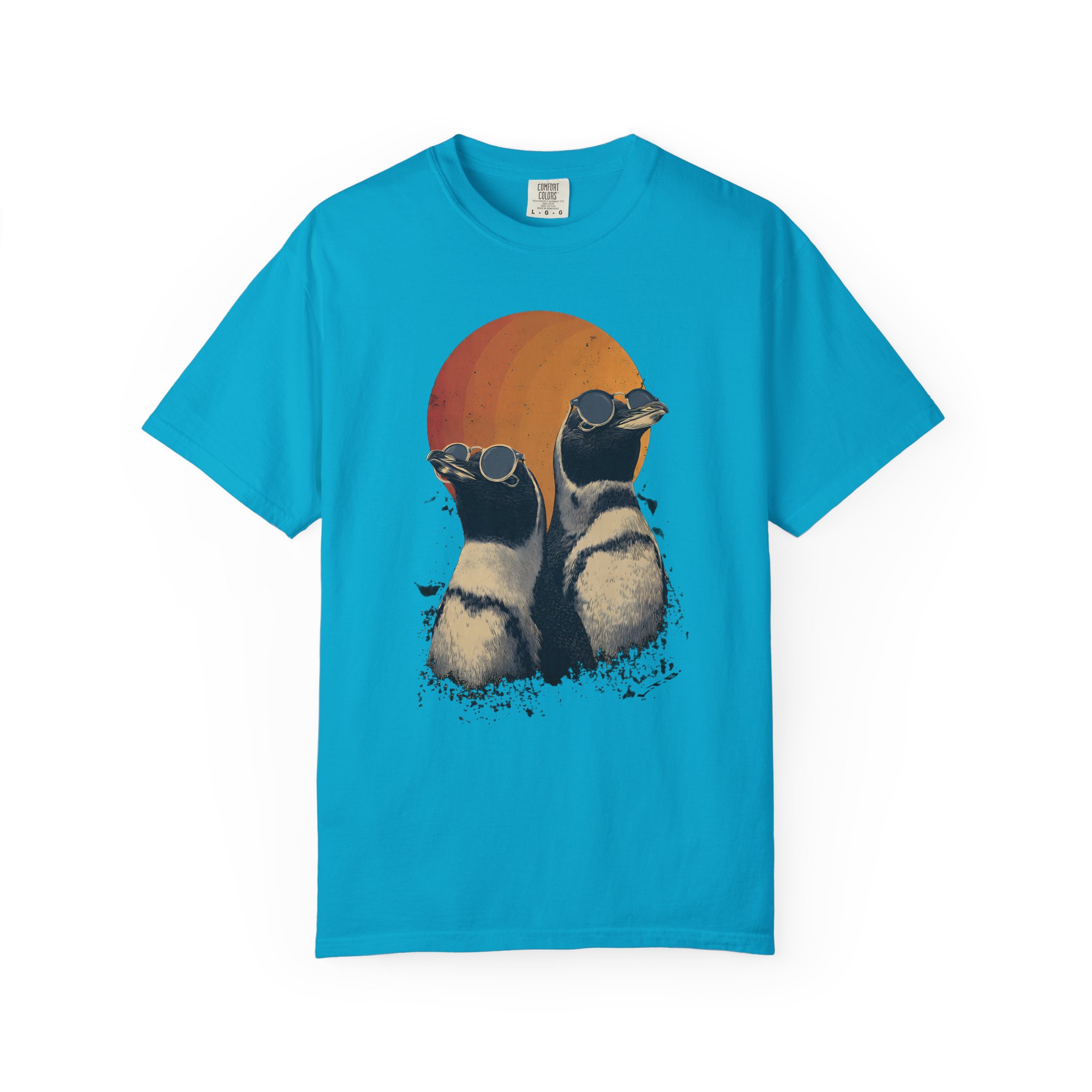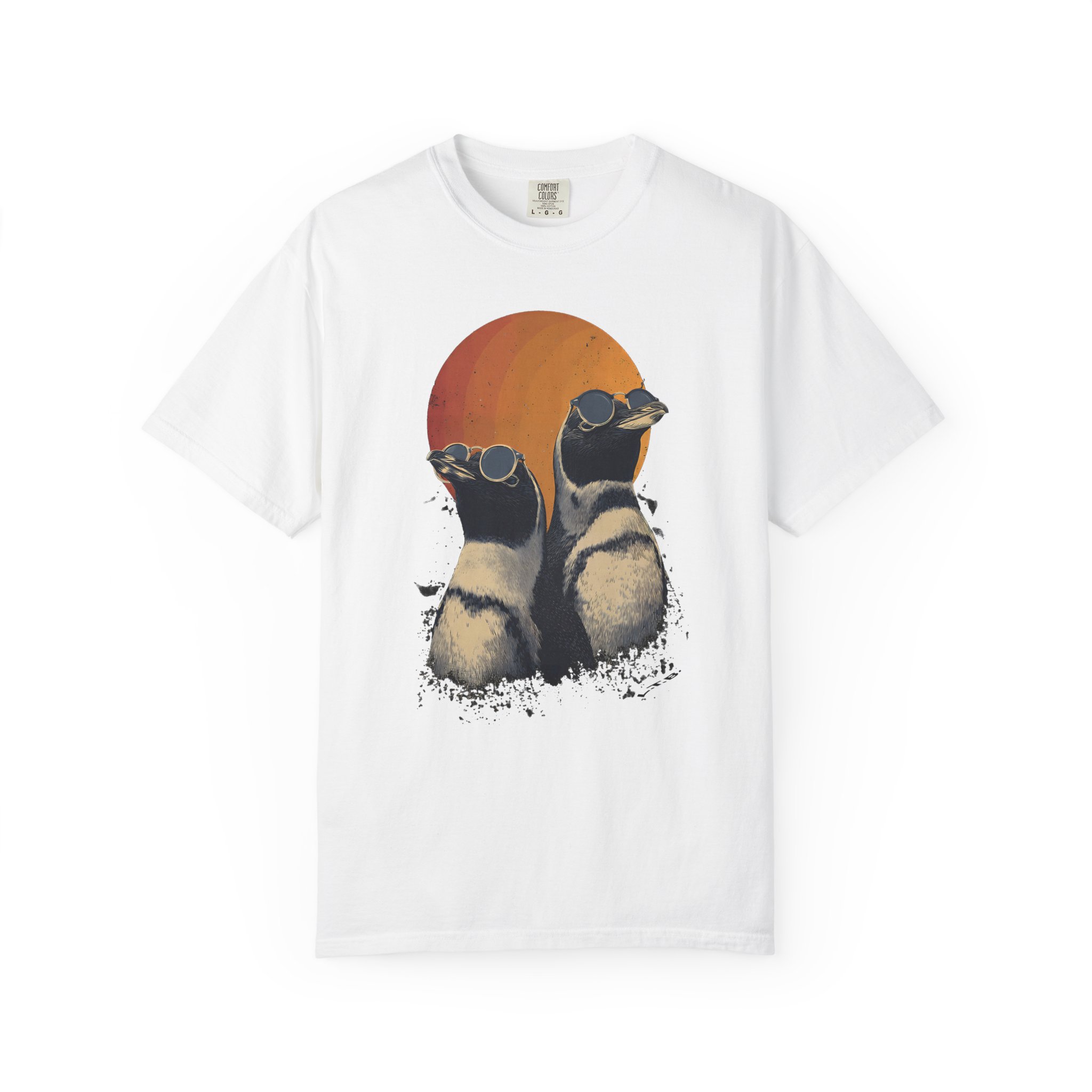 Retro sunset penguins with cool attitude — wearable art with laid-back confidence.