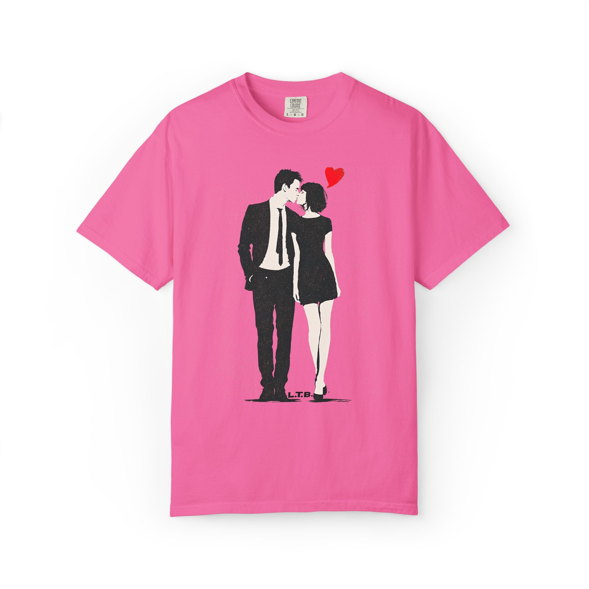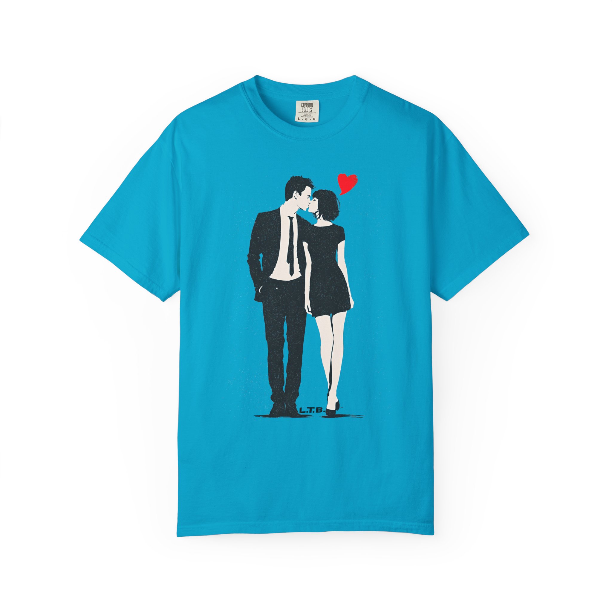 This garment-dyed tee carries a quiet, vintage romance. A pared-back black-and-white illustration of a couple—dressed sharp and leaning into a private moment—sits center chest, with one small red heart lifting the scene. The heavyweight, relaxed tee drapes like a well-worn favorite: soft from garment-dyeing, sturdy from double-needle seams and tubular construction, and available in many colors and sizes so it settles naturally into your rotation. Wear it on slow city nights, date walks, or when you want to carry a little secret smile with you.
