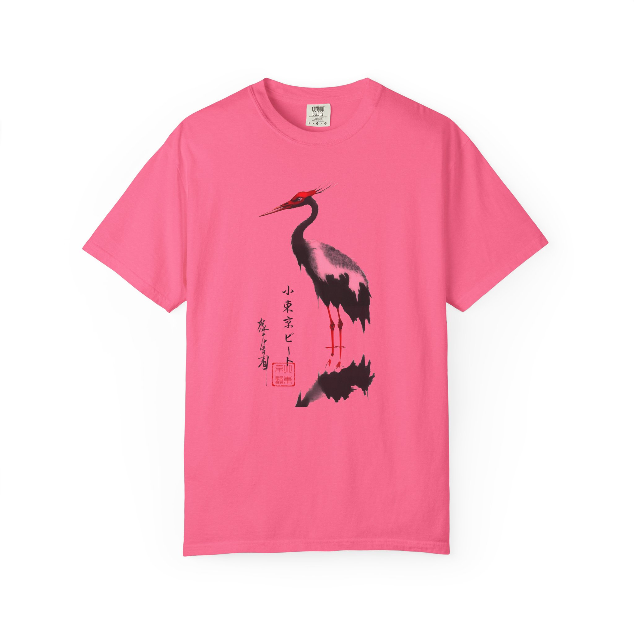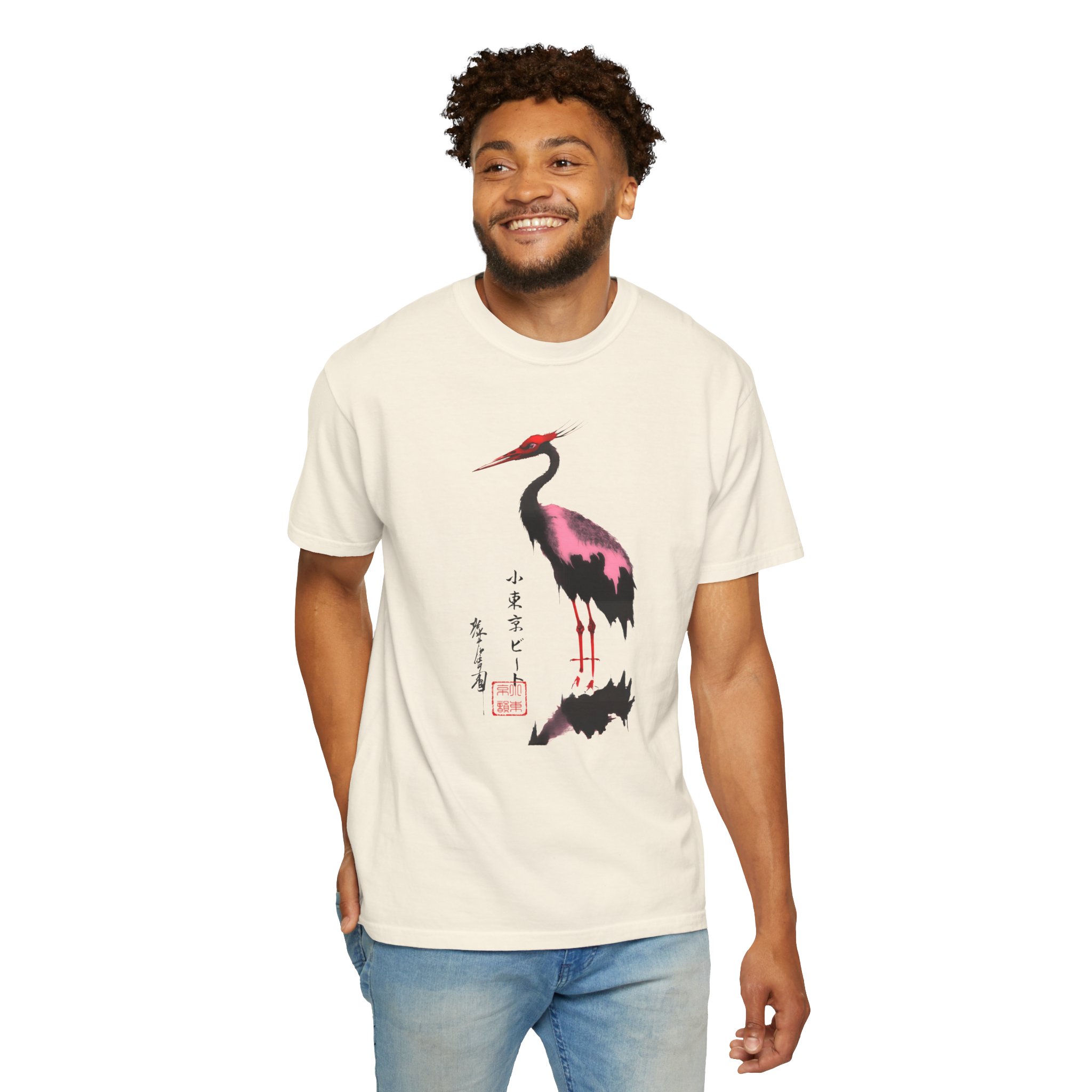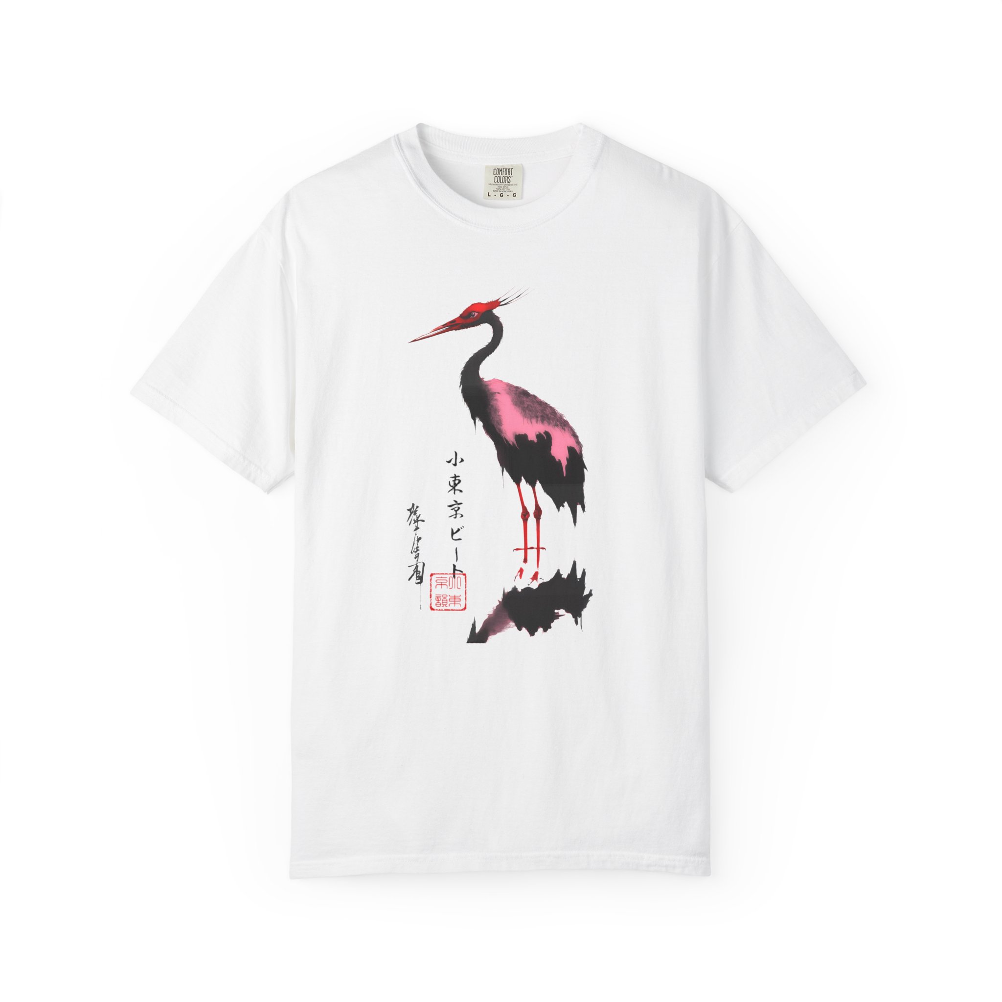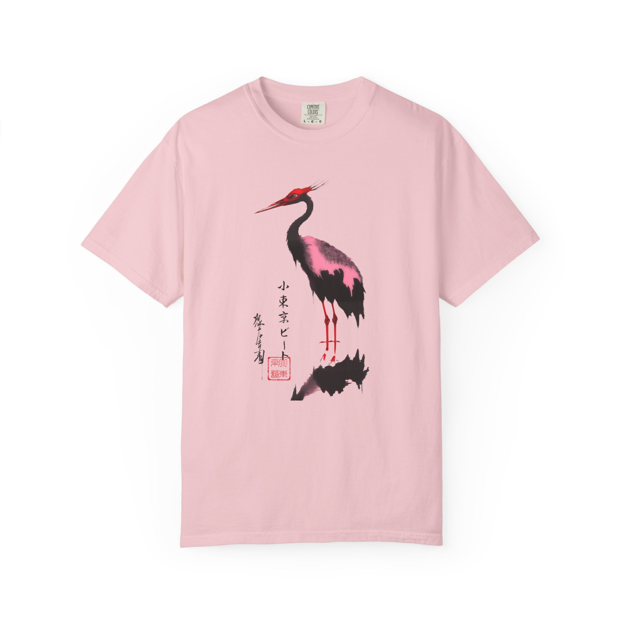 A relaxed, garment-dyed cotton tee featuring a serene Japanese-inspired crane illustration. The soft, worn-in dye and breathable 100% ring-spun cotton invite you to wear it on slow mornings, city walks, or gallery visits. The gentle pink and black brushwork feels meditative against the clean white background, while subtle printed calligraphy adds a poetic touch. Lightweight yet substantial, this shirt drapes casually and ages beautifully—becoming more personal with each wear. It slips easily into a minimalist wardrobe and pairs with jeans, linen trousers, or layered under a jacket for cooler nights. For those who appreciate quiet art, thoughtful design, and comfortable everyday pieces, this tee reads like a wearable sketchbook: calm, considered, and distinctly personal.