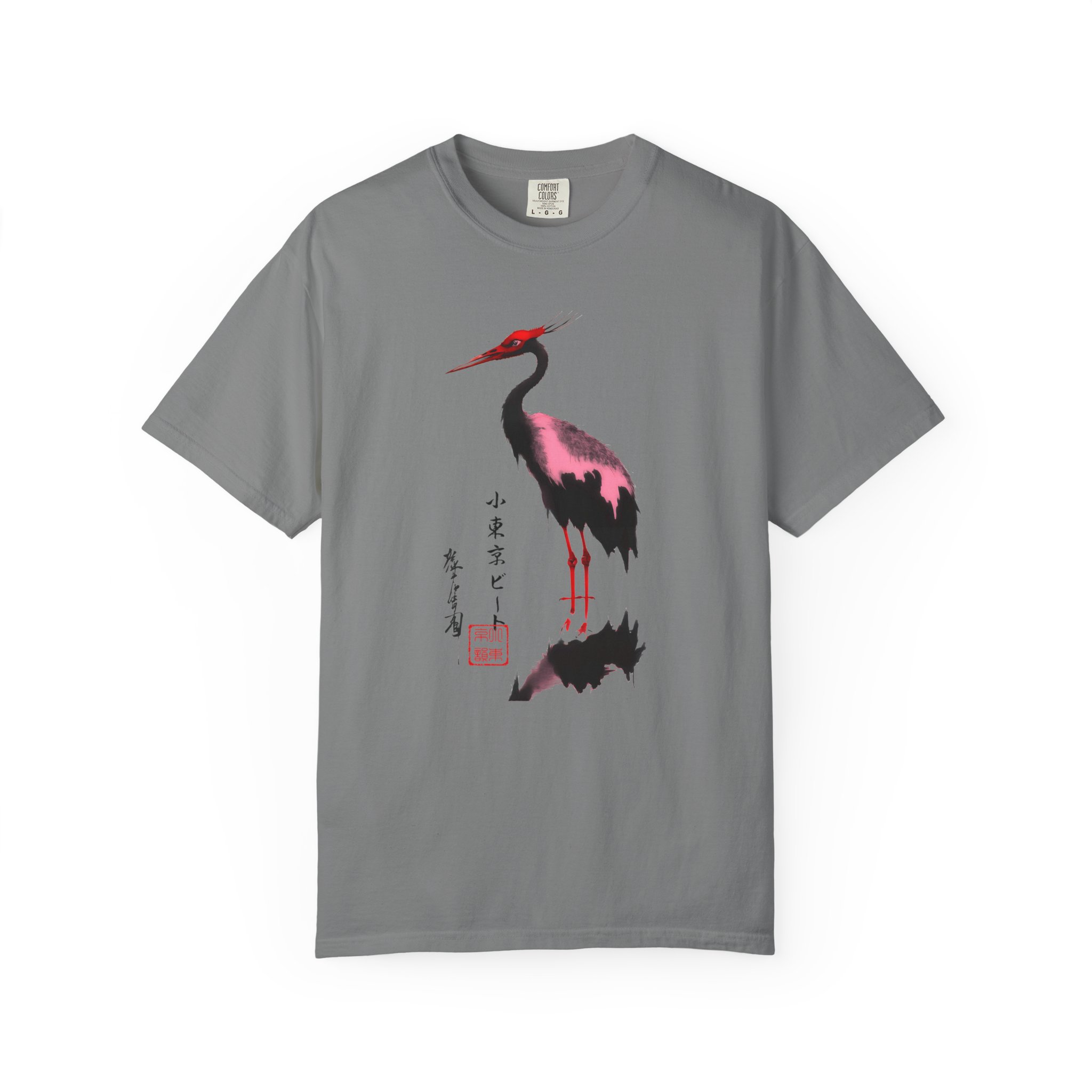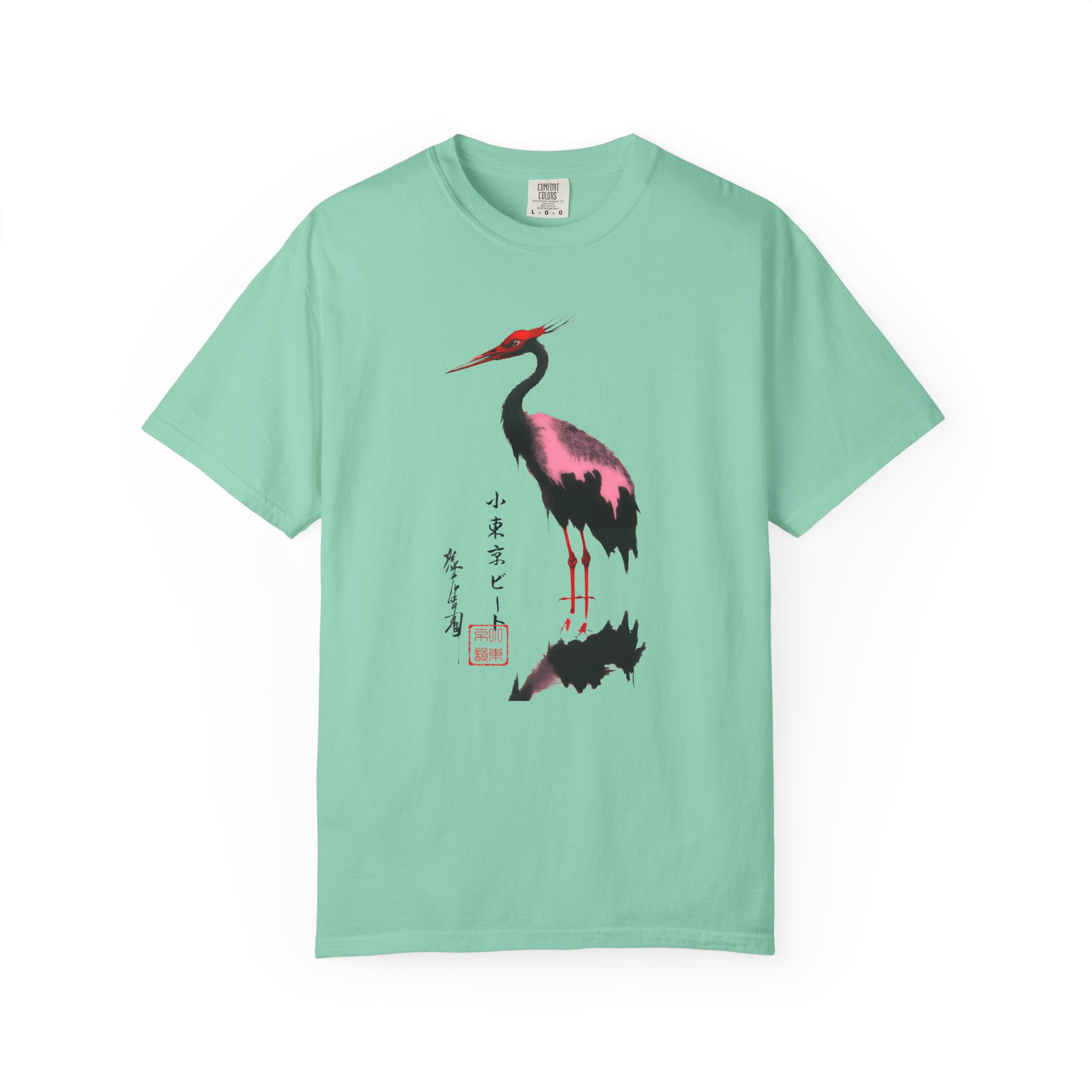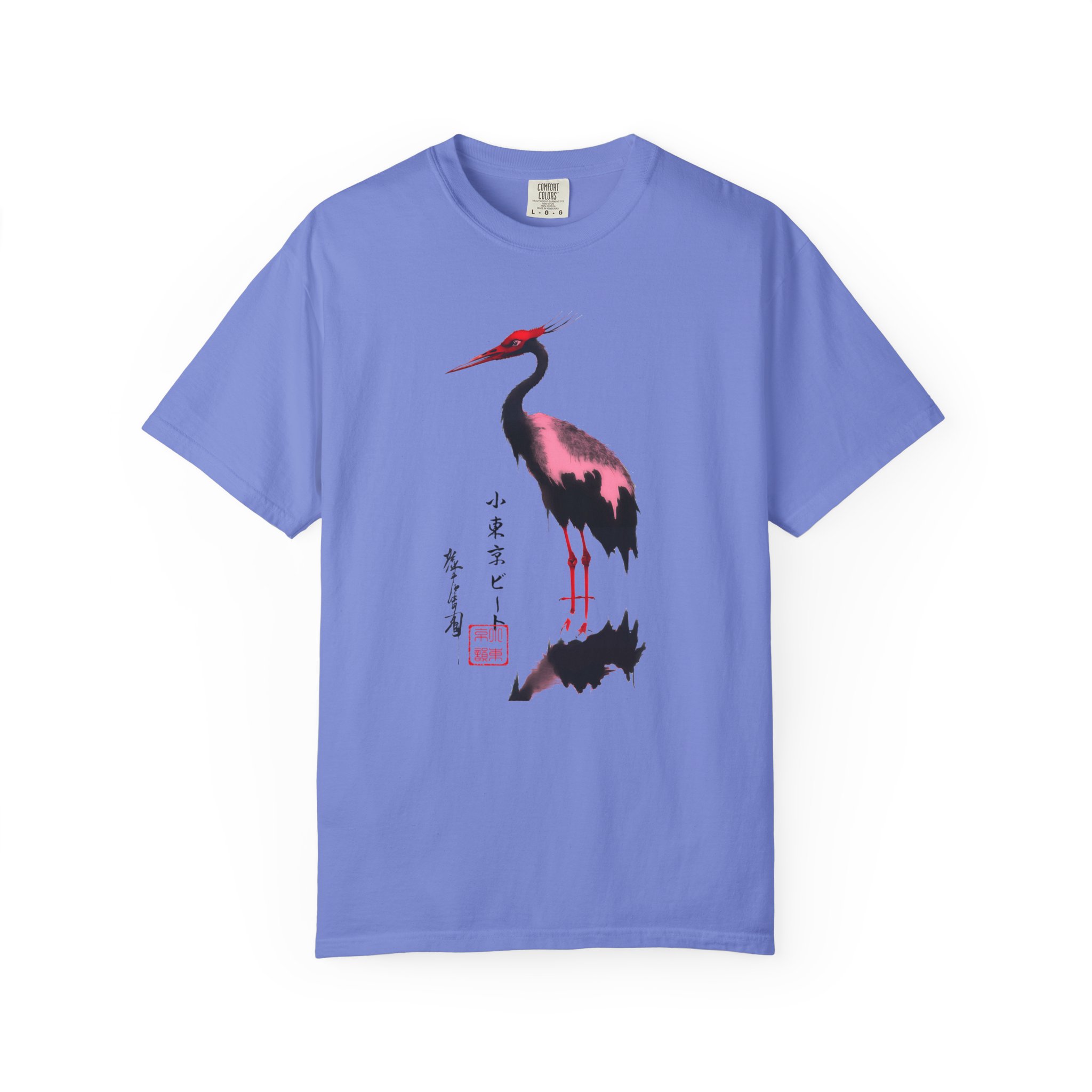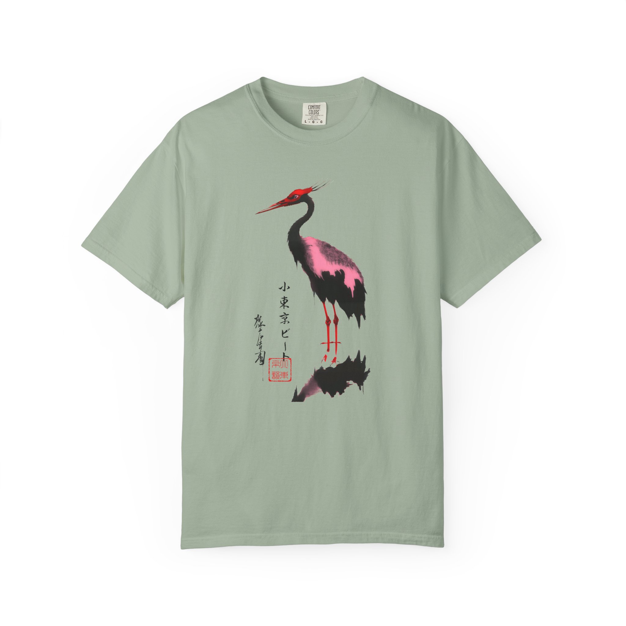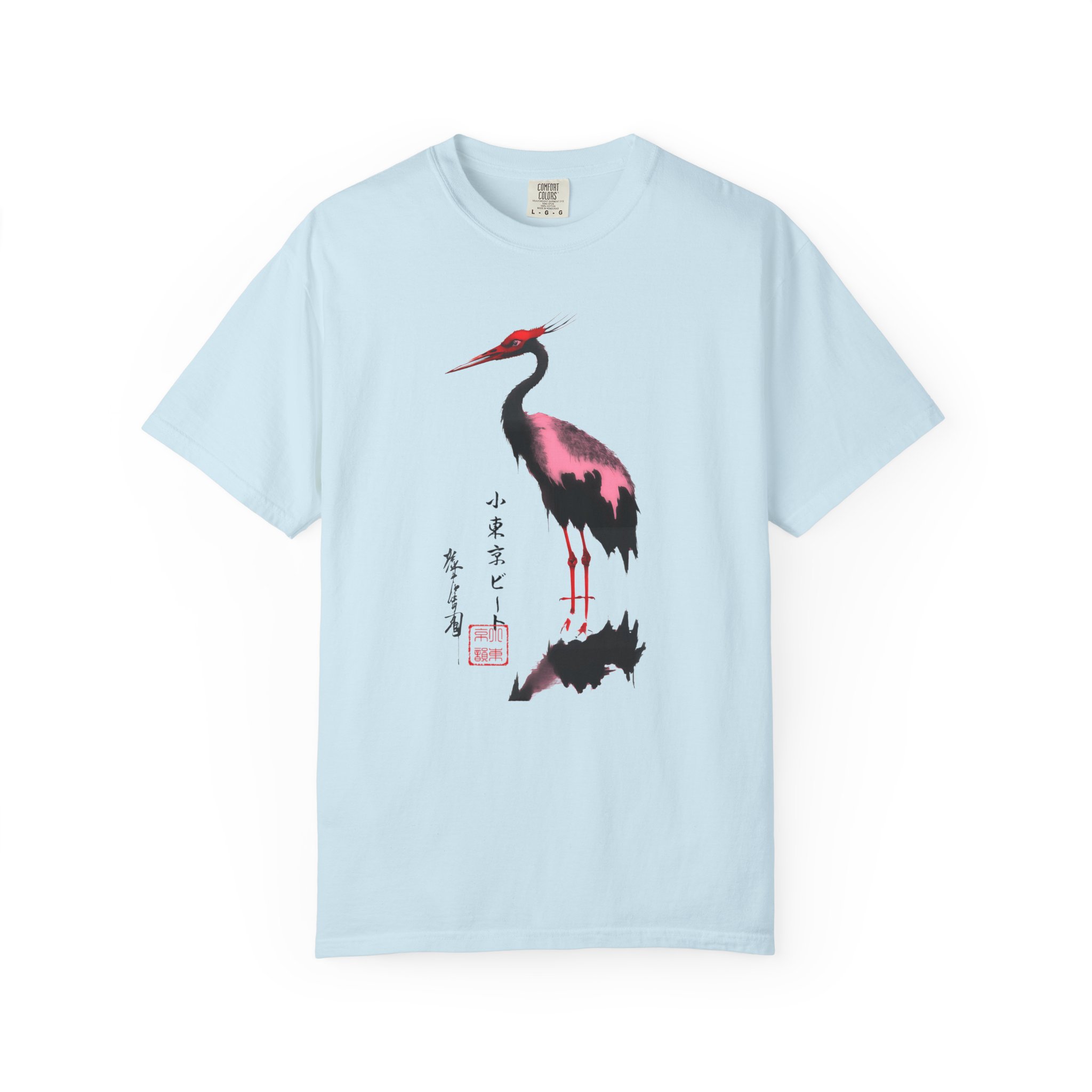 A relaxed, garment-dyed cotton tee featuring a serene Japanese-inspired crane illustration. The soft, worn-in dye and breathable 100% ring-spun cotton invite you to wear it on slow mornings, city walks, or gallery visits. The gentle pink and black brushwork feels meditative against the clean white background, while subtle printed calligraphy adds a poetic touch. Lightweight yet substantial, this shirt drapes casually and ages beautifully—becoming more personal with each wear. It slips easily into a minimalist wardrobe and pairs with jeans, linen trousers, or layered under a jacket for cooler nights. For those who appreciate quiet art, thoughtful design, and comfortable everyday pieces, this tee reads like a wearable sketchbook: calm, considered, and distinctly personal.