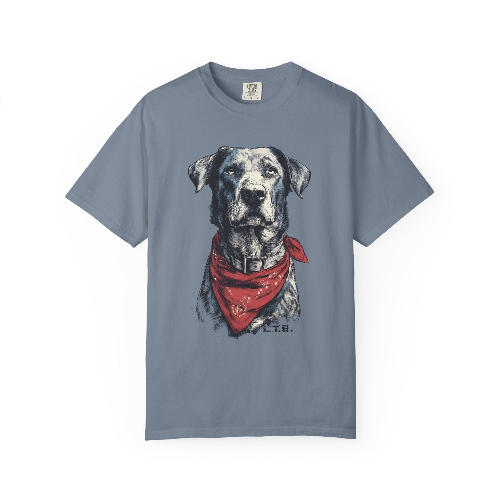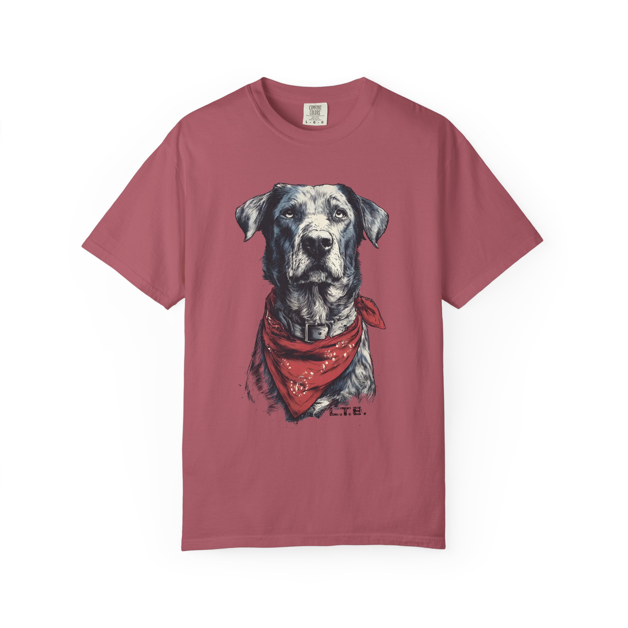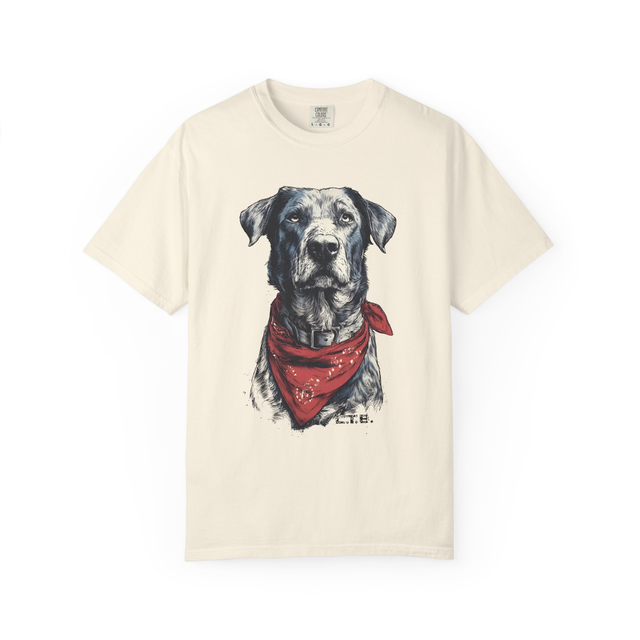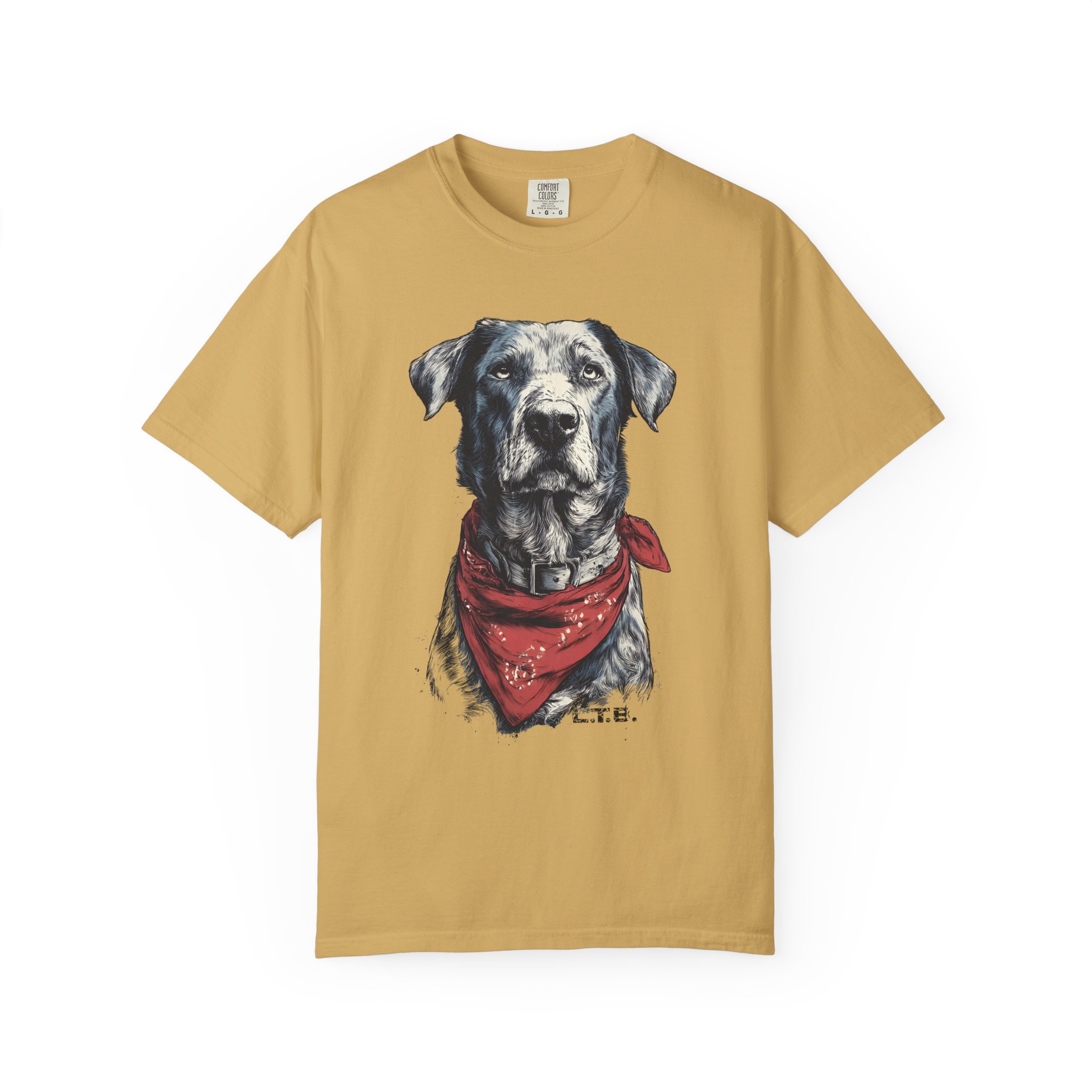 This garment-dyed tee carries a quiet, soulful vibe — a lifelike dog portrait wears a worn red bandana and looks like a companion you’ve known for years. The heavyweight cotton and relaxed cut give it a lived-in feel straight away: soft to the touch, slightly faded color, and gentle drape. Wear it to slow mornings at the coffee shop, long drives with the windows down, or backyard evenings by the fire. It sits comfortably in a casual wardrobe and pairs easily with jeans, work pants, or layered under a flannel. For anyone who lives for honest, rustic style and the quiet company of a good dog, this shirt reads like a small, wearable story.