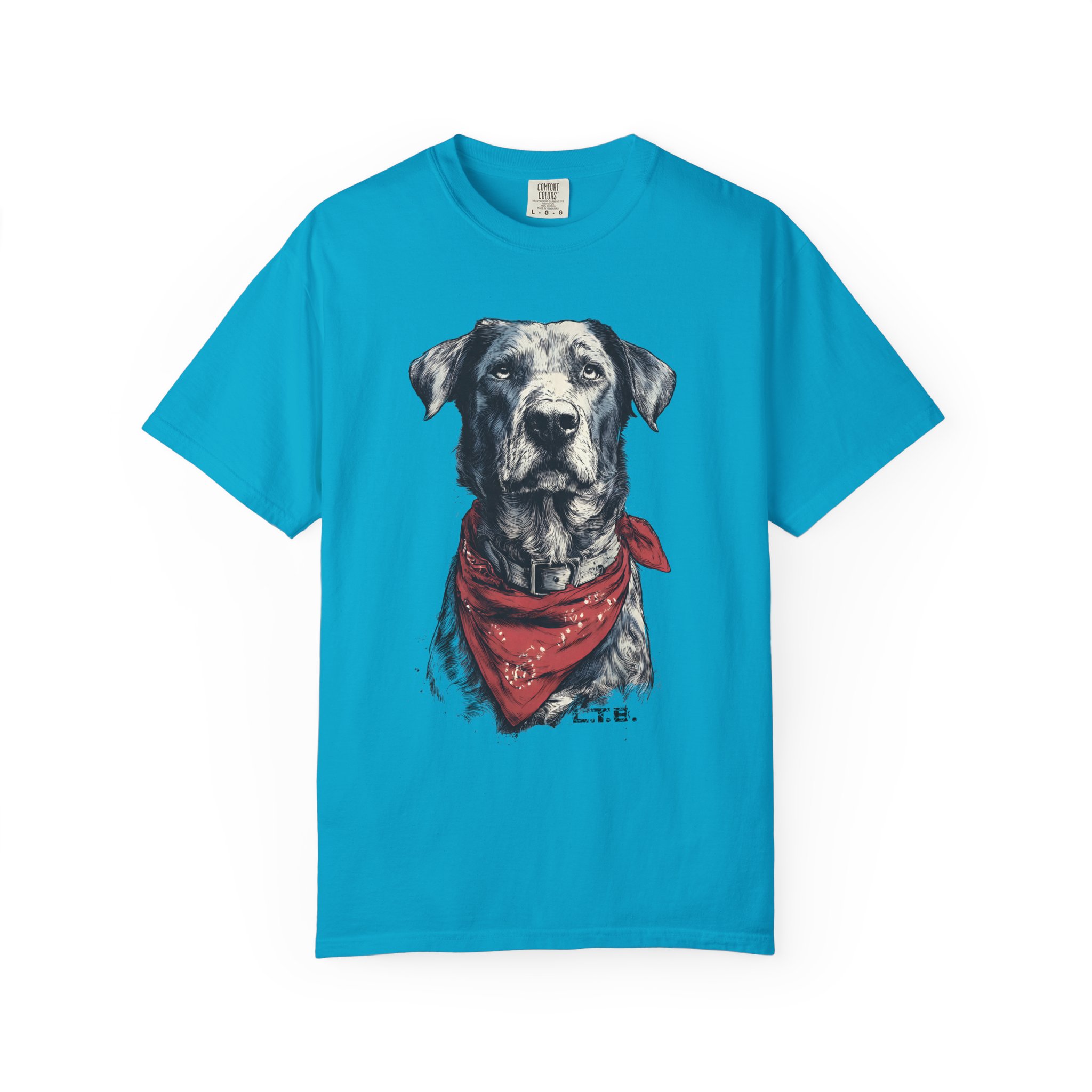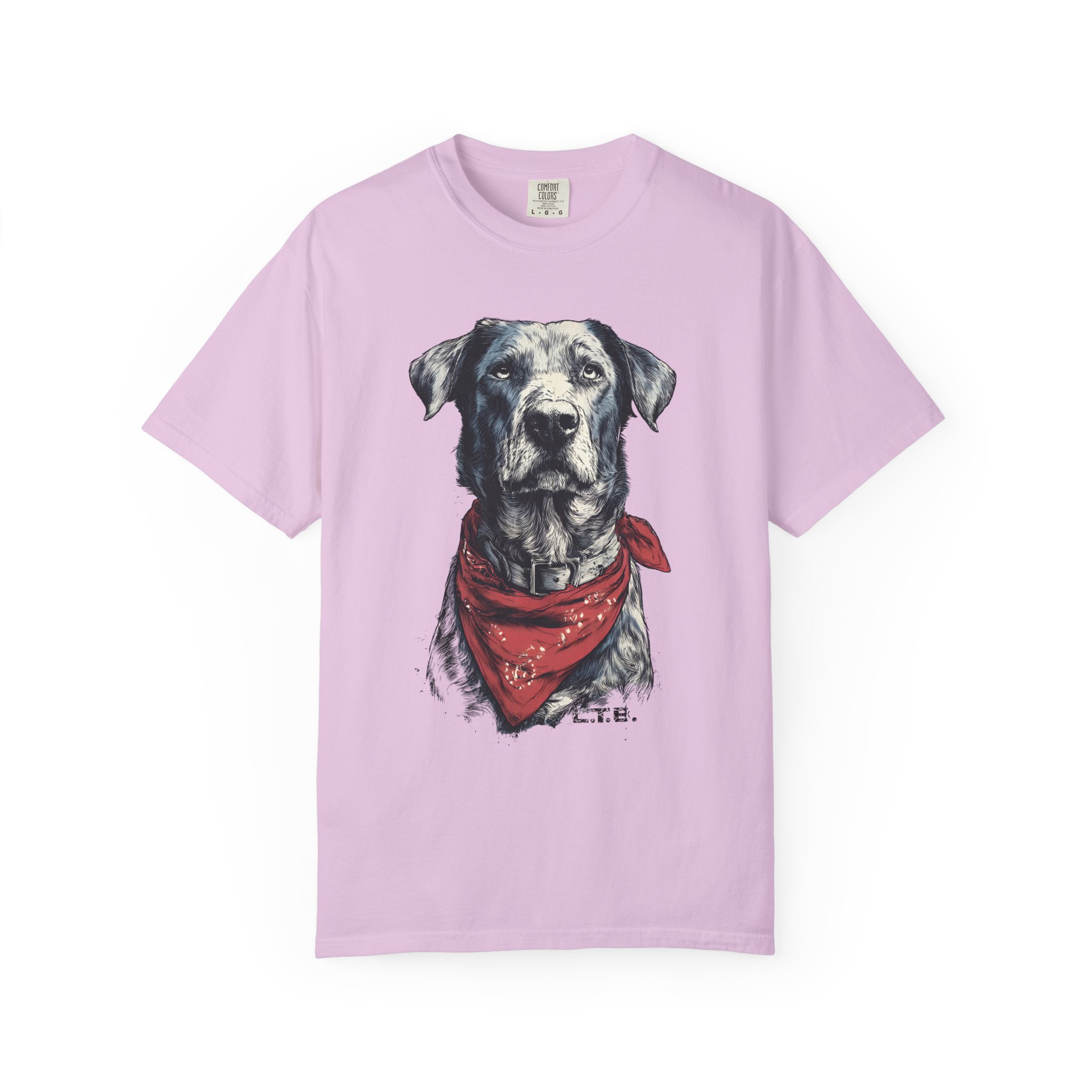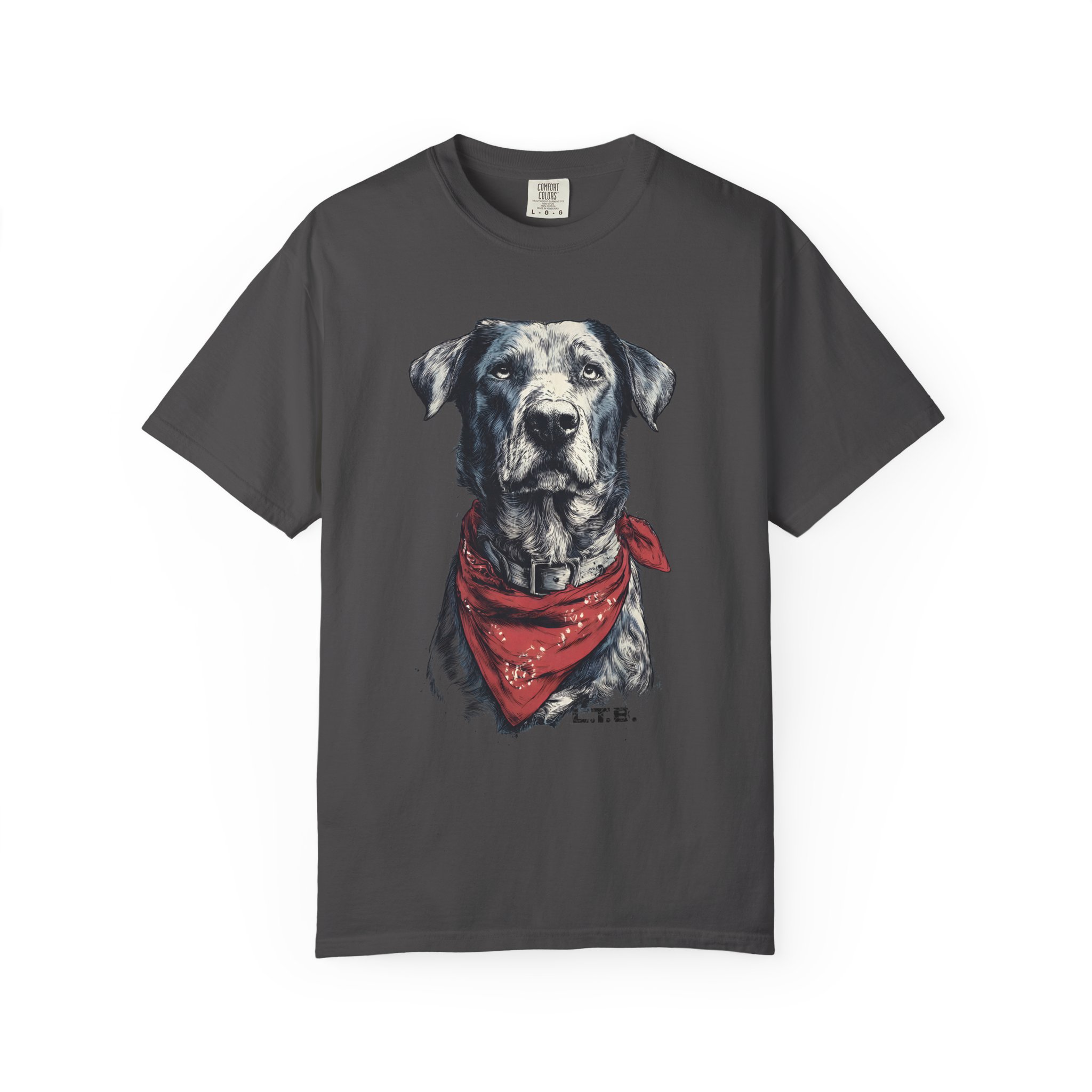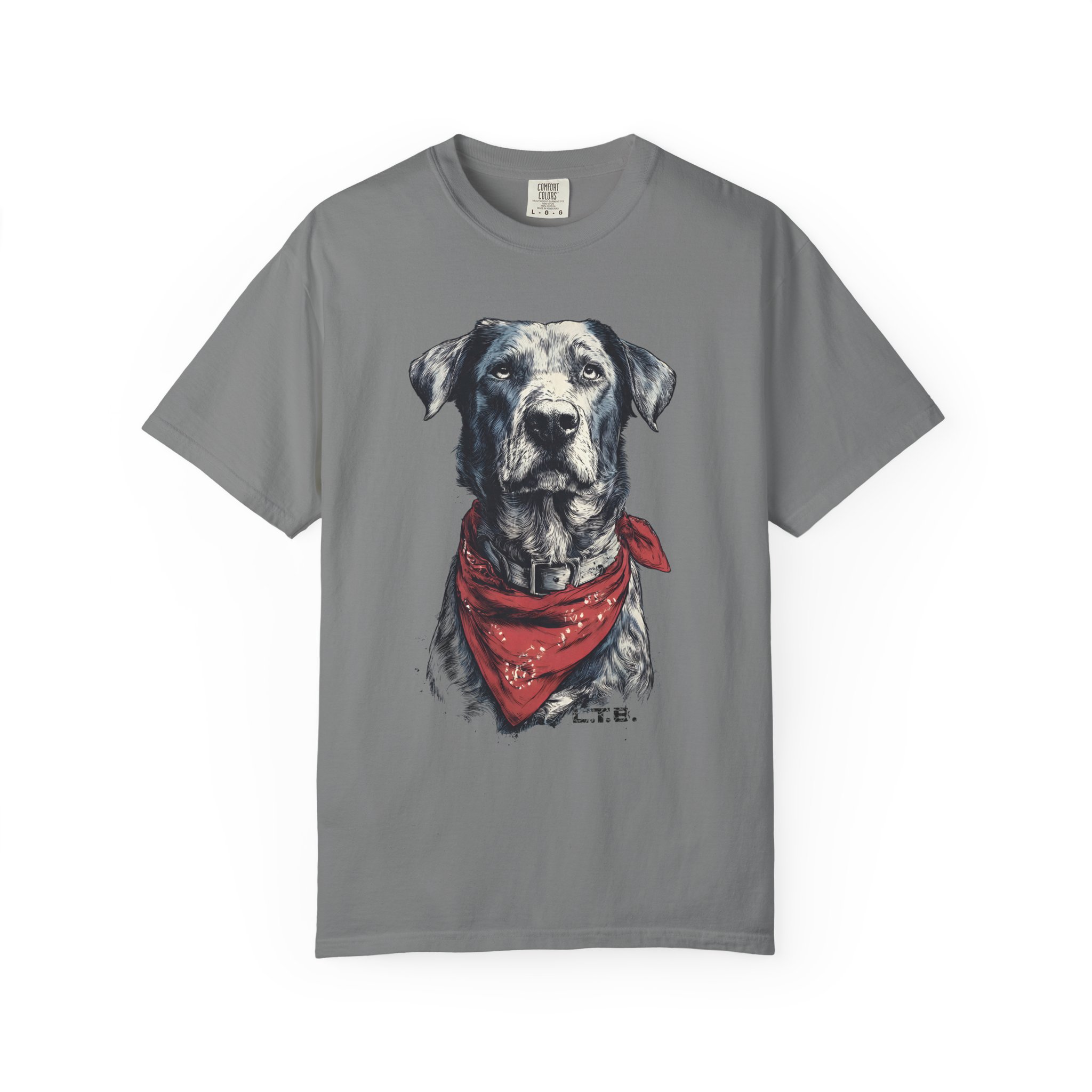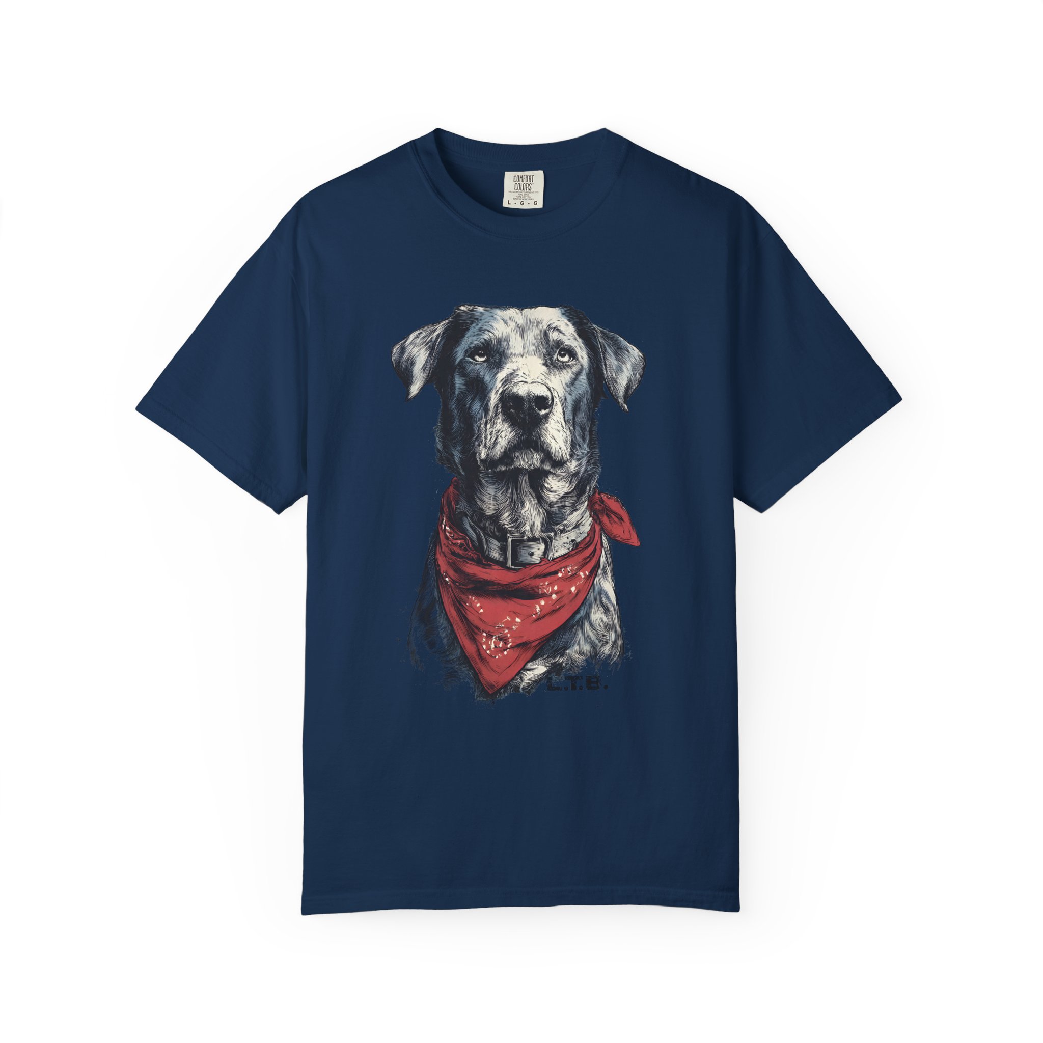 This garment-dyed tee carries a quiet, soulful vibe — a lifelike dog portrait wears a worn red bandana and looks like a companion you’ve known for years. The heavyweight cotton and relaxed cut give it a lived-in feel straight away: soft to the touch, slightly faded color, and gentle drape. Wear it to slow mornings at the coffee shop, long drives with the windows down, or backyard evenings by the fire. It sits comfortably in a casual wardrobe and pairs easily with jeans, work pants, or layered under a flannel. For anyone who lives for honest, rustic style and the quiet company of a good dog, this shirt reads like a small, wearable story.
