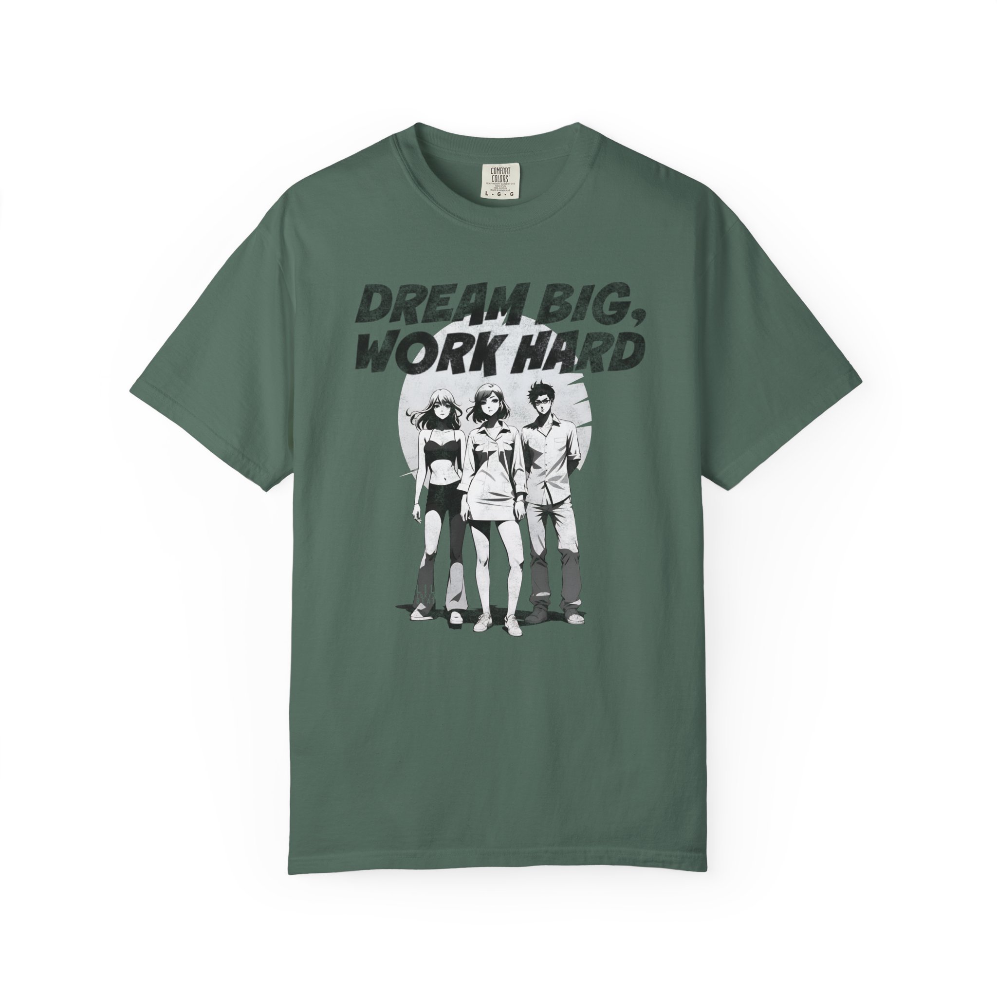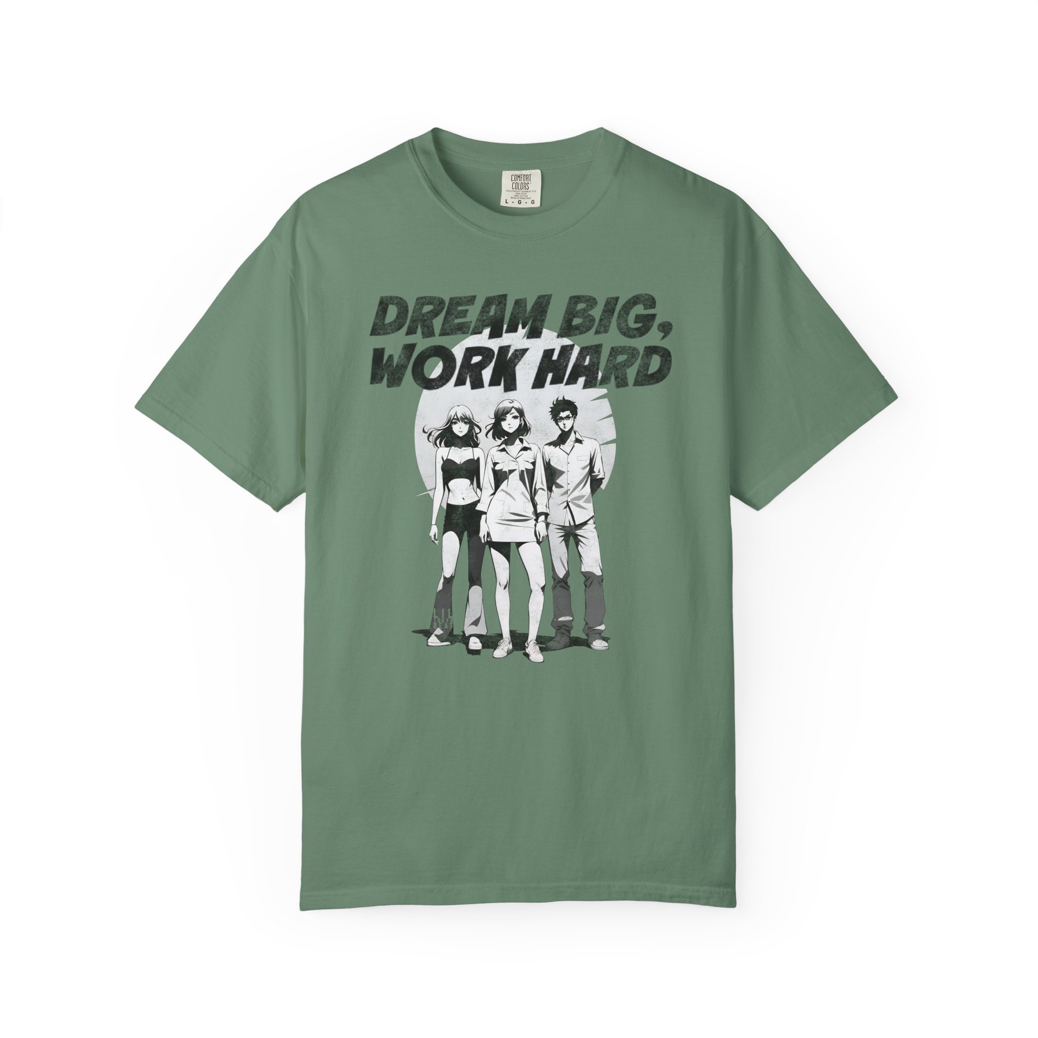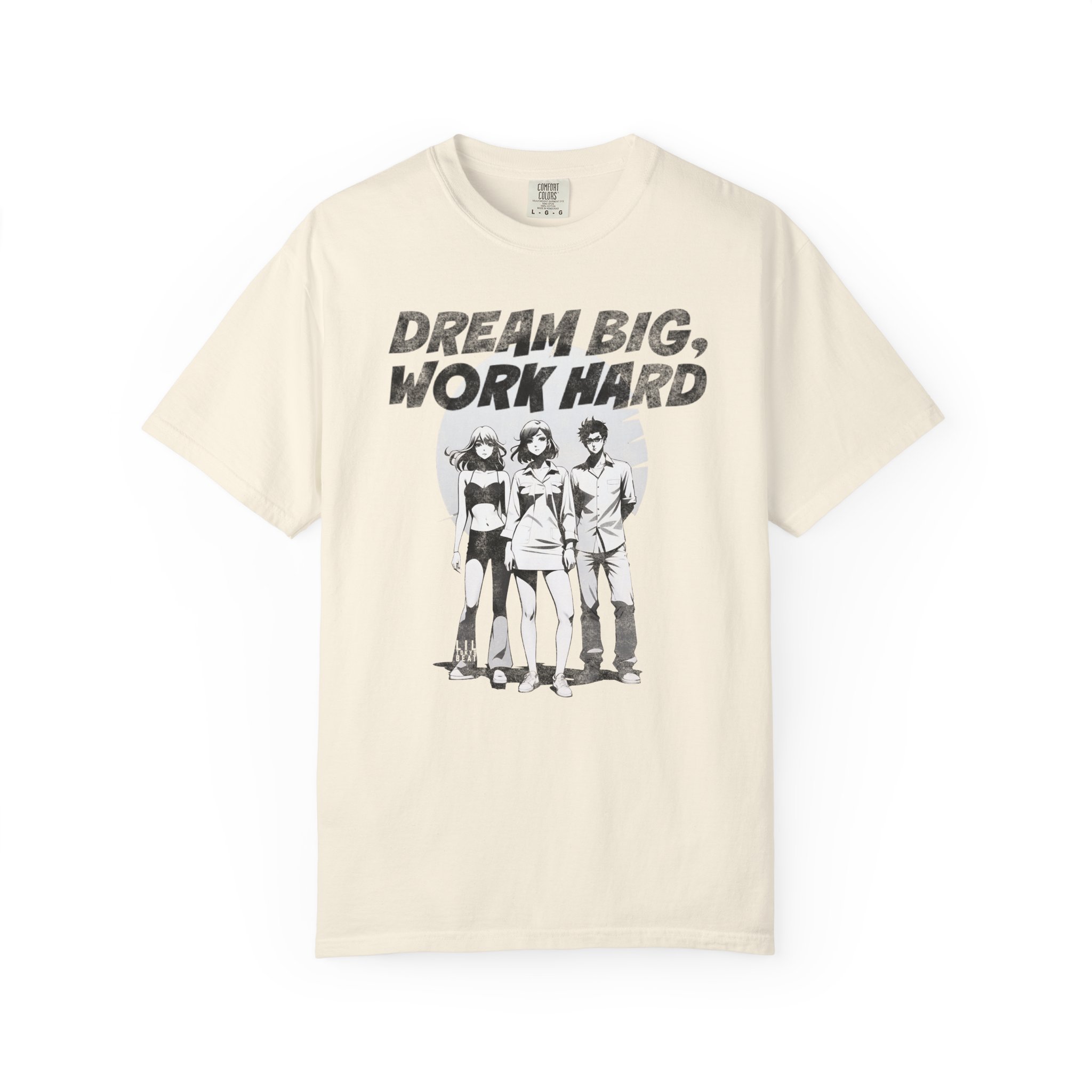 This vintage-inspired tee channels quiet determination. The muted, garment-dyed color and soft, broken-in feel invite you to reach for bigger goals without shouting about them. A subtle “Dream Big, Work Hard” trio graphic sits like a daily nod on your chest — worn alone for low-key motivation or layered under a flannel when the day demands focus. It moves with you: relaxed through the shoulders, durable at the seams, and lived-in from the first wear. For people who value steady effort over noise, this shirt becomes part of the routine — the one you grab before early shifts, late studio sessions, or weekend hustles. It ages gracefully; the color softens, the message stays the same.