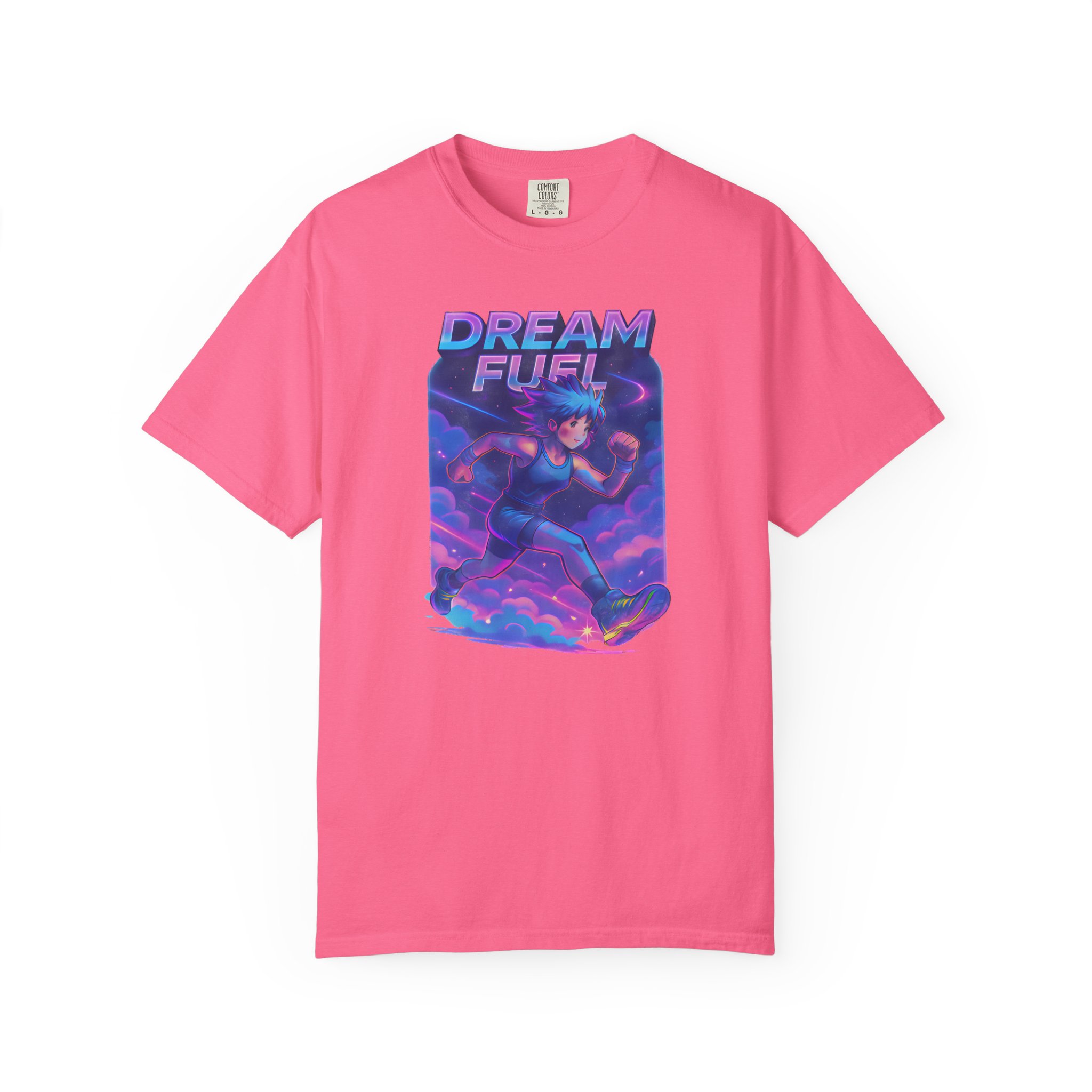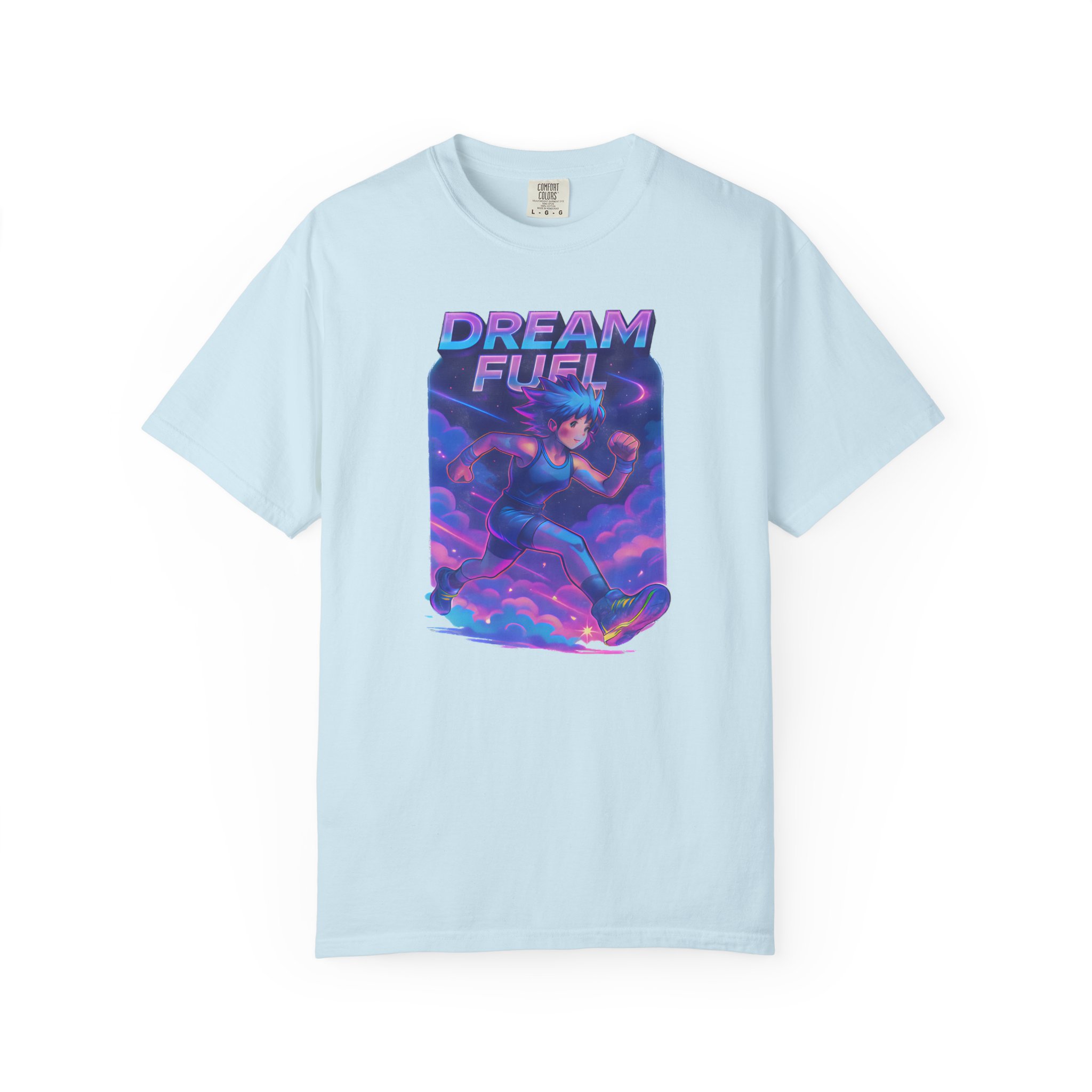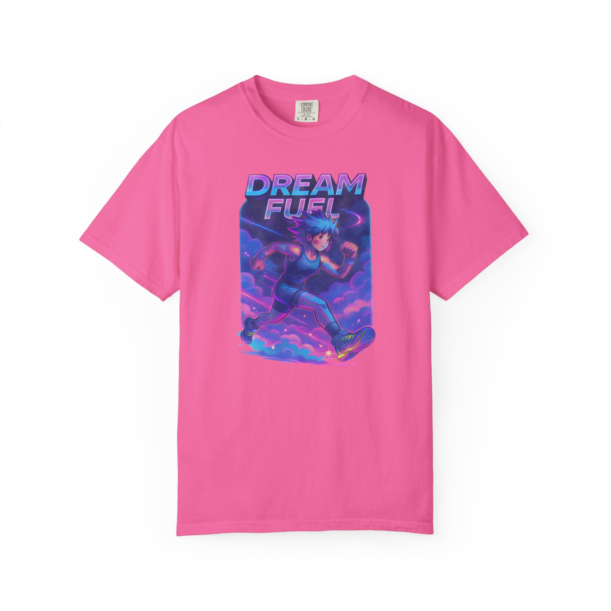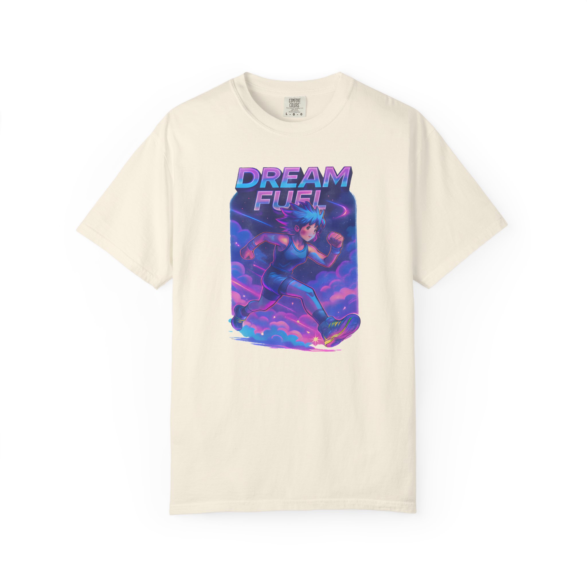 Neon clouds blur into motion. A runner — anime-lined, sneakers blazing with electric light — cuts through vaporwave skies, energy trails painting the air. “Dream Fuel” arches above in bold, motivational type: not shouted, but felt. This tee slips into days when you need momentum — a morning warmup, a late-night jog, or a playlist-fueled city walk. It lives with Gen Z aesthetics and workout culture alike: bright, kinetic, and slightly nostalgic. Wear it with a cropped hoodie, high-waist joggers, or under an oversized jacket. The fabric softens with every wash, the colors keep their glow, and the graphic keeps the vibe — a visual jolt that nudges you toward the next mile or the next idea.