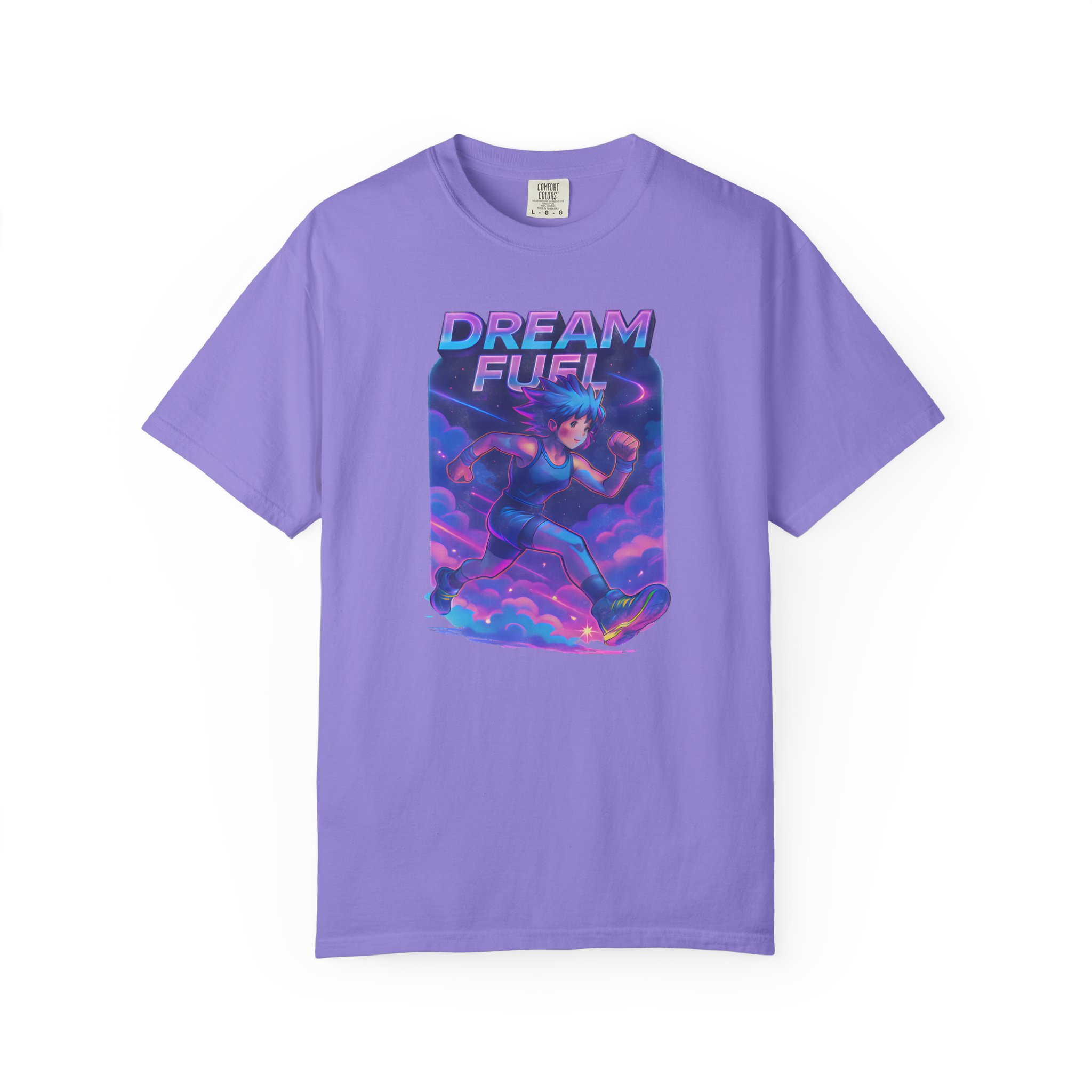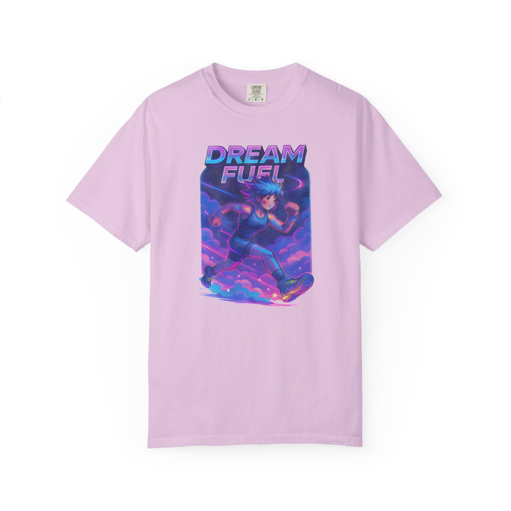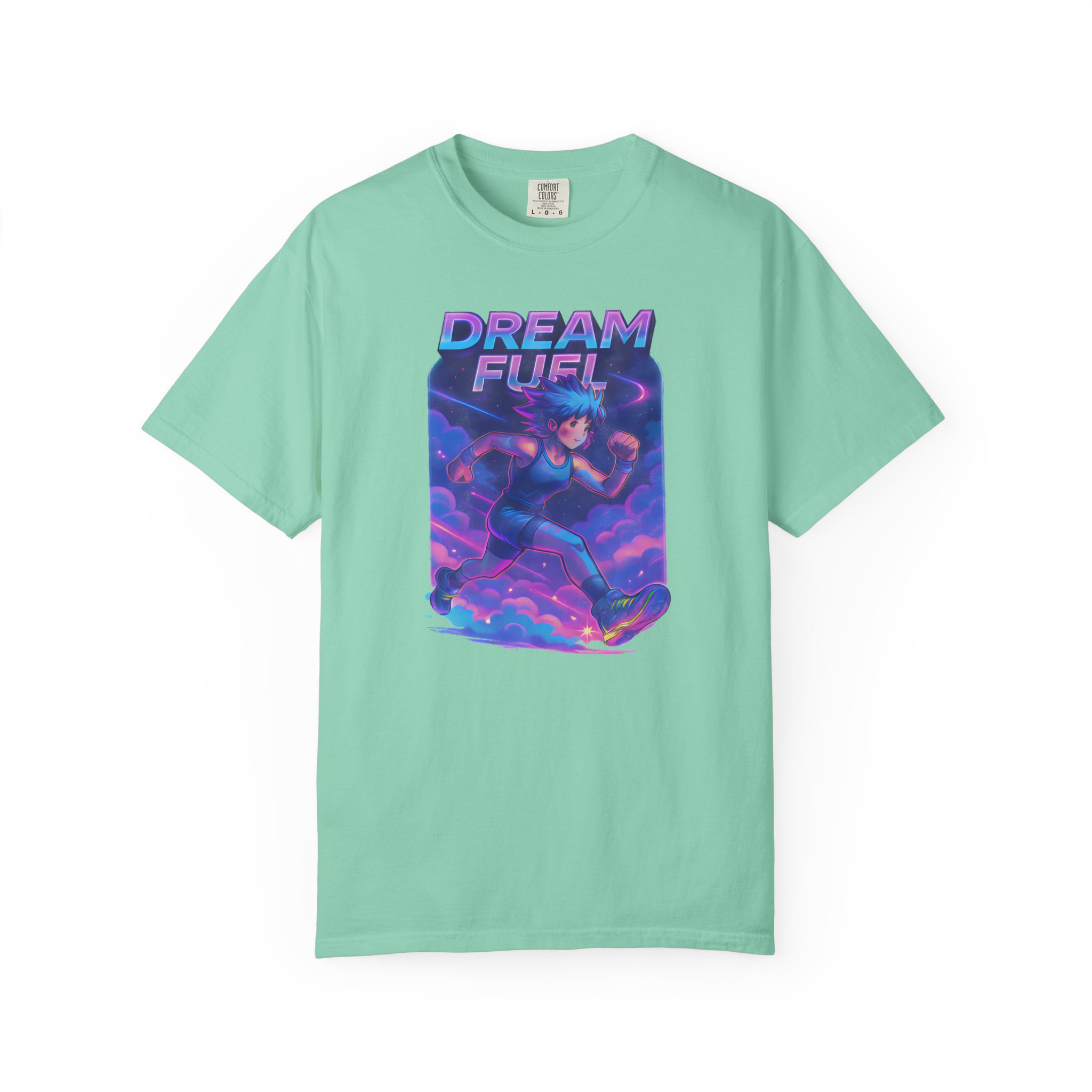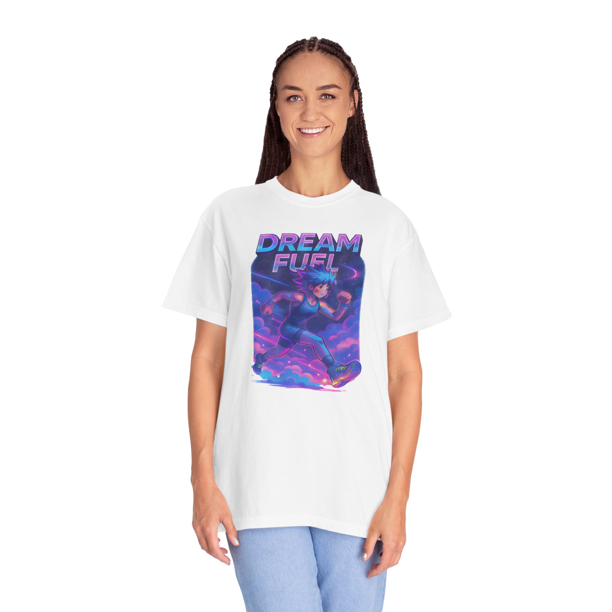 Neon clouds blur into motion. A runner — anime-lined, sneakers blazing with electric light — cuts through vaporwave skies, energy trails painting the air. “Dream Fuel” arches above in bold, motivational type: not shouted, but felt. This tee slips into days when you need momentum — a morning warmup, a late-night jog, or a playlist-fueled city walk. It lives with Gen Z aesthetics and workout culture alike: bright, kinetic, and slightly nostalgic. Wear it with a cropped hoodie, high-waist joggers, or under an oversized jacket. The fabric softens with every wash, the colors keep their glow, and the graphic keeps the vibe — a visual jolt that nudges you toward the next mile or the next idea.