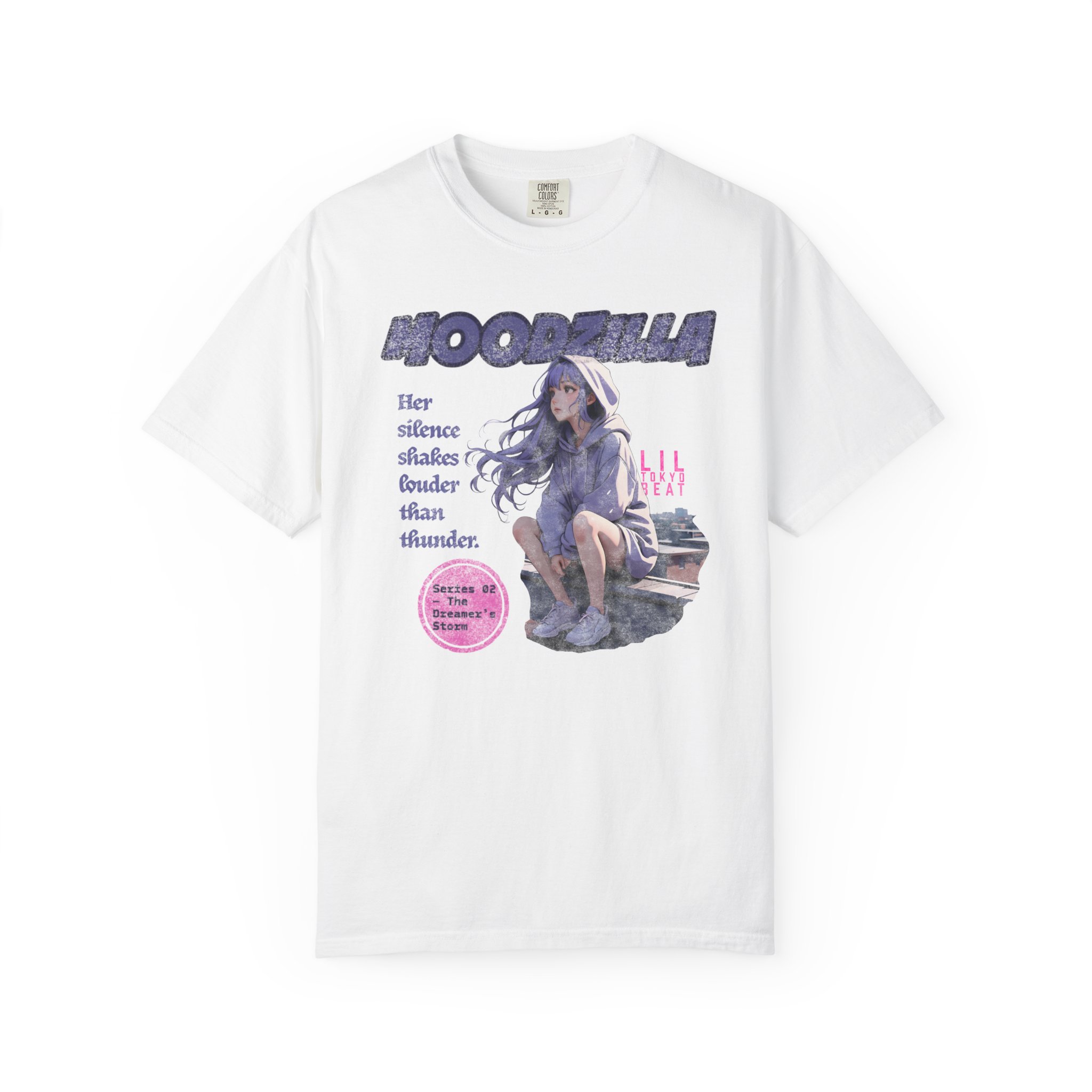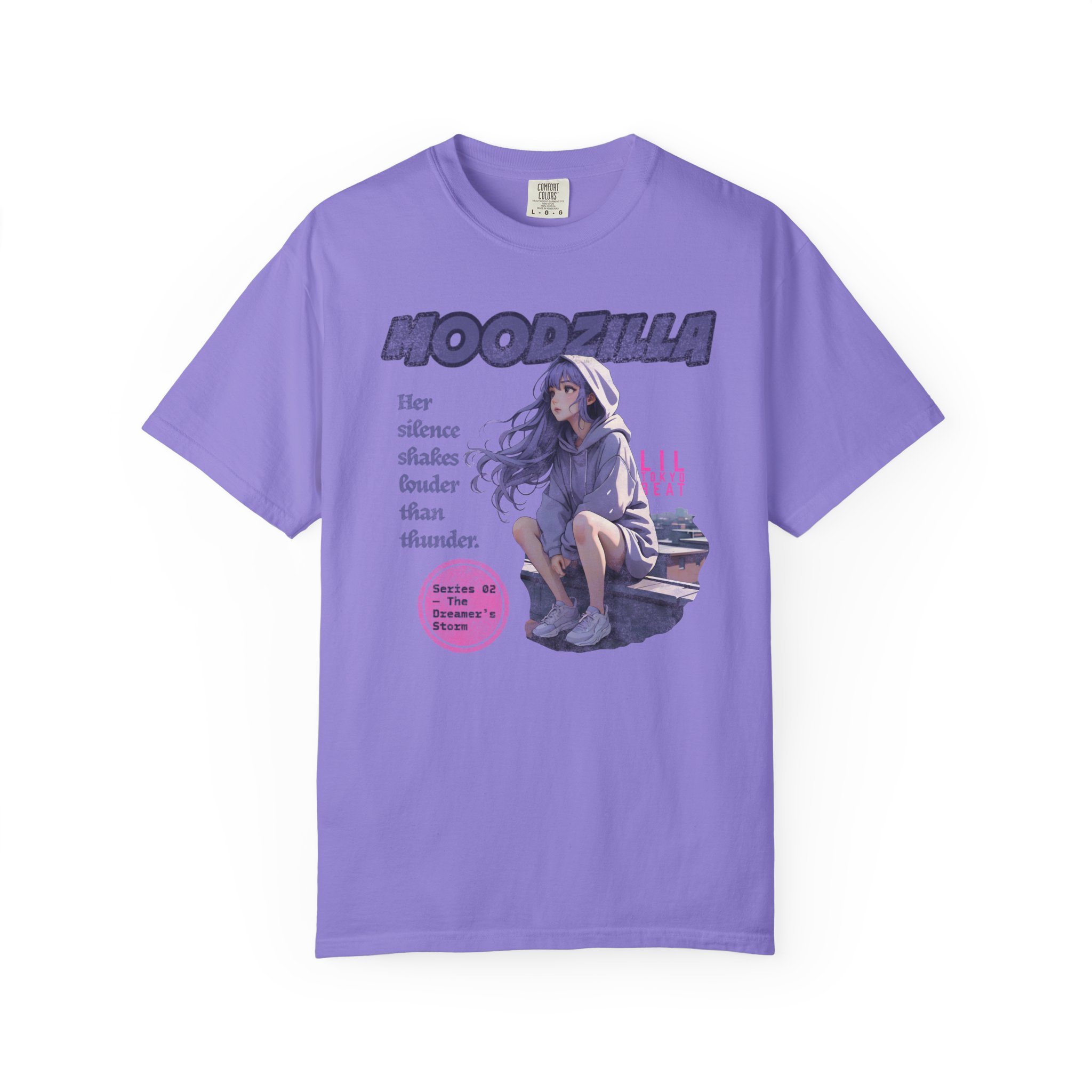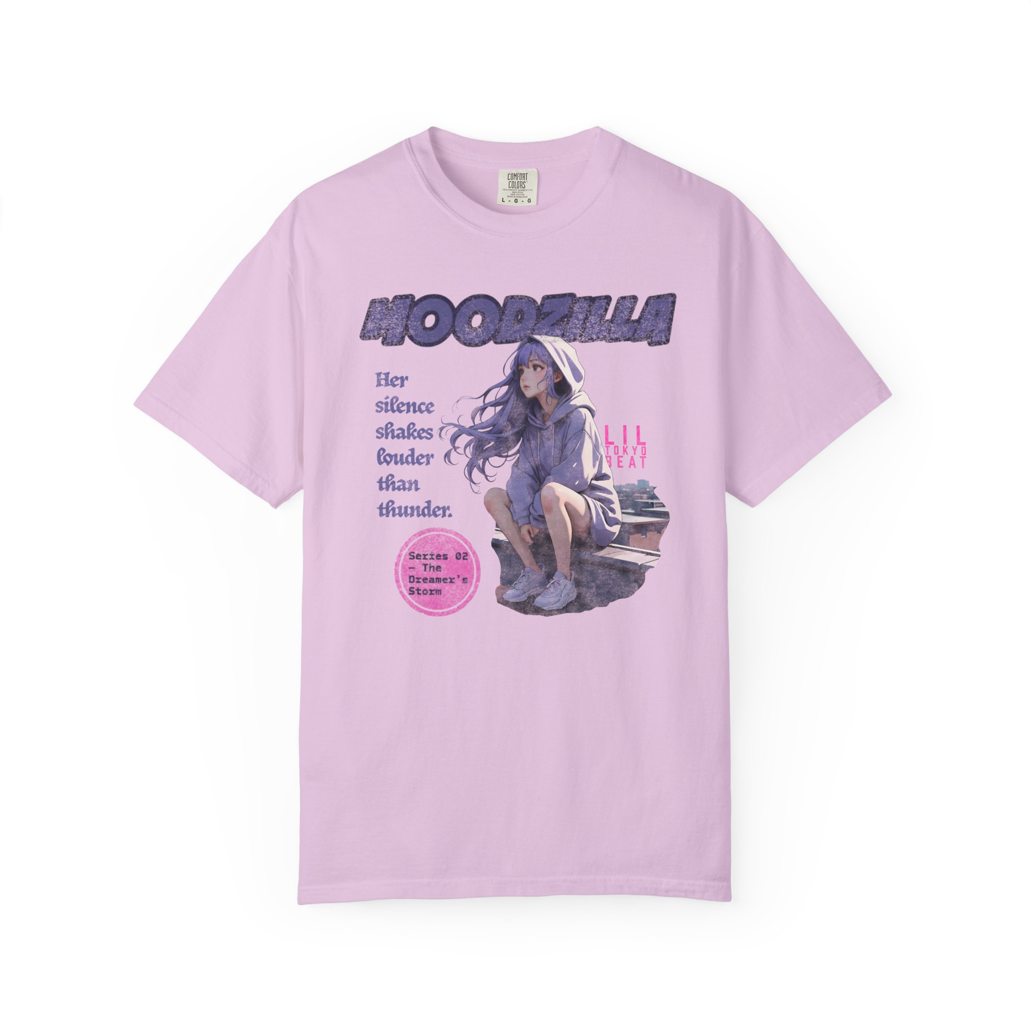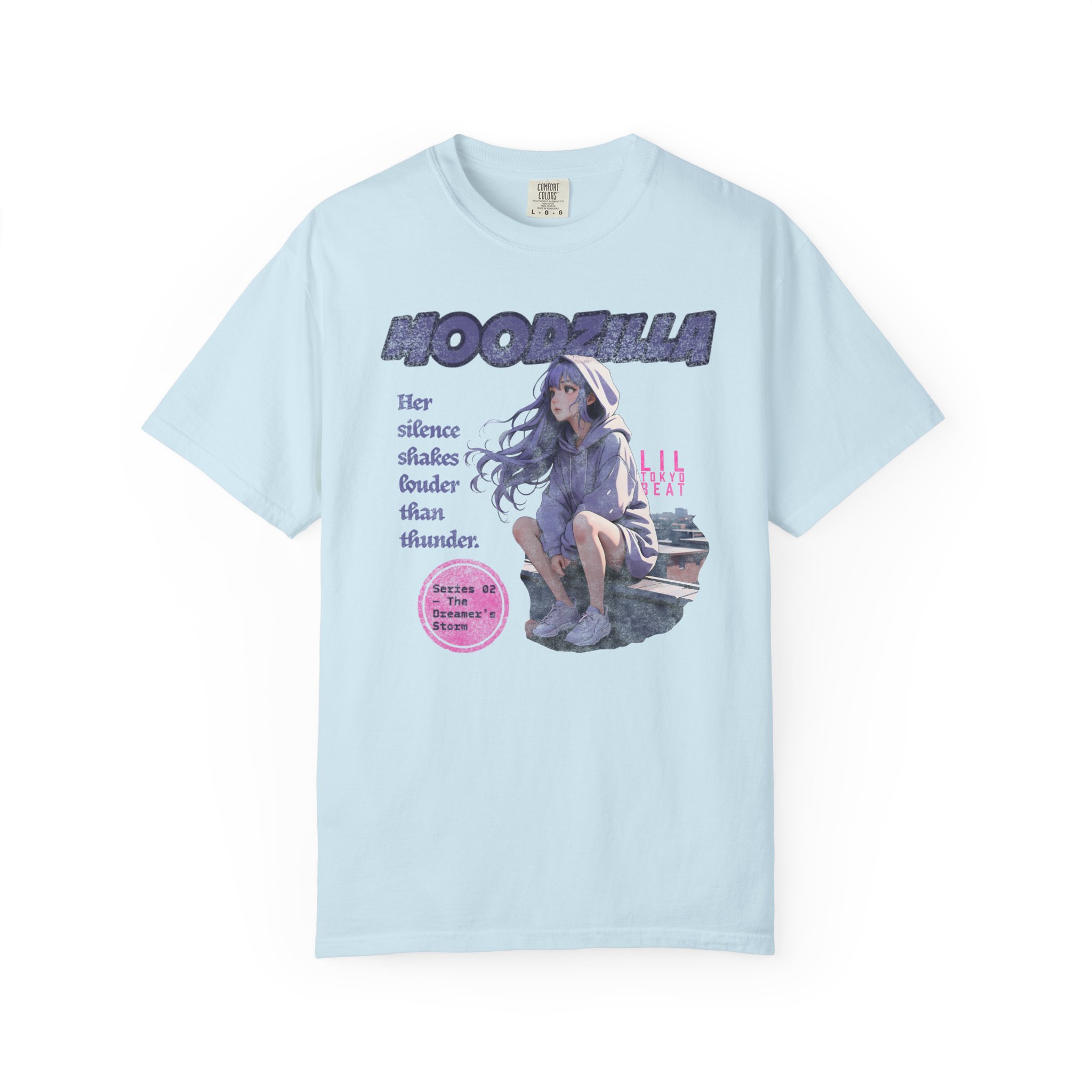 An evocative tee that feels like a quiet scene from an anime — a lavender-haired girl perched on a rooftop, hood trimmed with cloud patterns, watching rain blur the city lights. The image carries a soft, nostalgic ache: slow breaths, the steady patter of rain, a hoodie wrapped close as the wind tugs at hair. This T-shirt slips easily into nights spent wandering city rooftops, sketching in a rain-streaked notebook, or sharing whispered playlists with friends. Fans of dreamy, emotional anime art will recognize the subtle details — muted tones, gentle expression, and a design that reads like a memory. Wear it on mellow evenings, at anime meetups, or when you want clothing that holds a quiet story.