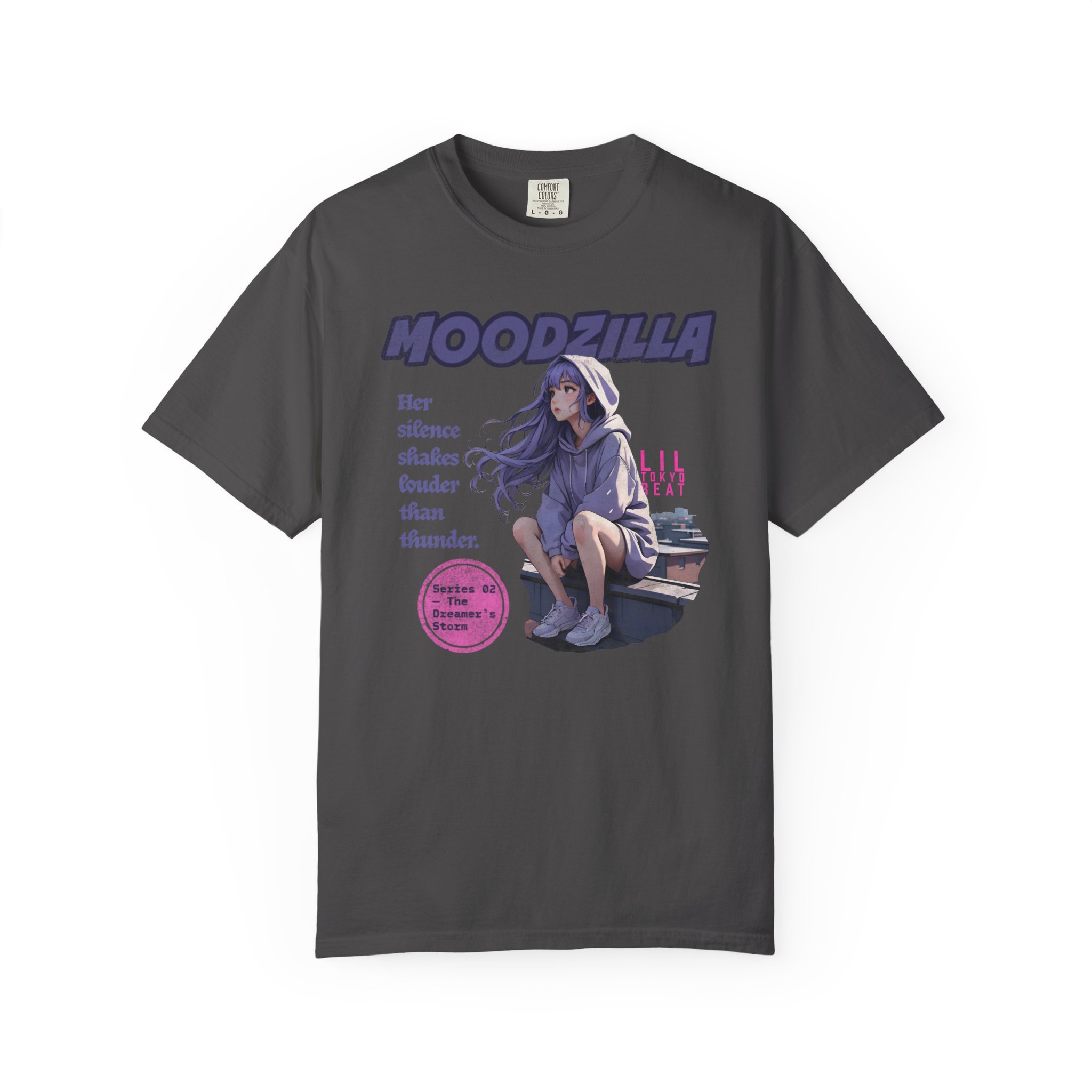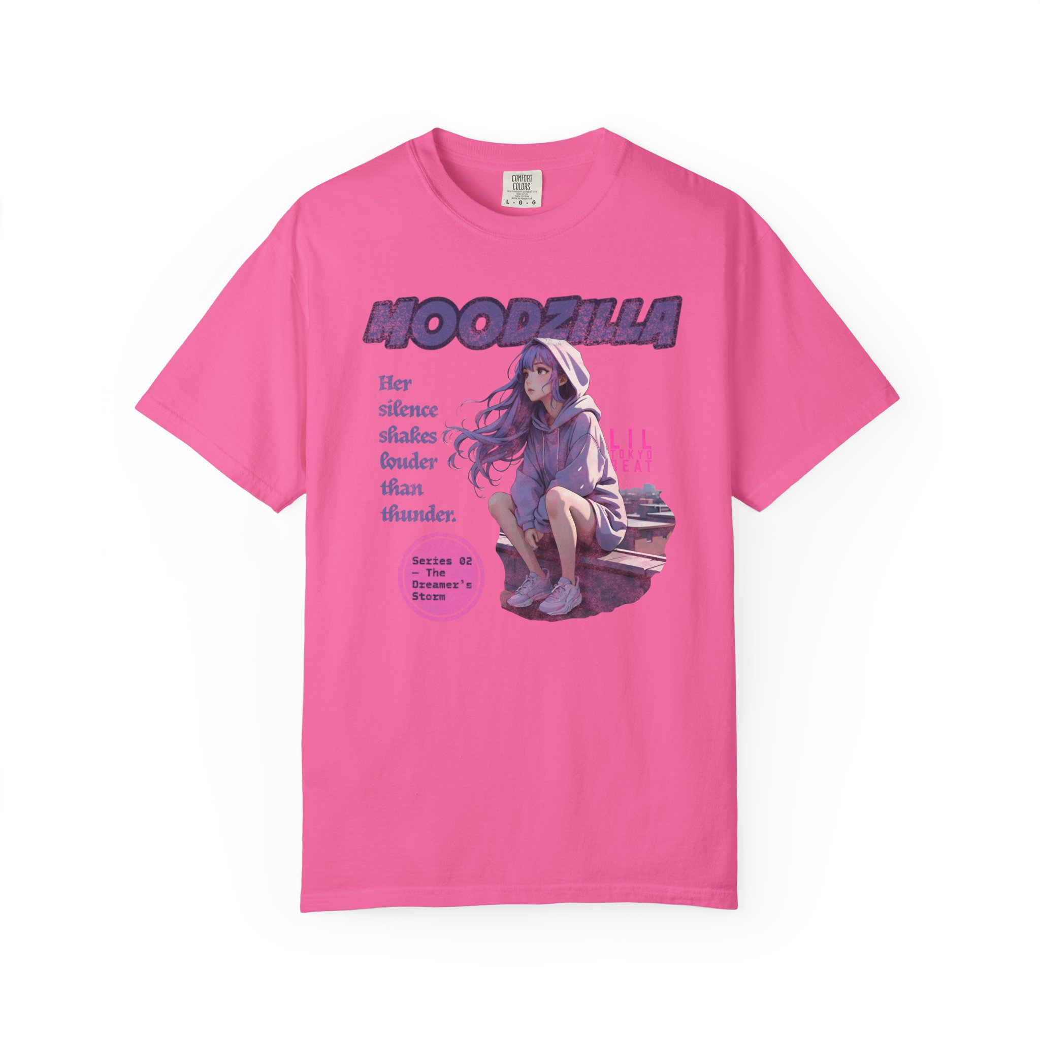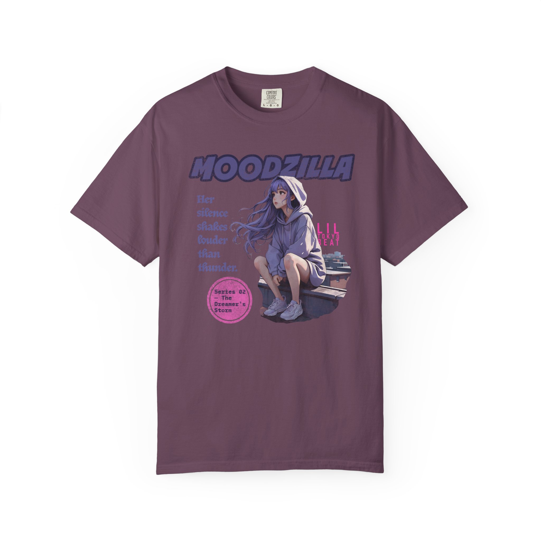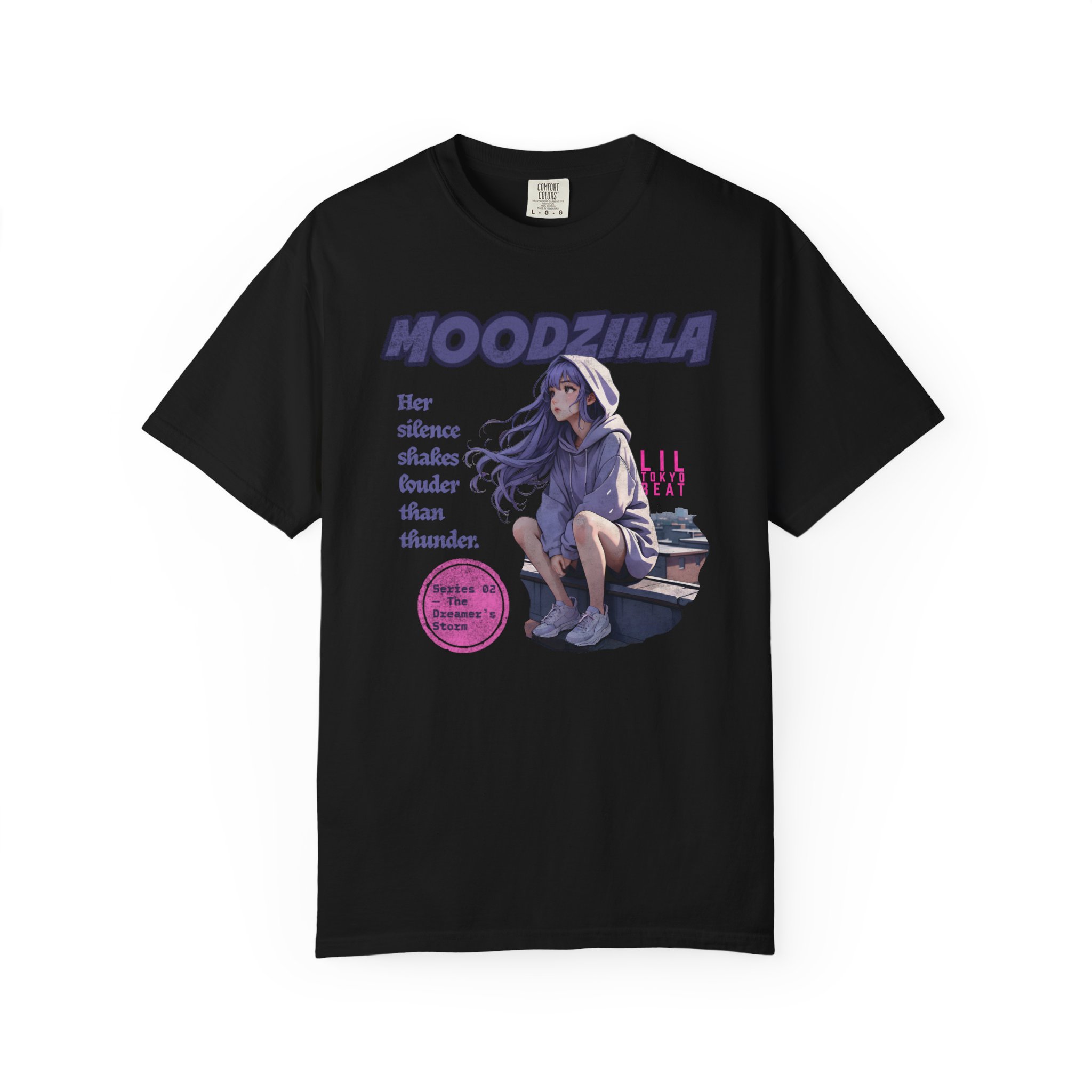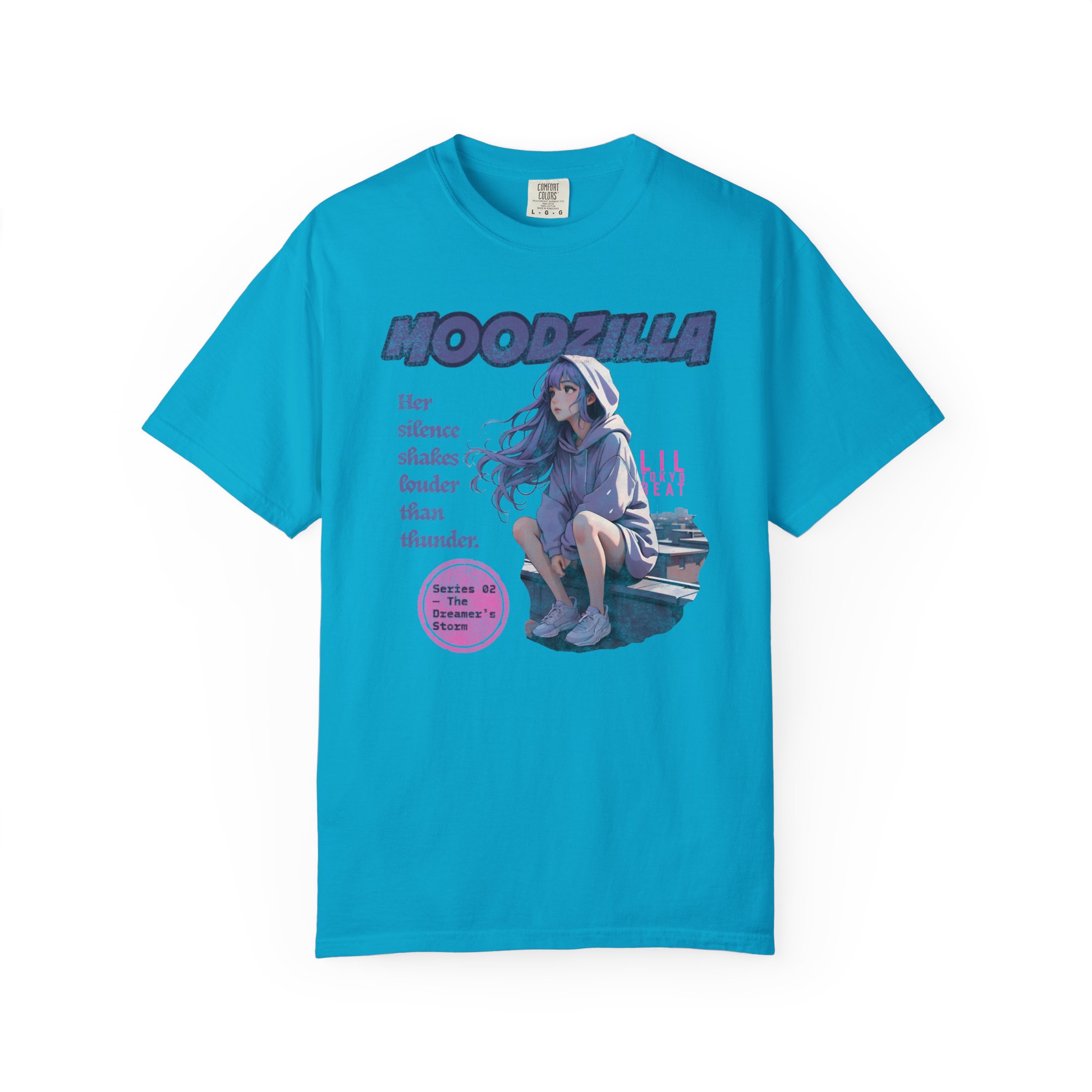 An evocative tee that feels like a quiet scene from an anime — a lavender-haired girl perched on a rooftop, hood trimmed with cloud patterns, watching rain blur the city lights. The image carries a soft, nostalgic ache: slow breaths, the steady patter of rain, a hoodie wrapped close as the wind tugs at hair. This T-shirt slips easily into nights spent wandering city rooftops, sketching in a rain-streaked notebook, or sharing whispered playlists with friends. Fans of dreamy, emotional anime art will recognize the subtle details — muted tones, gentle expression, and a design that reads like a memory. Wear it on mellow evenings, at anime meetups, or when you want clothing that holds a quiet story.
