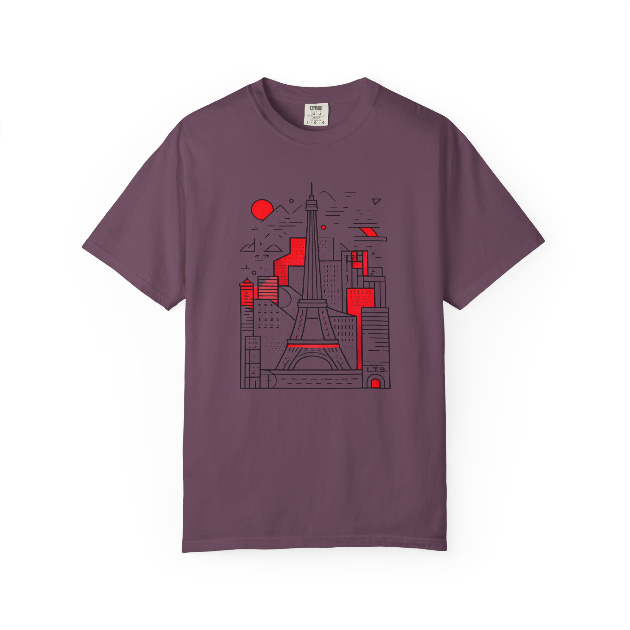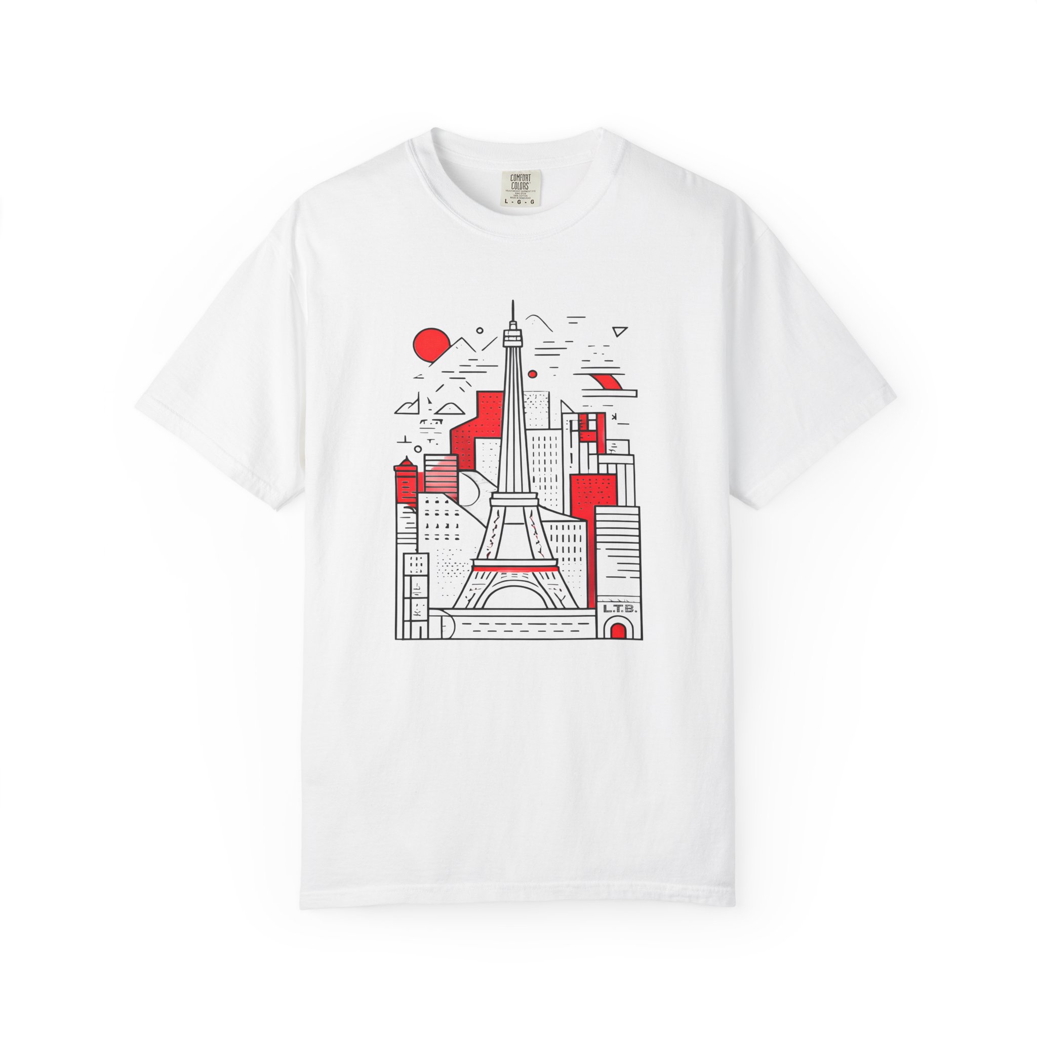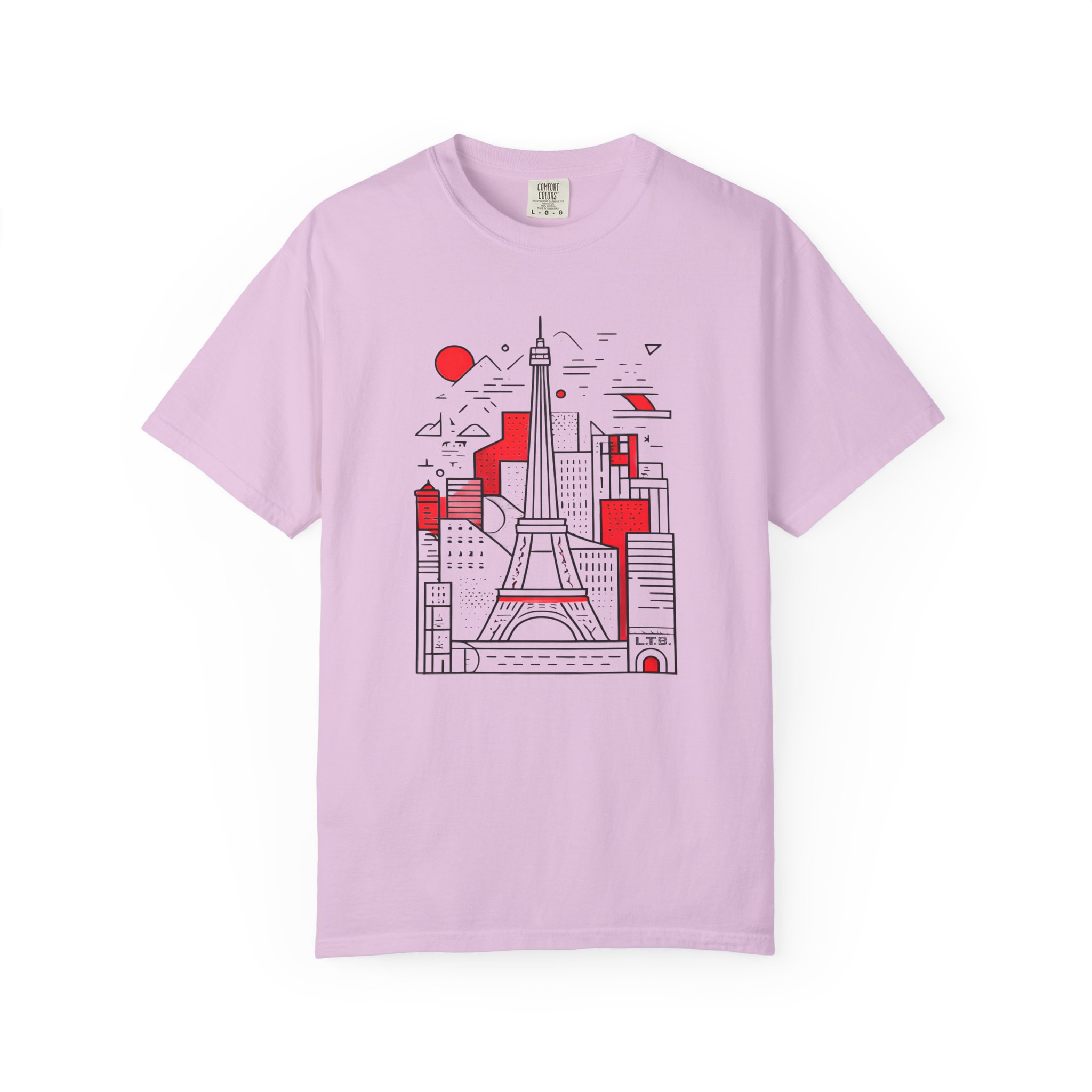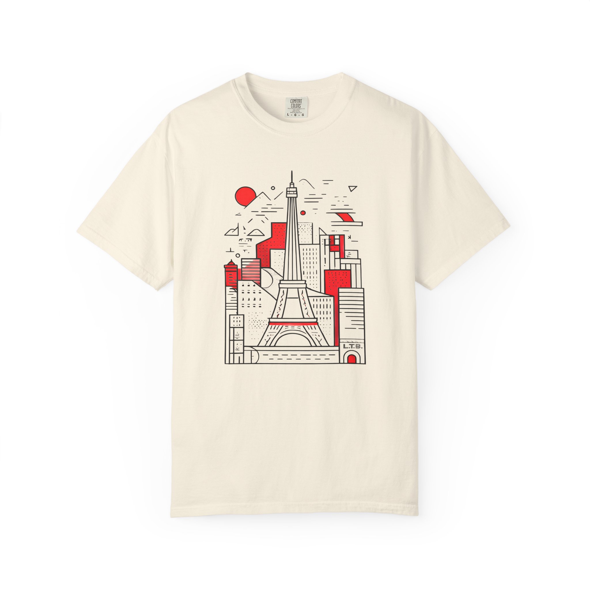 A soft, garment-dyed tee printed with a minimalist cityscape centered on the Eiffel Tower. The heavyweight 100% ring-spun cotton drapes with a relaxed fit and a lived-in feel from the post-construction dyeing. Clean red and black linework gives the design a modern, urban vibe that reads like a travel sketch — wear it on strolls through neighborhoods, at casual gallery nights, or when you’re remembering a favorite trip. The tubular knit and double-needle stitching keep the silhouette simple and durable, while the sewn-in label and pre-shrunk fabric make this a low-maintenance go-to for everyday wear.