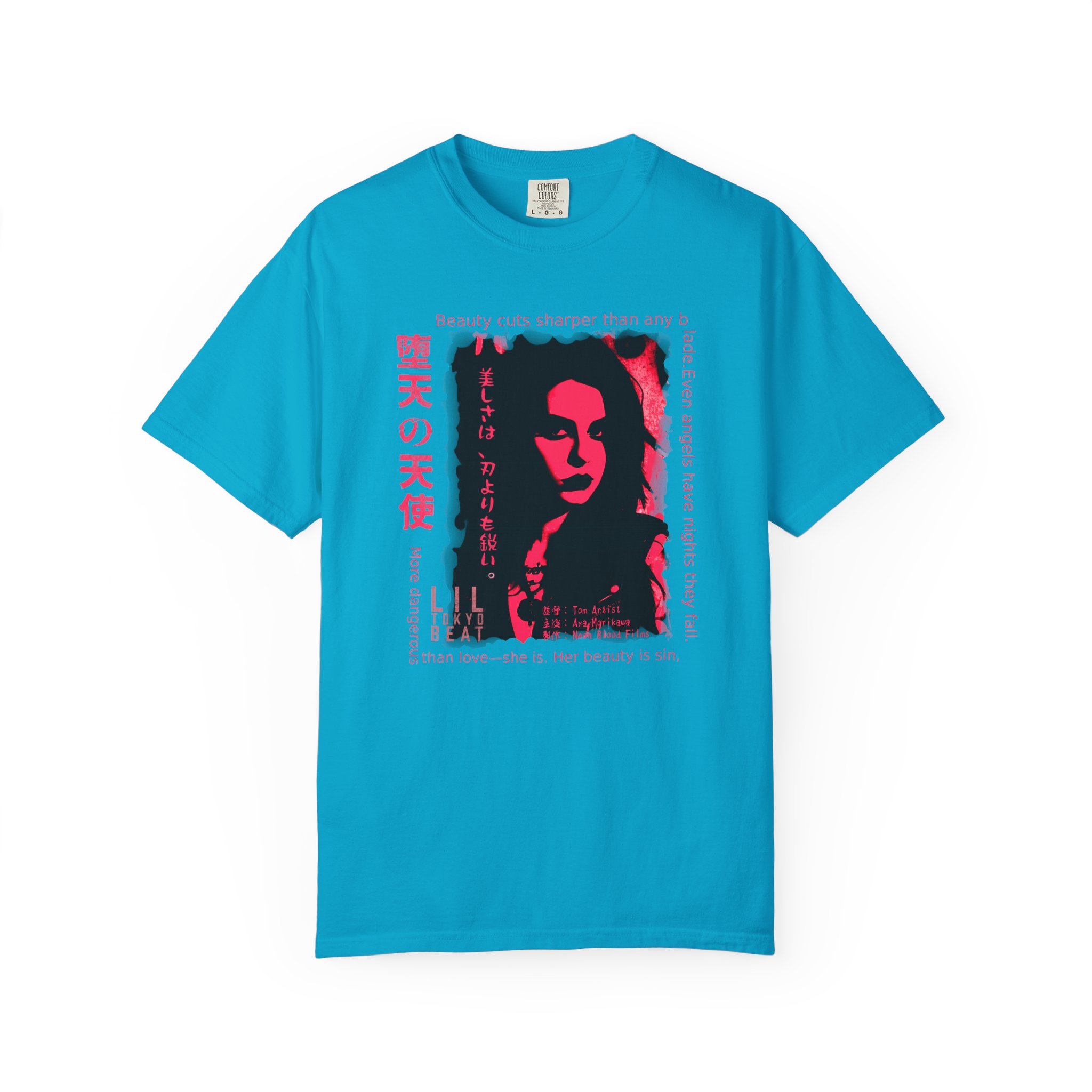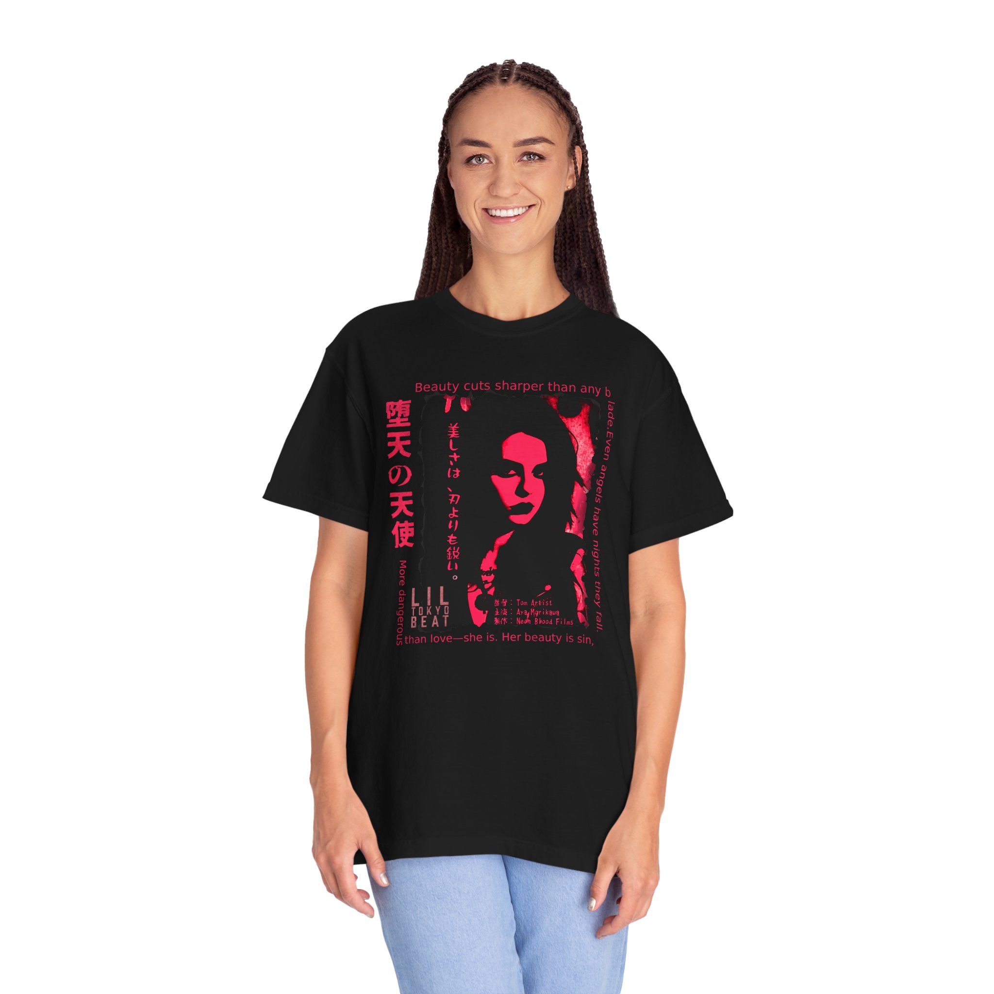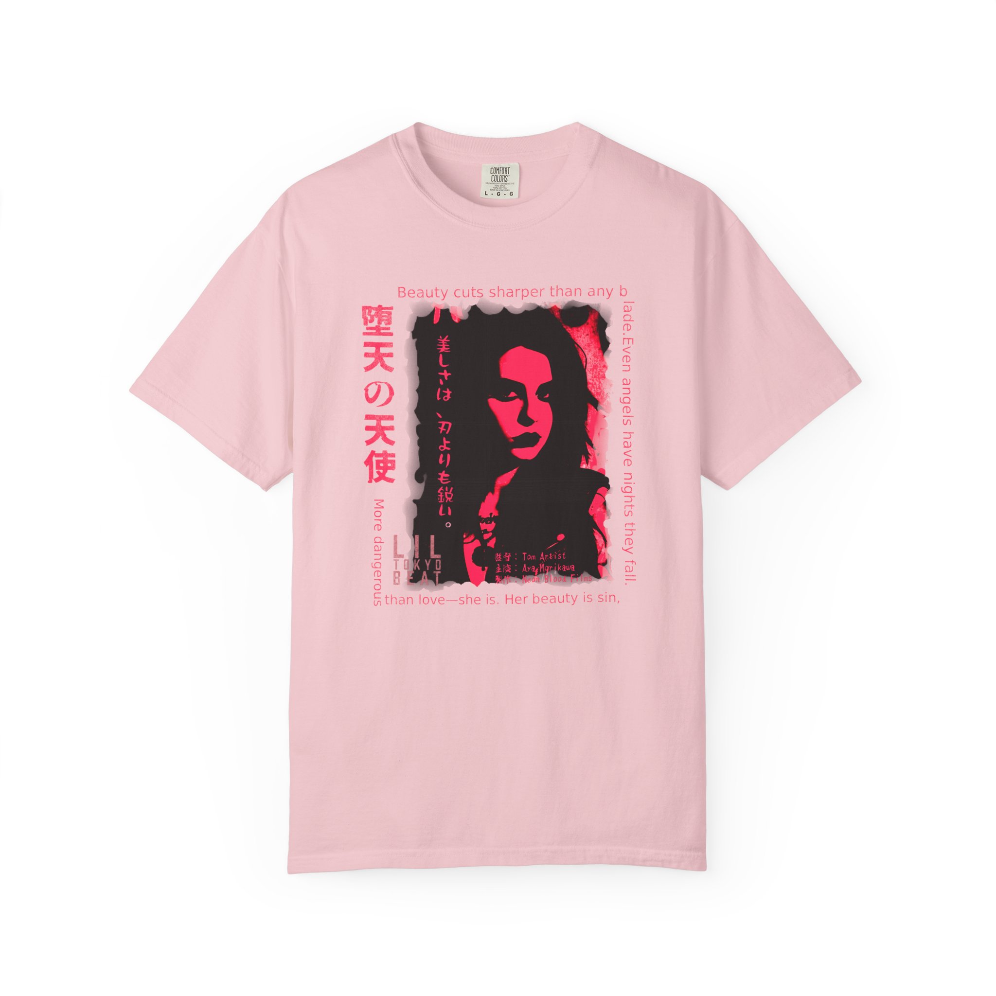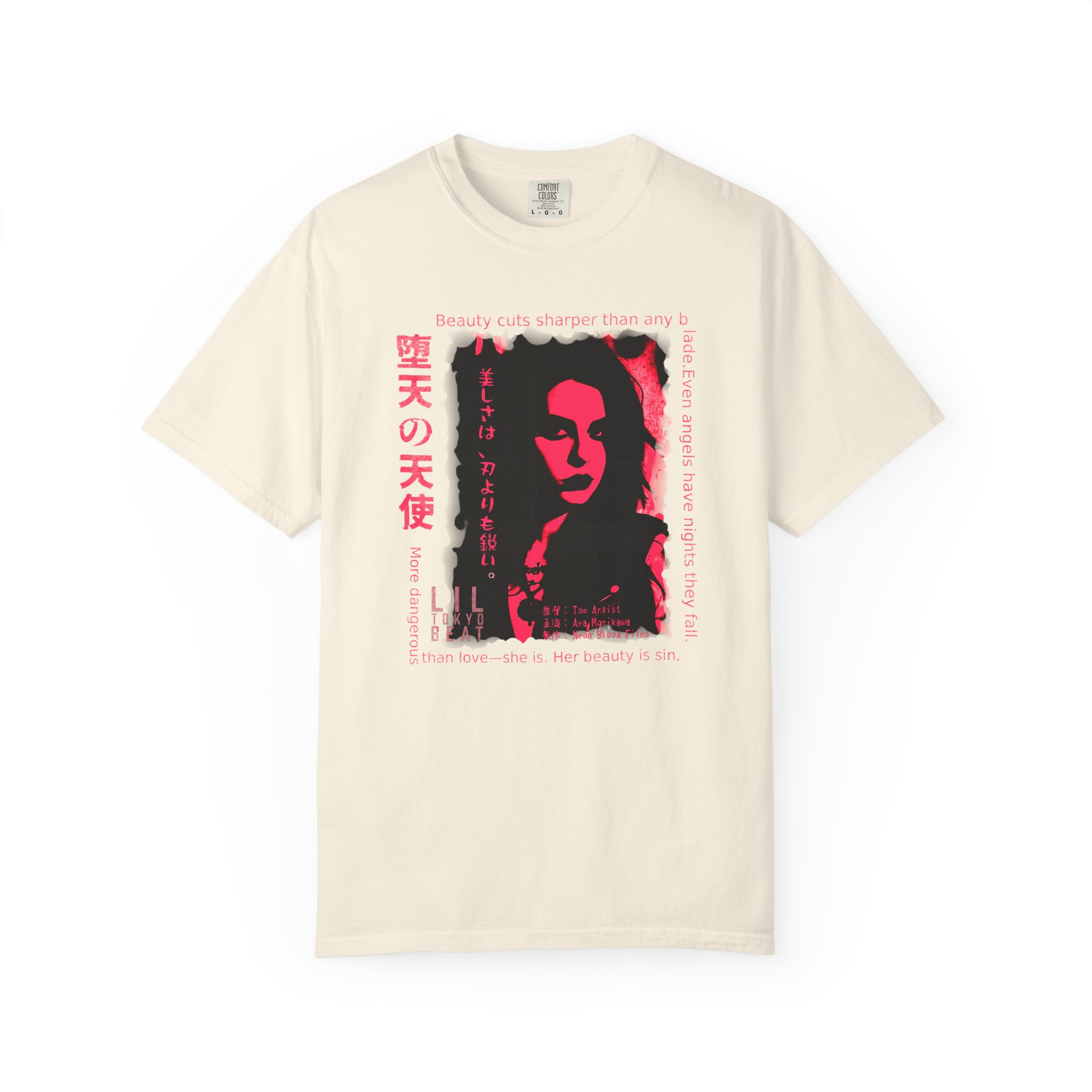 Step into a world of danger, allure, and cinematic mystery with this striking noir‑inspired graphic T-shirt from Lil Tokyo Beat. The design features a bold red‑and‑black portrait paired with dramatic English and Japanese elements that explore themes of beauty, power, temptation, and shadow. With its film‑poster energy and poetic edge, this tee is perfect for fans of dark aesthetics, Japanese streetwear, neo‑noir art, and expressive character‑driven design. Whether worn for nighttime outings, creative sessions, or everyday streetwear, this shirt captures the tension between elegance and danger—where beauty becomes its own kind of weapon. Created under the Lil Tokyo Beat philosophy—Kool. Artful. Timeless.—this design continues the brand vision as A New Voice in Tee Culture.