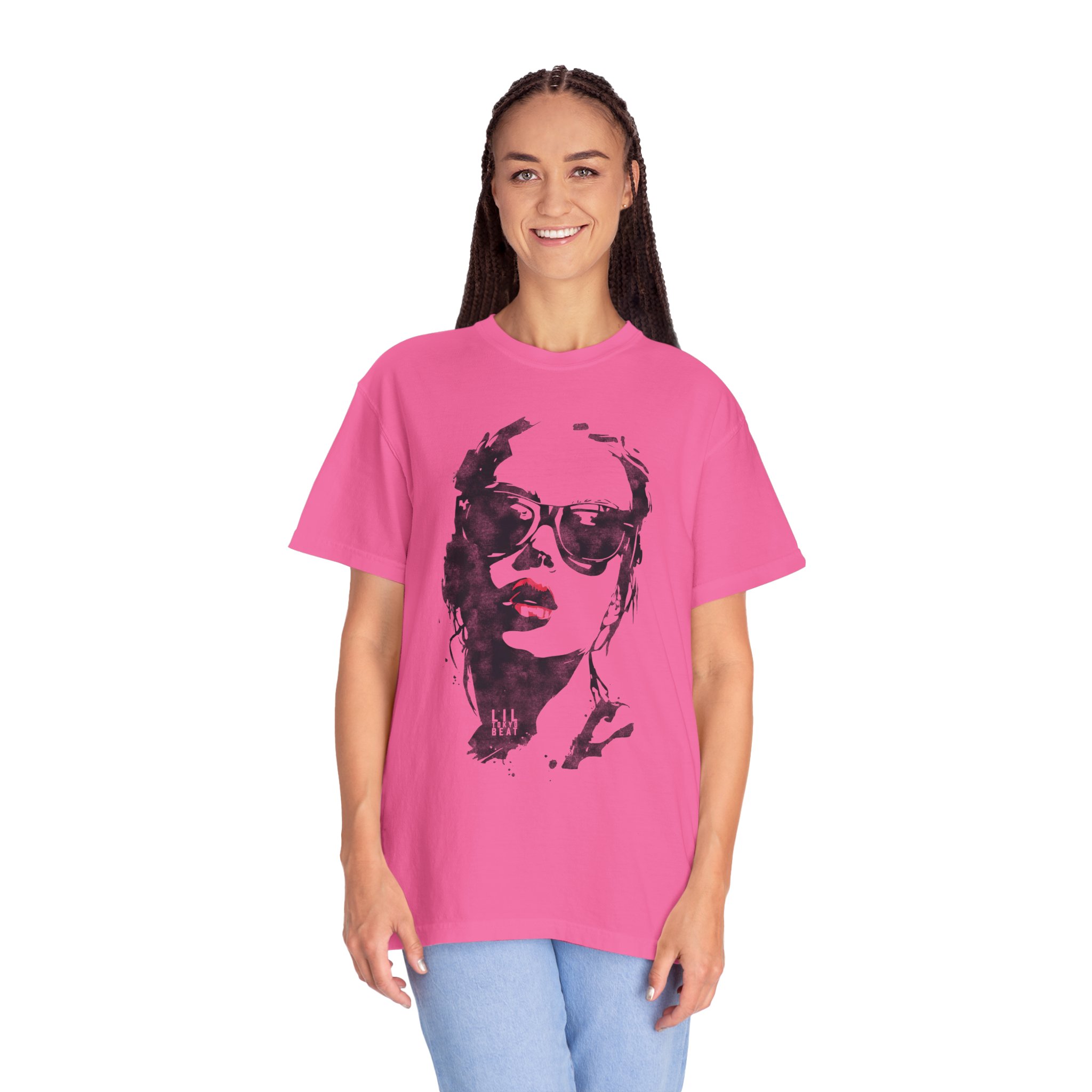 This lightweight-yet-sturdy tee carries a bold fashion-portrait print: a pair of sleek sunglasses and a flash of red lips that reads like a single-frame magazine moment. The garment-dyed cotton has a lived-in softness and muted color depth that makes the graphic feel worn-in and personal, not loud. Wear it with high-waisted jeans, a leather jacket, or under a blazer to add a touch of confident, downtown edge to an everyday outfit. It sits relaxed on the body, moving with you whether you’re stepping out for coffee, curating a weekend look, or layering for an evening out. The aesthetic suits anyone who loves statement accessories, minimal yet striking art, and pieces that look like they’ve got a story already — especially when heading to gallery openings, city strolls, or casual nights with friends.