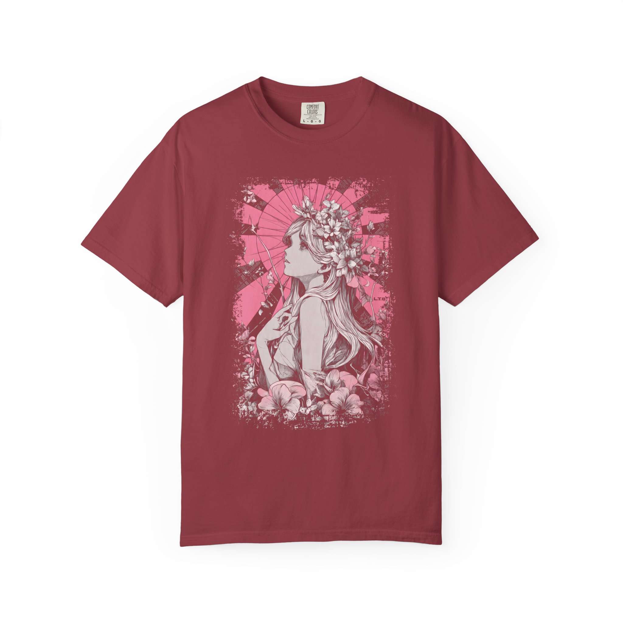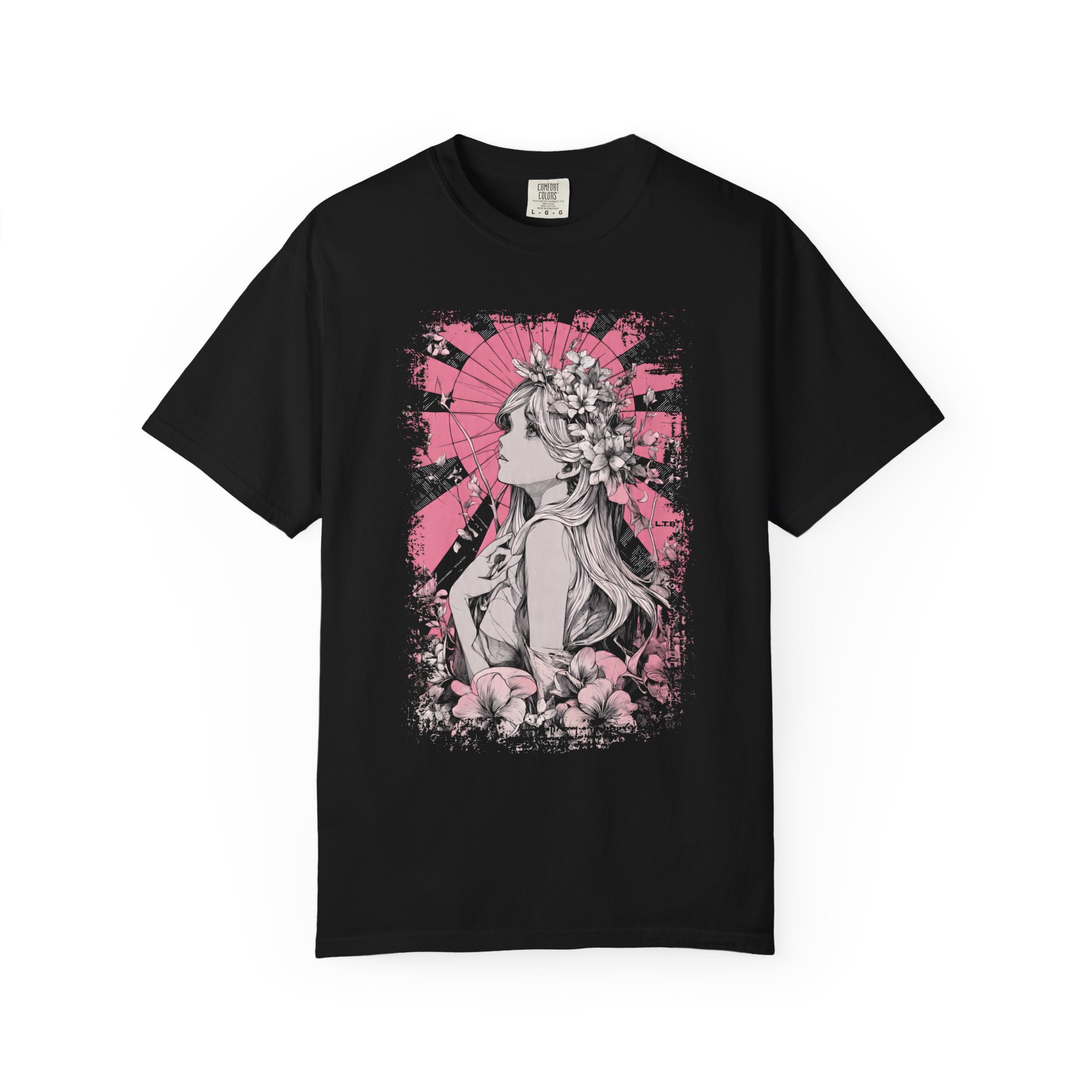 This floral muse illustration T-shirt features a delicate, ink-style portrait of a woman framed by blooming flowers and a soft pink halo backdrop. Fine linework and gentle shading give the artwork a timeless, hand-drawn quality, while the circular background adds a quiet sense of symbolism and focus. The design blends femininity, nature, and emotion without defining a specific story, allowing the viewer to interpret the figure as a muse, memory, or inner reflection. Designed for those who appreciate artistic fashion, floral illustration, and expressive visual storytelling, this tee feels poetic rather than decorative. Printed on a soft, comfortable T-shirt for everyday wear. Created by an independent artist and available exclusively at liltokyobeat.com, this wearable art celebrates beauty, introspection, and quiet strength.