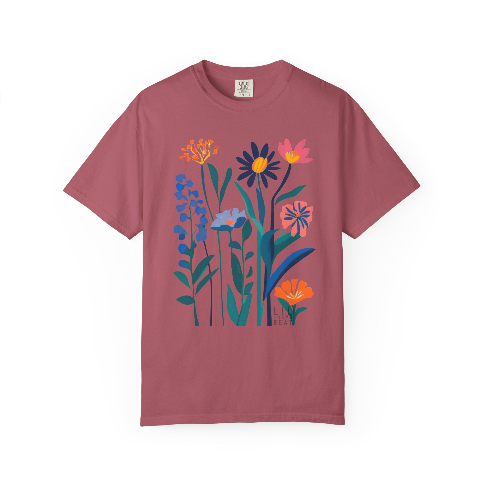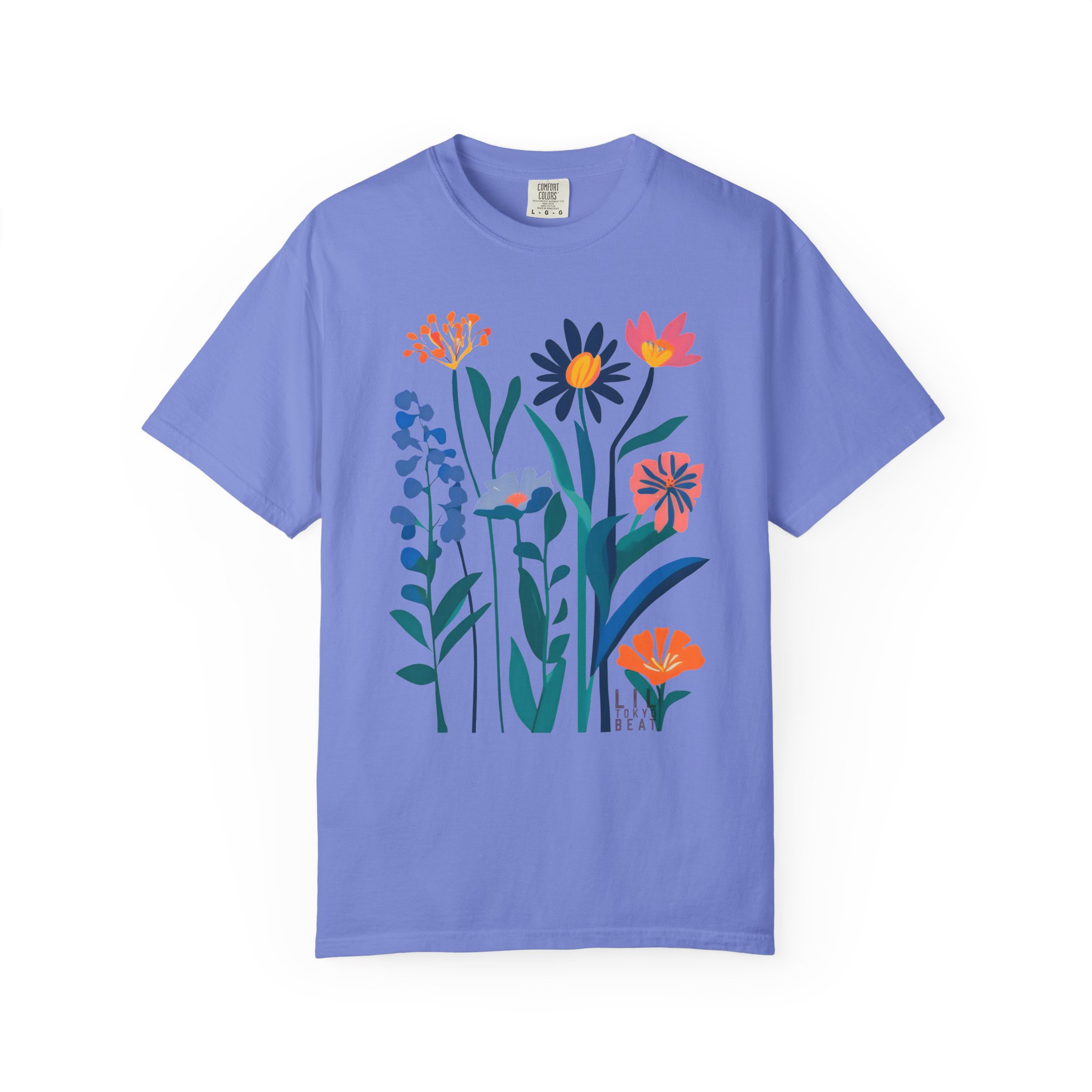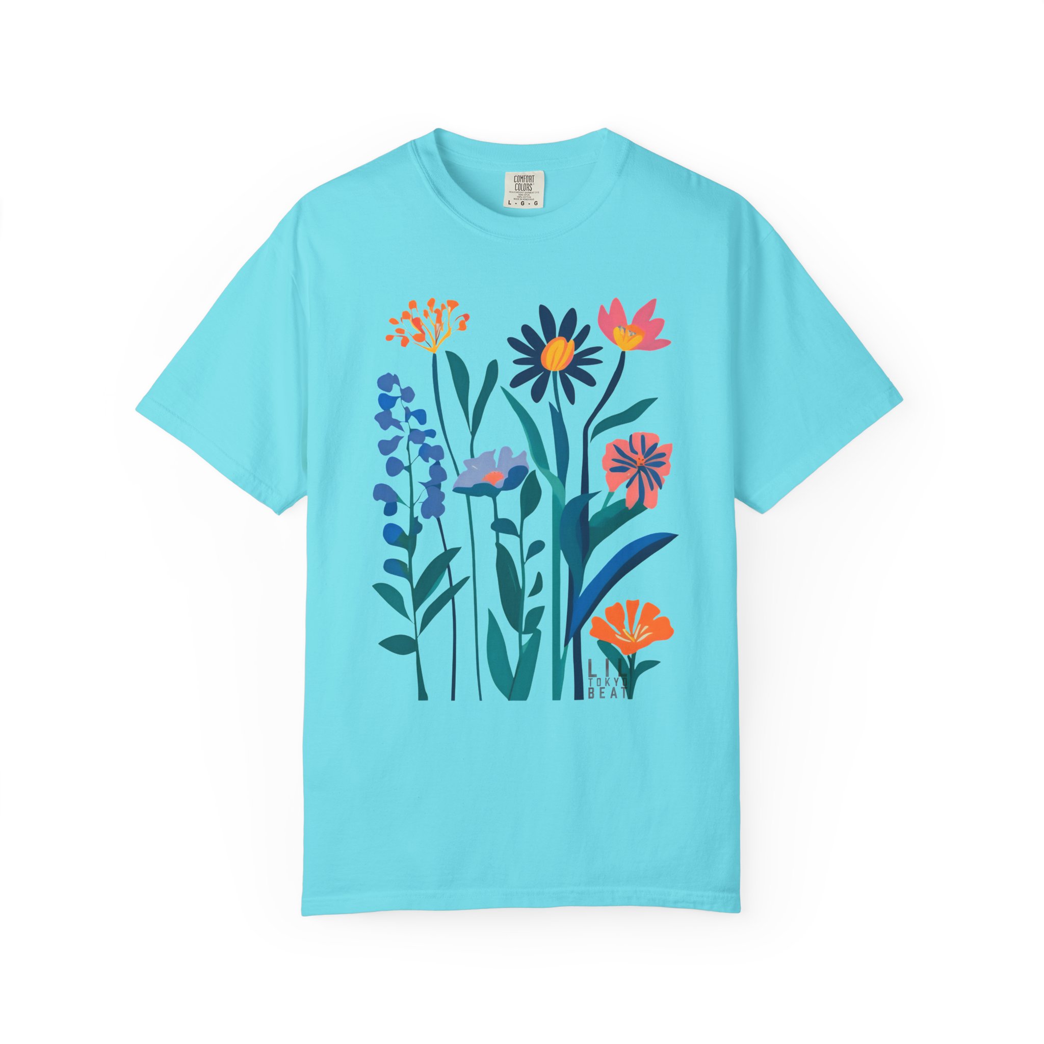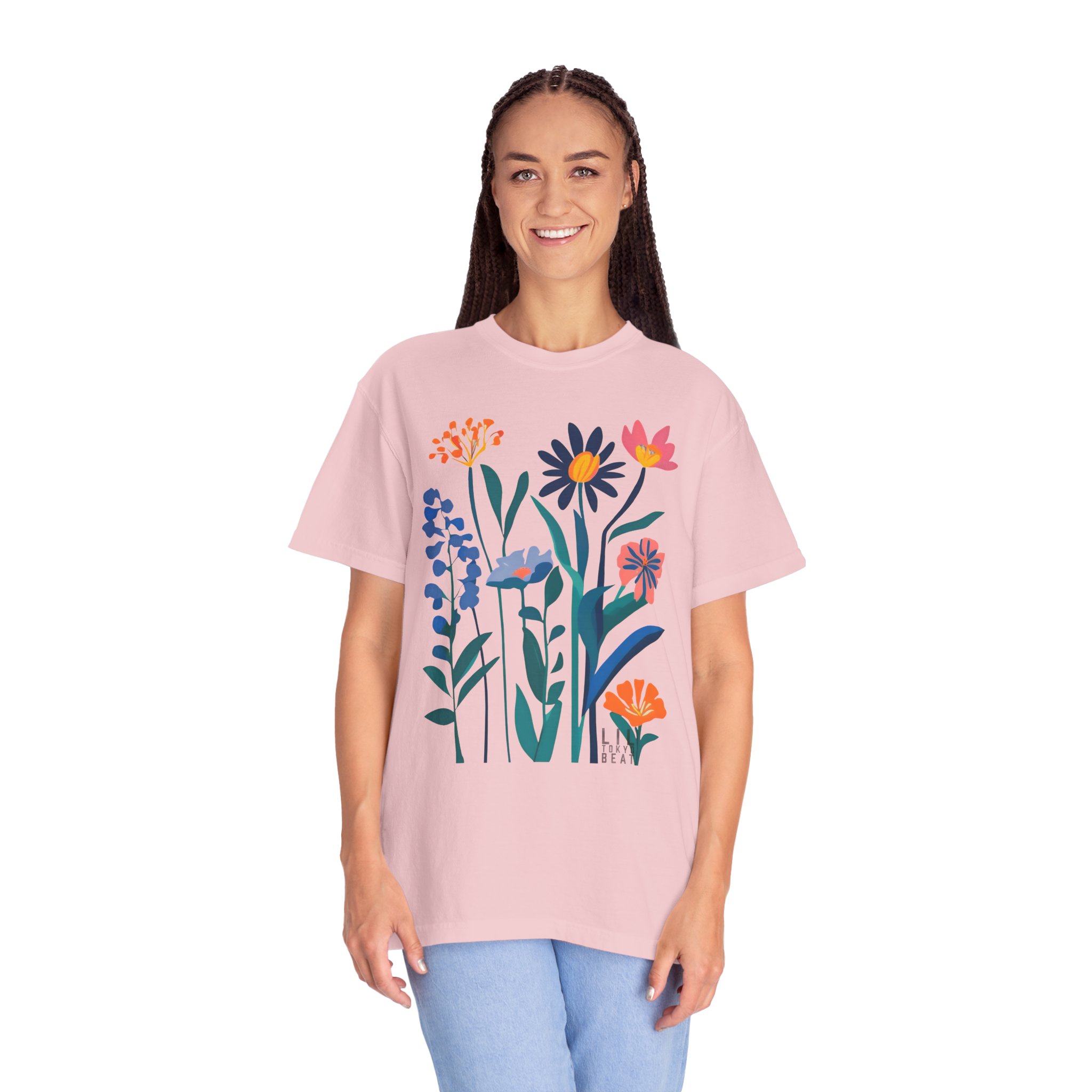 Soft, laid-back, and blooming with color — this garment-dyed tee brings a gentle garden right into everyday wear. The medium-weight 100% ring-spun cotton feels lived-in from the first wear, with a relaxed fit that layers easily or stands on its own. Hand-drawn florals in bold, organic shapes add a modern, artsy touch that reads like a quiet walk through a neighborhood flowerbed. The tubular knit and double-needle stitching mean cleaner lines and longer life, while the garment-dye process gives the shirt a subtle, vintage-washed finish that deepens with time. Wear it to weekend markets, slow morning coffee runs, or weekday strolls — it moves with the rhythm of someone who notices small, beautiful things.