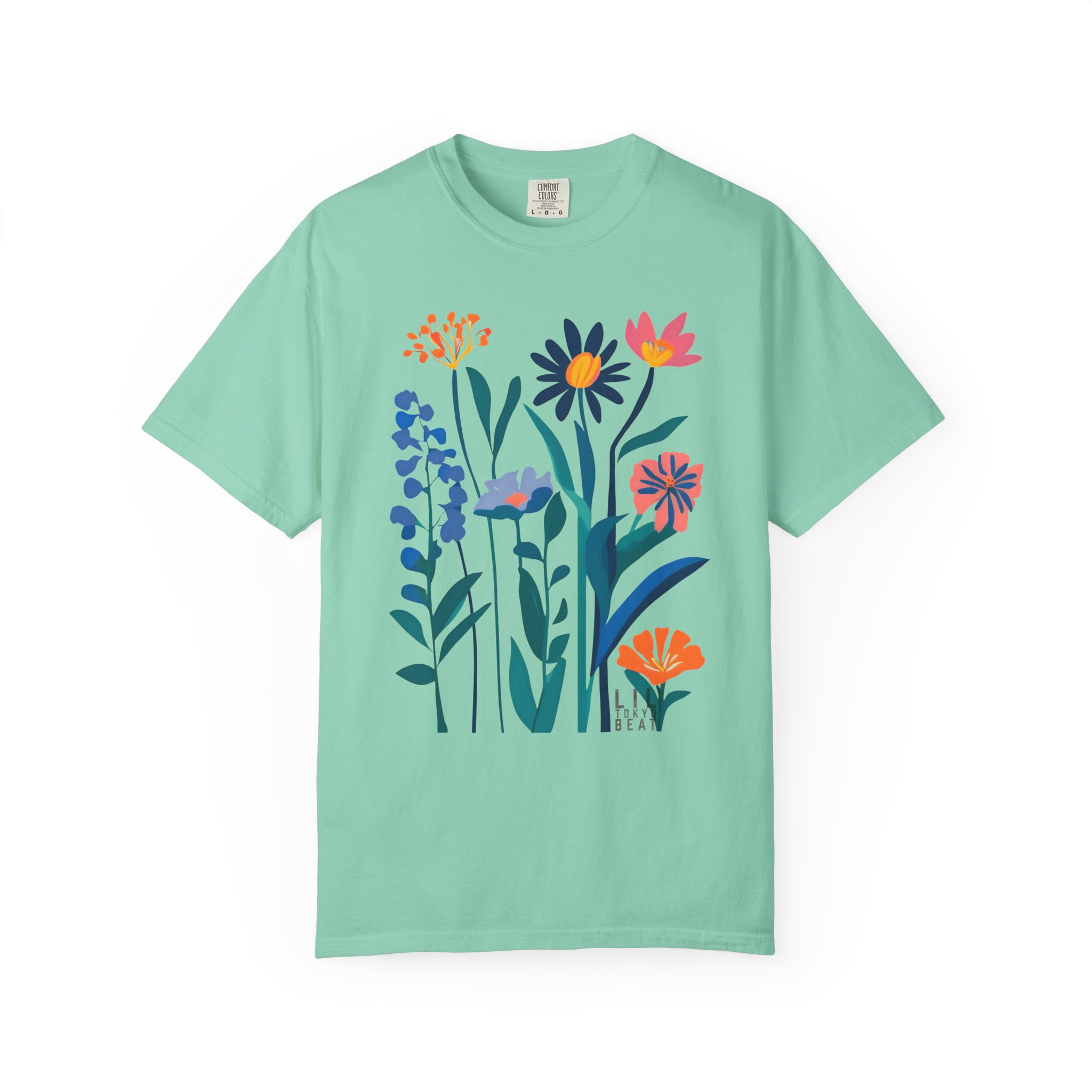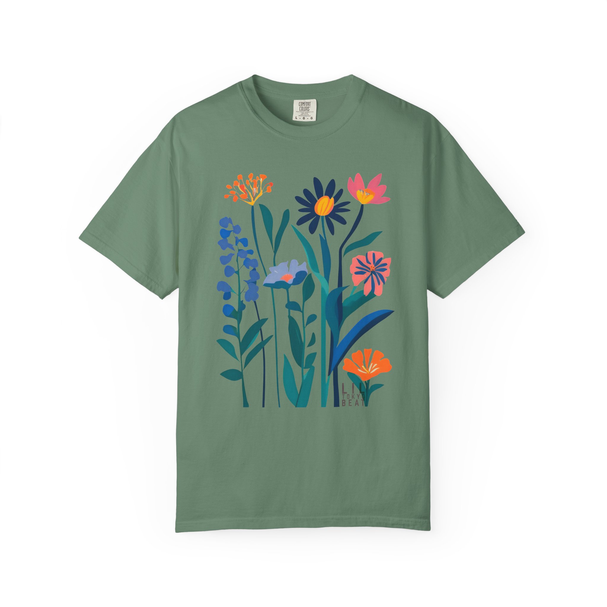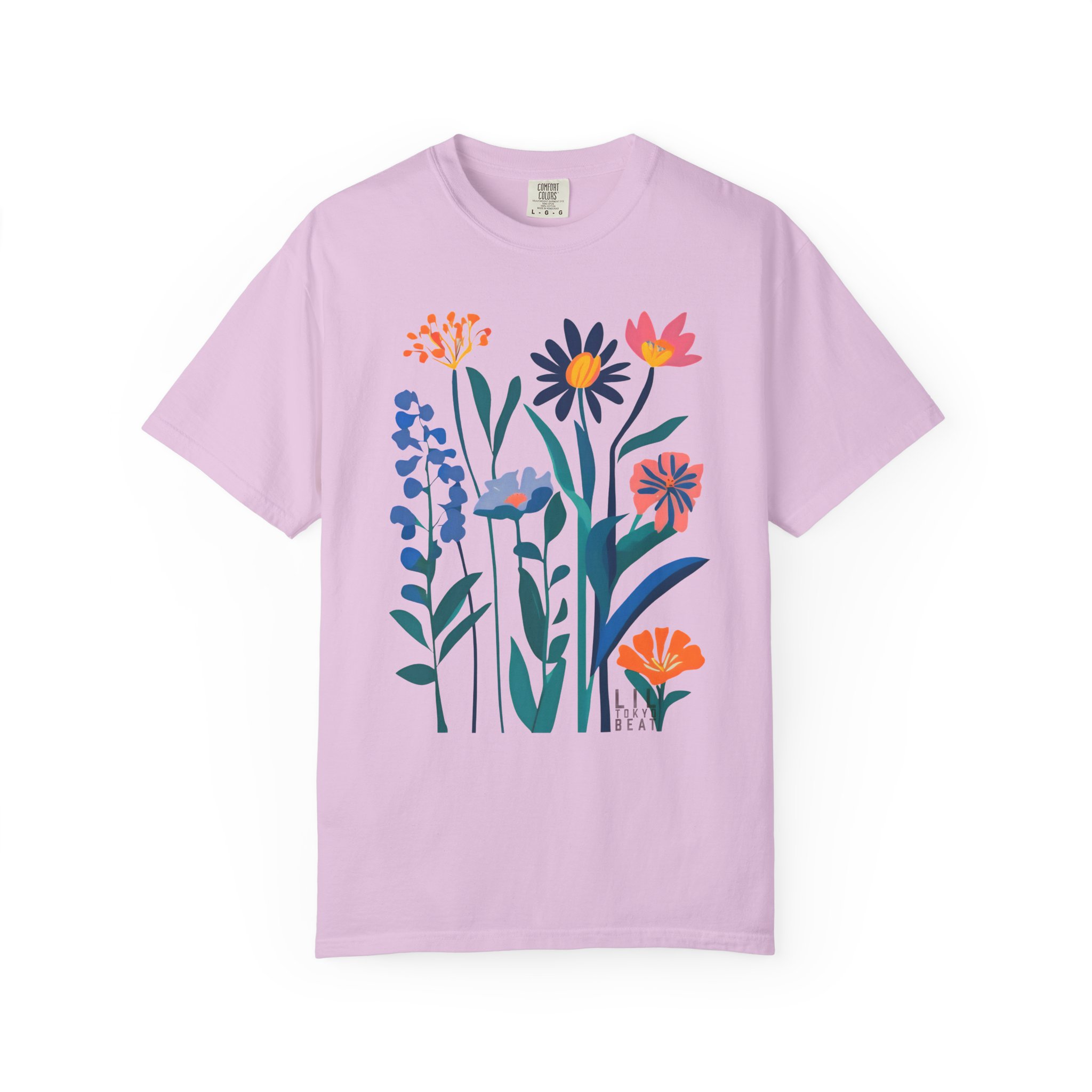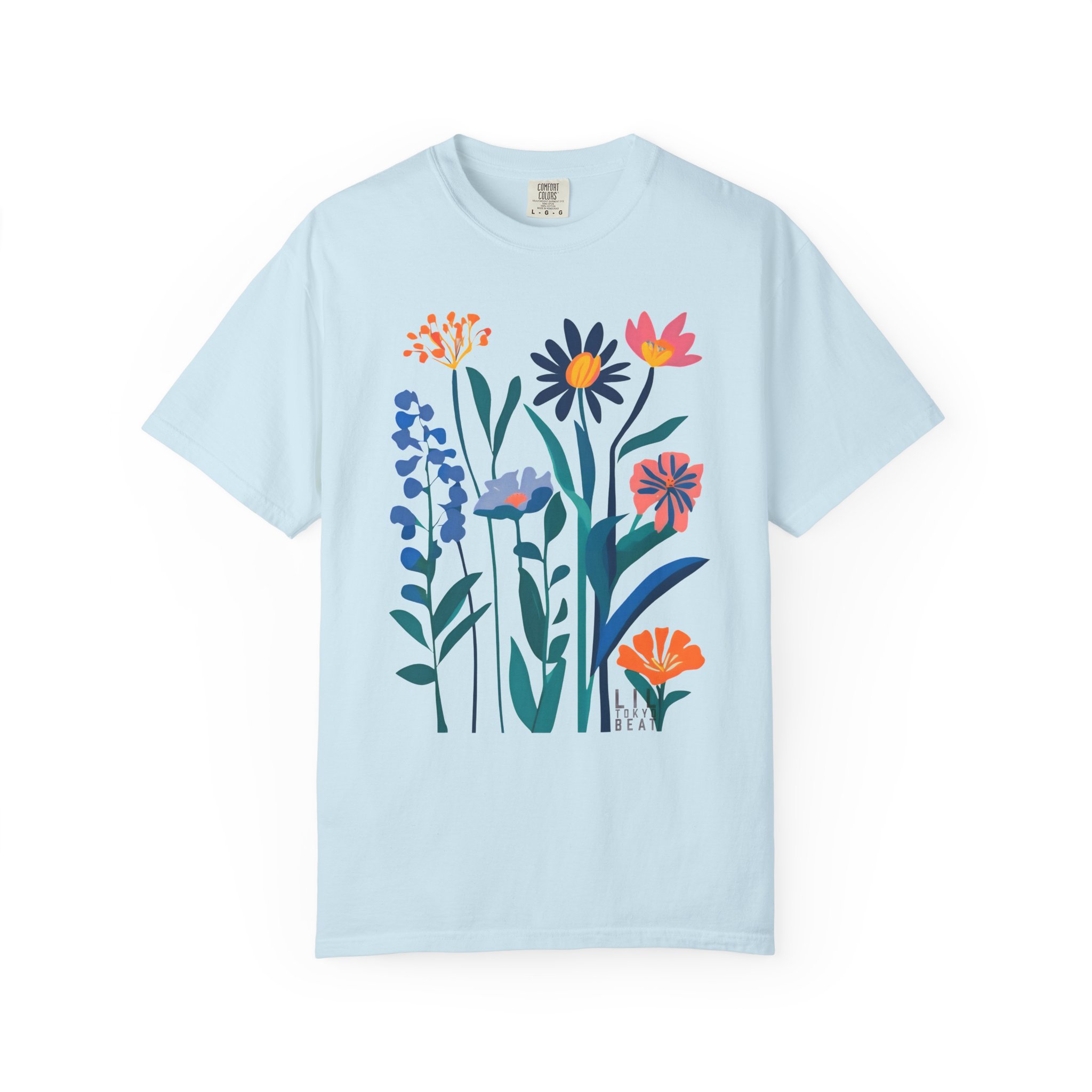 Soft, laid-back, and blooming with color — this garment-dyed tee brings a gentle garden right into everyday wear. The medium-weight 100% ring-spun cotton feels lived-in from the first wear, with a relaxed fit that layers easily or stands on its own. Hand-drawn florals in bold, organic shapes add a modern, artsy touch that reads like a quiet walk through a neighborhood flowerbed. The tubular knit and double-needle stitching mean cleaner lines and longer life, while the garment-dye process gives the shirt a subtle, vintage-washed finish that deepens with time. Wear it to weekend markets, slow morning coffee runs, or weekday strolls — it moves with the rhythm of someone who notices small, beautiful things.
