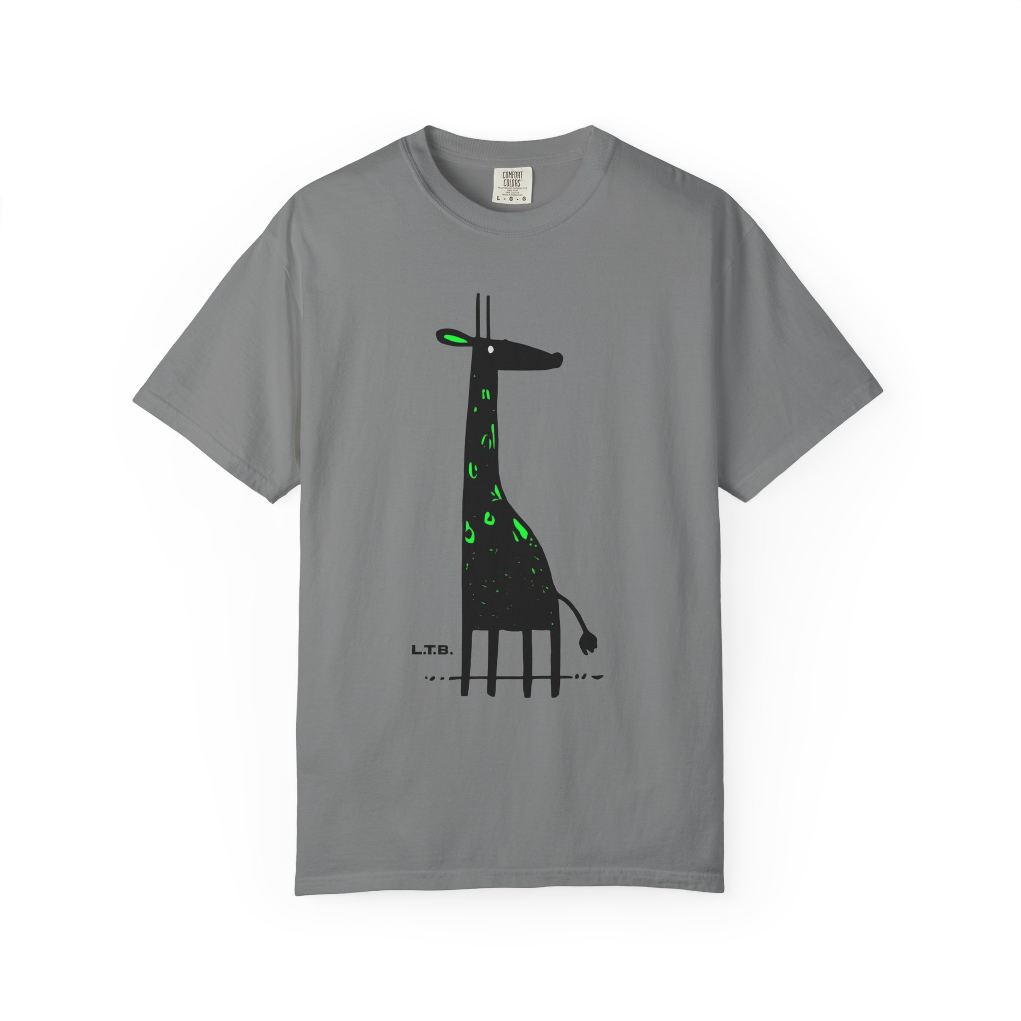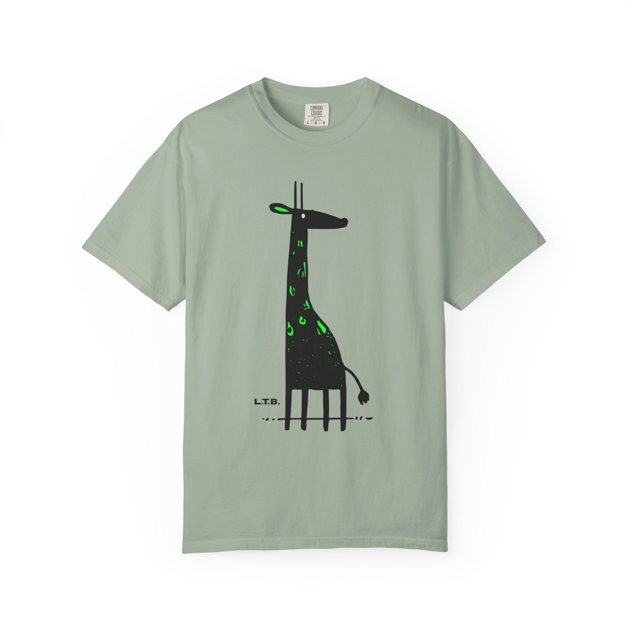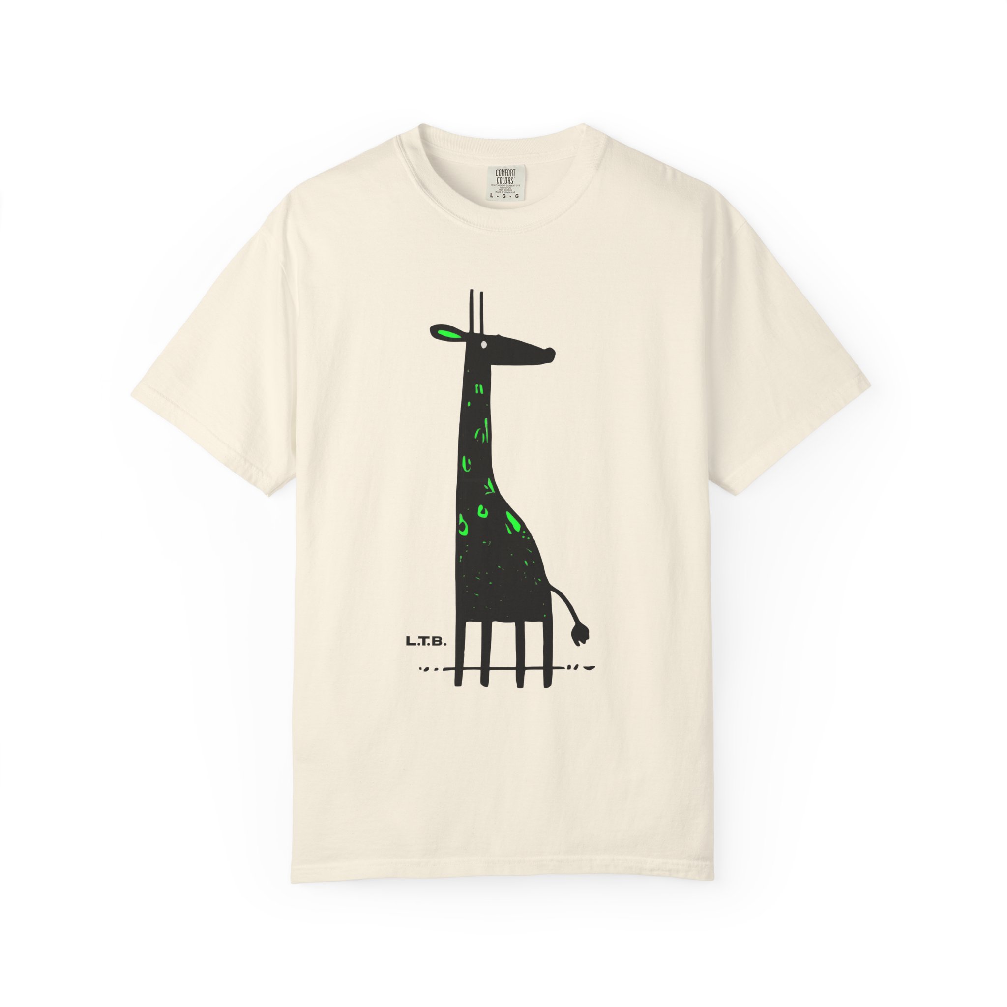 This relaxed-fit T-shirt carries a hand-drawn giraffe motif that feels playful and slightly offbeat. The simple black silhouette, punctuated with neon-green spots and minimalist line accents, reads like a sketch from a late-night doodle session — honest, a little quirky, and warmly human. It sits on a garment-dyed, heavyweight cotton body that softens with wear so the shirt becomes a lived-in favorite rather than something precious. Wear it with worn denim, layered under a flannel, or tossed over leggings for an easy, creative look. The design gives a subtle conversation starter for casual meetups, weekend markets, or laid-back studio days, and the relaxed cut keeps movement and comfort front and center.