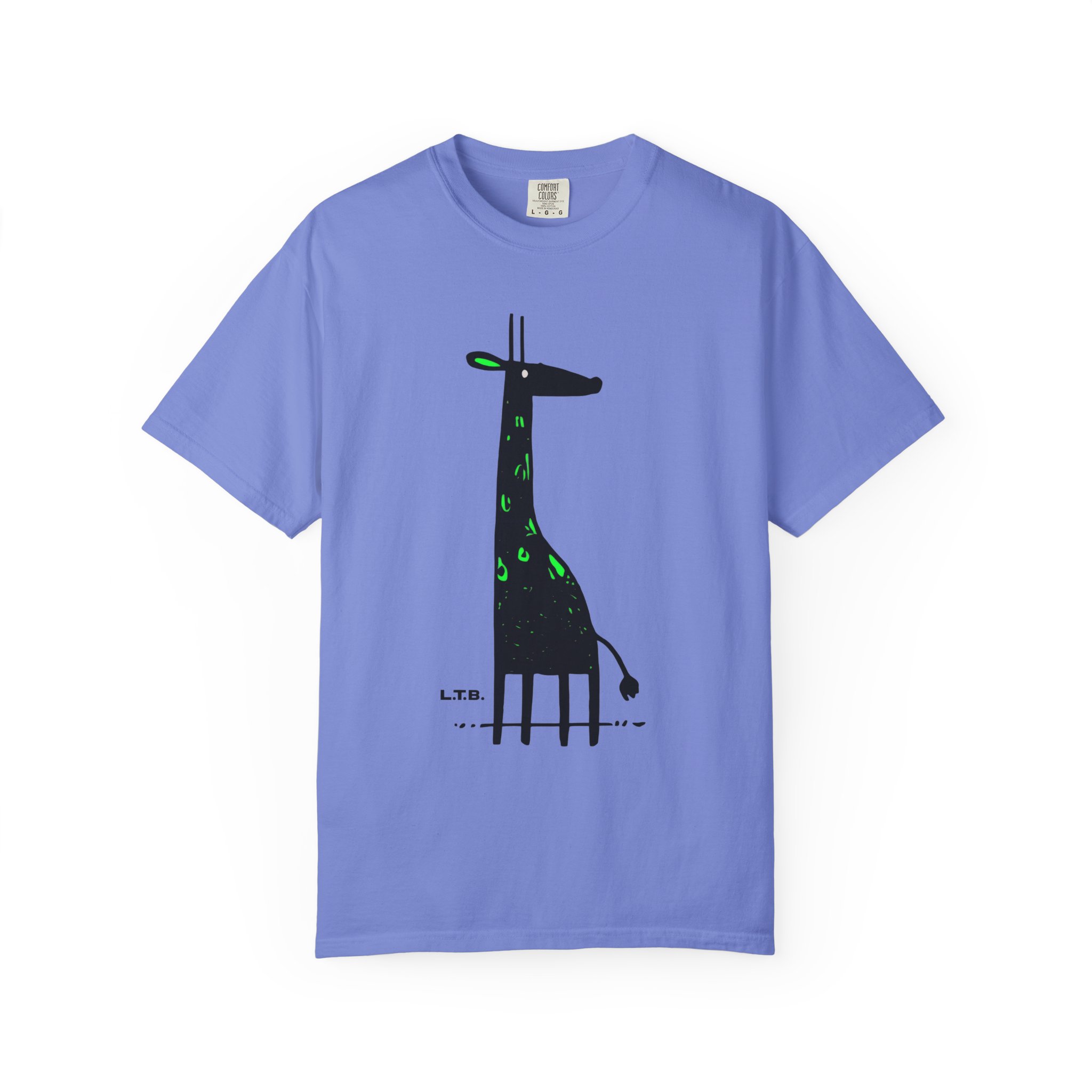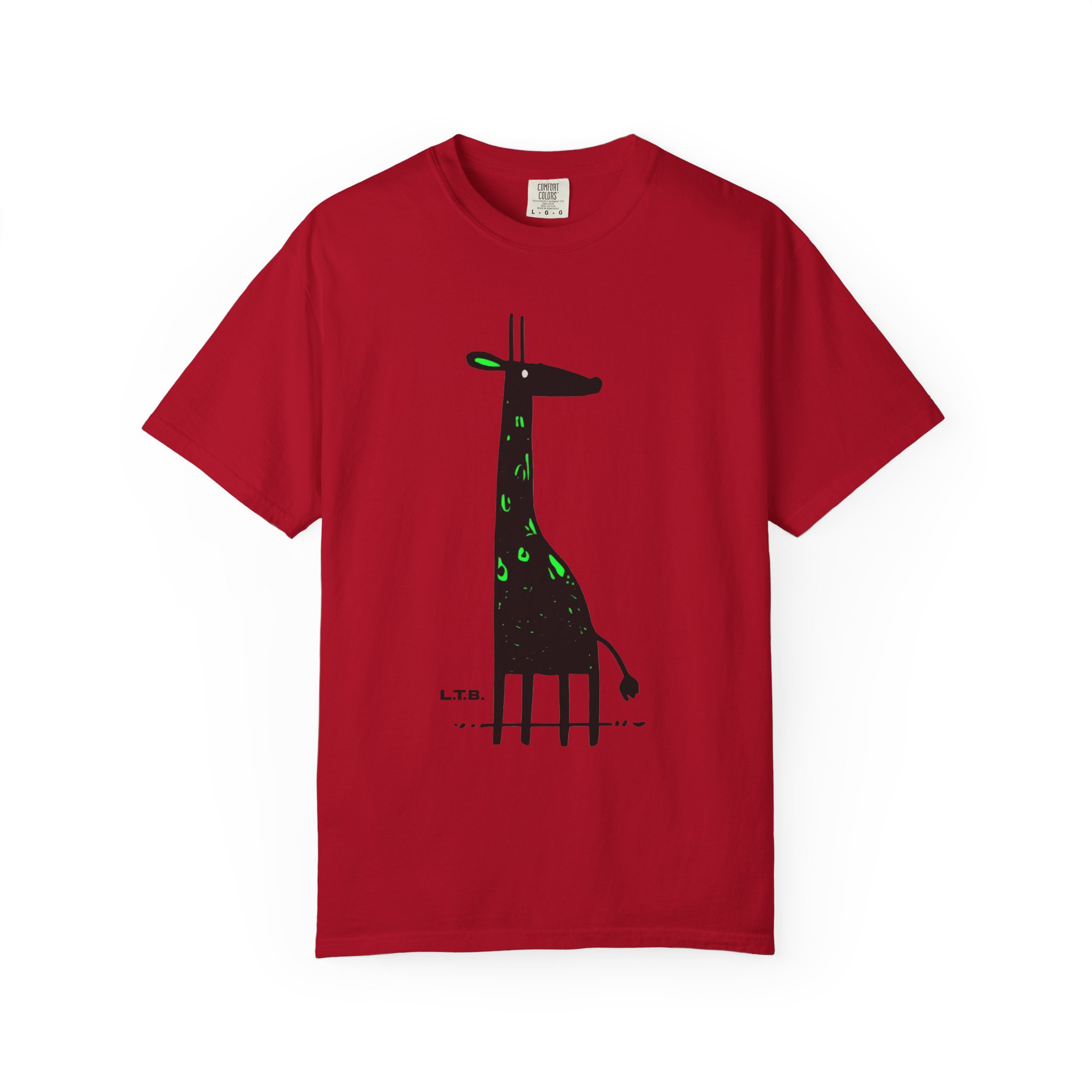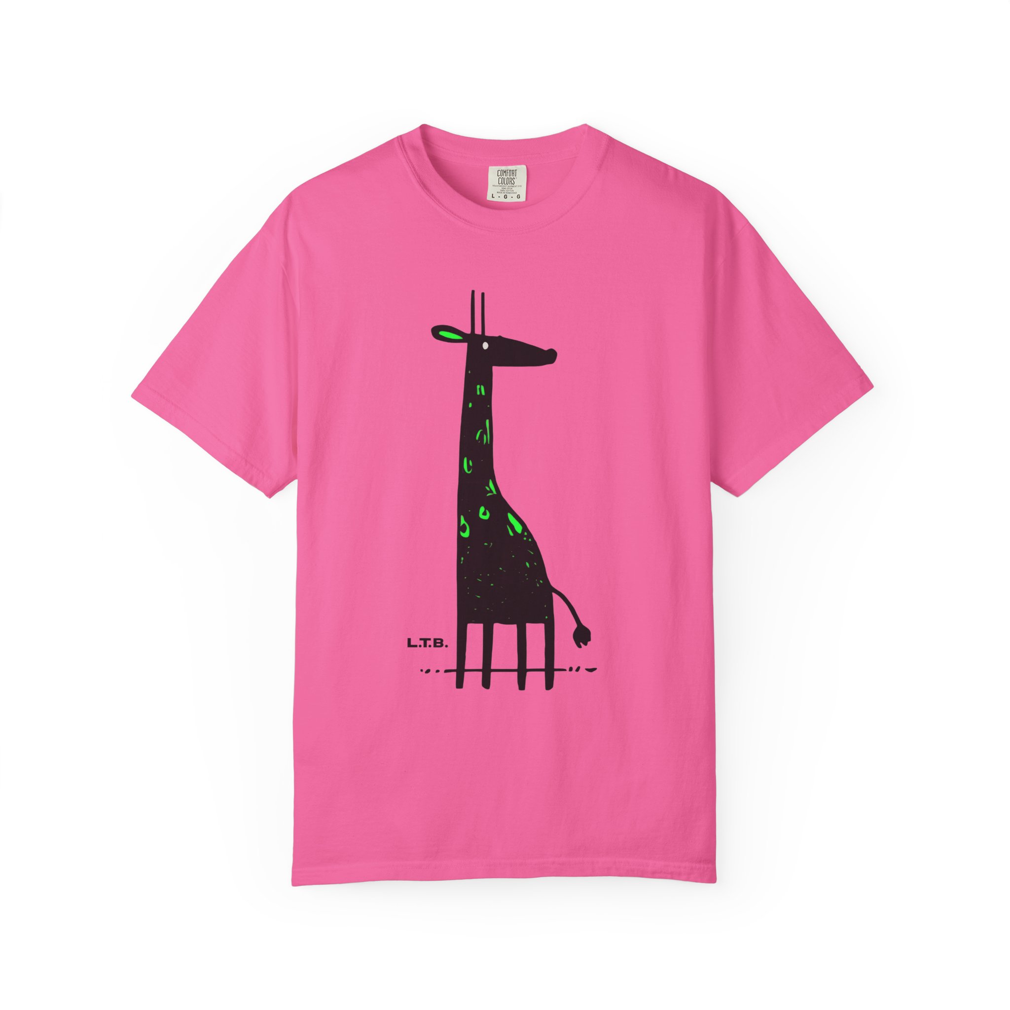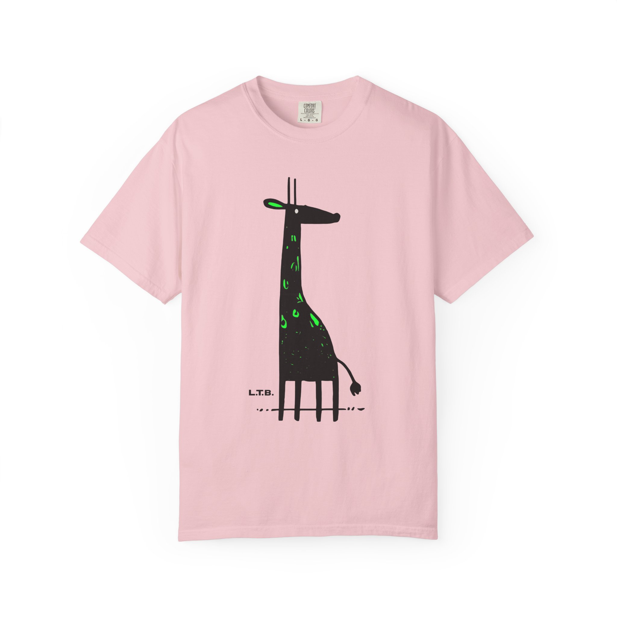 This relaxed-fit T-shirt carries a hand-drawn giraffe motif that feels playful and slightly offbeat. The simple black silhouette, punctuated with neon-green spots and minimalist line accents, reads like a sketch from a late-night doodle session — honest, a little quirky, and warmly human. It sits on a garment-dyed, heavyweight cotton body that softens with wear so the shirt becomes a lived-in favorite rather than something precious. Wear it with worn denim, layered under a flannel, or tossed over leggings for an easy, creative look. The design gives a subtle conversation starter for casual meetups, weekend markets, or laid-back studio days, and the relaxed cut keeps movement and comfort front and center.