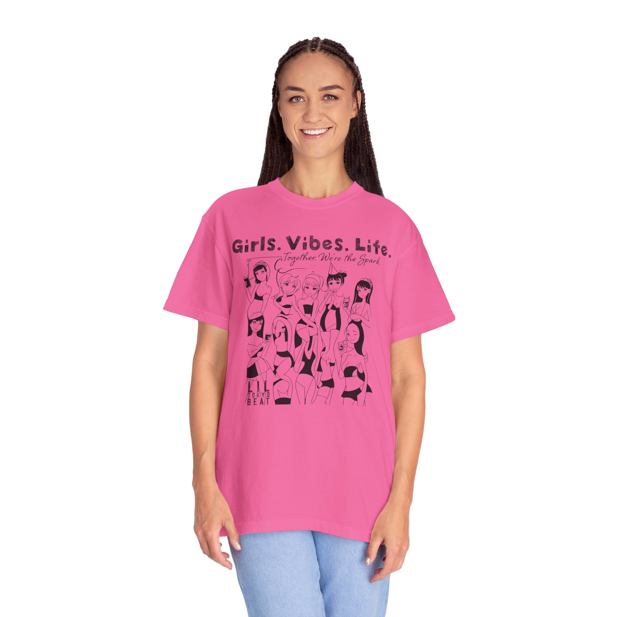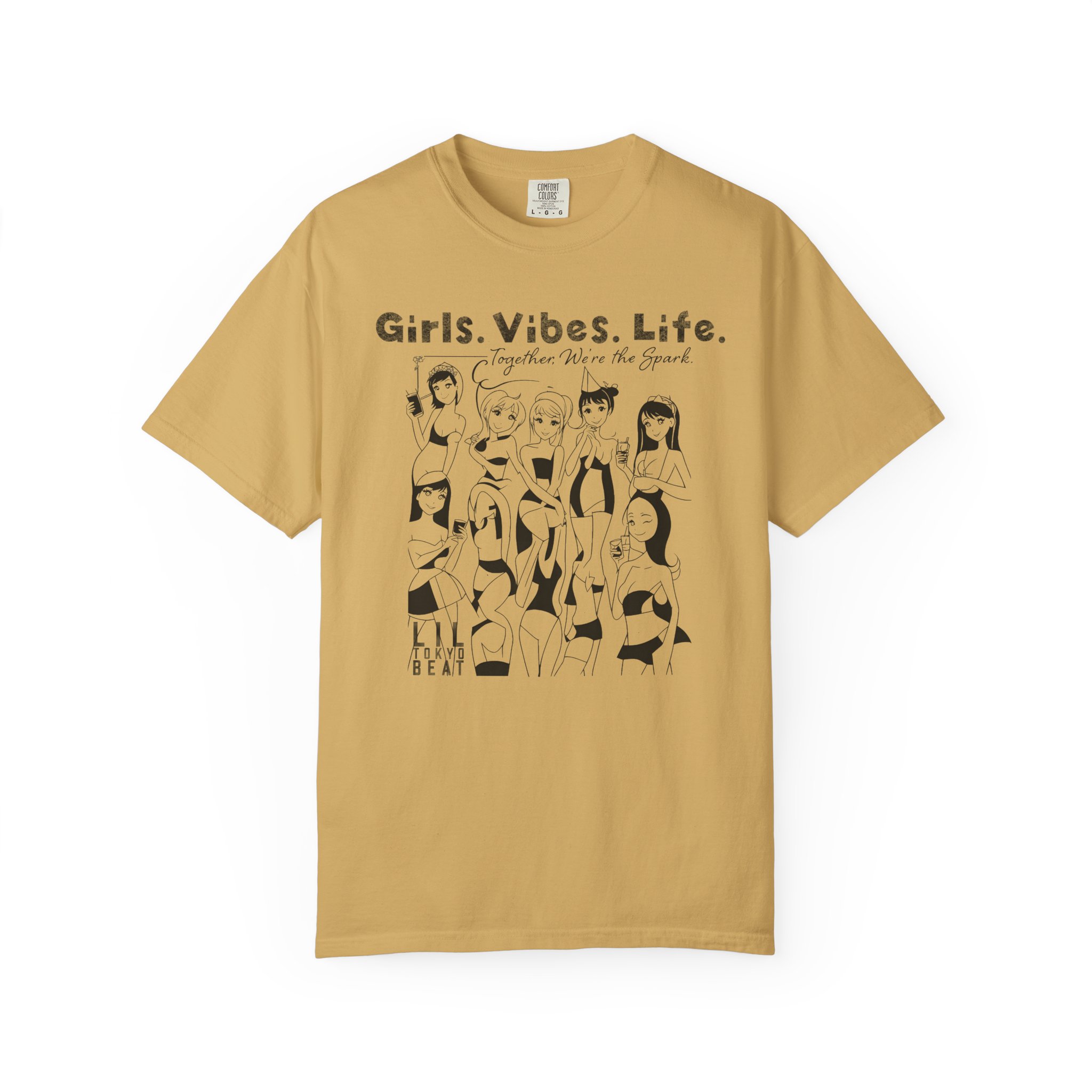 This garment-dyed tee carries a quiet, sunlit energy — an artful black-and-white illustration of confident women and the words “Girls. Vibes. Life.” across the chest. The relaxed fit and soft, lived-in color from post-construction dyeing make it feel like a favorite right away. Wear it to slow coffee shop mornings, sketchbook afternoons, or backyard gatherings when you want an effortless, slightly nostalgic look. The imagery reads like an indie zine spread: playful, bold, and personal. It pairs with high-waist jeans or a linen skirt, and it layers cleanly under a denim jacket when the air cools. This shirt lets you move through your day with quiet community — vintage-inspired, modern-minded, and easy to live in. Product features – Sizes S–4XL (select partners) with Comfort Colors 1717 size chart – 100% ring-spun US cotton, pre-shrunk; medium weight (6.1 oz/yd²) – Garment-dyed after construction for soft color and texture – Tubular knit (no side seams) with double-needle stitched seams for durability – Relaxed fit, sewn-in label, made in Honduras; available in 58 colors Care instructions – Machine wash: cold (max 30C or 90F) – Do not bleach – Tumble dry: low heat – Iron, steam or dry: low heat – Do not dryclean