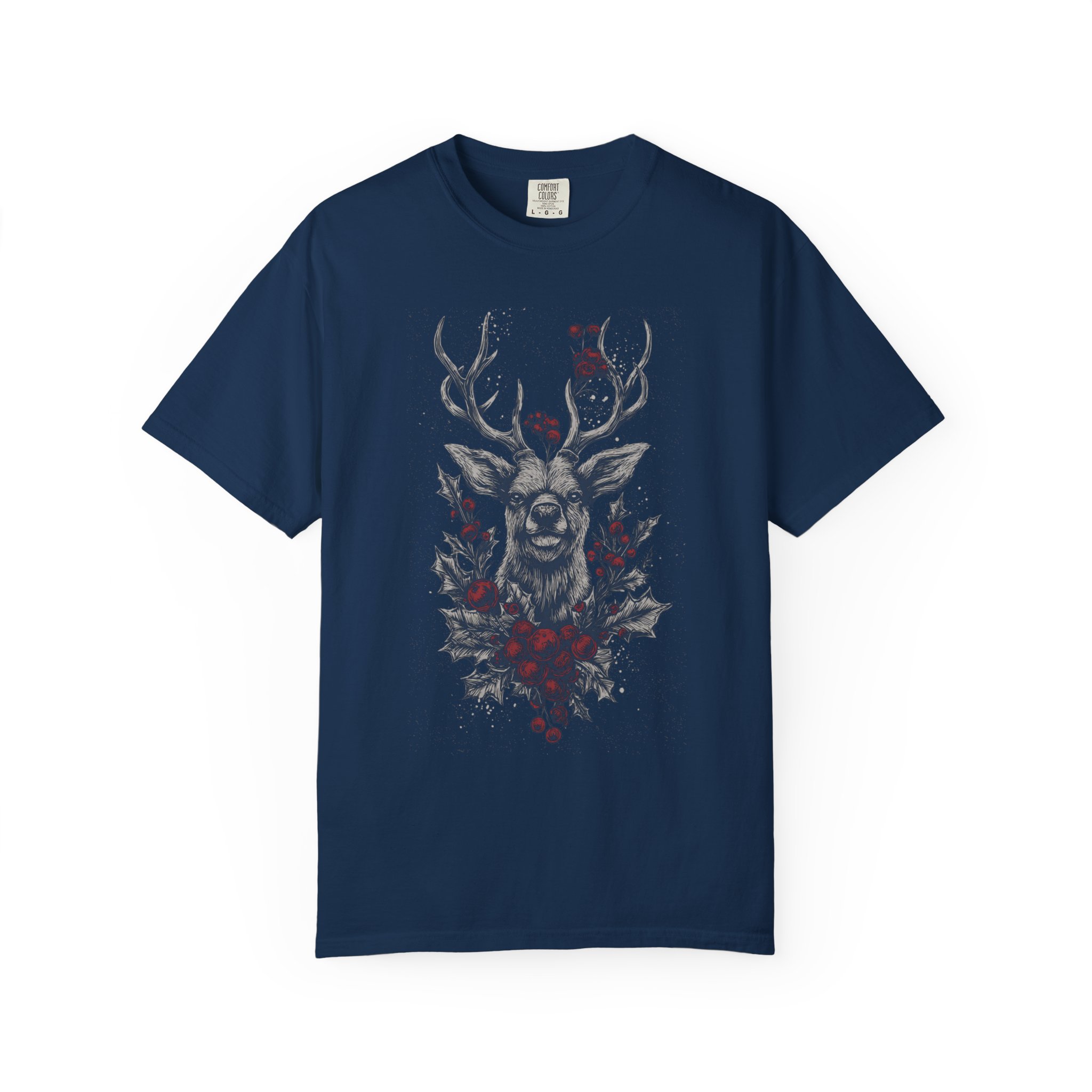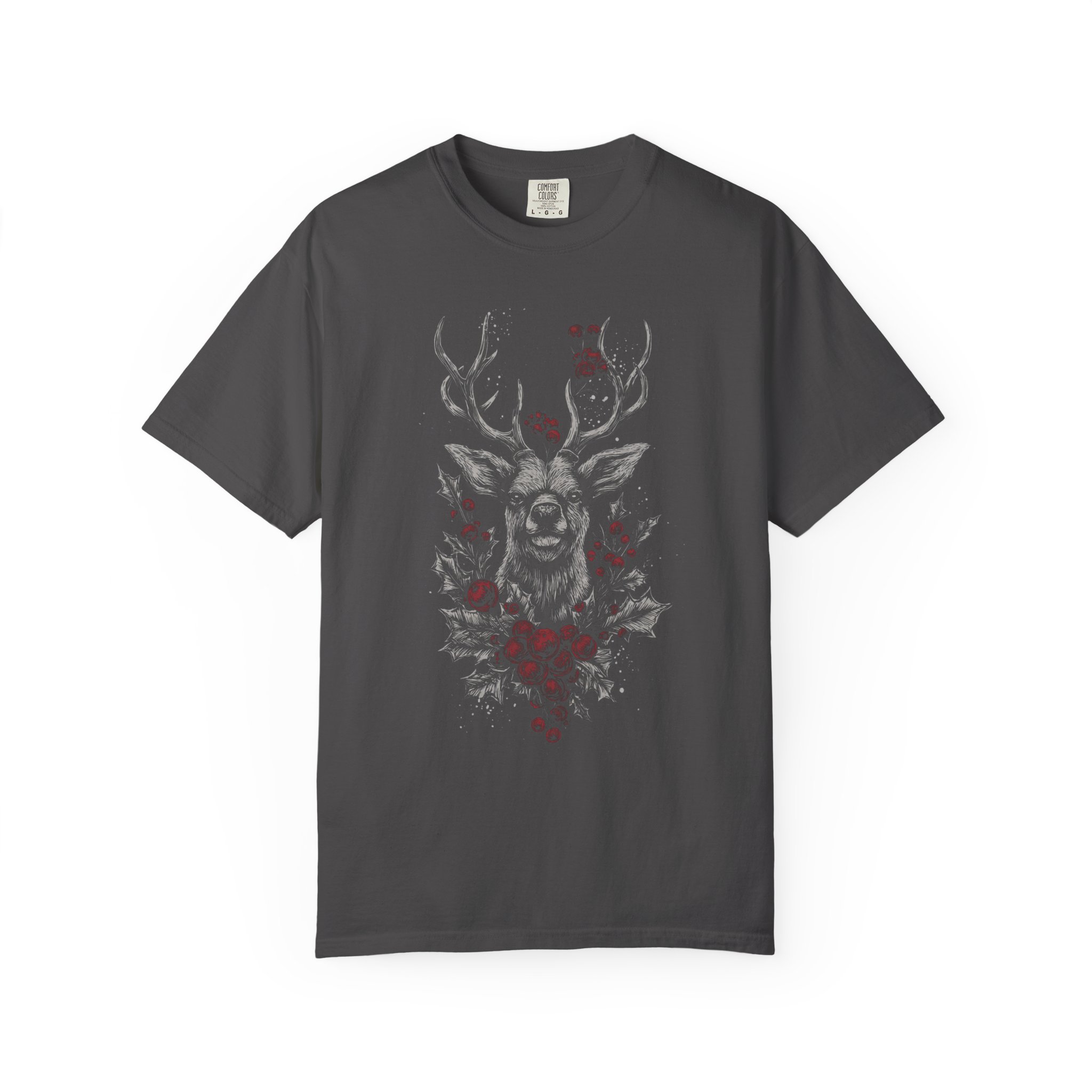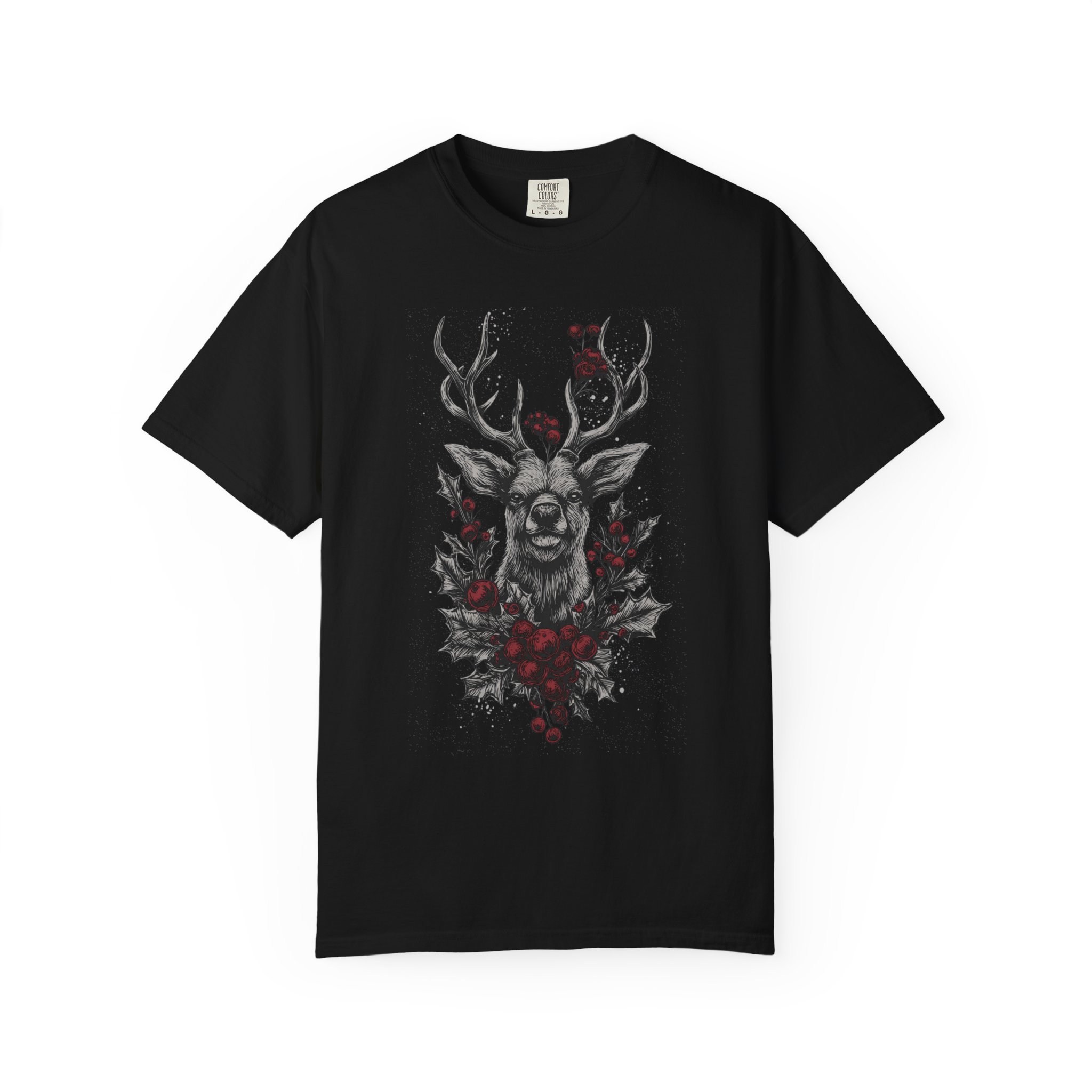A heavyweight, garment-dyed tee that brings a dark-forest mood to everyday wear. The design centers on a gothic winter stag framed with red floral accents — quiet, moody, and a little wild. The soft, washed-in color and substantial cotton body make this shirt feel lived-in from day one. Wear it on crisp walks through leaf-strewn lanes, at low-lit gigs, or layered under a coat for nights at the cabin. It reads like a winter poem: sturdy, slightly worn, and quietly ornate. For people who like their wardrobe to hint at story — a slow-burning aesthetic, forest walks, and music with reverb — this tee slips right into that rhythm.