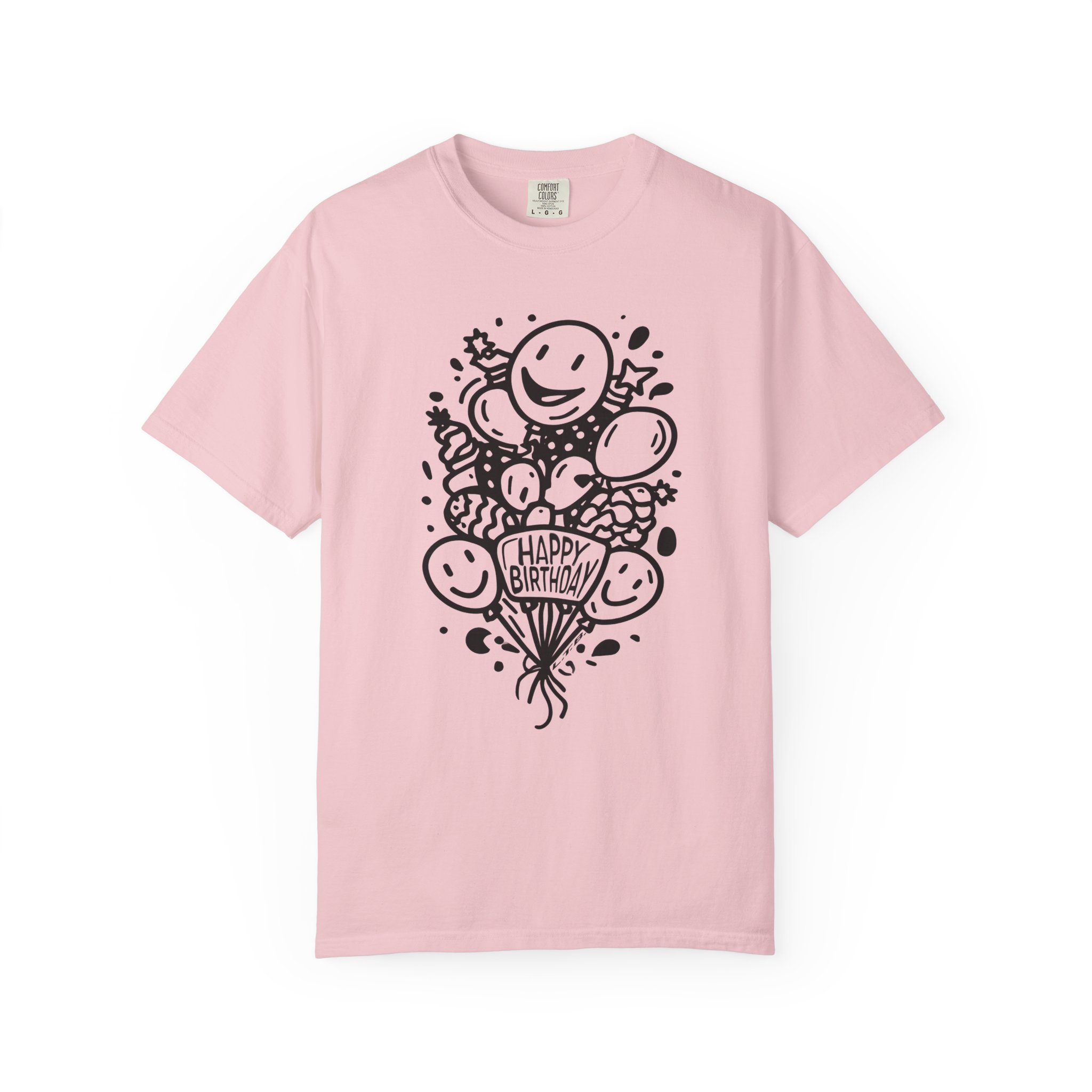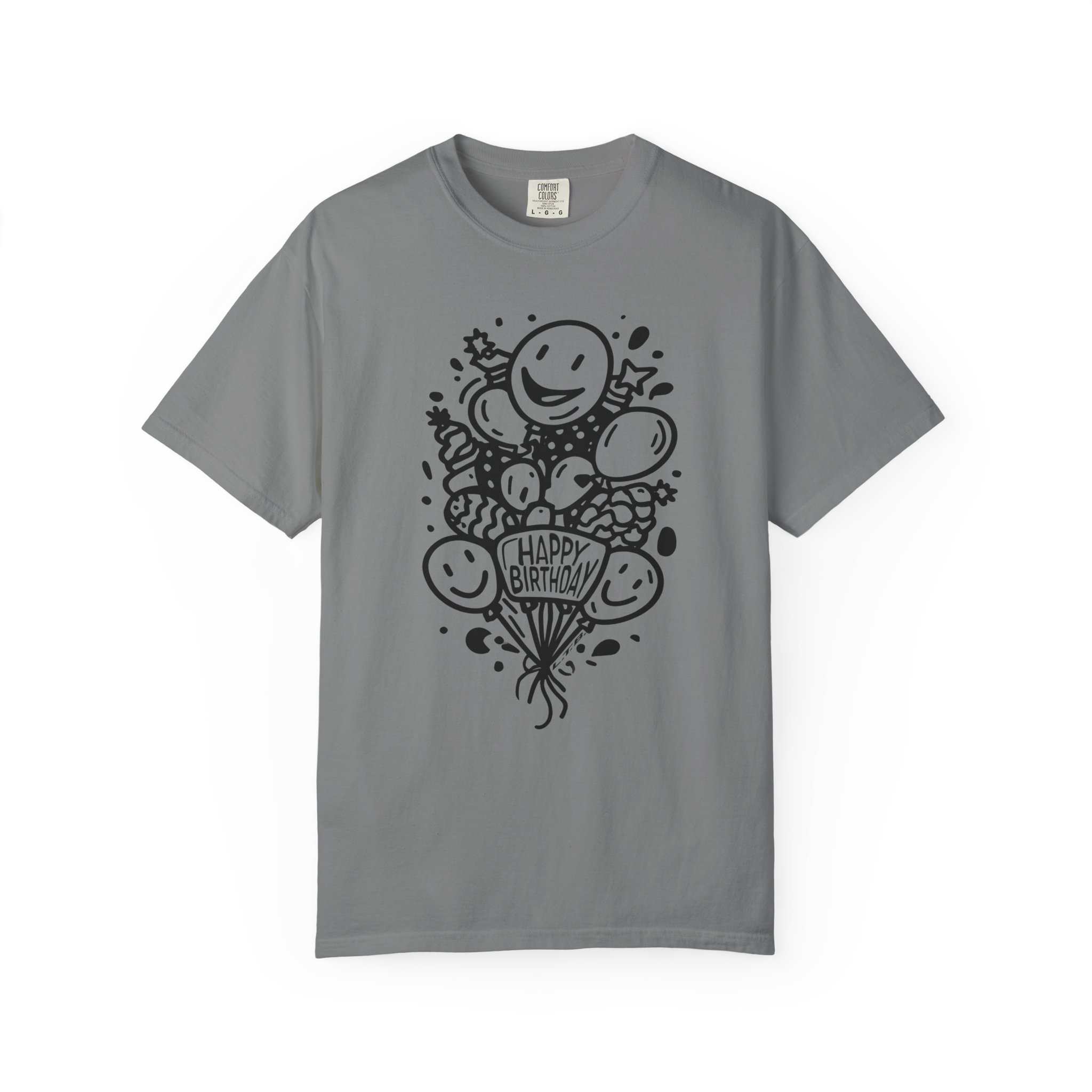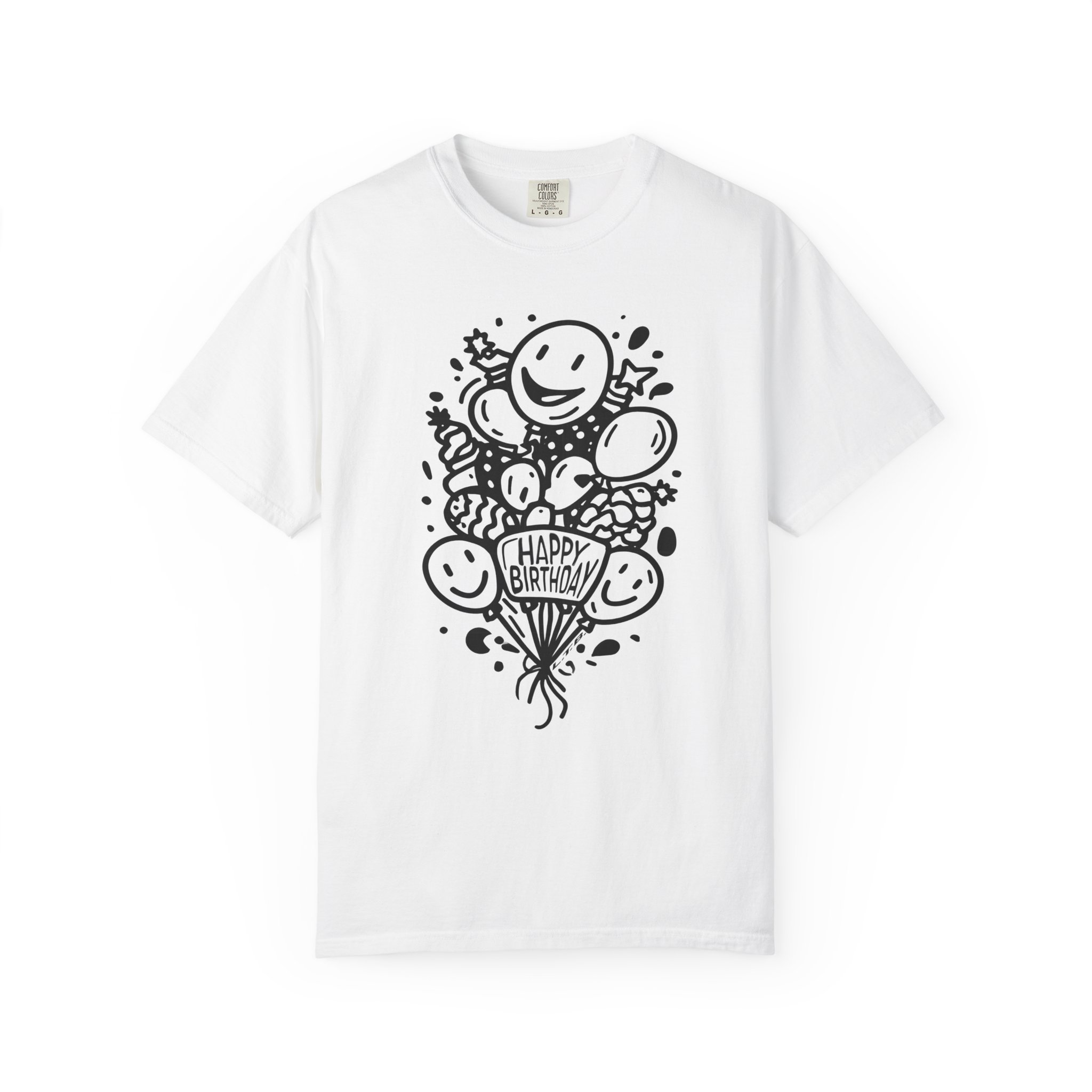 This playful Happy Birthday graphic tee features cheerful balloon illustrations and clean black line art design for a timeless, minimal party vibe. The hand-drawn style keeps it modern while staying fun and lighthearted — perfect for birthday celebrations, casual parties, or surprise gift moments.