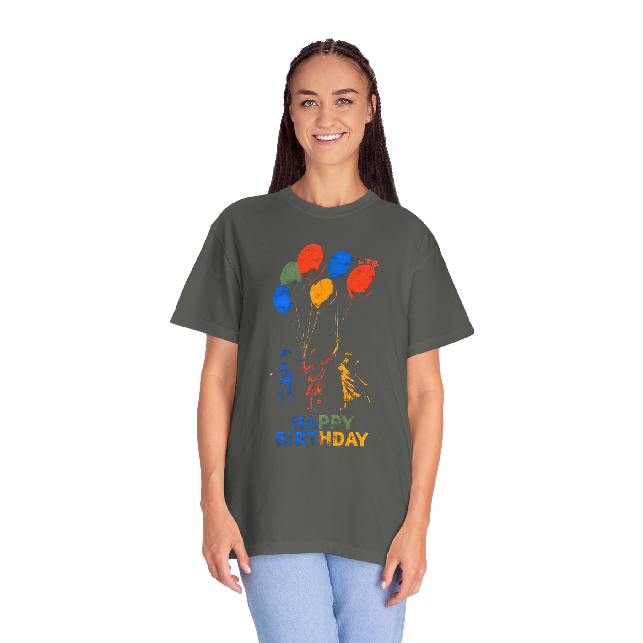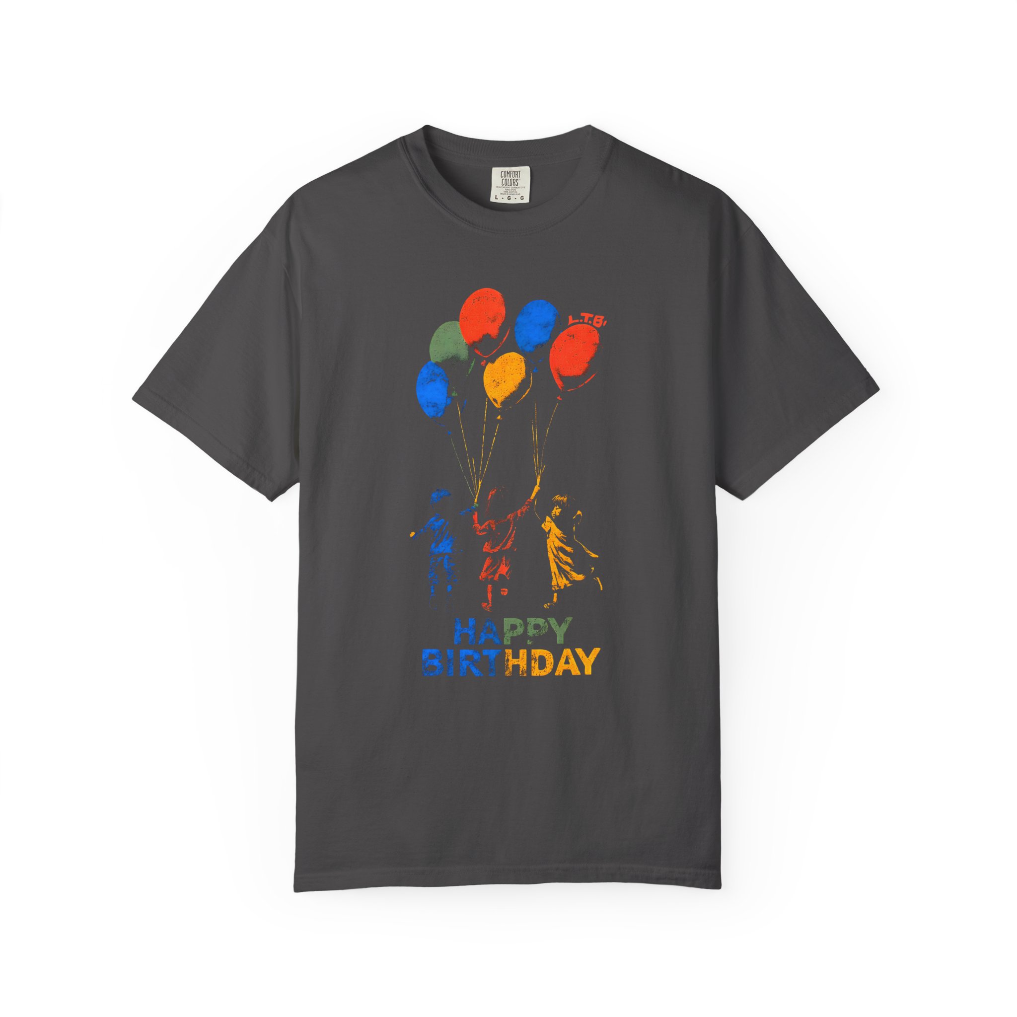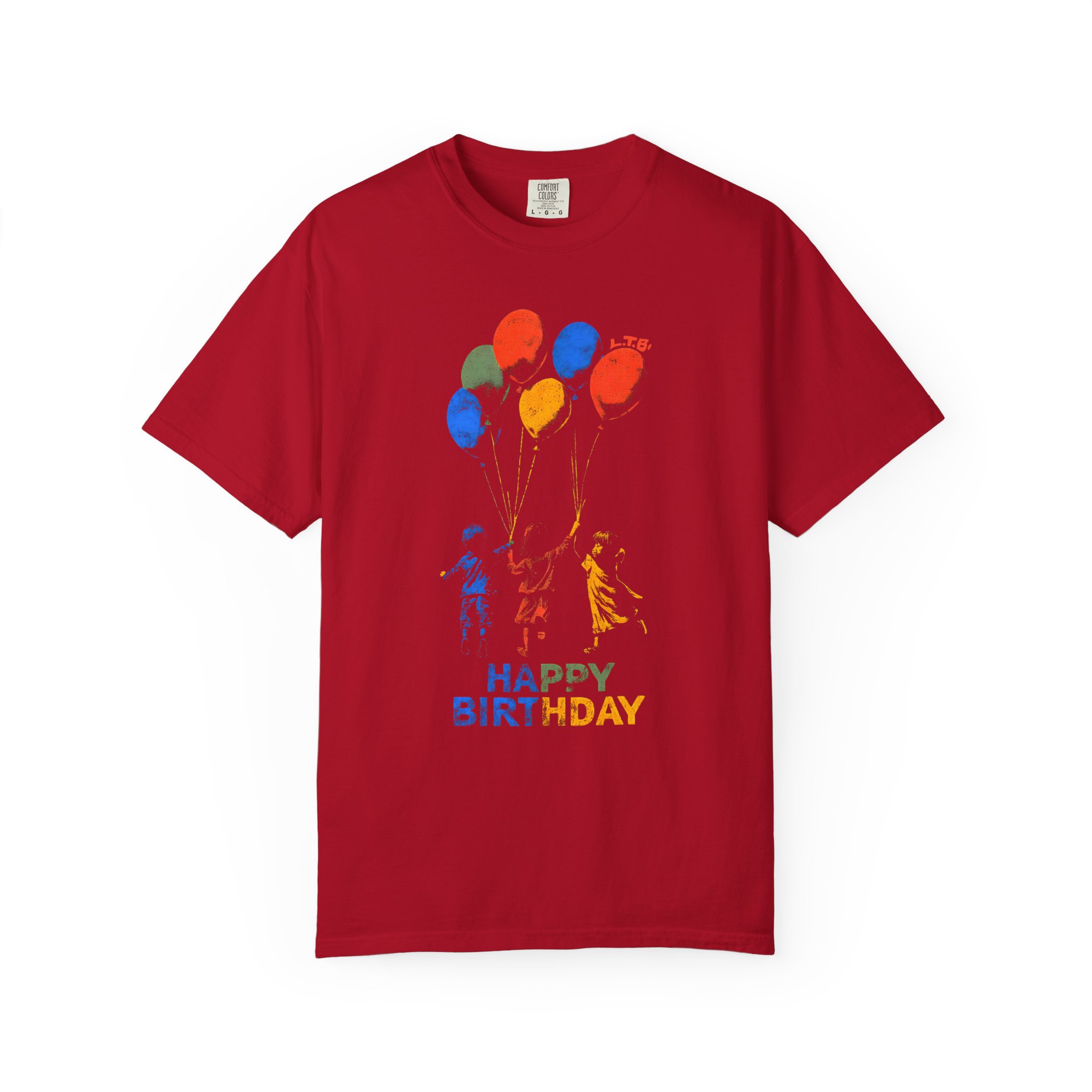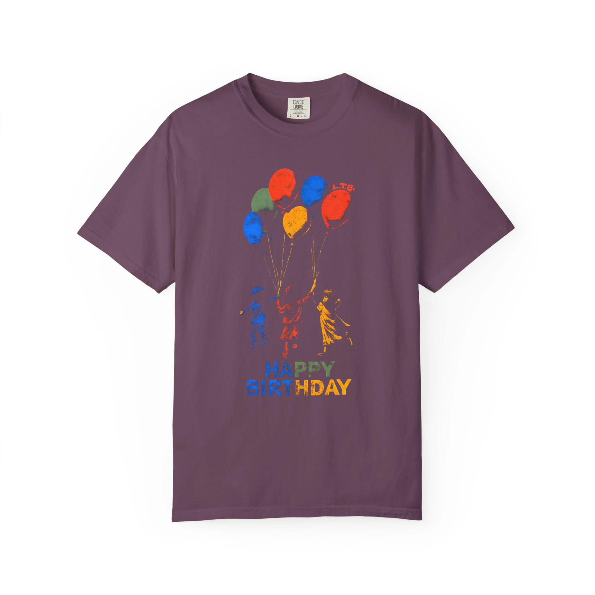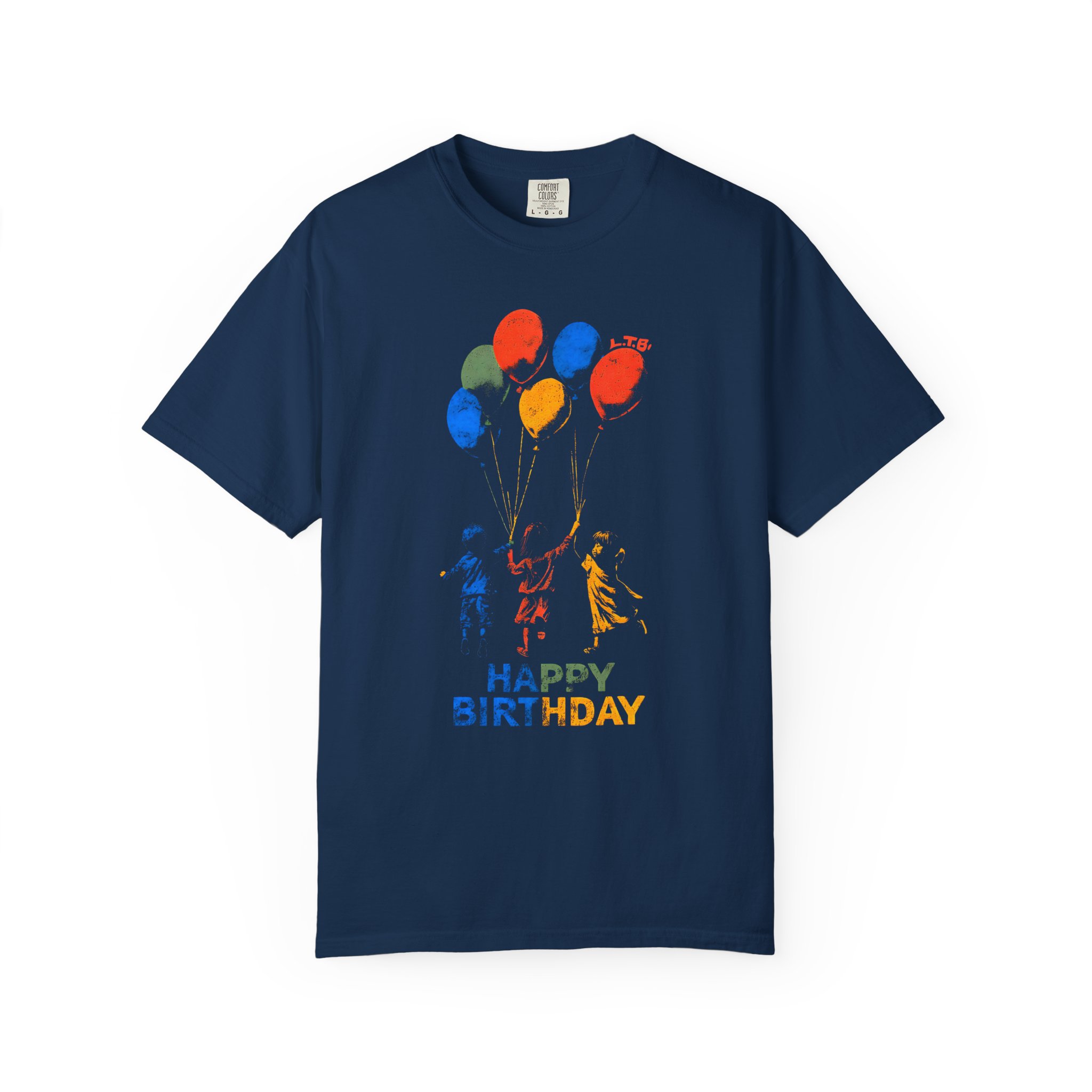 Celebrate with color, movement, and memory. This Happy Birthday T-shirt features vibrant balloons floating above playful child silhouettes, creating a nostalgic yet modern celebration design. The bold primary colors glow beautifully against the black background, giving the artwork a dramatic, gallery-inspired feel. It’s more than a party shirt — it captures the joy of childhood birthdays and carefree moments. Perfect for birthday celebrations, family gatherings, photo shoots, or meaningful gift ideas. Fun, artistic, and timeless — a birthday tee that stands out with heart and personality.