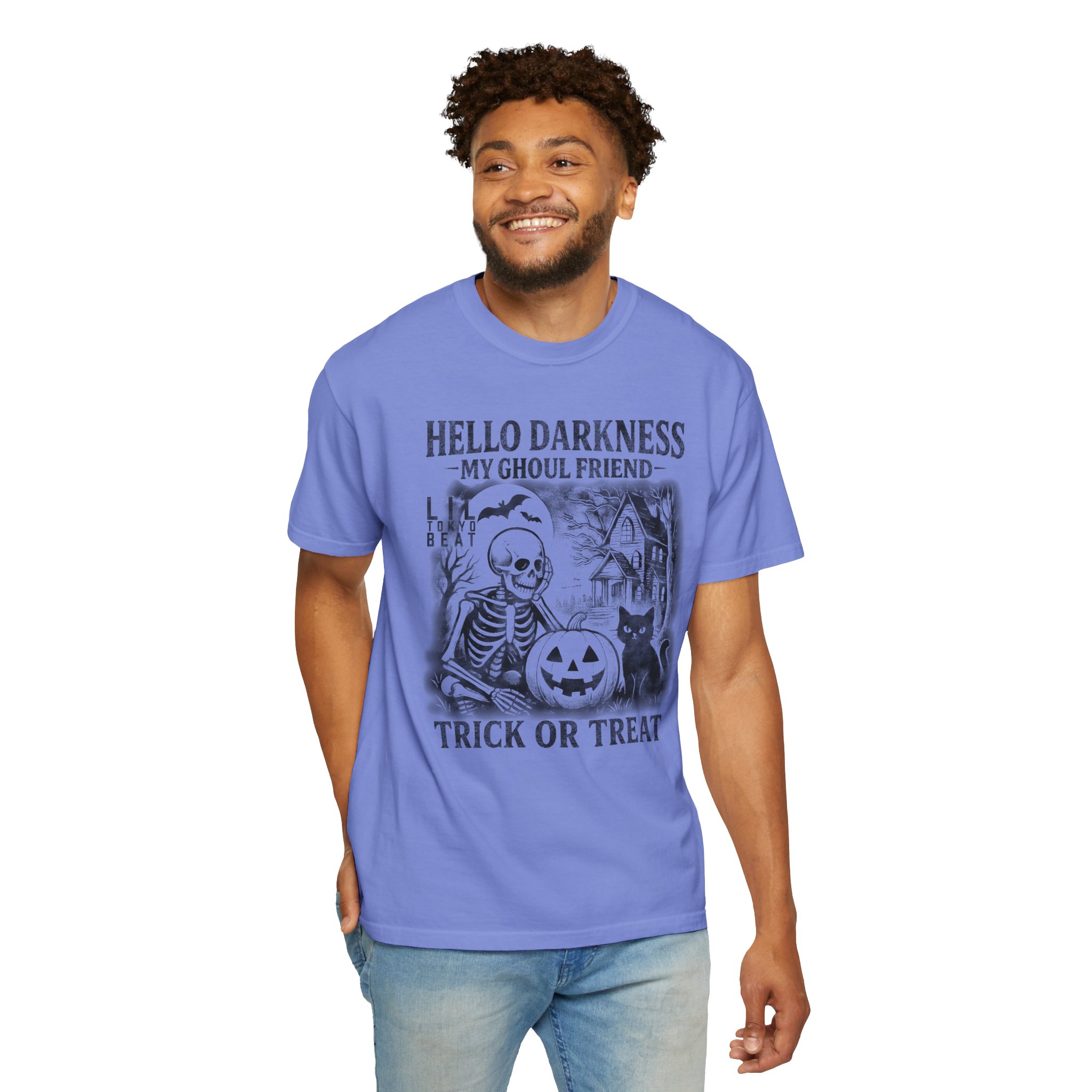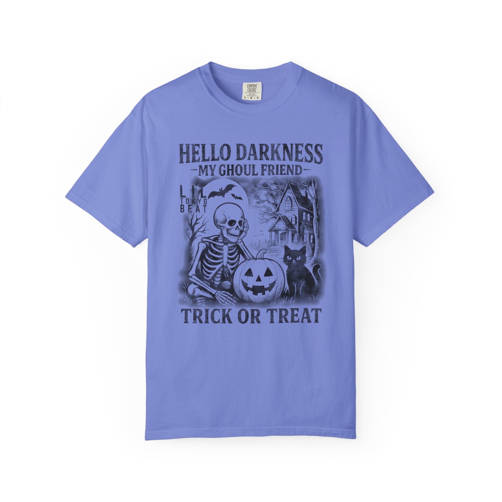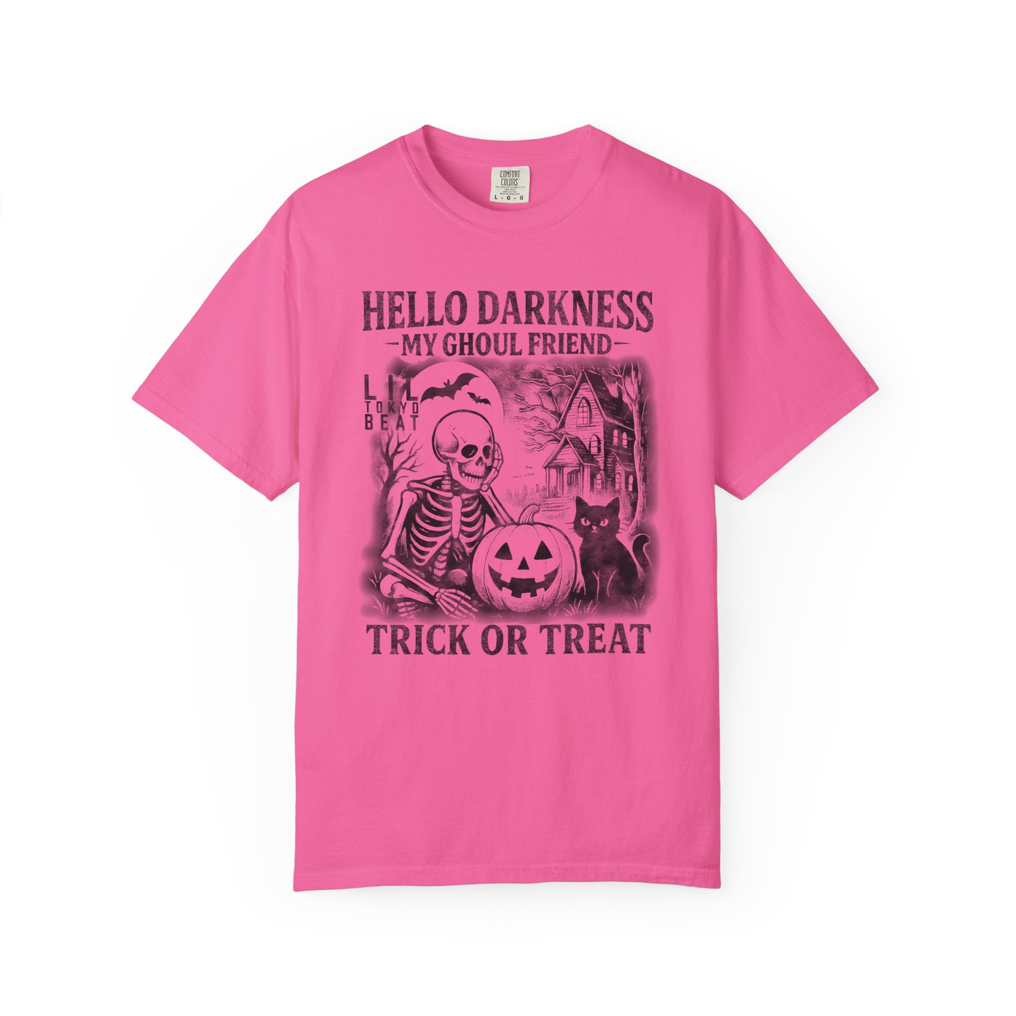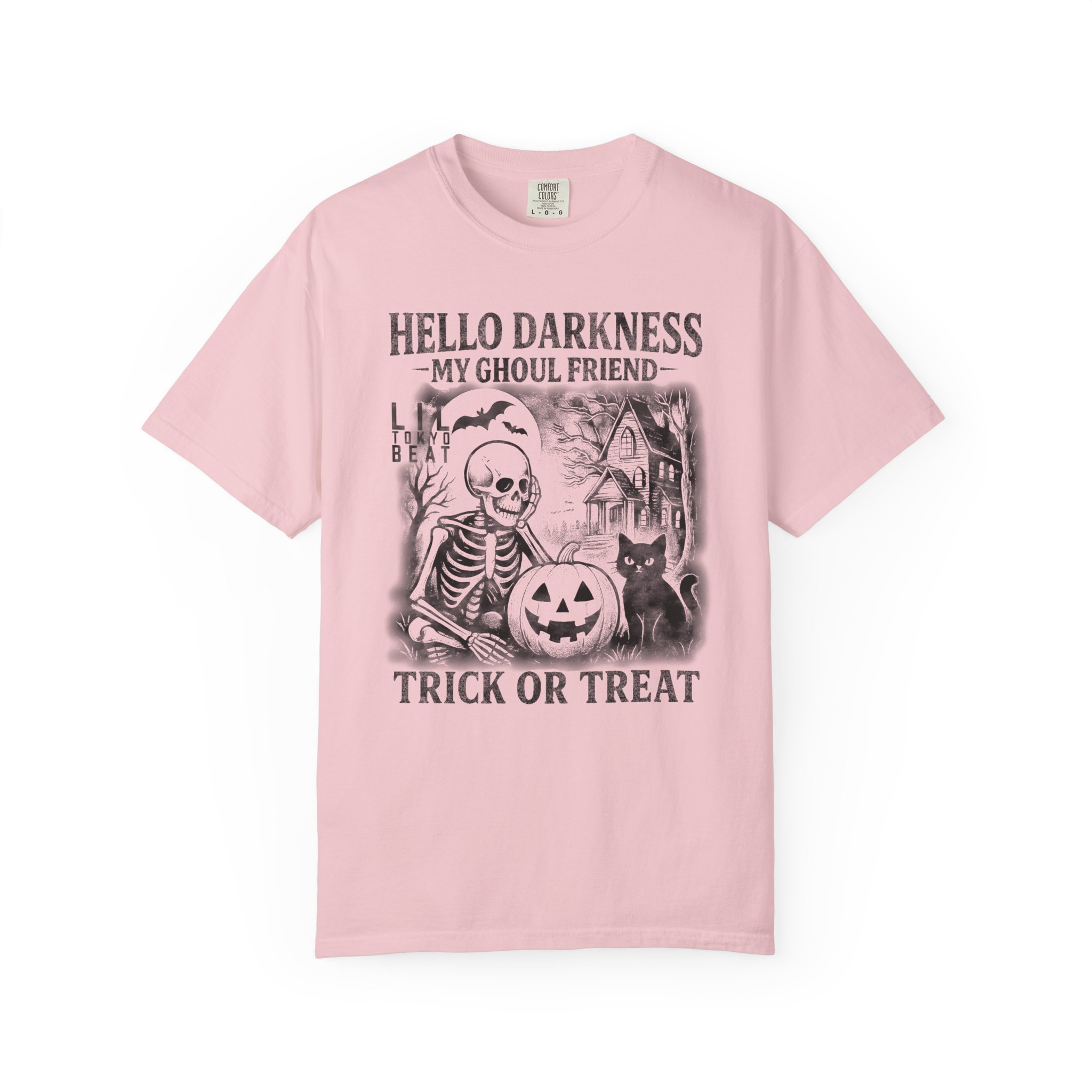 Get spooky and silly with our “Hello Darkness, My Ghoul Friend – Trick or Treat” Halloween T-shirt. Featuring a vintage-style illustration of a skeleton, jack-o’-lantern, black cat, haunted house, and full moon, this tee blends eerie charm with playful parody. Perfect for Halloween parties, trick-or-treating, or cozy nights in with your favorite horror flick. The distressed lettering and gothic vibe make it a standout piece for introverts, pun-lovers, and ghoul gang members alike. Soft, comfy, and available in multiple sizes and colors — this Lil Tokyo Beat original is your go-to for October chills and chuckles. Shop now on Etsy before it vanishes into the fog! Product features – Available in sizes S to 4XL for perfect fit – Double-needle stitching for durability – Garment-dyed fabric for soft color and texture – Made of 100% ring-spun US cotton for comfort – Comes in 58 colors to choose from Care instructions – Machine wash: cold (max 30C or 90F) – Do not bleach – Tumble dry: low heat – Iron, steam or dry: low heat – Do not dryclean