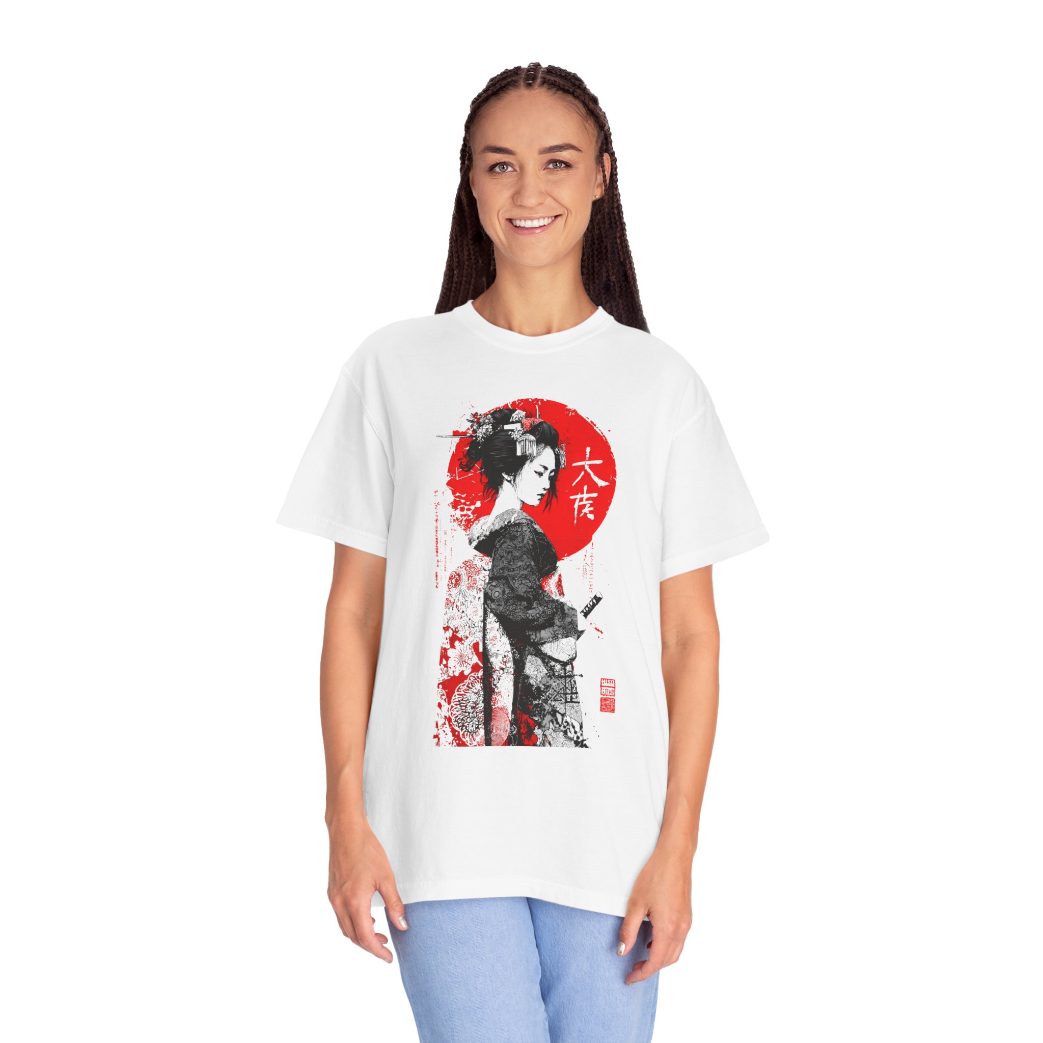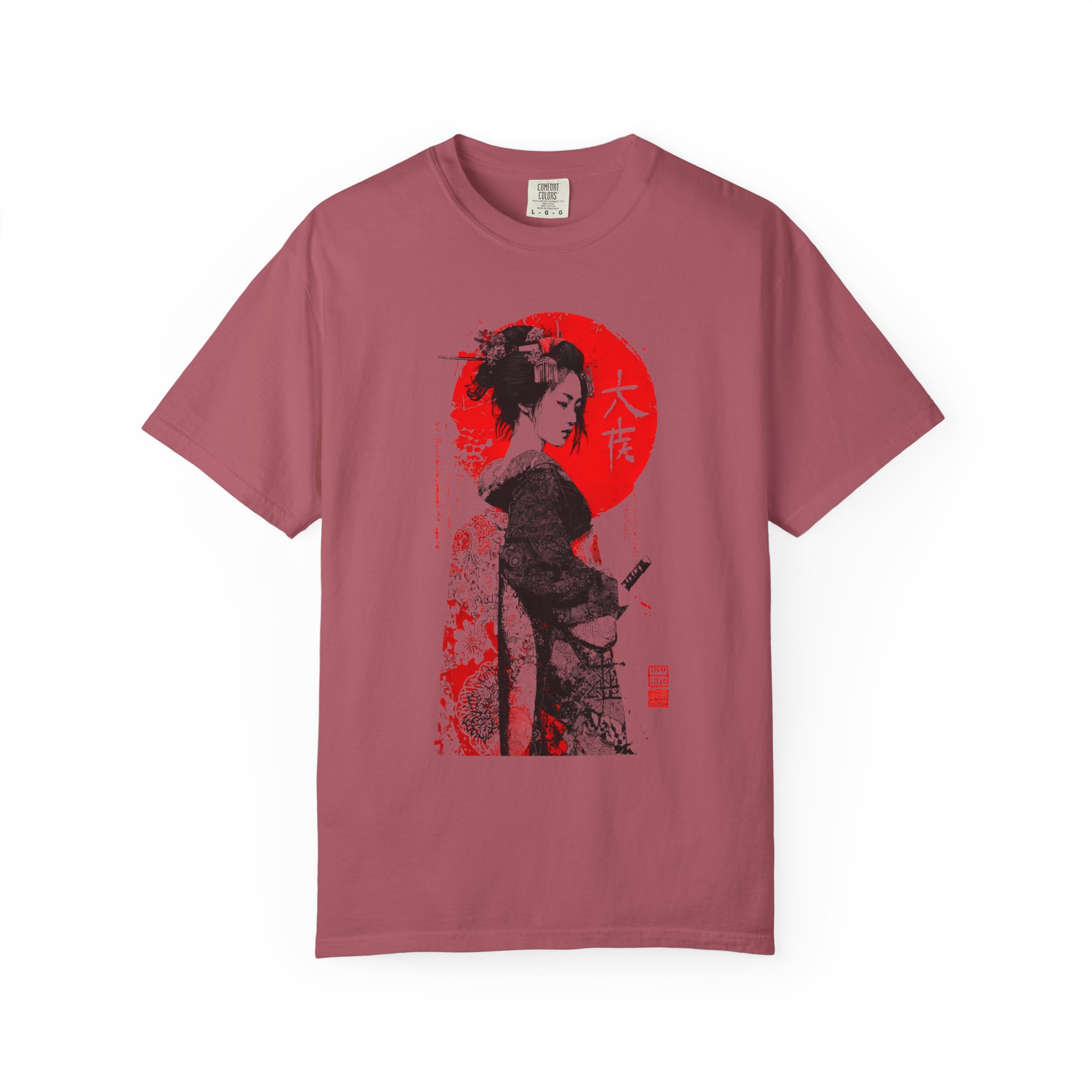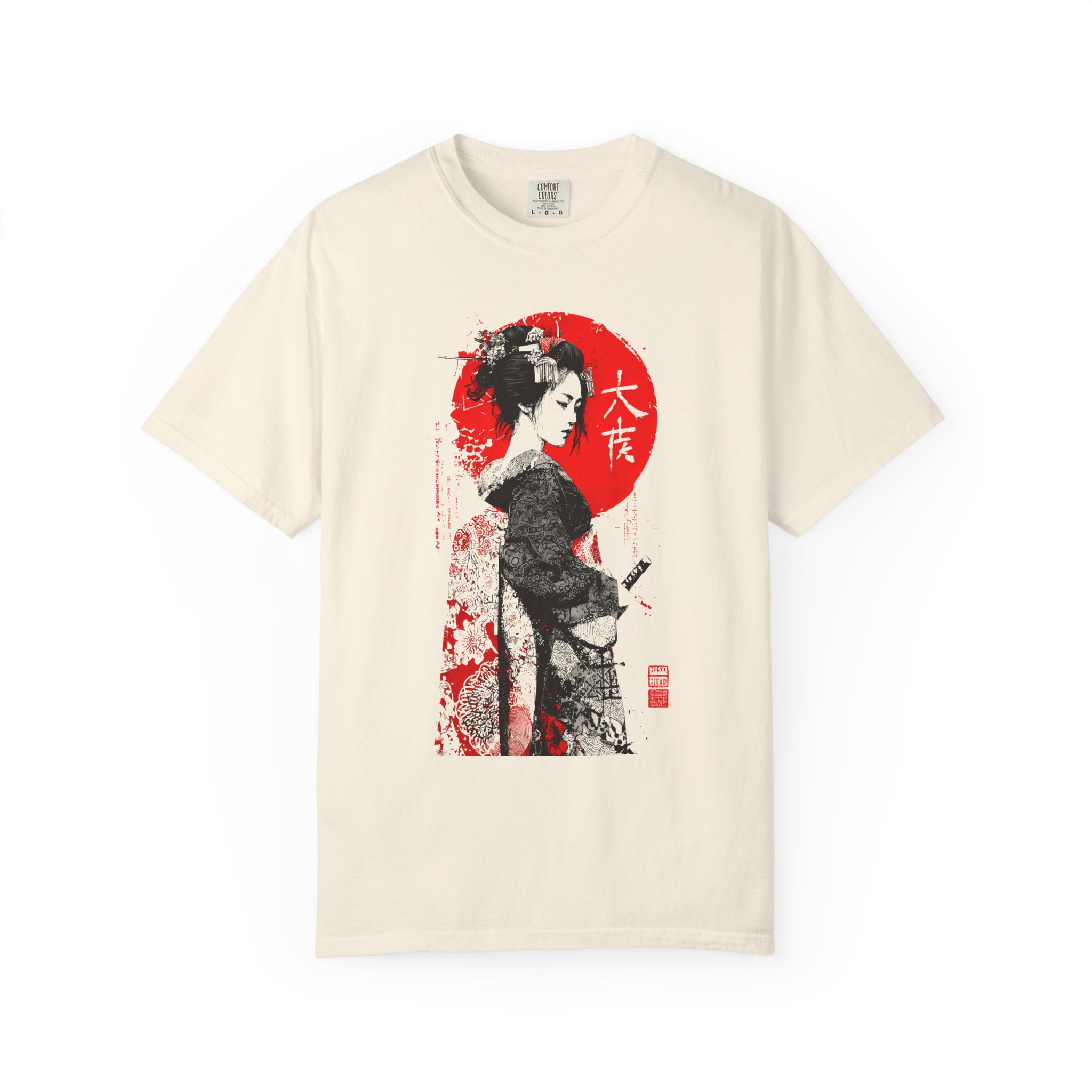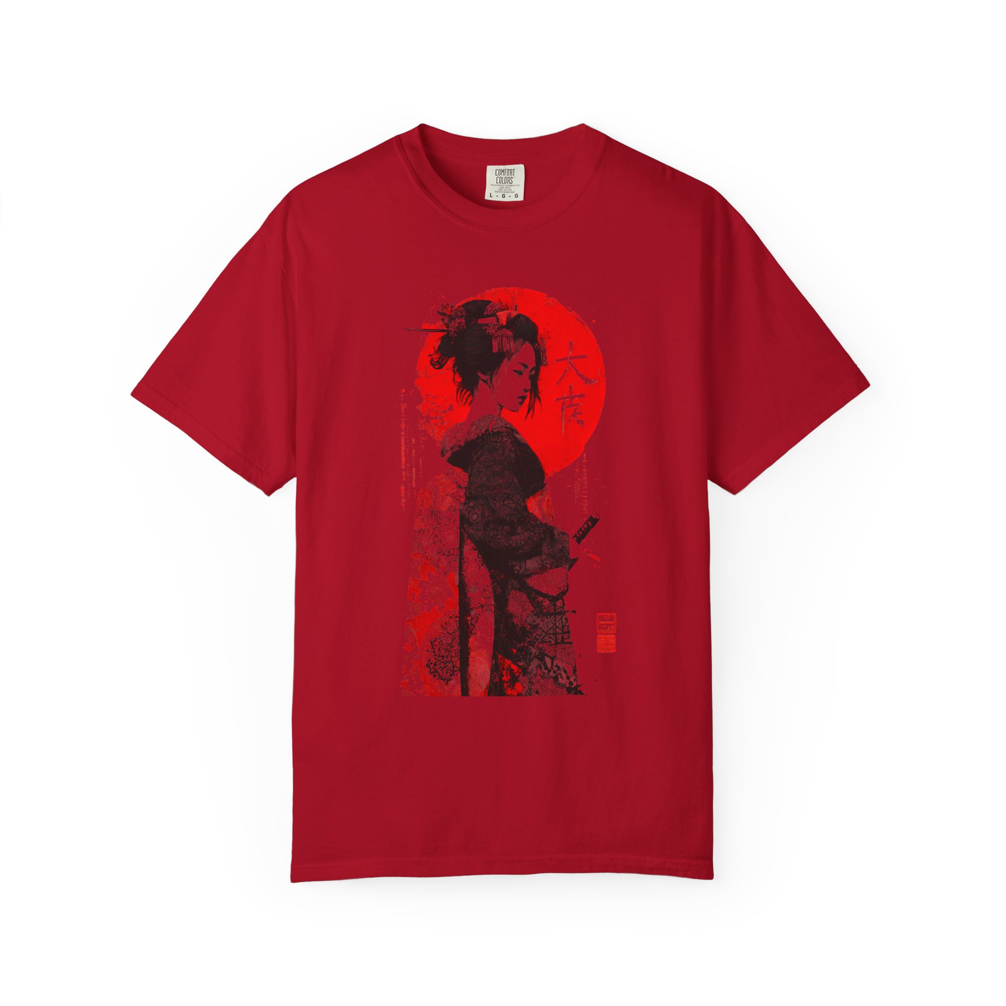 This relaxed-fit garment-dyed tee brings a quiet, cinematic moment to everyday wear. This ink-style Japanese-inspired portrait T-shirt features bold black linework contrasted against a striking red sun backdrop. The minimalist composition draws from traditional ink illustration aesthetics while maintaining a modern, expressive edge. Subtle texture details and balanced negative space give the artwork depth and quiet intensity without referencing any specific era or identity. Designed for lovers of monochrome art, Japanese visual culture, and contemporary streetwear, this piece functions as wearable art with timeless appeal. The heavyweight ring-spun cotton and garment-dye process create a lived-in softness that settles naturally into your wardrobe—comfortable for long days of wandering city streets or evenings at a low-lit gallery. It pairs with worn denim, layered under a jacket, or worn alone to let the artwork speak. The shirt feels thoughtful and understated, for someone who appreciates craft, subtle storytelling, and clothes that get better with time.