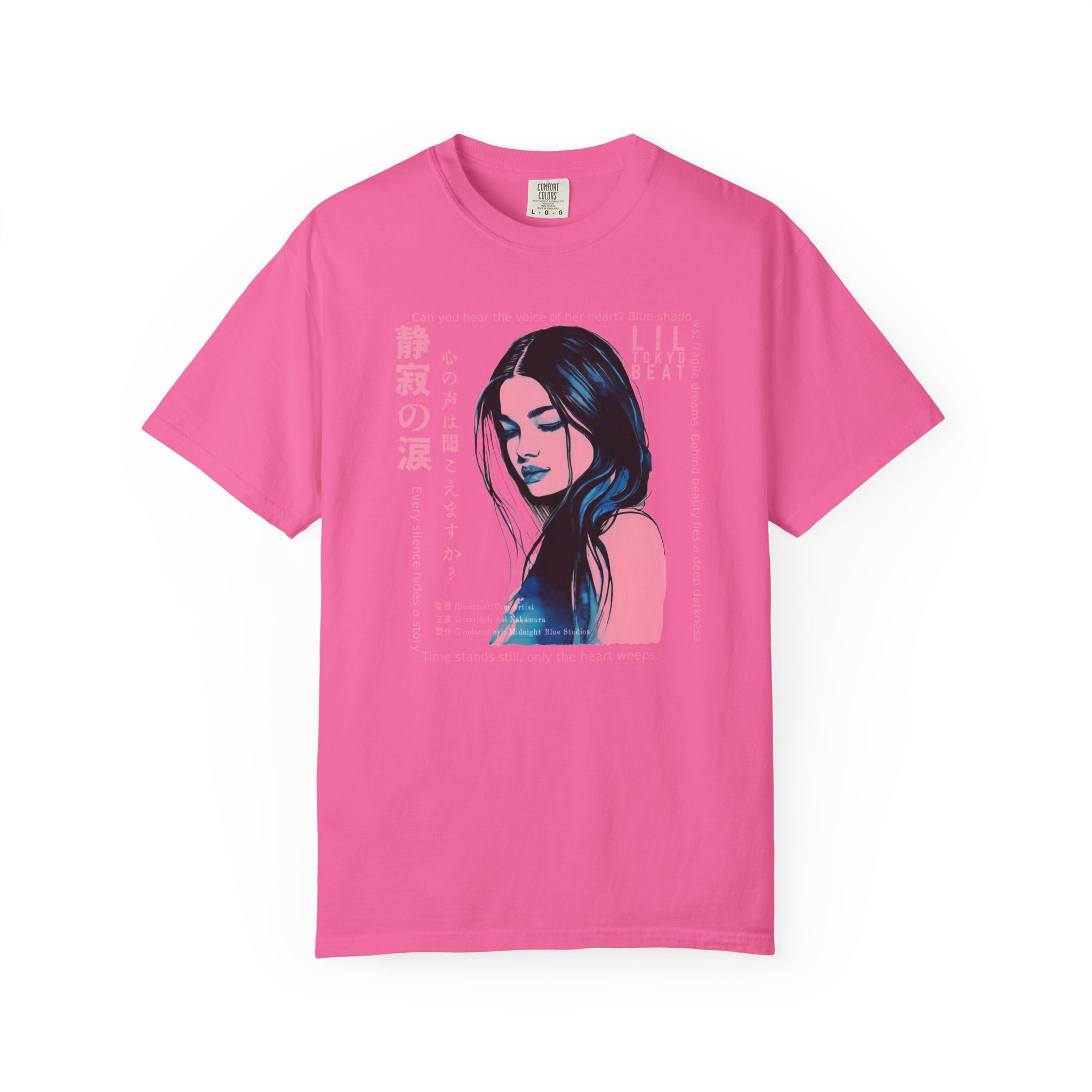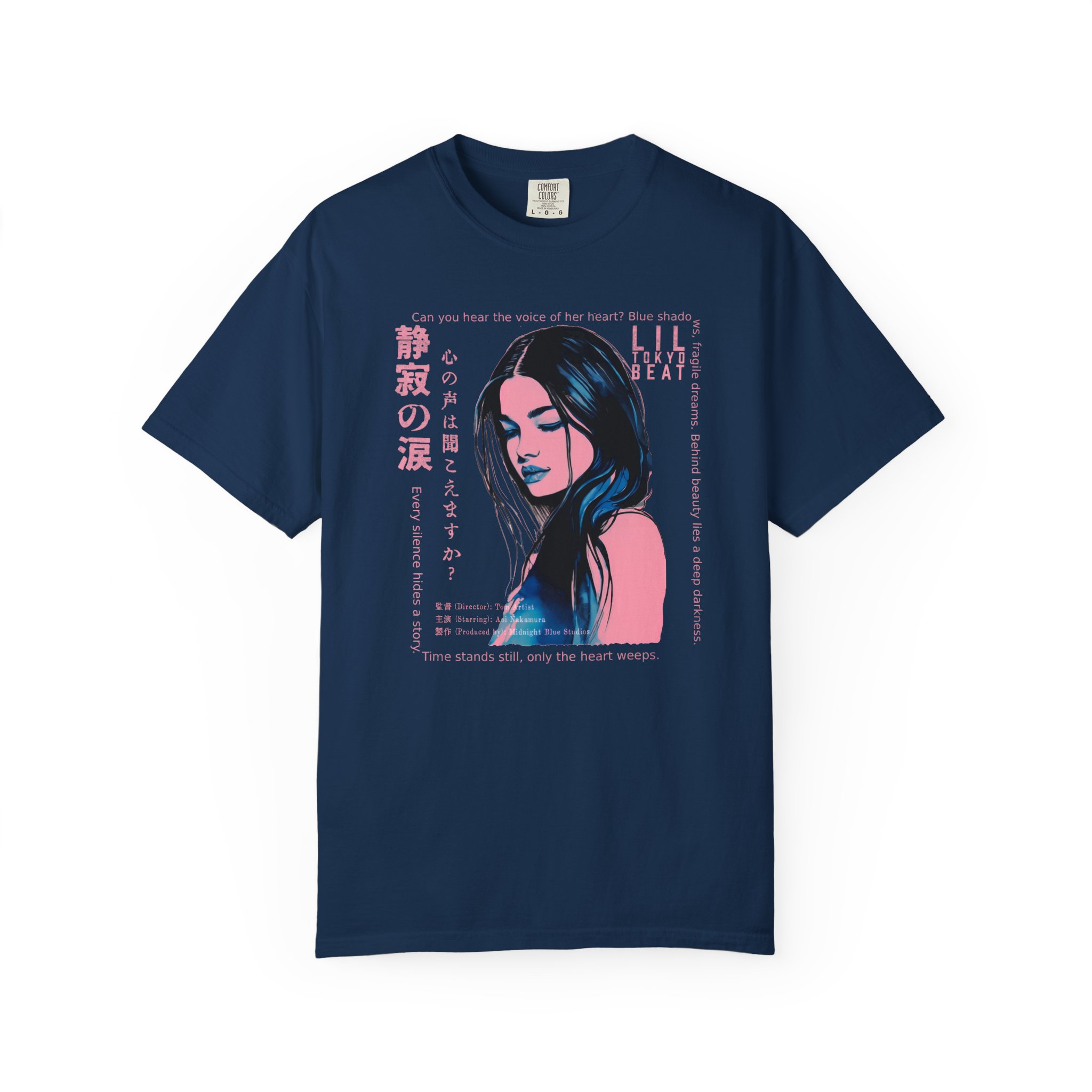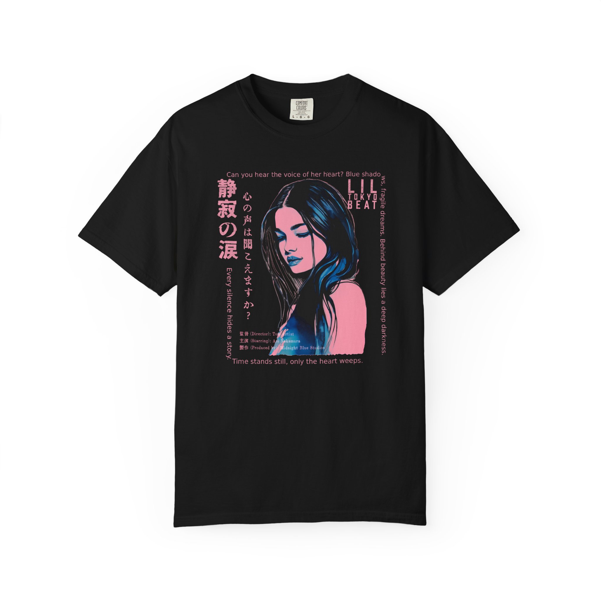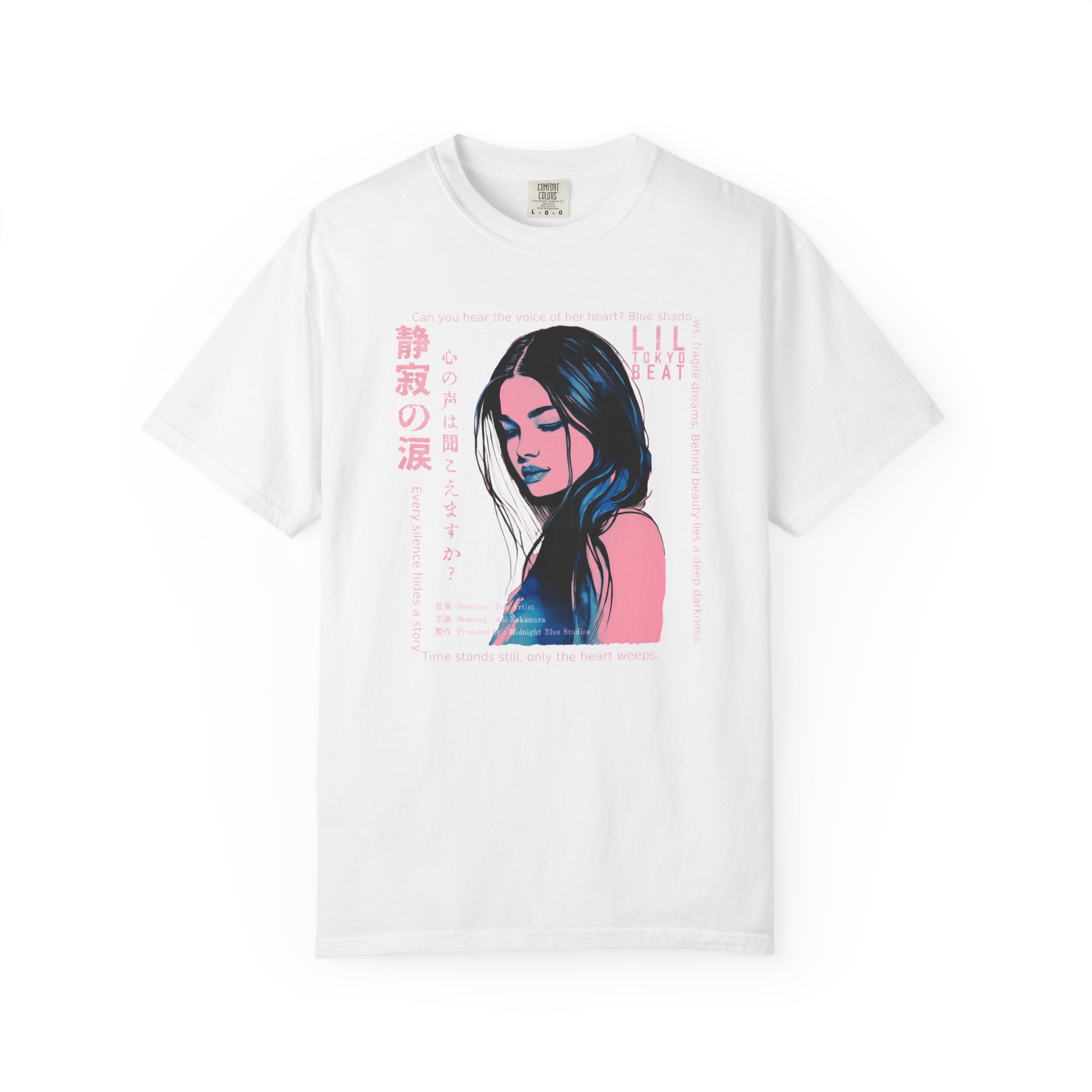 Step into a world of emotion, mystery, and cinematic storytelling with this atmospheric graphic T-shirt from Lil Tokyo Beat. The design features a stylized portrait rendered in deep blue and pink tones, surrounded by expressive English and Japanese elements that evoke themes of inner voice, quiet strength, and untold stories. With its film‑poster aesthetic and moody visual language, this tee is perfect for art lovers, J‑fashion fans, creatives, and anyone drawn to introspective, story‑driven design. Whether worn for nighttime outings, creative sessions, or everyday streetwear, this shirt captures the feeling of a paused moment—where emotion speaks louder than words. Created under the Lil Tokyo Beat philosophy—Kool. Artful. Timeless.—this design continues the brand vision as A New Voice in Tee Culture.