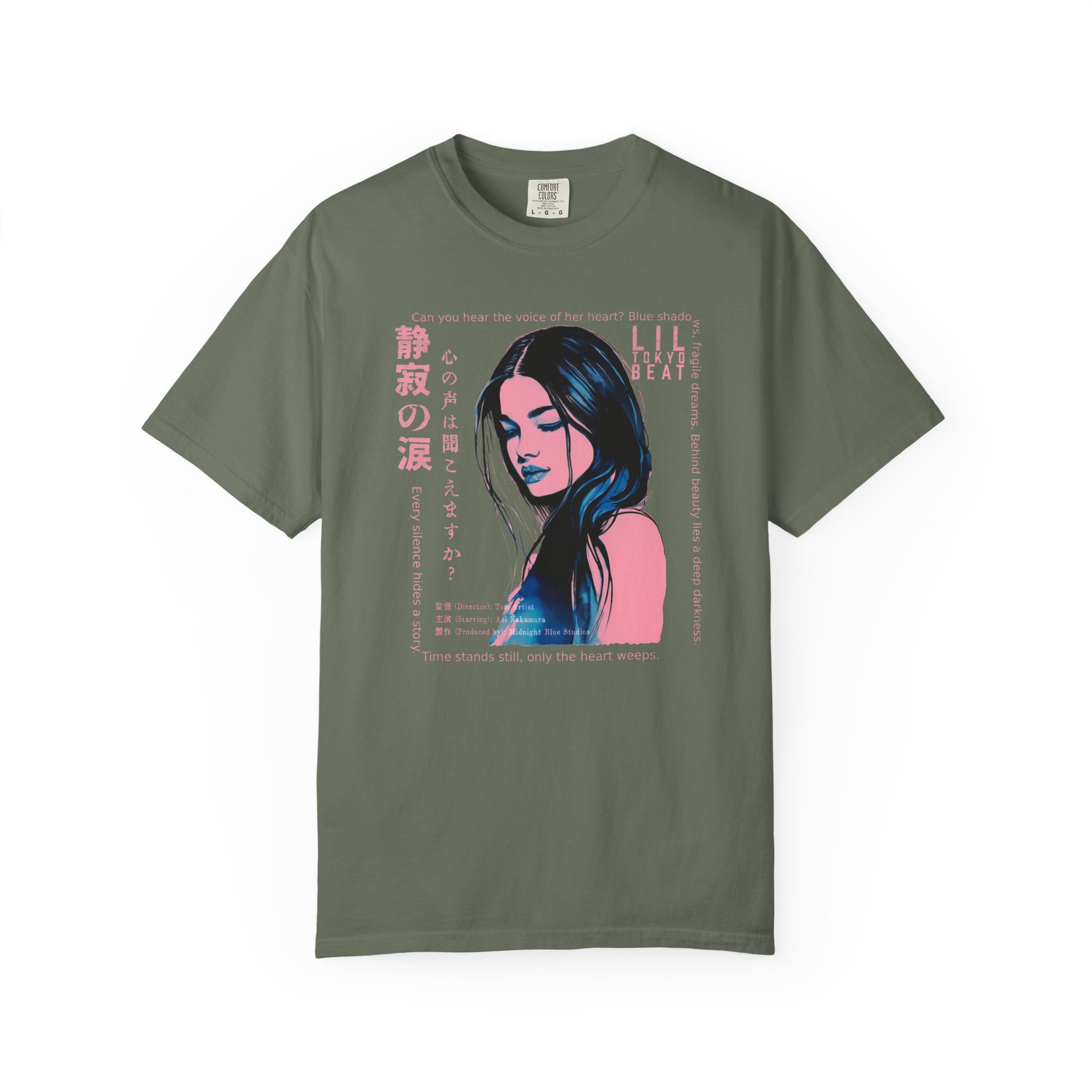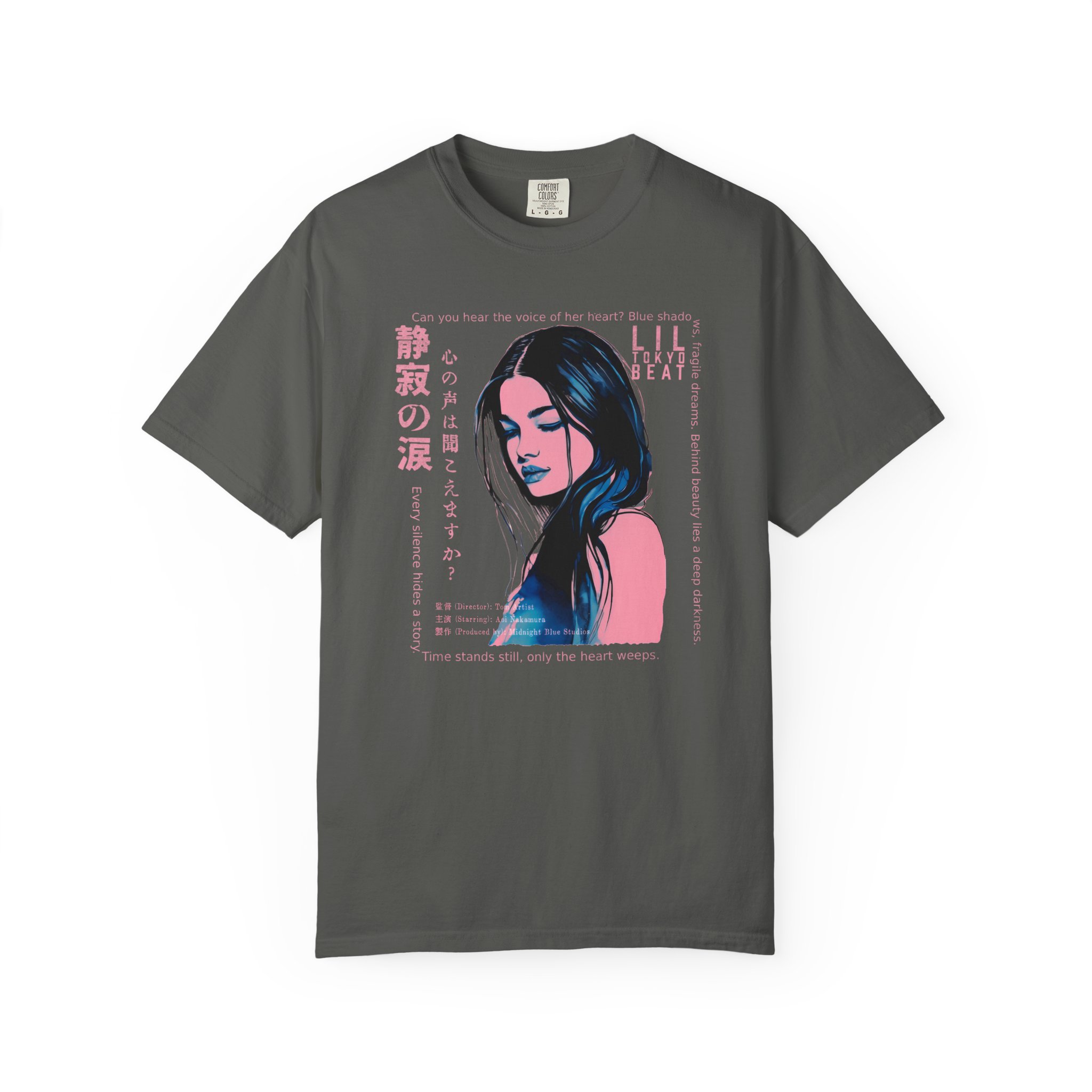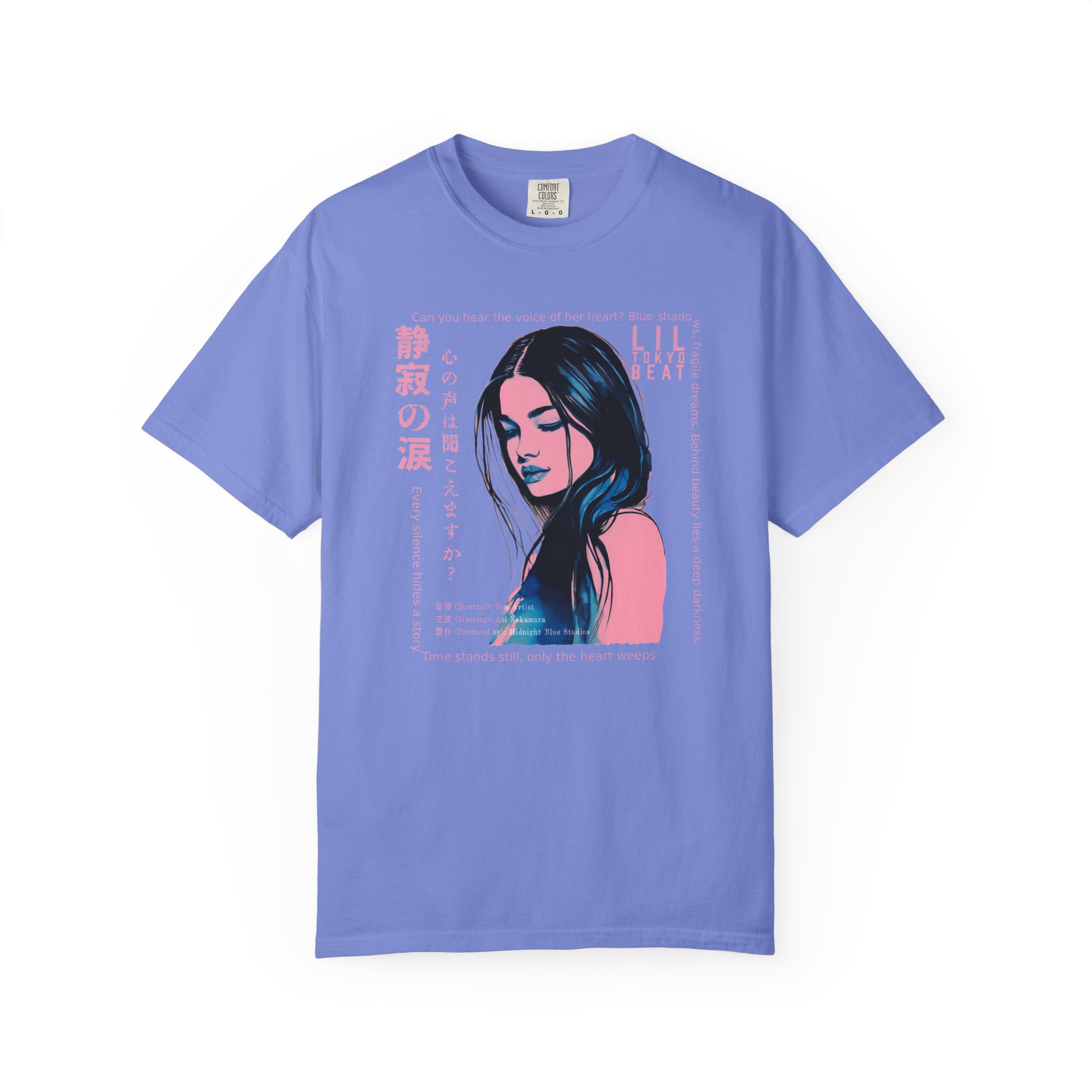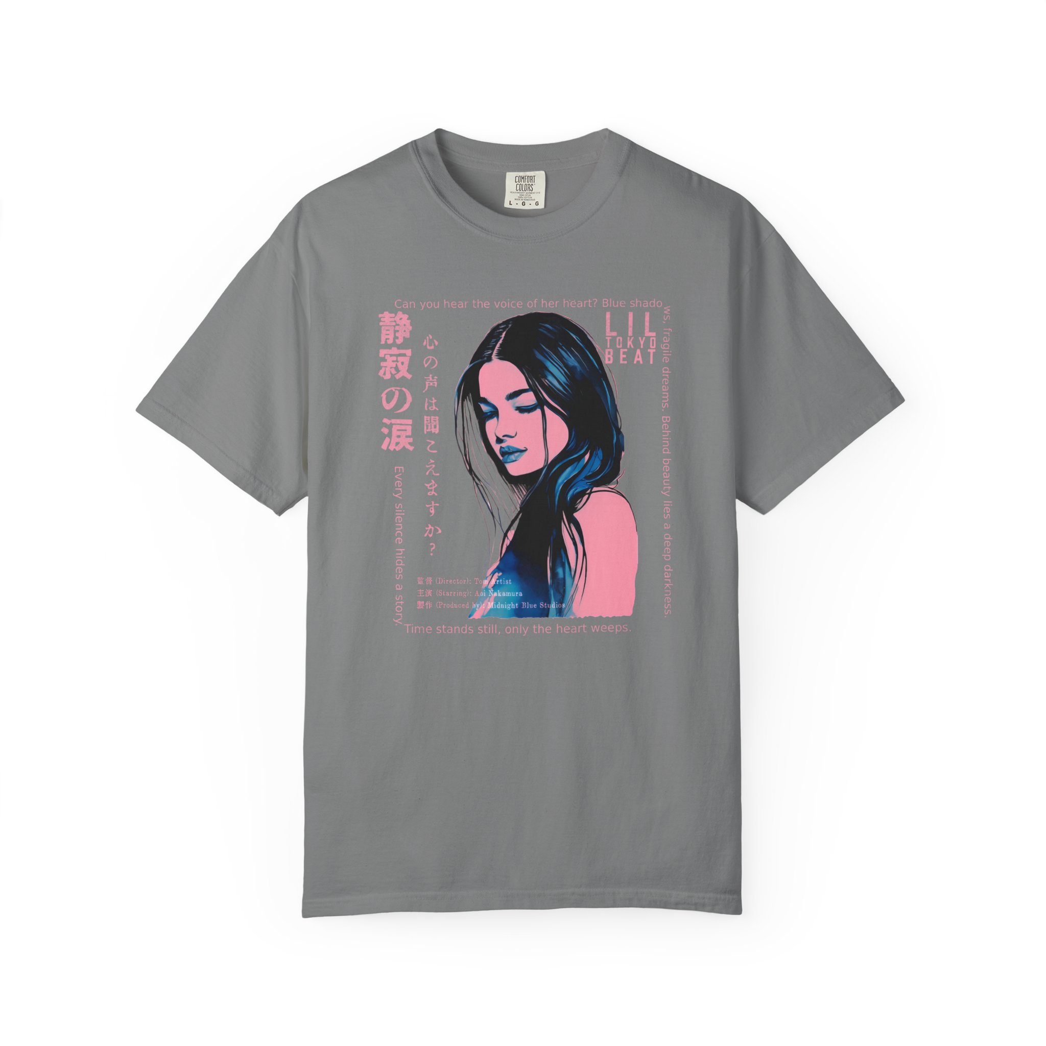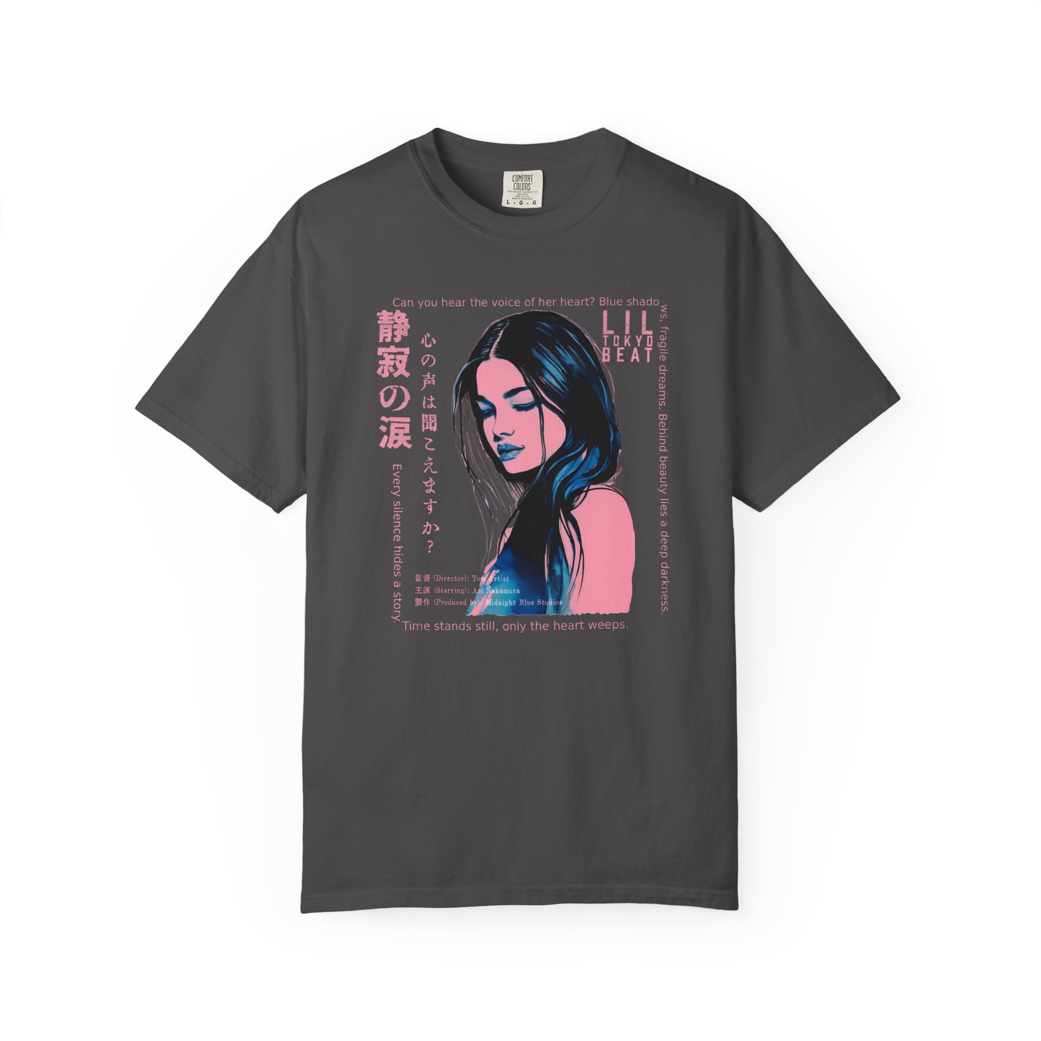 Step into a world of emotion, mystery, and cinematic storytelling with this atmospheric graphic T-shirt from Lil Tokyo Beat. The design features a stylized portrait rendered in deep blue and pink tones, surrounded by expressive English and Japanese elements that evoke themes of inner voice, quiet strength, and untold stories. With its film‑poster aesthetic and moody visual language, this tee is perfect for art lovers, J‑fashion fans, creatives, and anyone drawn to introspective, story‑driven design. Whether worn for nighttime outings, creative sessions, or everyday streetwear, this shirt captures the feeling of a paused moment—where emotion speaks louder than words. Created under the Lil Tokyo Beat philosophy—Kool. Artful. Timeless.—this design continues the brand vision as A New Voice in Tee Culture.