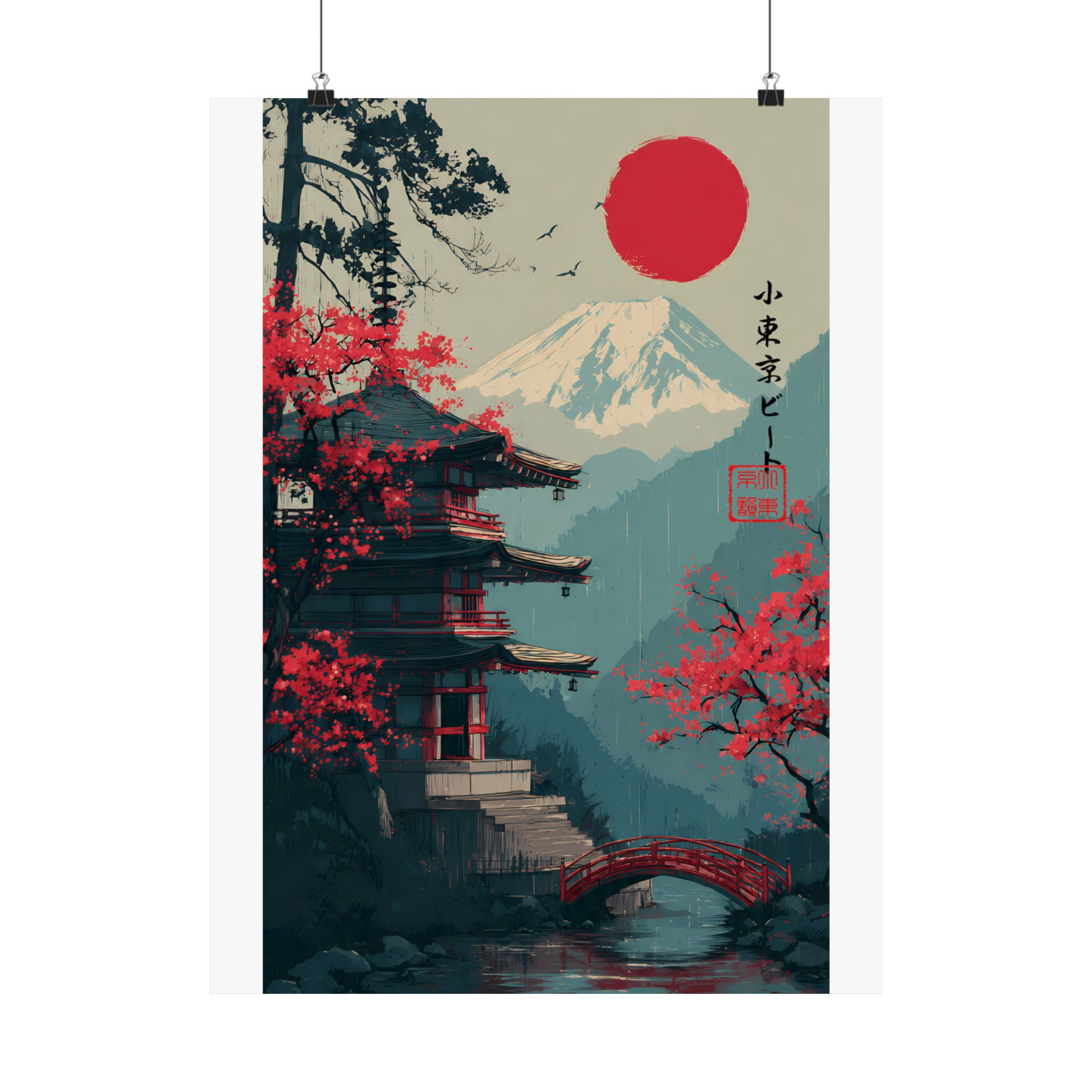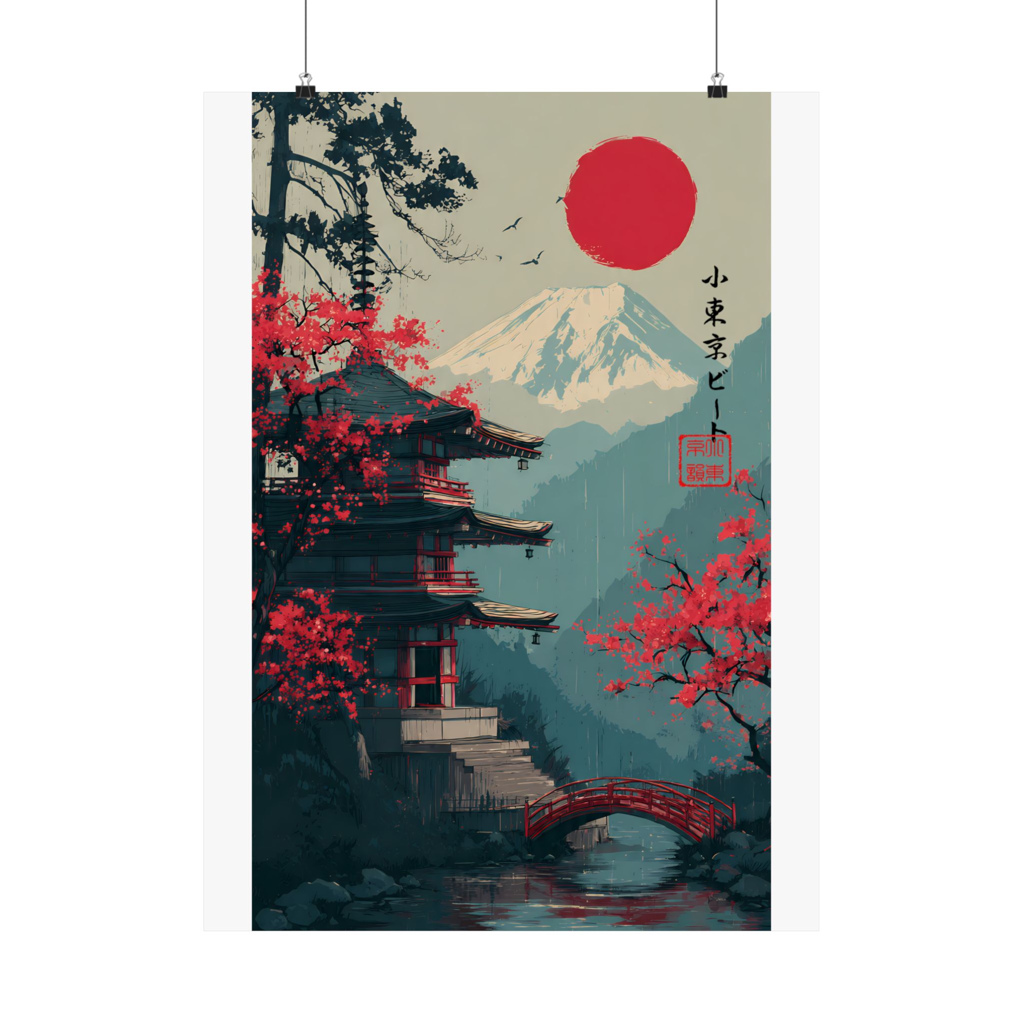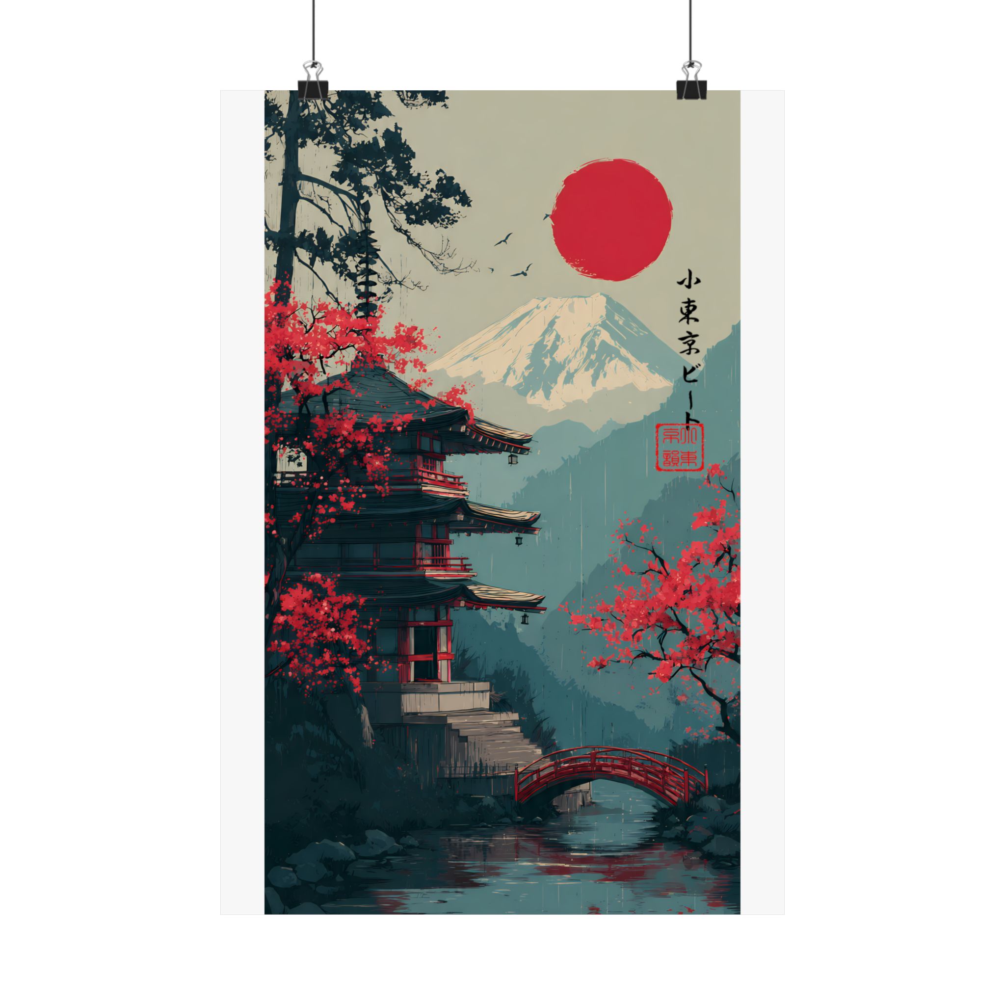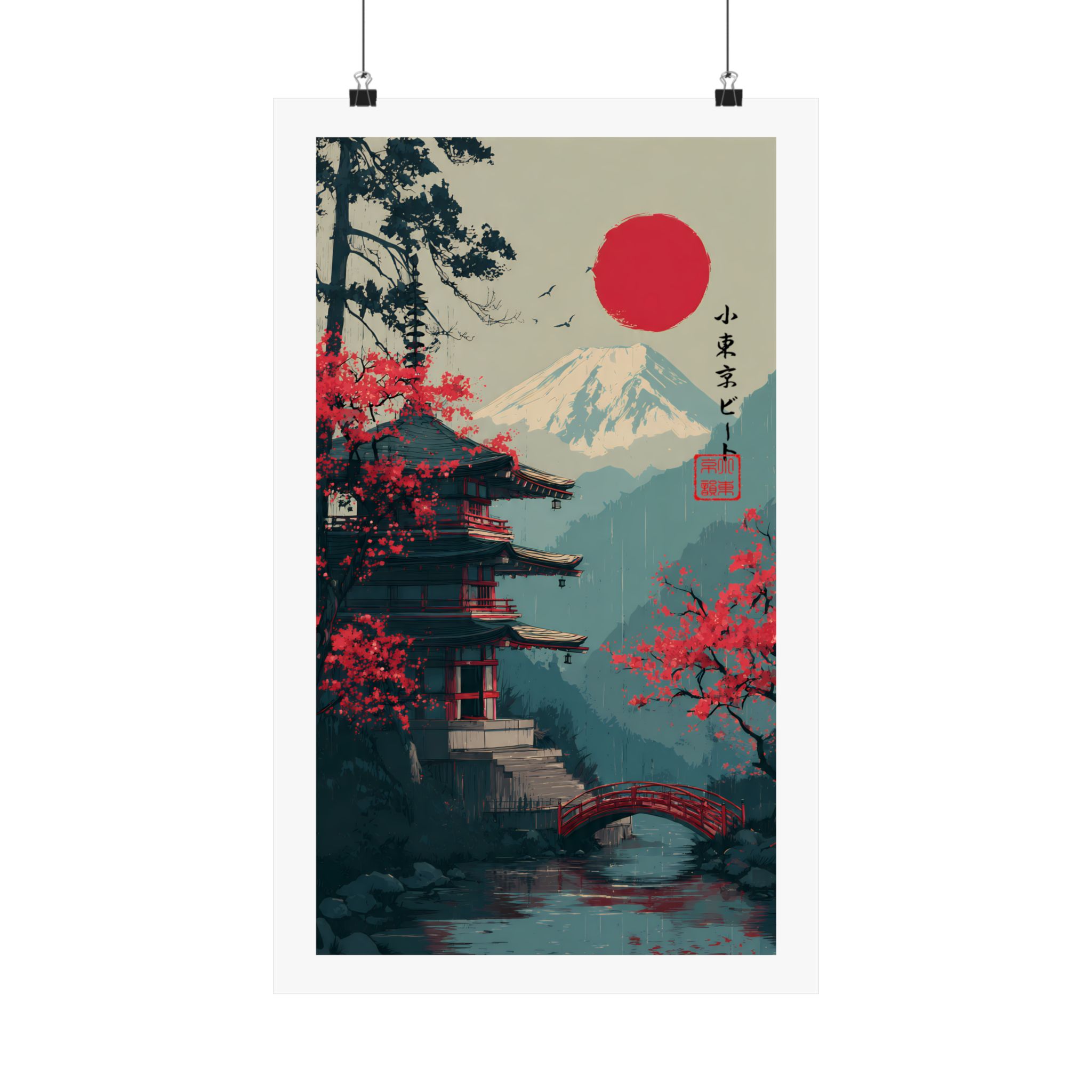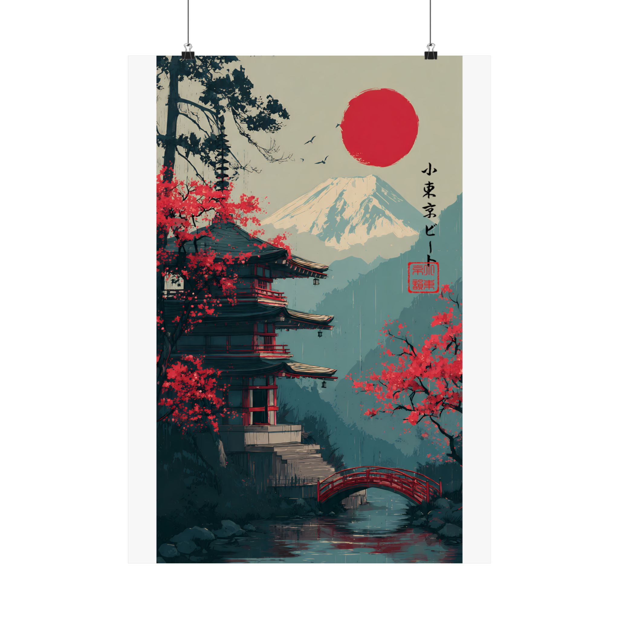 This Japanese-inspired wall art poster features a traditional pagoda overlooking a reflective river beneath Mount Fuji and a bold red sun. Framed by delicate cherry blossoms and a curved bridge, the composition captures serenity, balance, and the quiet strength of nature.