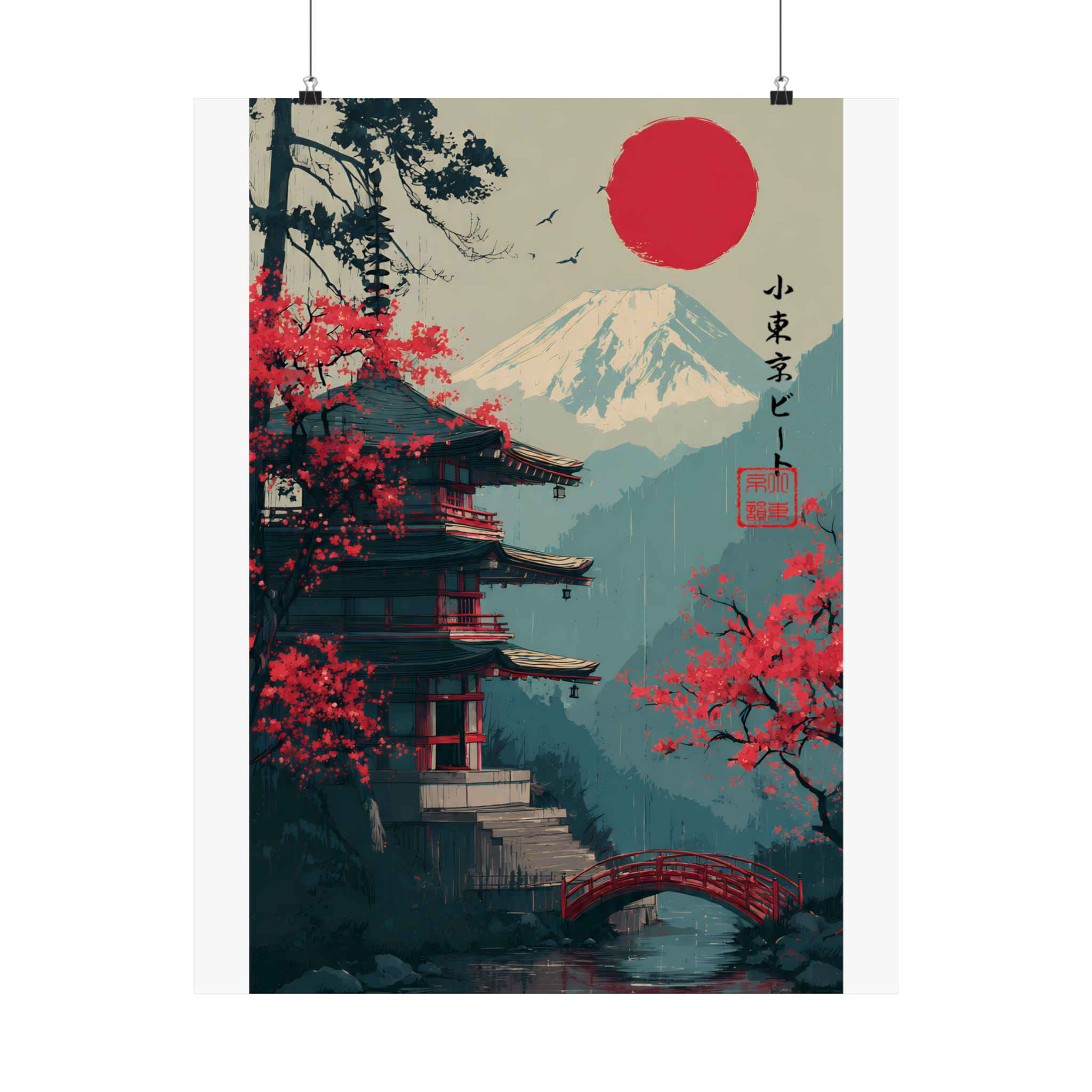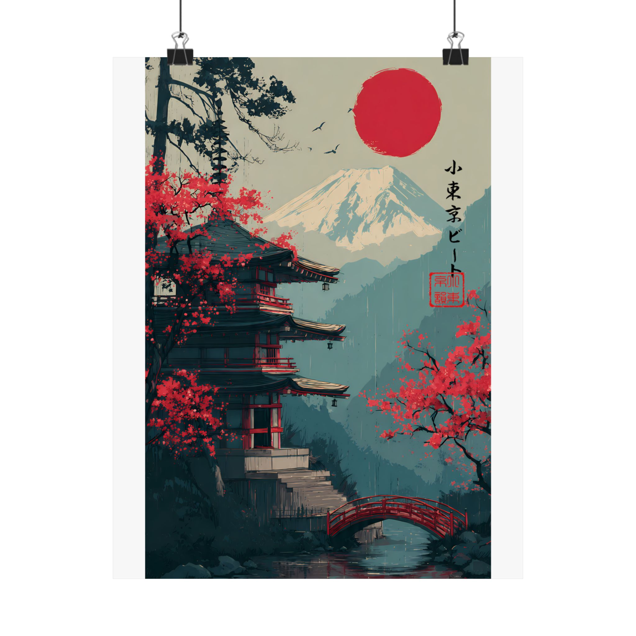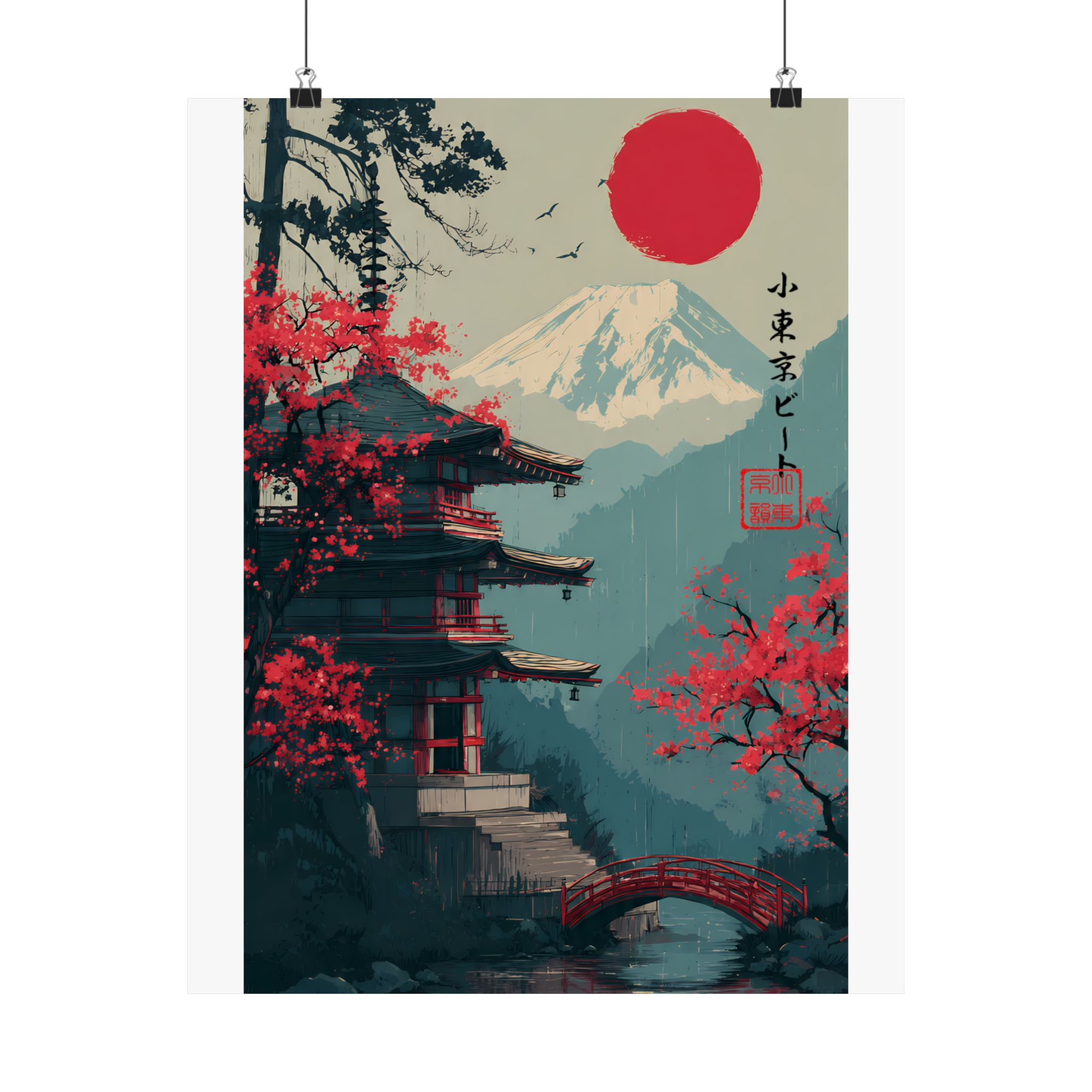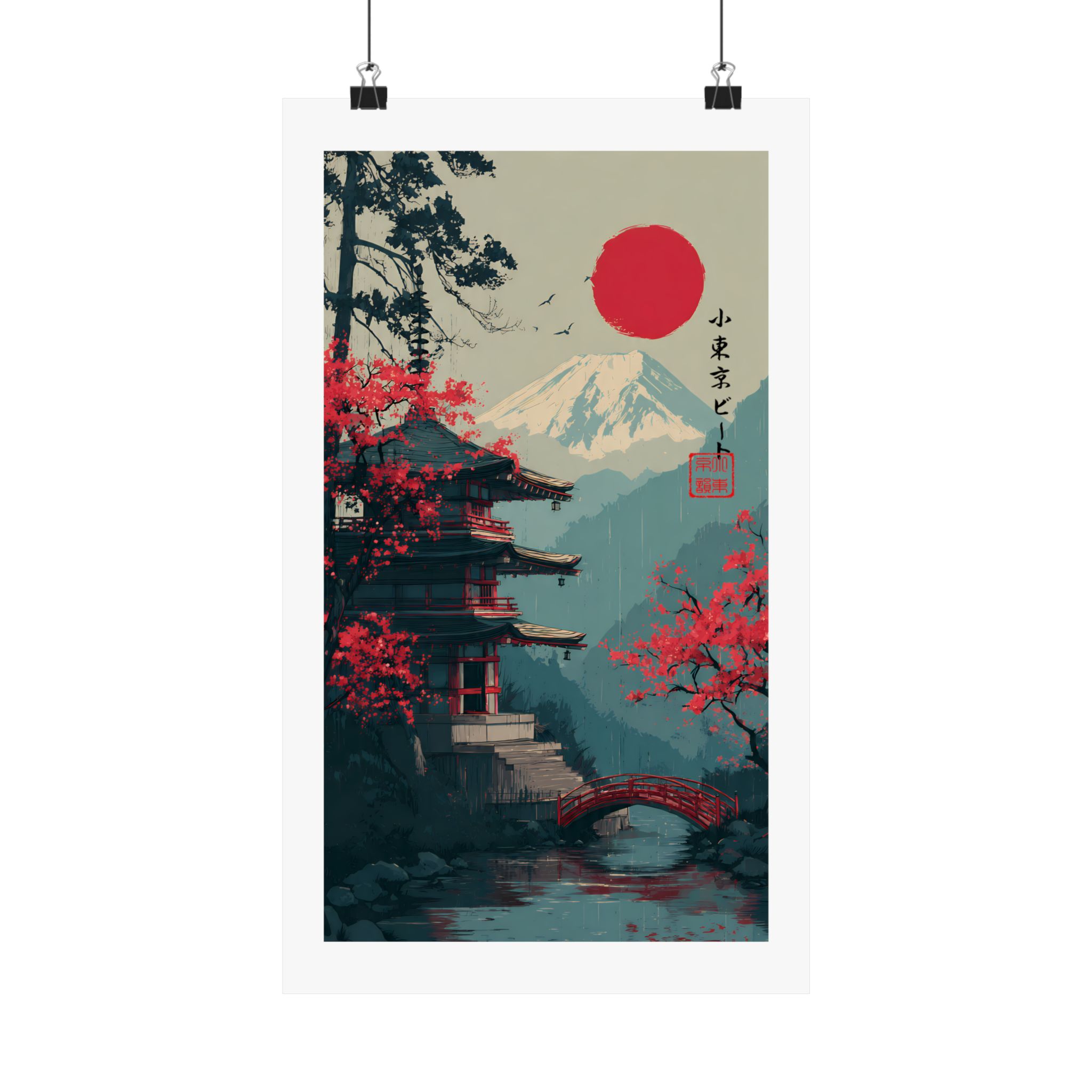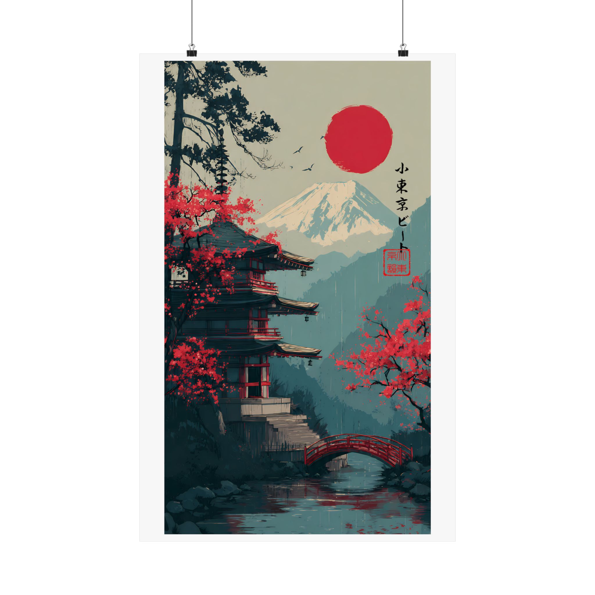 This Japanese-inspired wall art poster features a traditional pagoda overlooking a reflective river beneath Mount Fuji and a bold red sun. Framed by delicate cherry blossoms and a curved bridge, the composition captures serenity, balance, and the quiet strength of nature.
