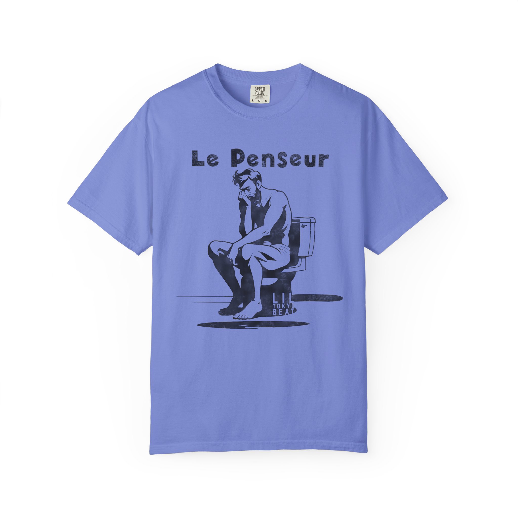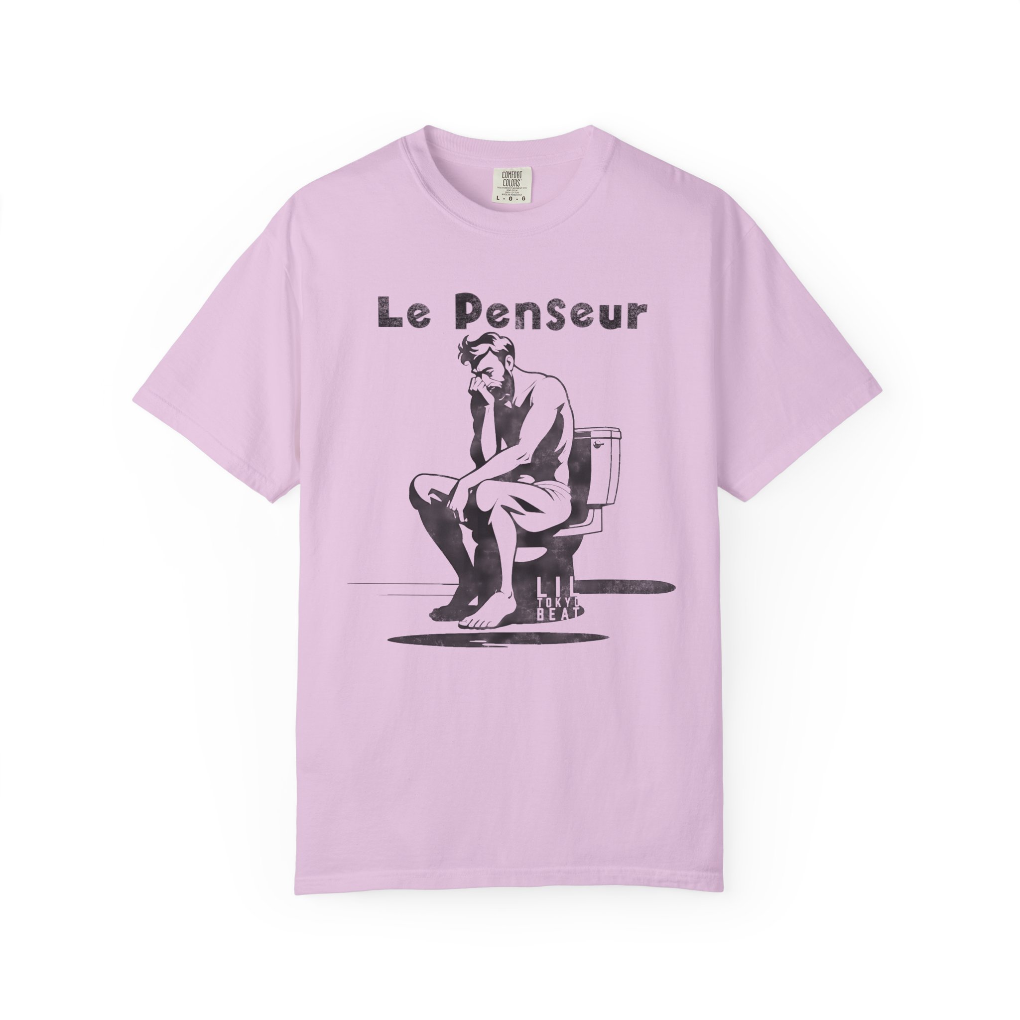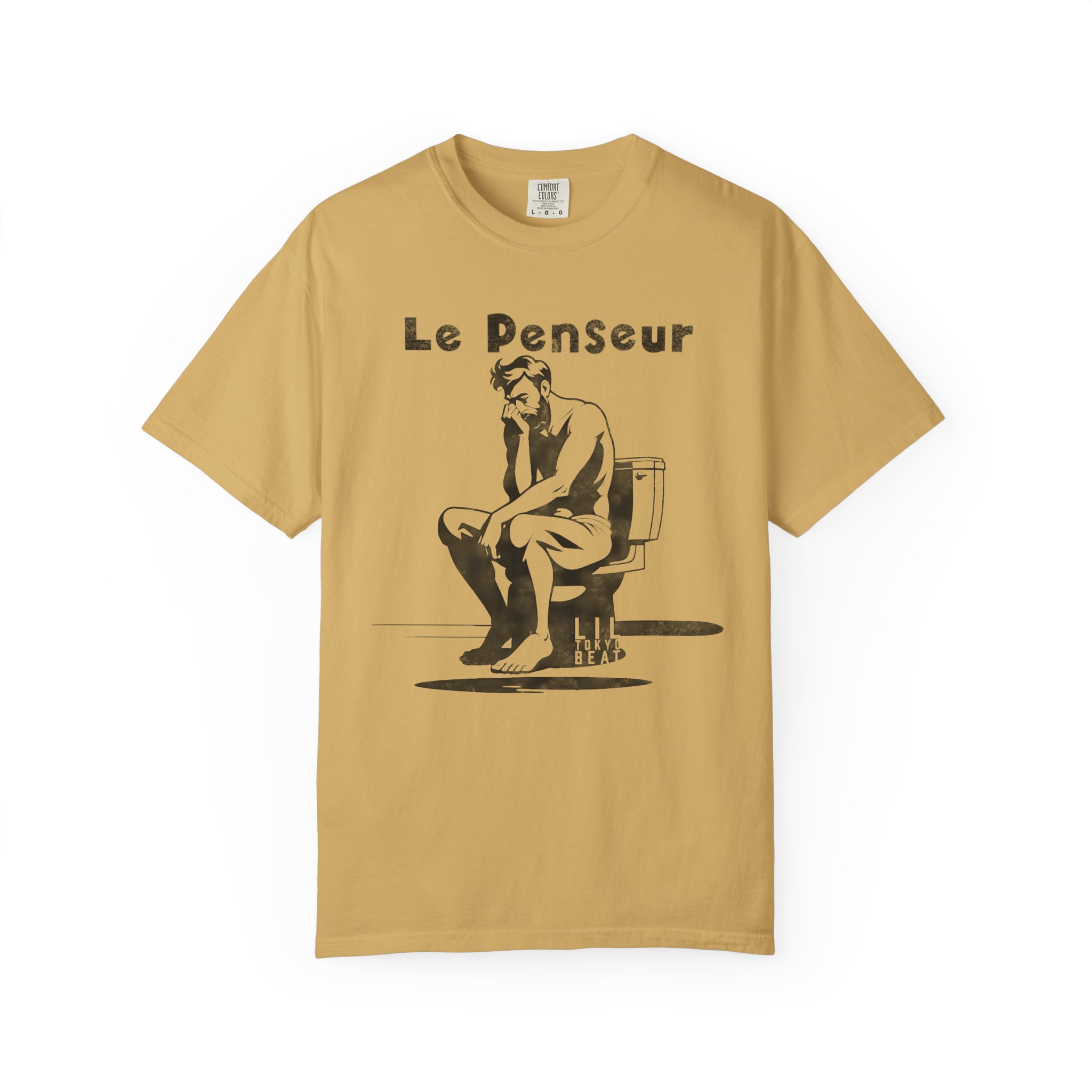 Light, slightly worn-in, and quietly witty — this garment-dyed tee brings a wink of humor to everyday wear. The front features a monochrome illustration of a modern-day thinker seated on a toilet under the caption “Le Penseur,” blending classic sculpture references with a dry, clever twist. The medium-weight 100% ring-spun cotton softens with wear and the garment-dyed finish gives the color a lived-in depth that complements casual jeans, layered flannels, or a laid-back weekend outfit. The relaxed fit and tubular knit body create a clean silhouette without side seams, and double-needle stitching keeps it holding up wash after wash. Wear it to low-key gallery nights, coffee-shop hangs, or lazy Sunday mornings — it reads as smart, a little ironic, and entirely comfortable. Theme/Features: monochrome illustration, sculptural parody, dry humor, garment-dyed softness Target Audience: art lovers with a sense of humor, design students, museum-goers, indie-culture fans Occasions: gallery openings, college campus days, casual meet-ups, weekend errands Product features – 100% ring-spun US cotton, medium weight (6.1 oz/yd²) for durability and comfort – Garment-dyed after construction for soft color and lived-in texture – Relaxed fit with tubular knit (no side seams) for a clean, comfortable silhouette – Double-needle stitching on all seams and pre-shrunk fabric for lasting wear – Available S–4XL (select partners), sewn-in label, made in Honduras Care instructions – Machine wash: cold (max 30C or 90F) – Do not bleach – Tumble dry: low heat – Iron, steam or dry: low heat – Do not dryclean