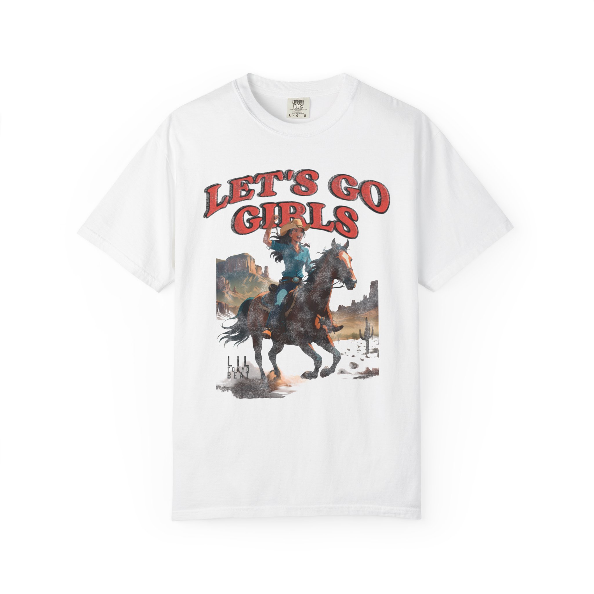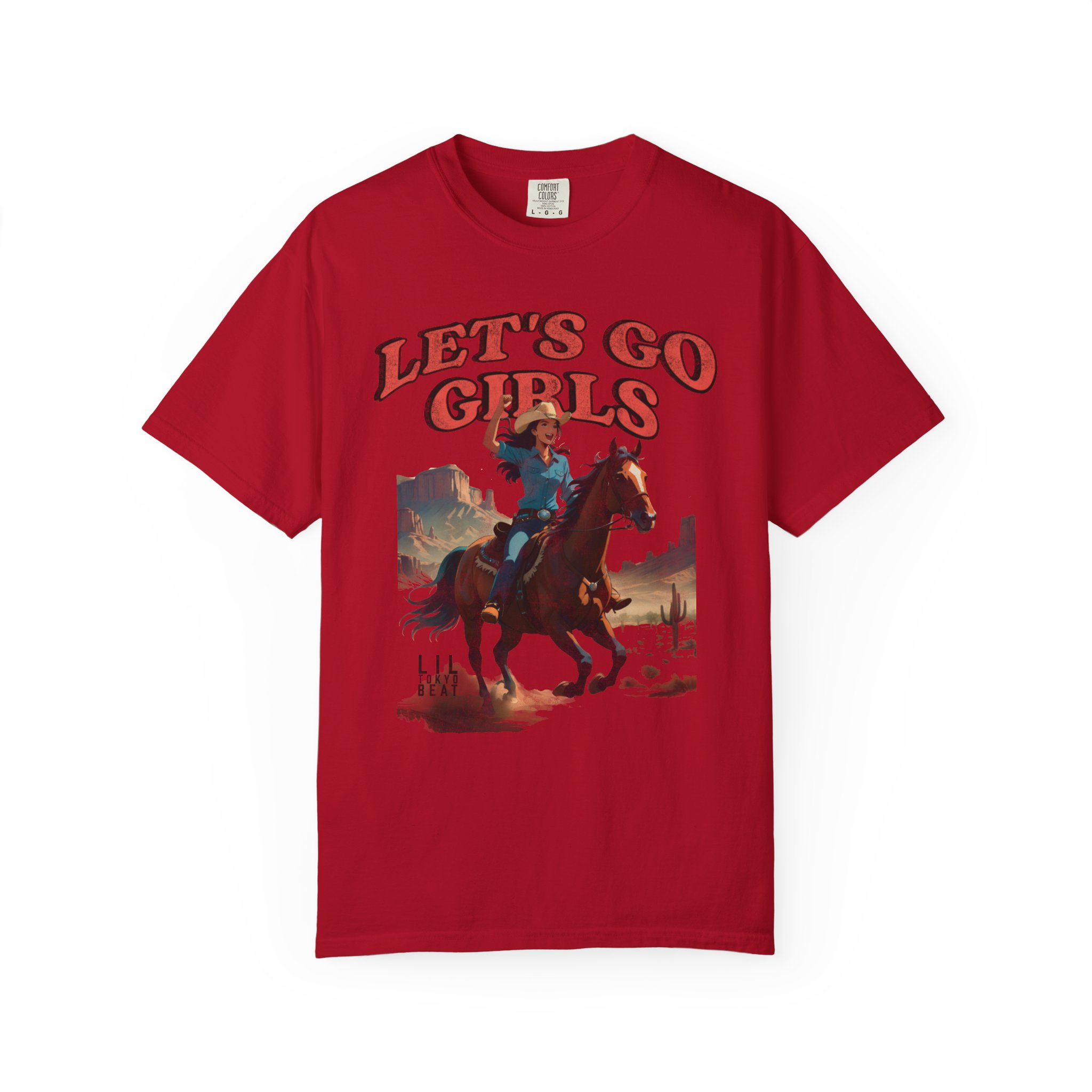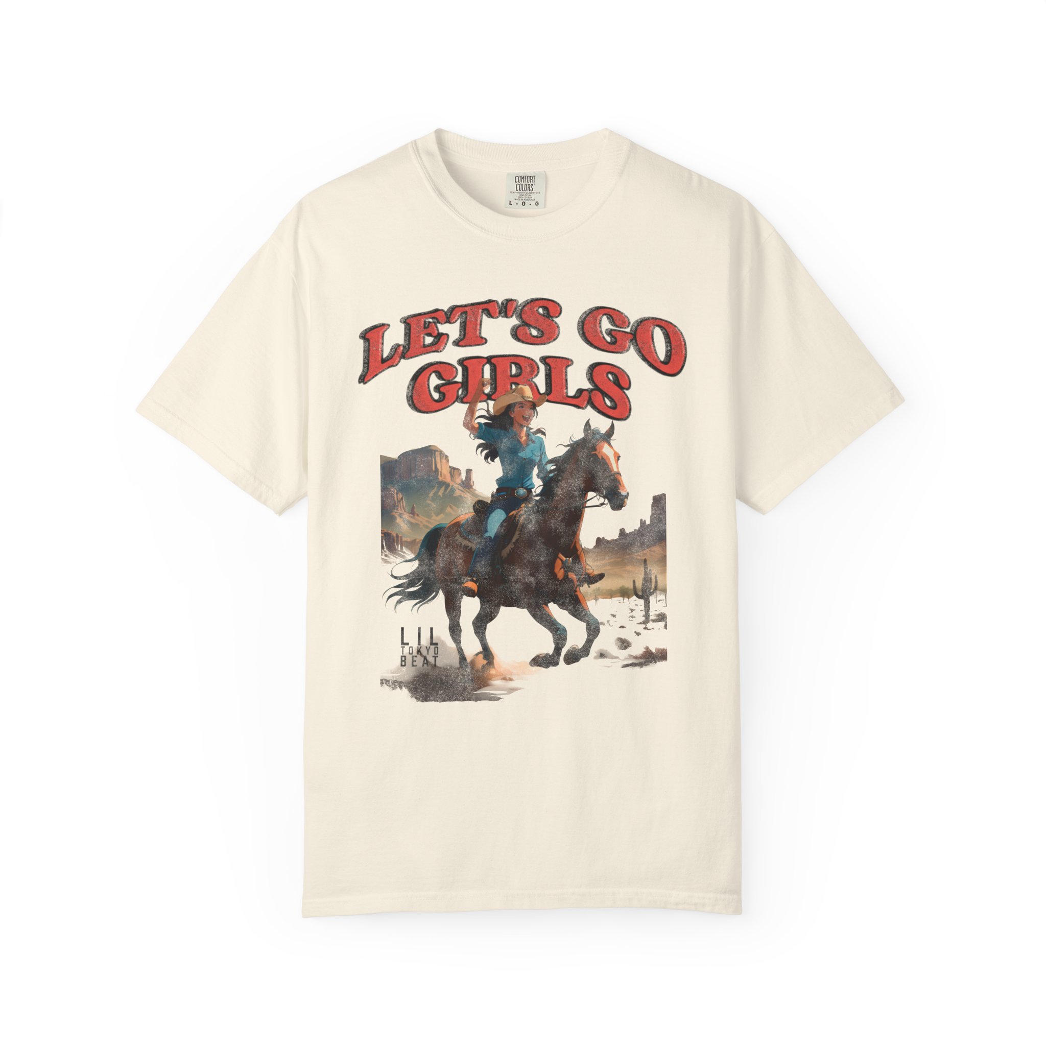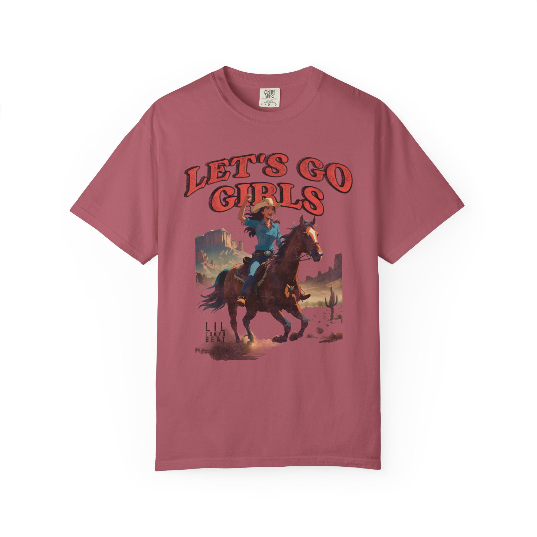 Ride into wide-open afternoons with this garment-dyed tee that wears like an old favorite from the first moment. A vintage-inspired western illustration — a cowgirl charging across a sun-bleached plain beneath bold “LET’S GO GIRLS” lettering — sits centered on a soft, heavyweight cotton body. The relaxed cut and tubular knit feel casual and lived-in, while the garment-dyed finish gives the color depth and a supple hand. It’s the kind of shirt you grab for weekend trail rides, small-town parades, open-mic nights, or campfire hangs when you want something with personality and grit. Designed for comfort and built to last, it layers easily under a denim jacket or pairs with worn-in jeans for a look that’s rugged, spirited, and unmistakably feminine in attitude.