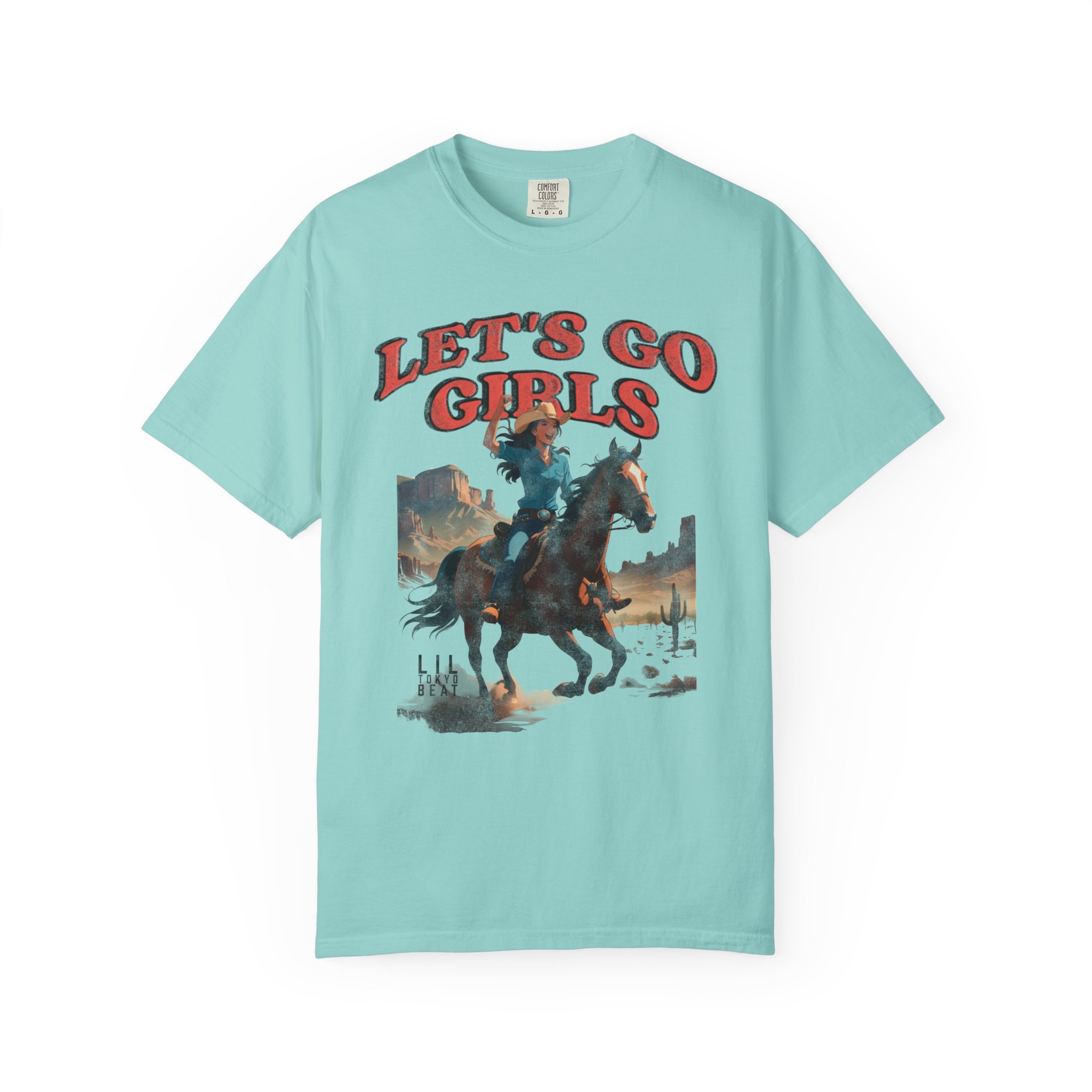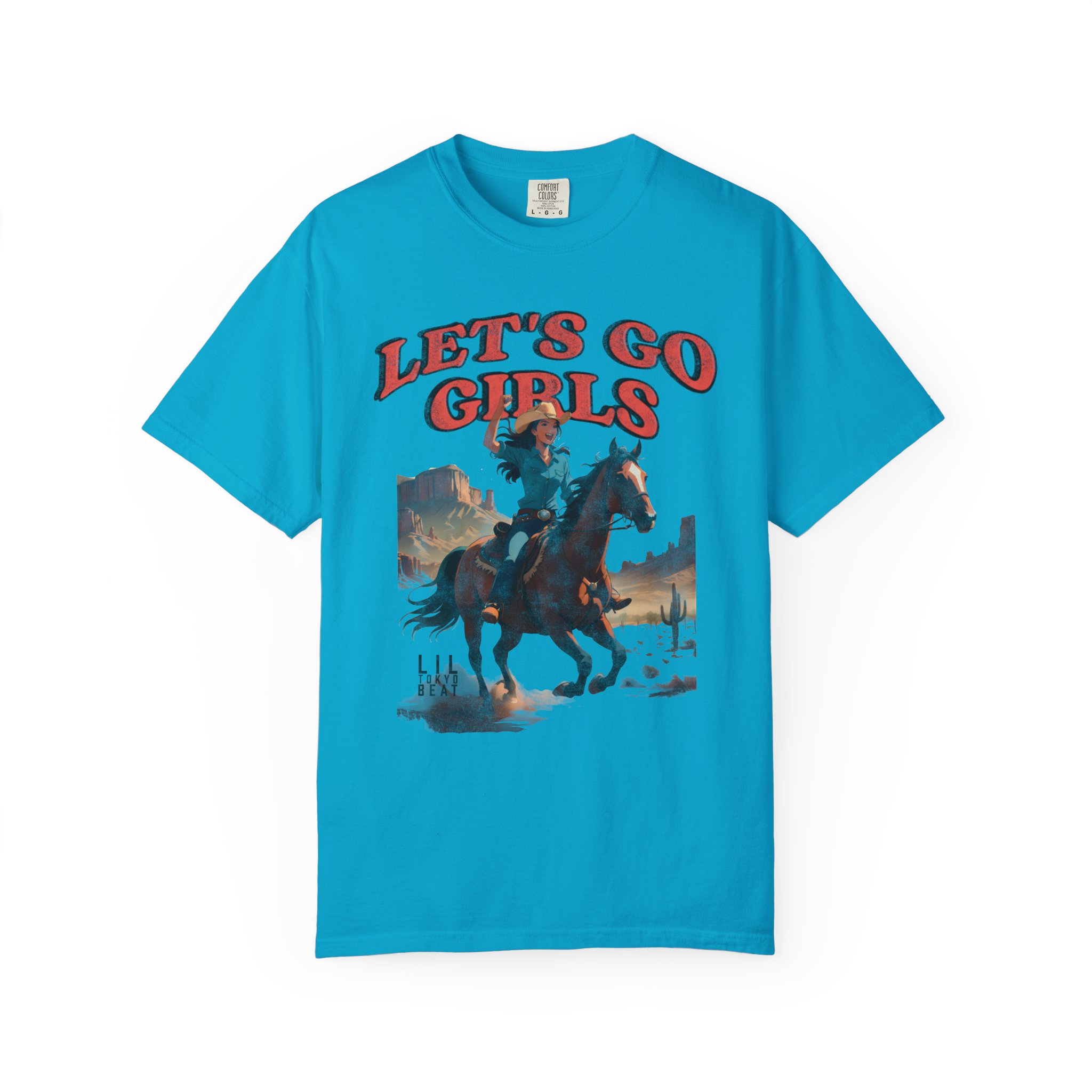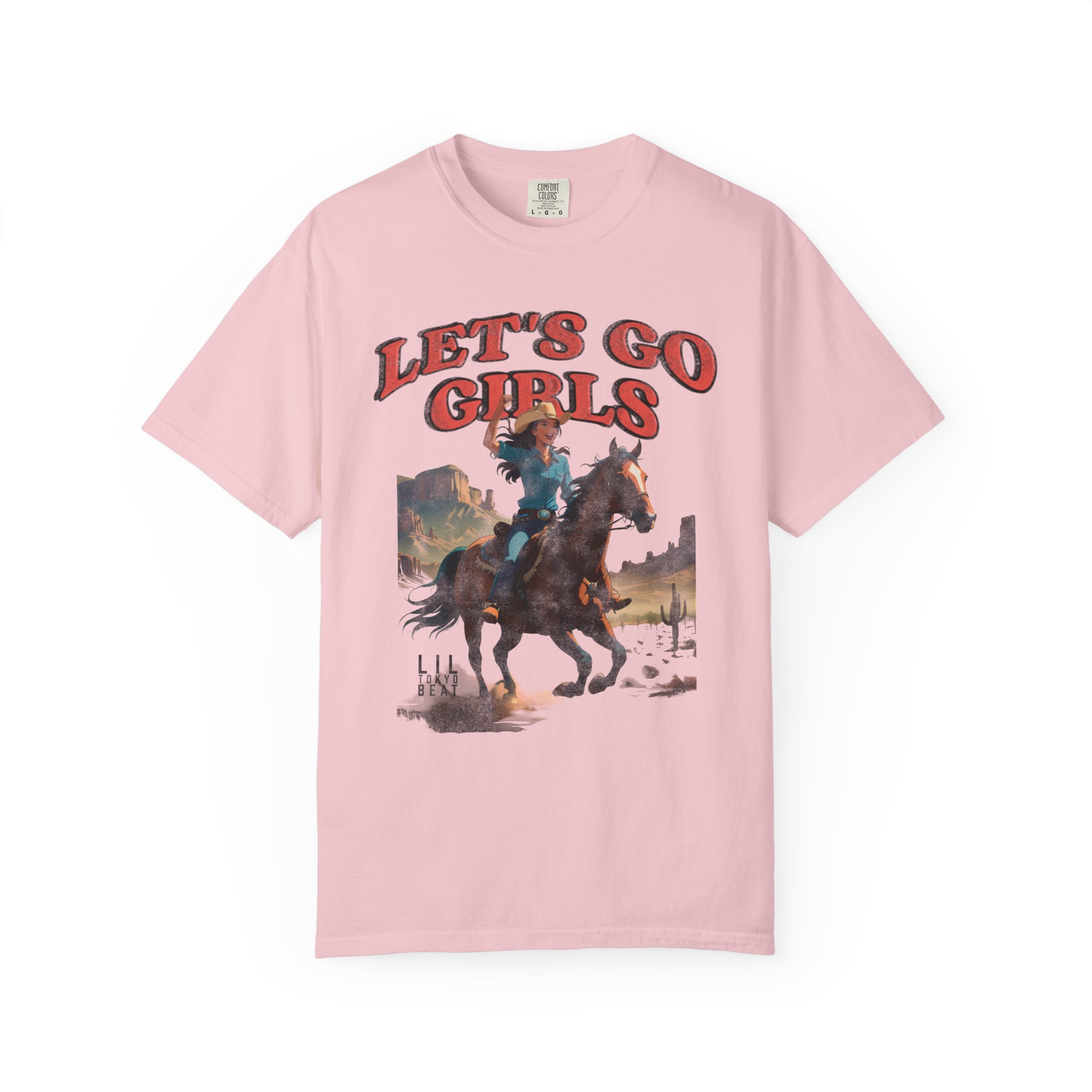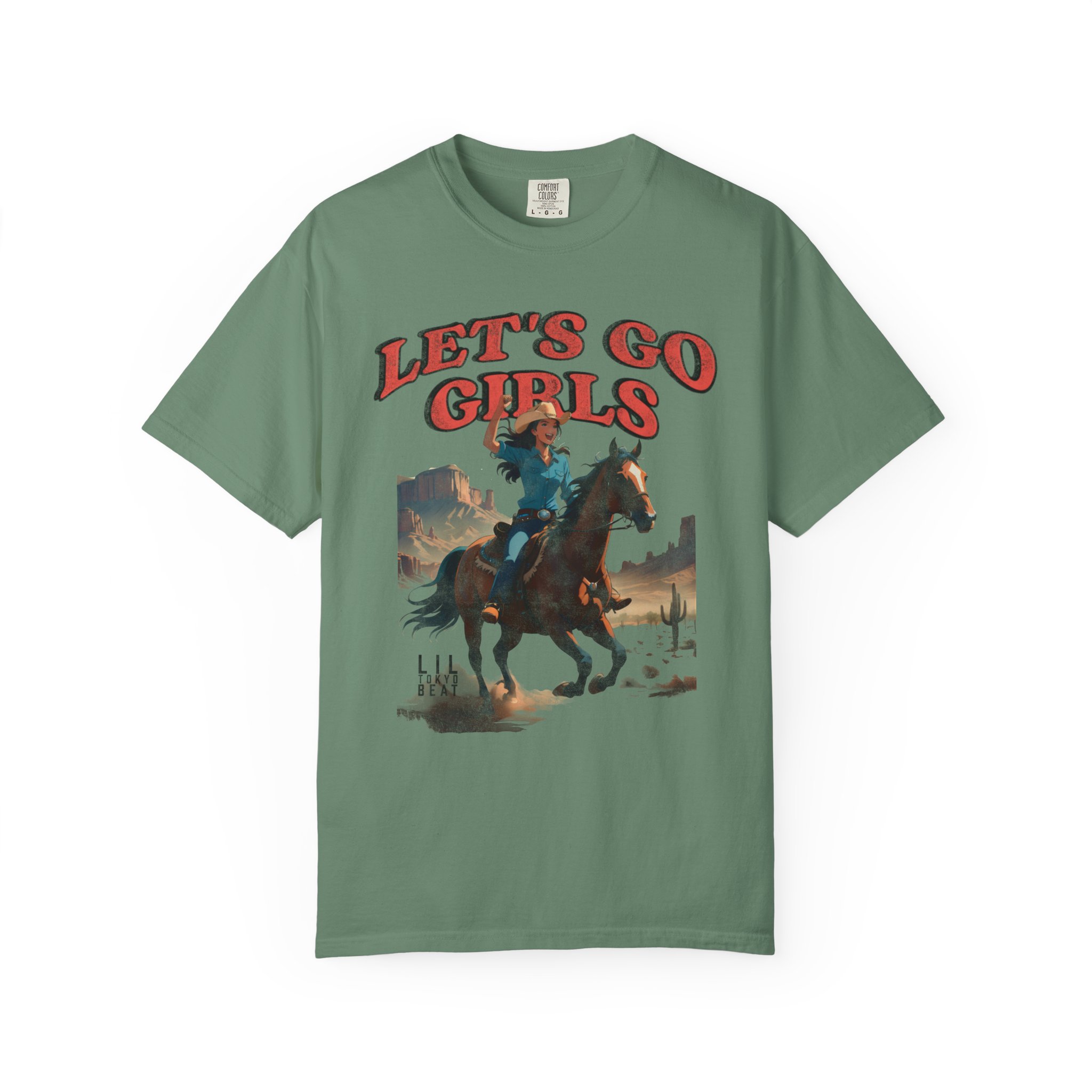 Ride into wide-open afternoons with this garment-dyed tee that wears like an old favorite from the first moment. A vintage-inspired western illustration — a cowgirl charging across a sun-bleached plain beneath bold “LET’S GO GIRLS” lettering — sits centered on a soft, heavyweight cotton body. The relaxed cut and tubular knit feel casual and lived-in, while the garment-dyed finish gives the color depth and a supple hand. It’s the kind of shirt you grab for weekend trail rides, small-town parades, open-mic nights, or campfire hangs when you want something with personality and grit. Designed for comfort and built to last, it layers easily under a denim jacket or pairs with worn-in jeans for a look that’s rugged, spirited, and unmistakably feminine in attitude.