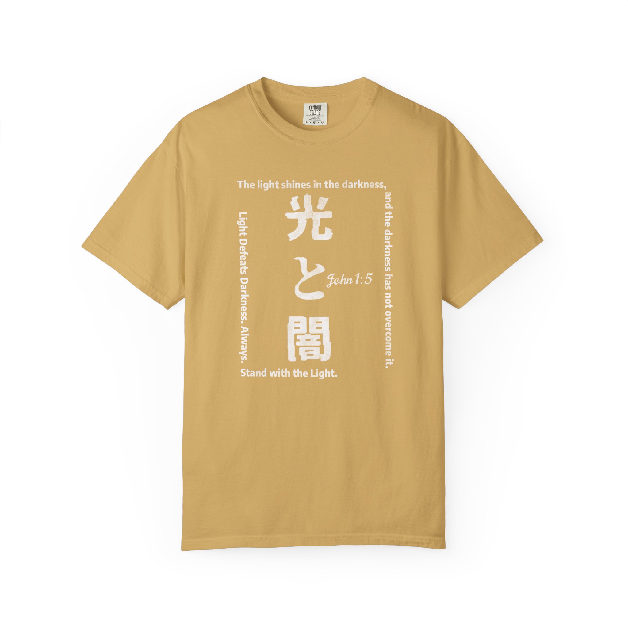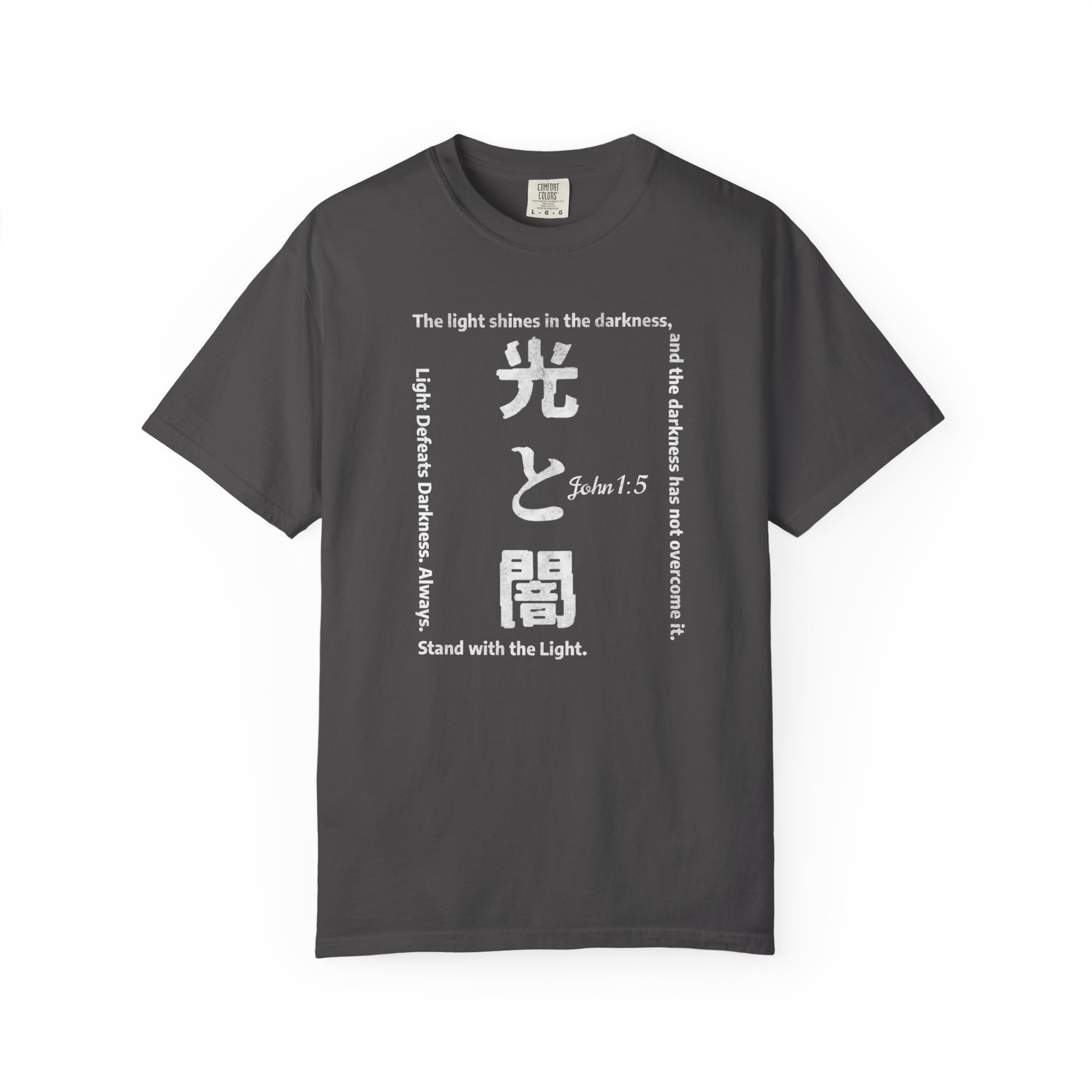 Light and Darkness Kanji T-Shirt is an inspirational Christian tee featuring the Bible verse John 1:5. This tee exudes a sense of spiritual empowerment and positivity, making it a perfect addition to the wardrobe of a Christian looking to showcase their faith. Great for casual wear or as a conversation starter at church events, Bible studies, or prayer groups. Product features – Available in sizes S to 4XL for a perfect fit – Durable double-needle stitching on all seams – Made with garment-dyed fabric for a soft texture – Ethically made with 100% US cotton – Relaxed fit and classic crew neckline for versatile styling Care instructions – Machine wash: cold (max 30C or 90F) – Do not bleach – Tumble dry: low heat – Iron, steam or dry: low heat – Do not dryclean