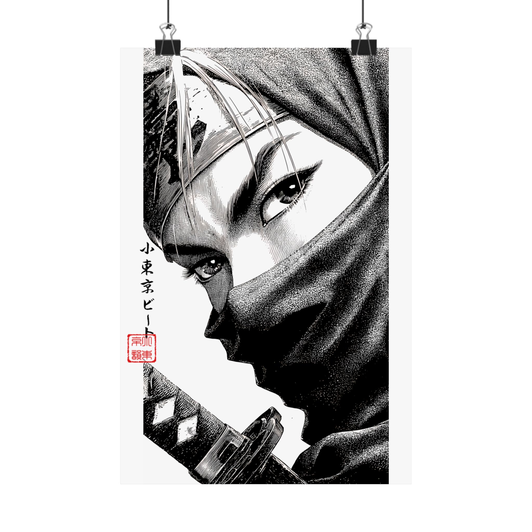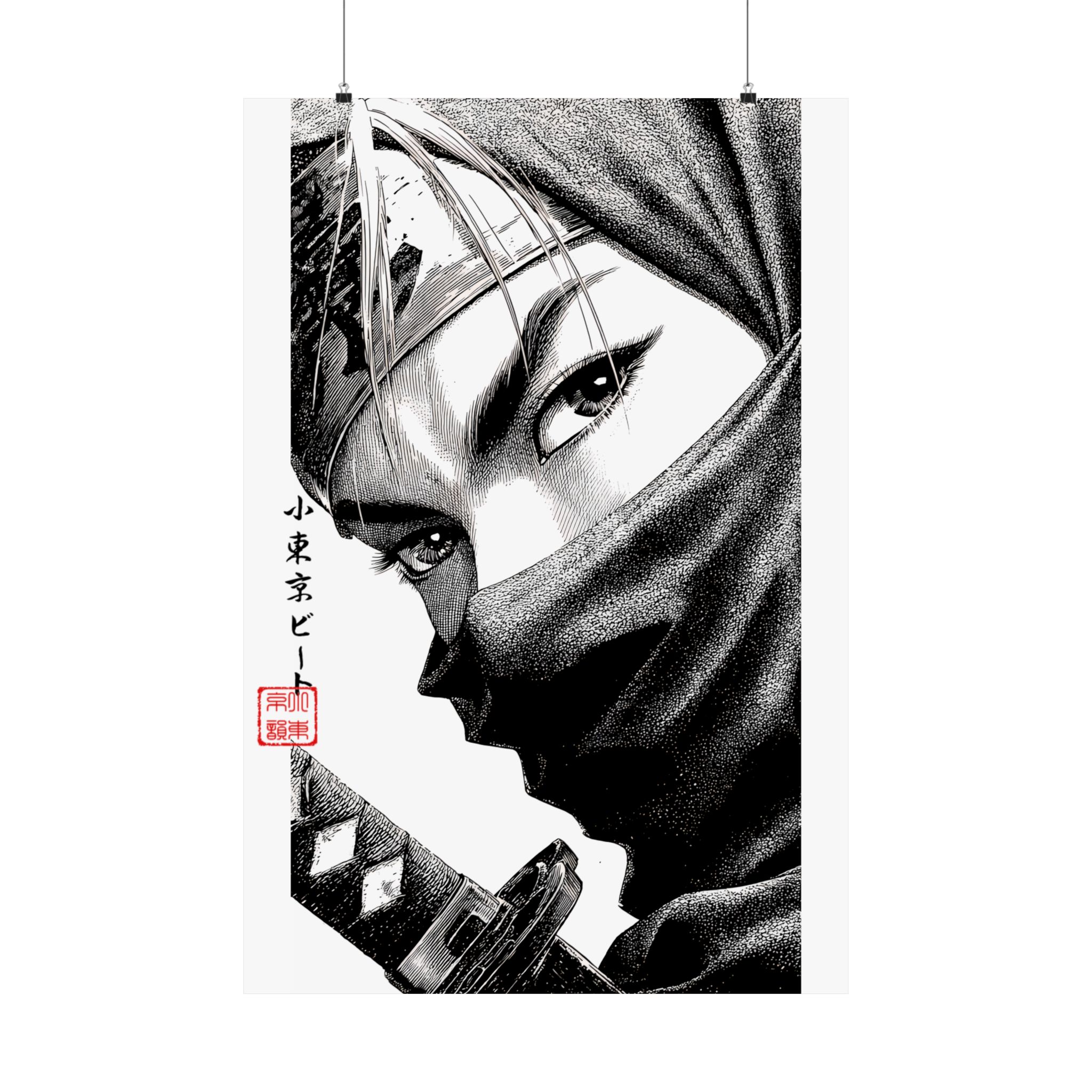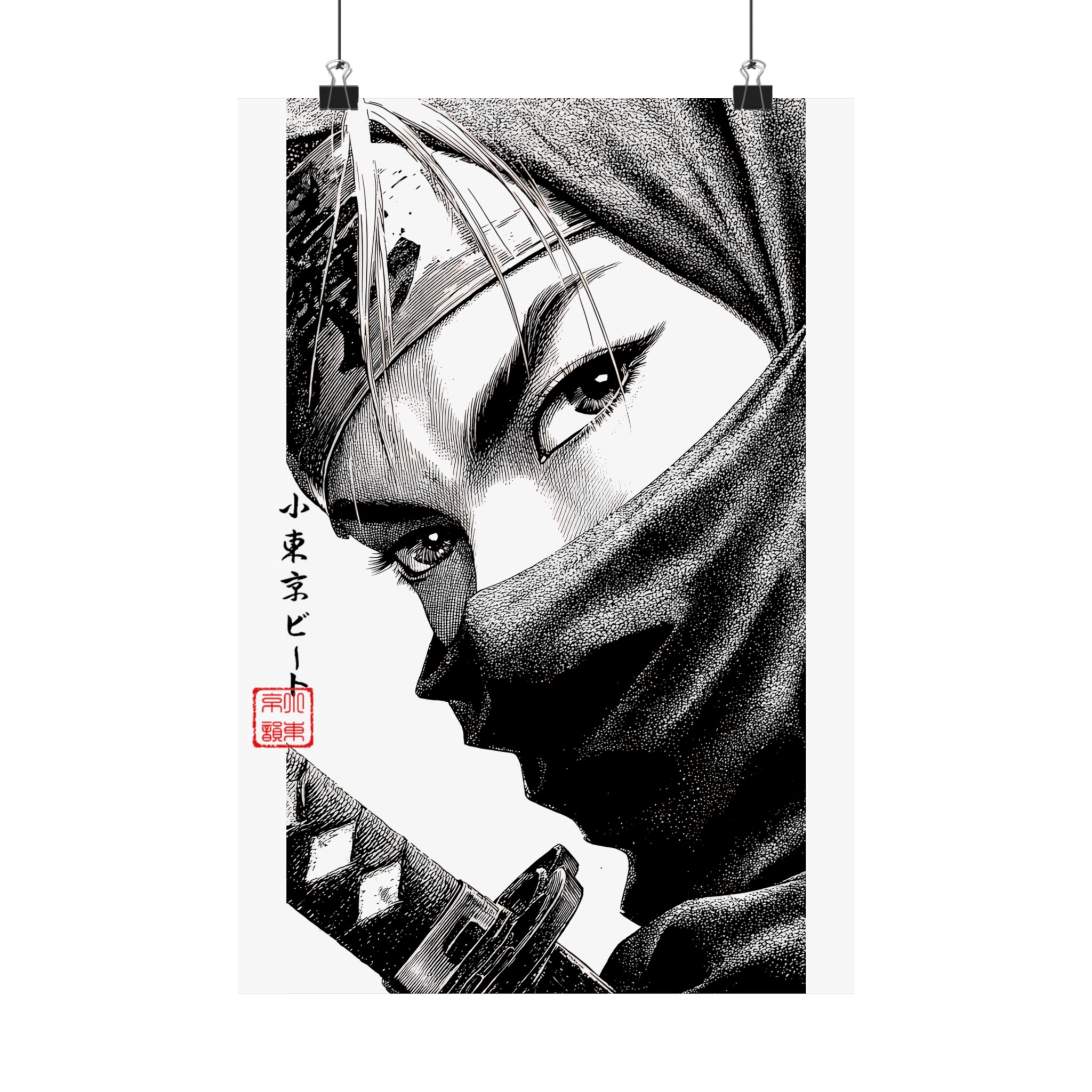 This striking masked ninja woman poster captures mystery, strength, and quiet intensity through bold black and white illustration. Featuring a close-up female warrior with piercing eyes, wrapped in flowing fabric and holding a blade, this artwork delivers a cinematic, graphic novel feel. The detailed ink-style texture and high-contrast shading create a powerful gallery presence that commands attention. Perfect for fans of ninja art, samurai aesthetics, assassin themes, and modern monochrome decor, this print brings Lil Tokyo Beat’s K.A.T. energy — Kool, Artful, Timeless — into your space. A statement piece for studios, offices, game rooms, or anyone drawn to stealth, strength, and dramatic warrior imagery.